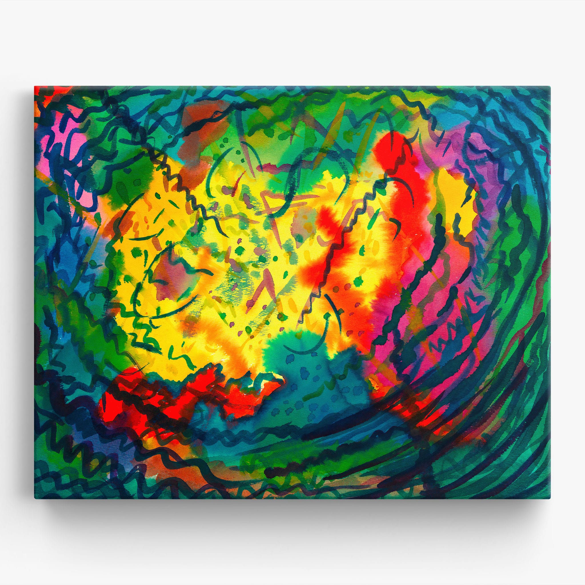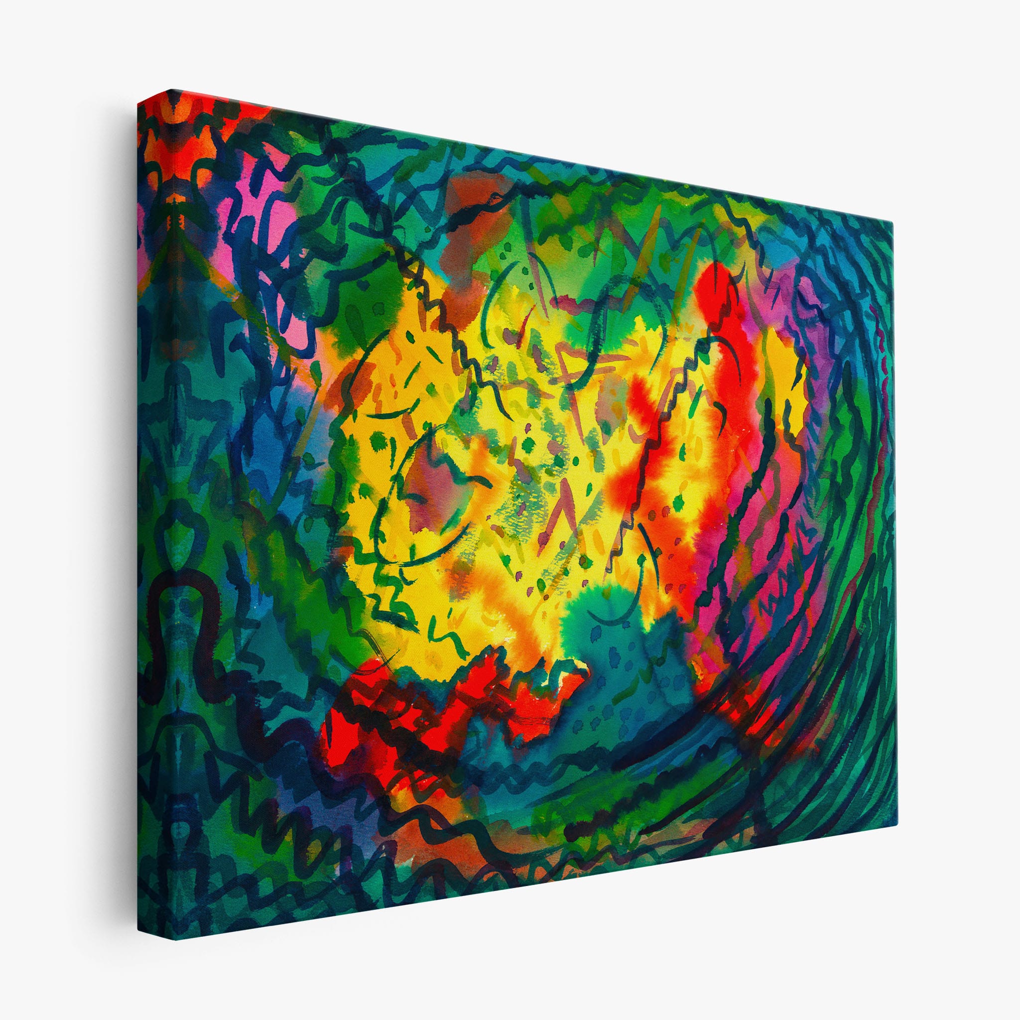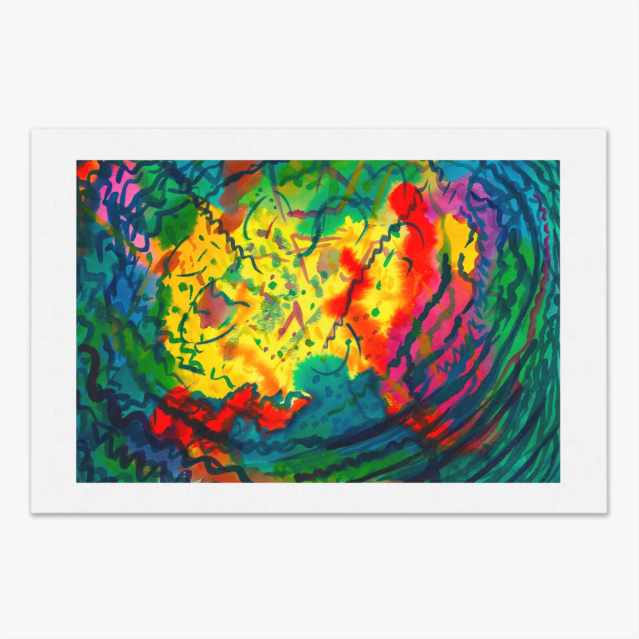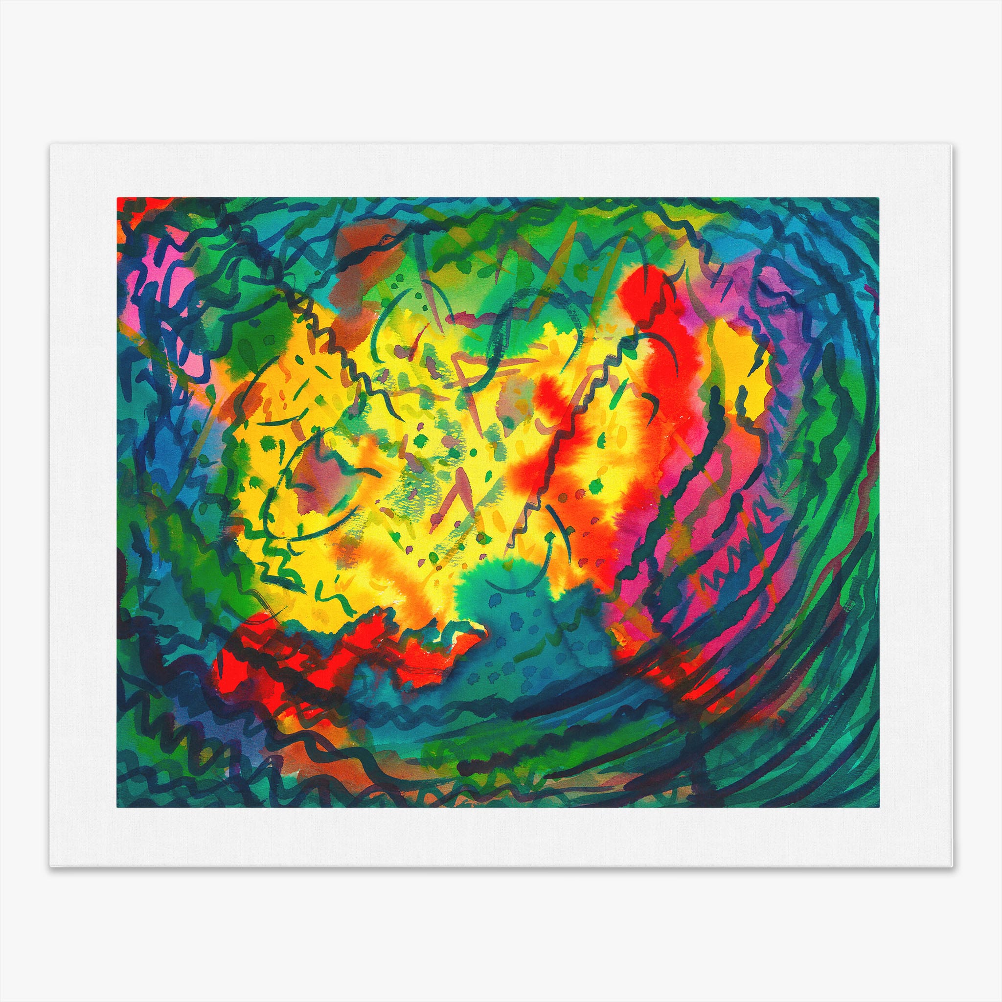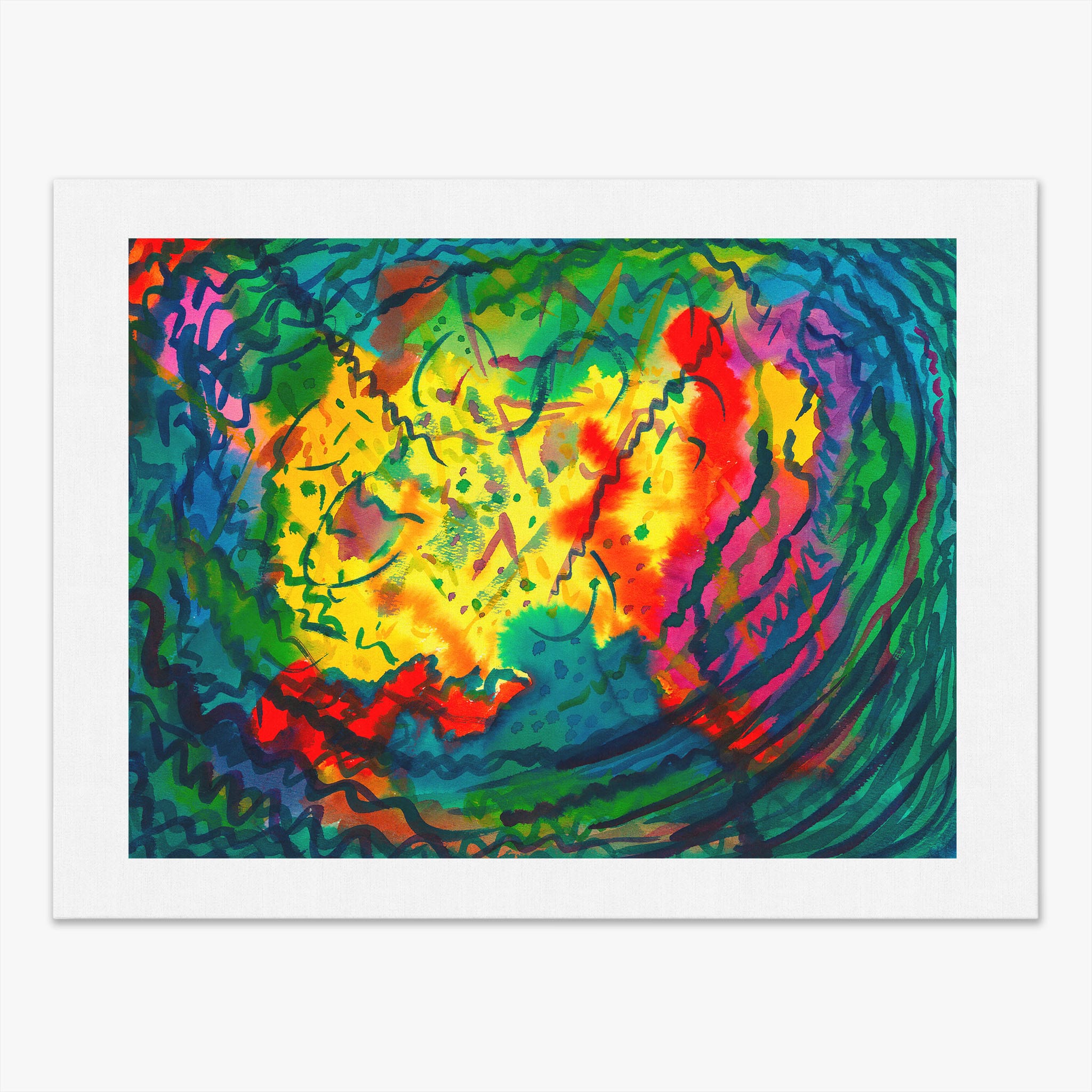 This artwork is titled "Auflösung" by Karl Wiener, painted in 1928. A vivid explosion of color radiates from the center, where brilliant yellows and reds dissolve into surrounding layers of blues, greens, and purples. Swirling dark lines spiral outward, as if capturing the moment of disintegration or release, reflecting the meaning of the title—“dissolution.” The spontaneous washes and dynamic outlines suggest energy escaping containment, both chaotic and harmonic. Rendered in watercolor, the blending and bleeding of pigment add an organic depth and motion. This fine art reproduction, sourced from a high-resolution photograph of the original, preserves the visual intensity and tactile flow. A bold piece for lovers of expressive color, abstraction, and 20th-century avant-garde aesthetics.