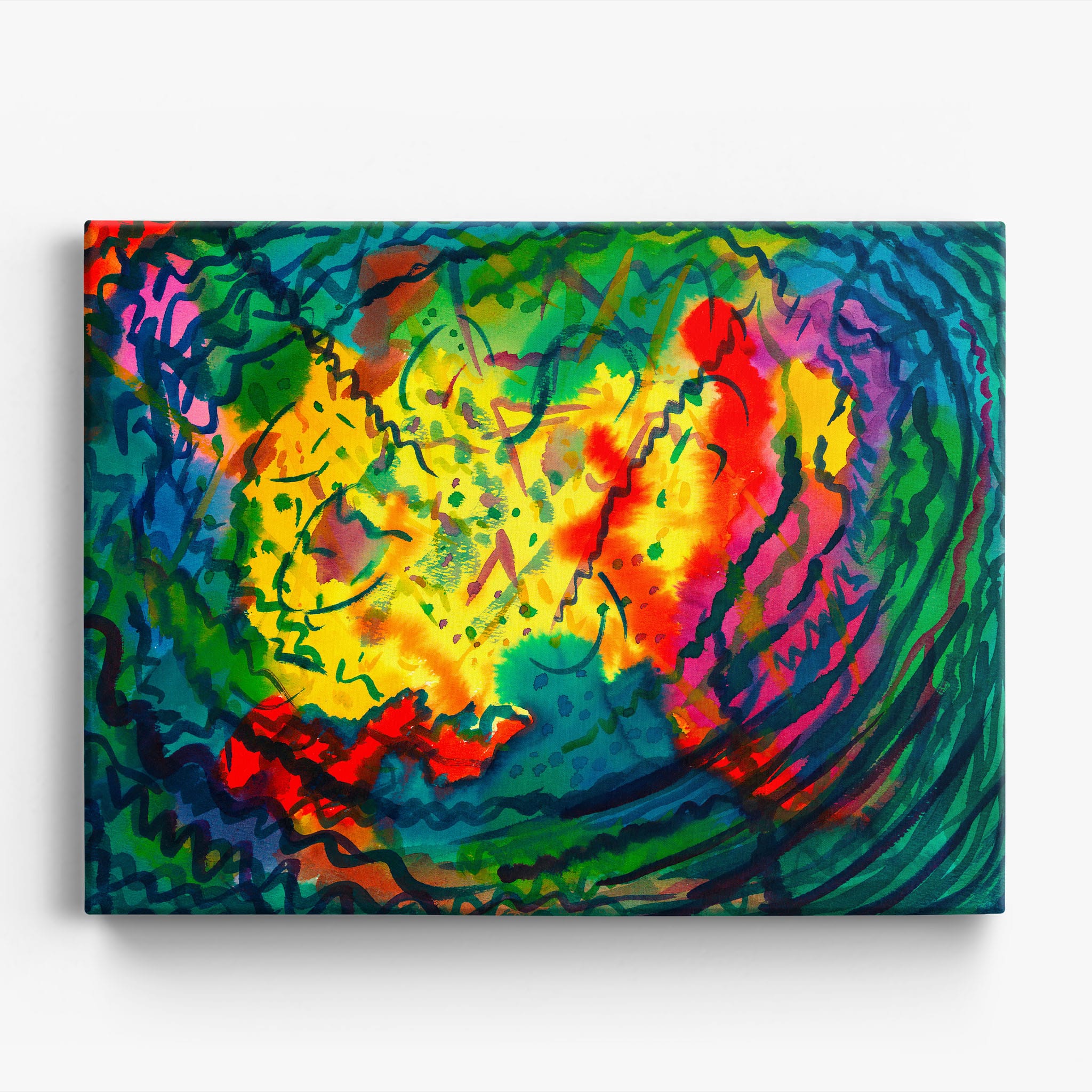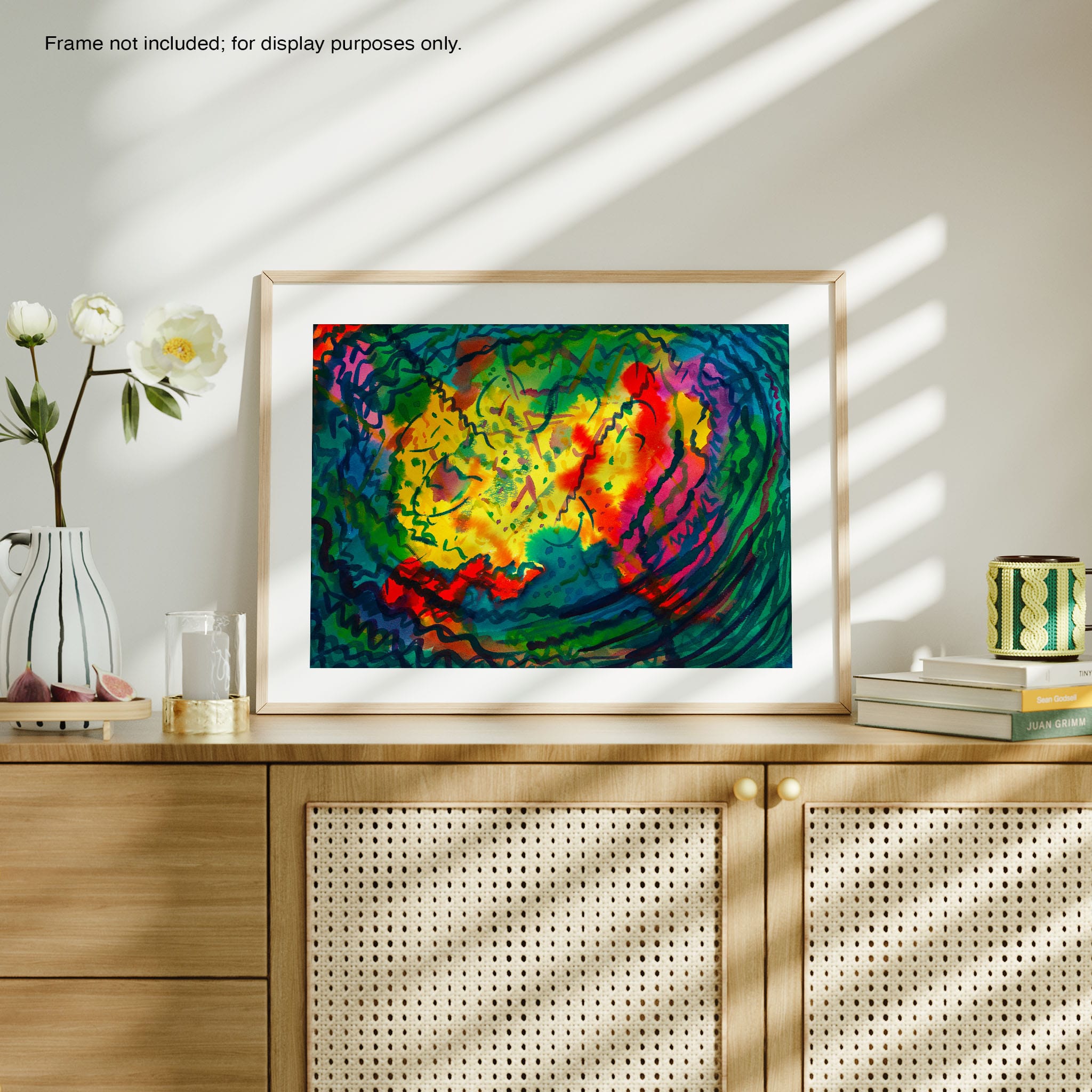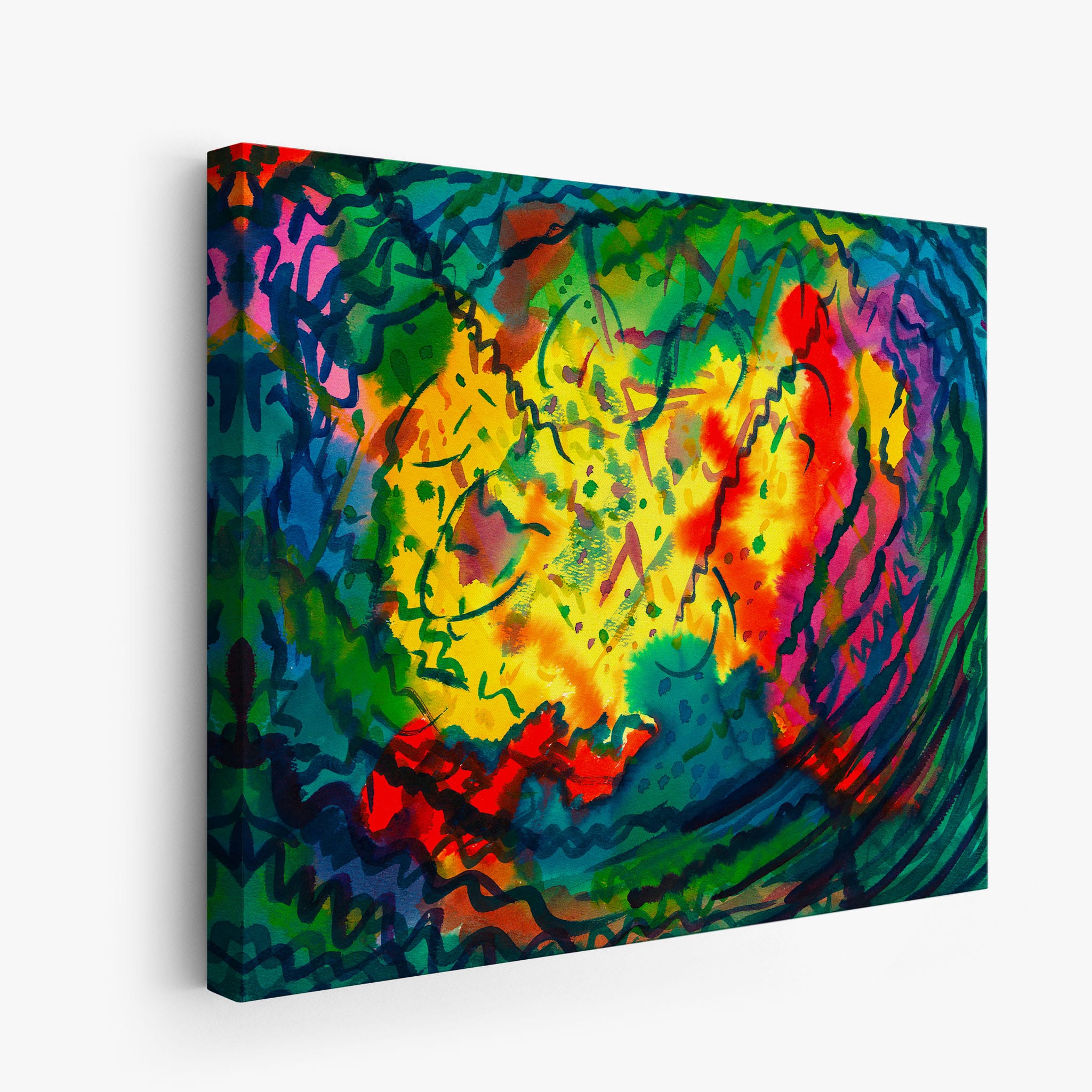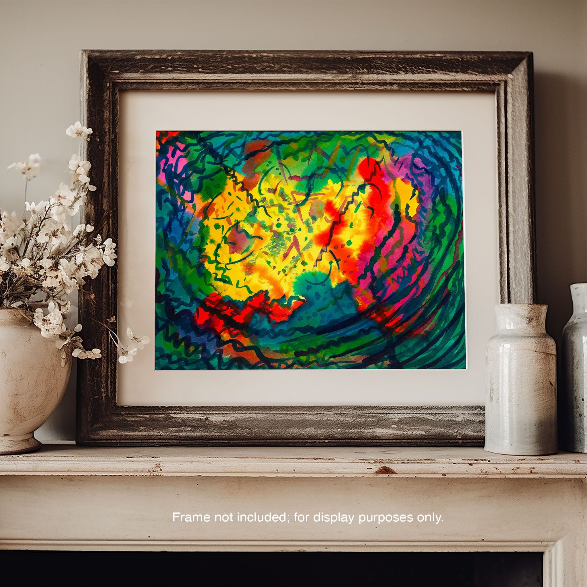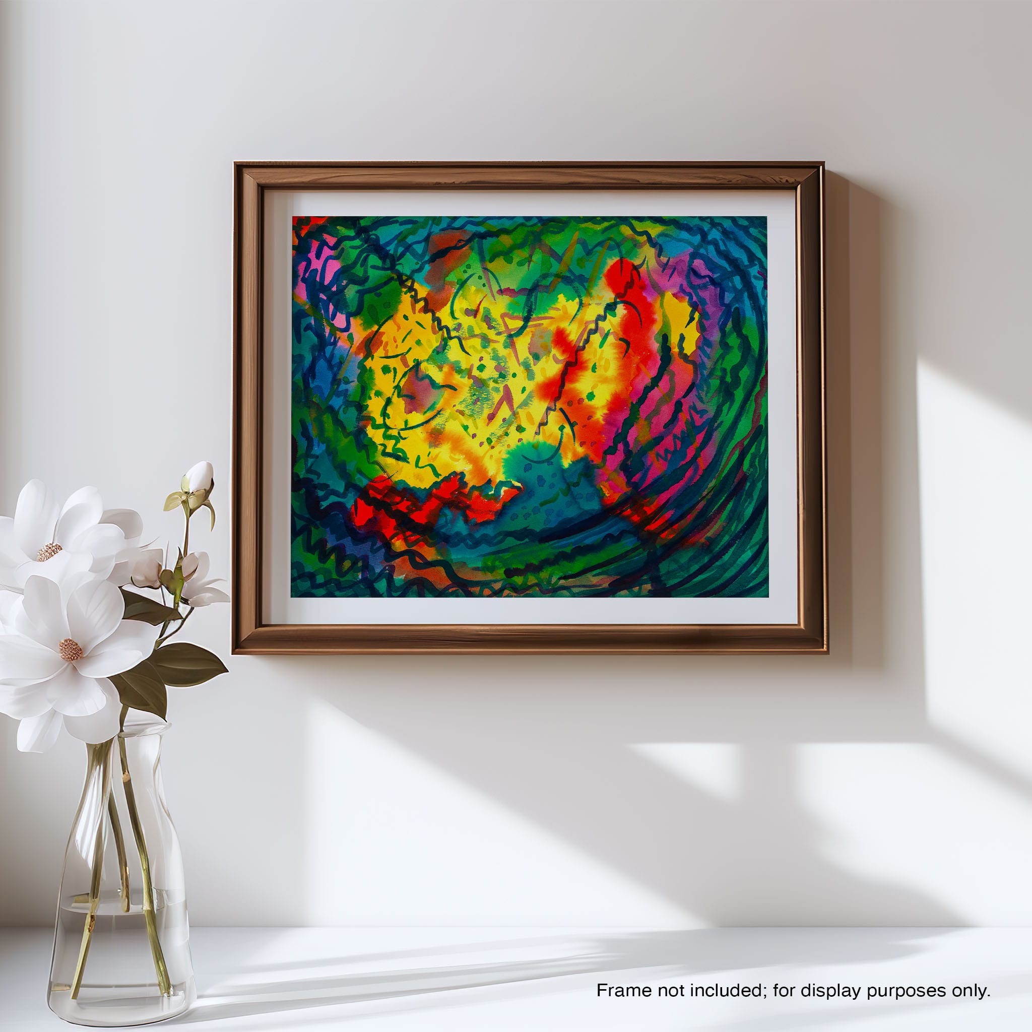 This artwork is titled "Auflösung" by Karl Wiener, painted in 1928. A vivid explosion of color radiates from the center, where brilliant yellows and reds dissolve into surrounding layers of blues, greens, and purples. Swirling dark lines spiral outward, as if capturing the moment of disintegration or release, reflecting the meaning of the title—“dissolution.” The spontaneous washes and dynamic outlines suggest energy escaping containment, both chaotic and harmonic. Rendered in watercolor, the blending and bleeding of pigment add an organic depth and motion. This fine art reproduction, sourced from a high-resolution photograph of the original, preserves the visual intensity and tactile flow. A bold piece for lovers of expressive color, abstraction, and 20th-century avant-garde aesthetics.