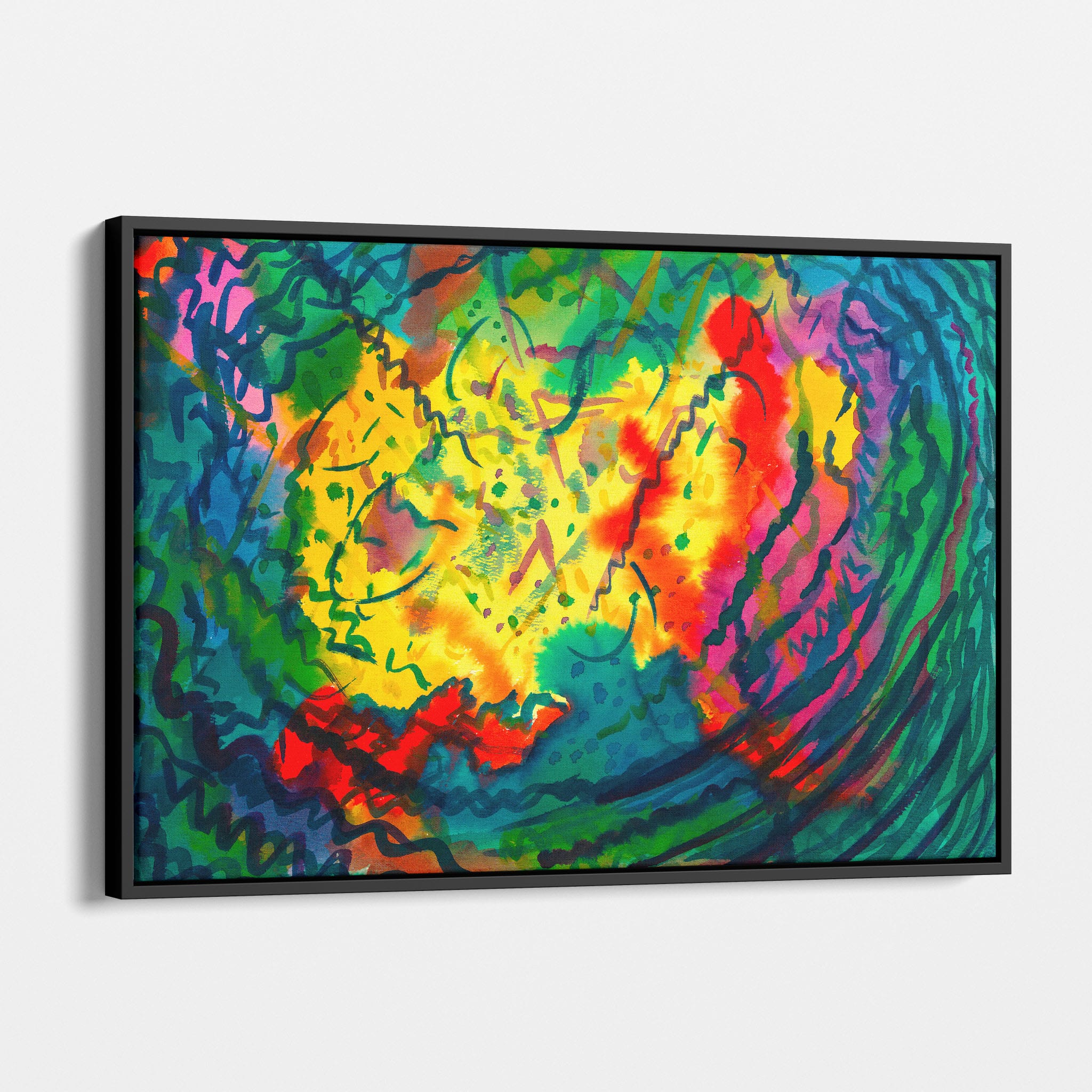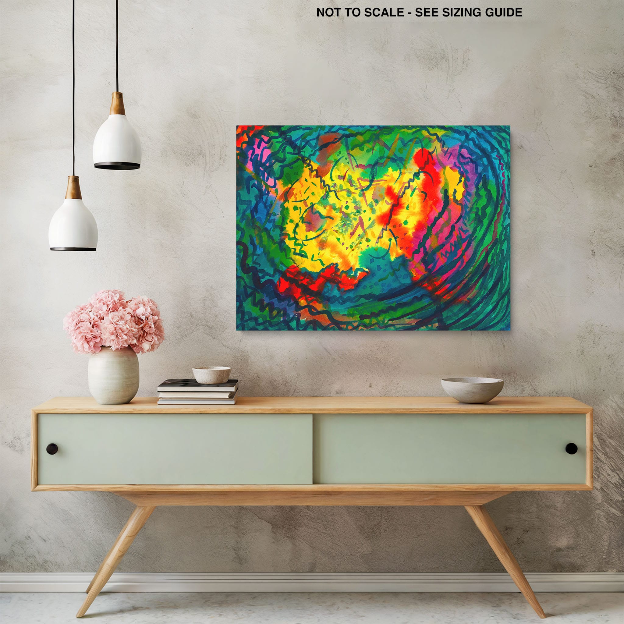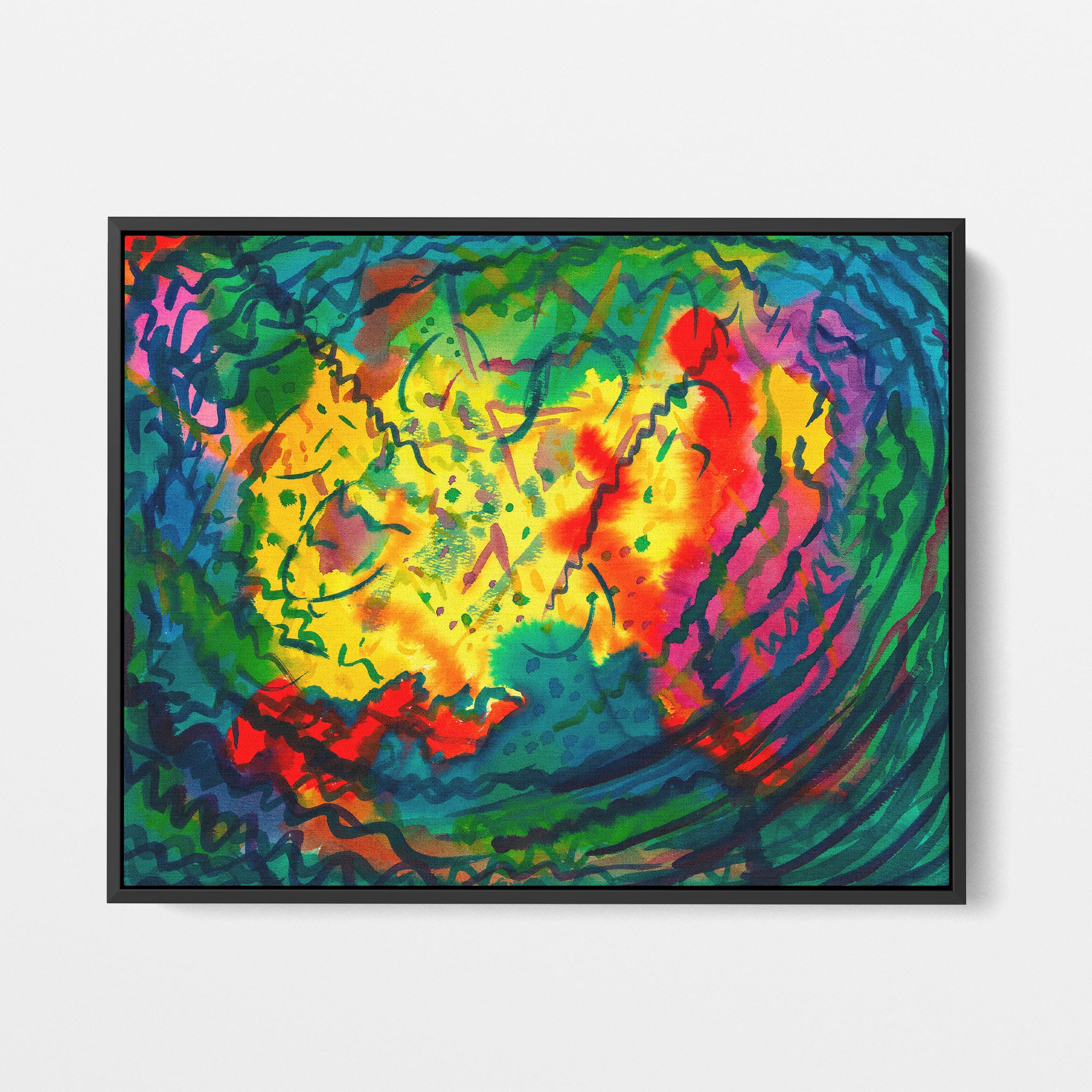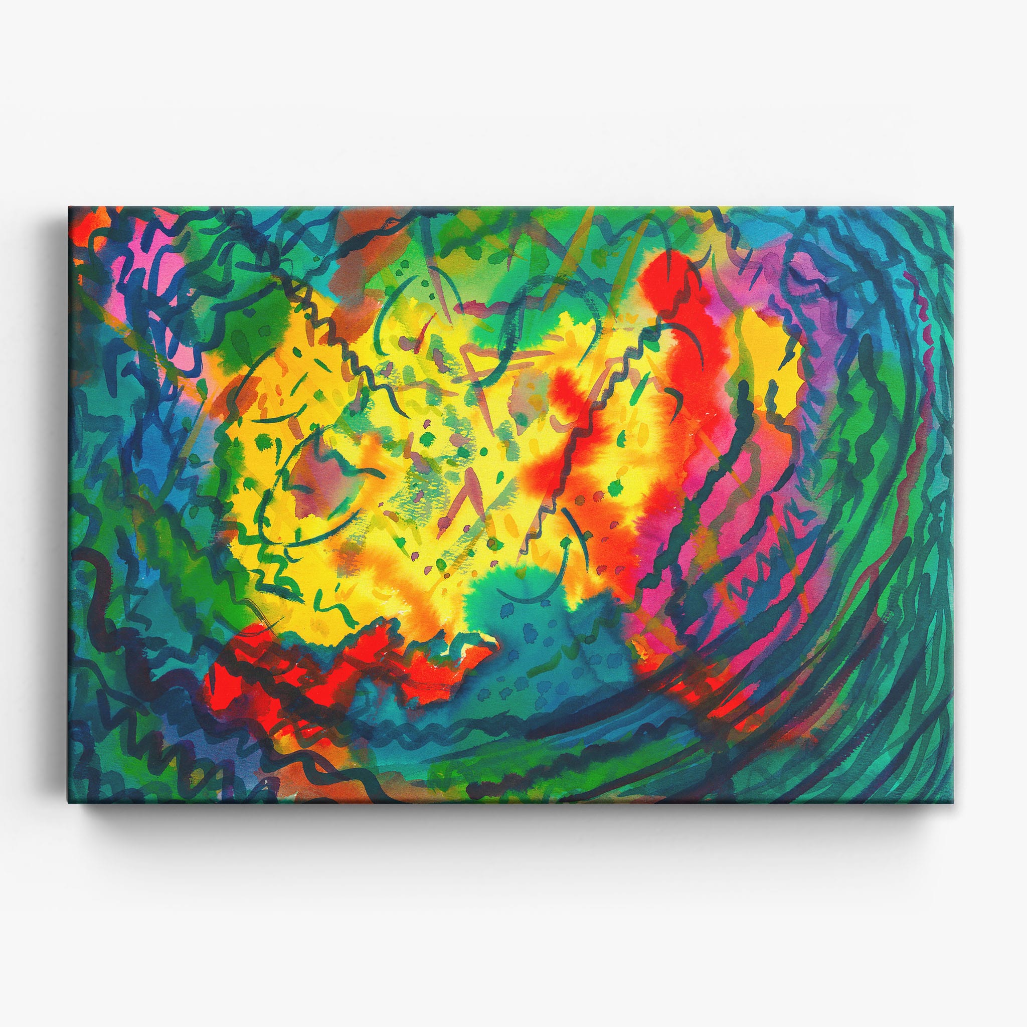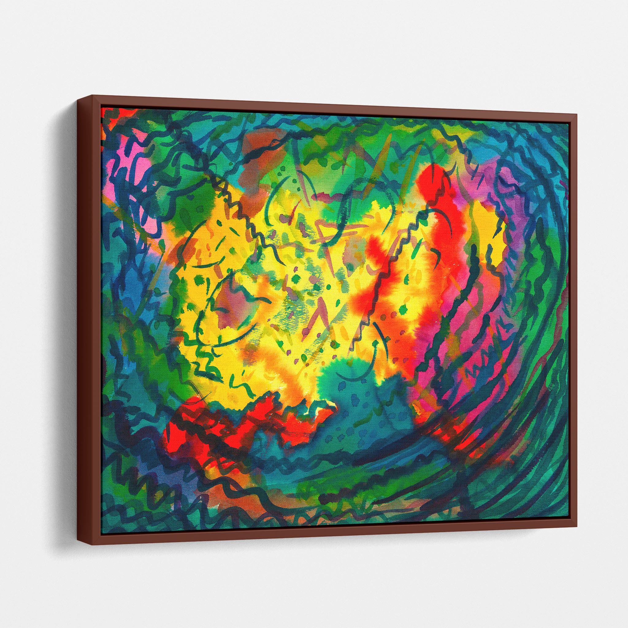 This artwork is titled "Auflösung" by Karl Wiener, painted in 1928. A vivid explosion of color radiates from the center, where brilliant yellows and reds dissolve into surrounding layers of blues, greens, and purples. Swirling dark lines spiral outward, as if capturing the moment of disintegration or release, reflecting the meaning of the title—“dissolution.” The spontaneous washes and dynamic outlines suggest energy escaping containment, both chaotic and harmonic. Rendered in watercolor, the blending and bleeding of pigment add an organic depth and motion. This fine art reproduction, sourced from a high-resolution photograph of the original, preserves the visual intensity and tactile flow. A bold piece for lovers of expressive color, abstraction, and 20th-century avant-garde aesthetics.