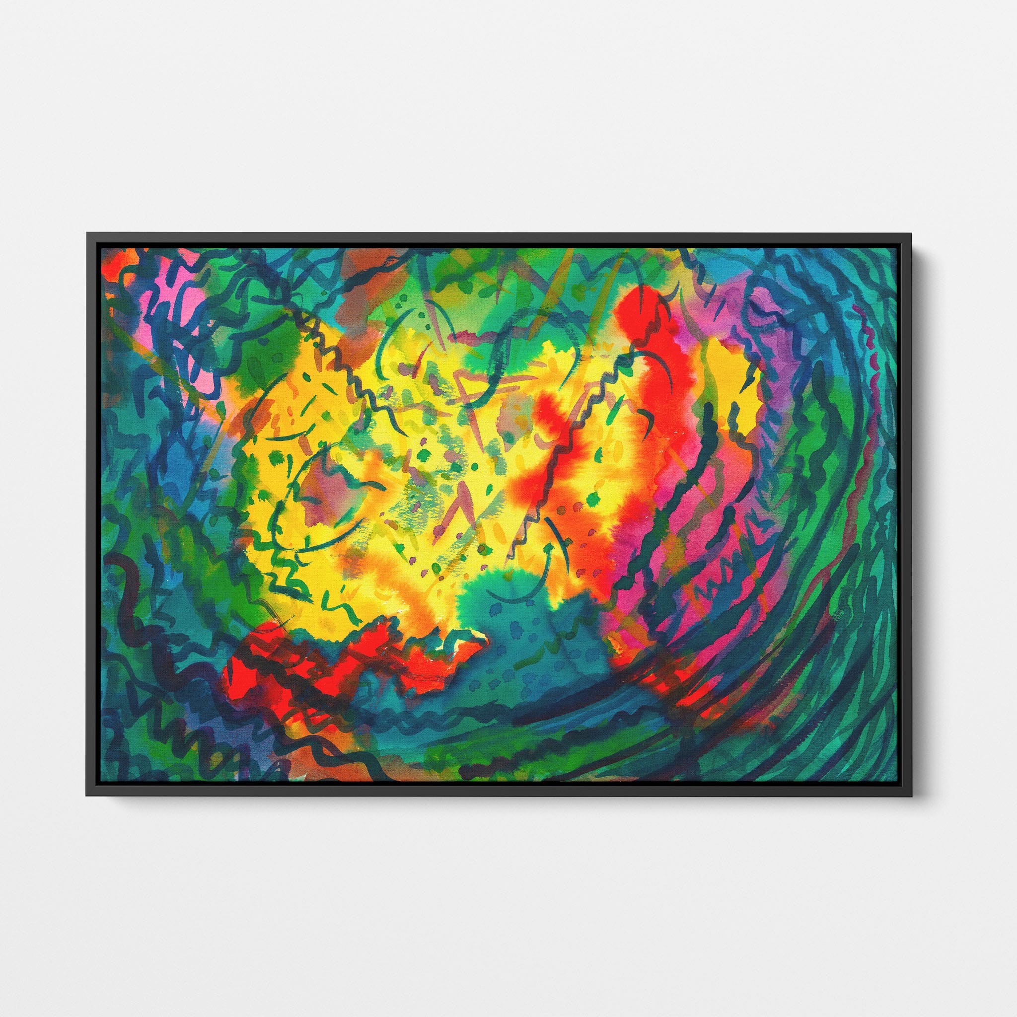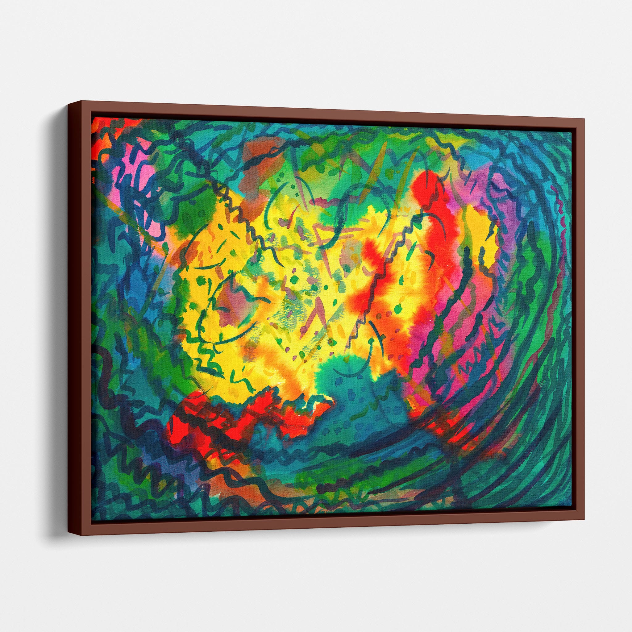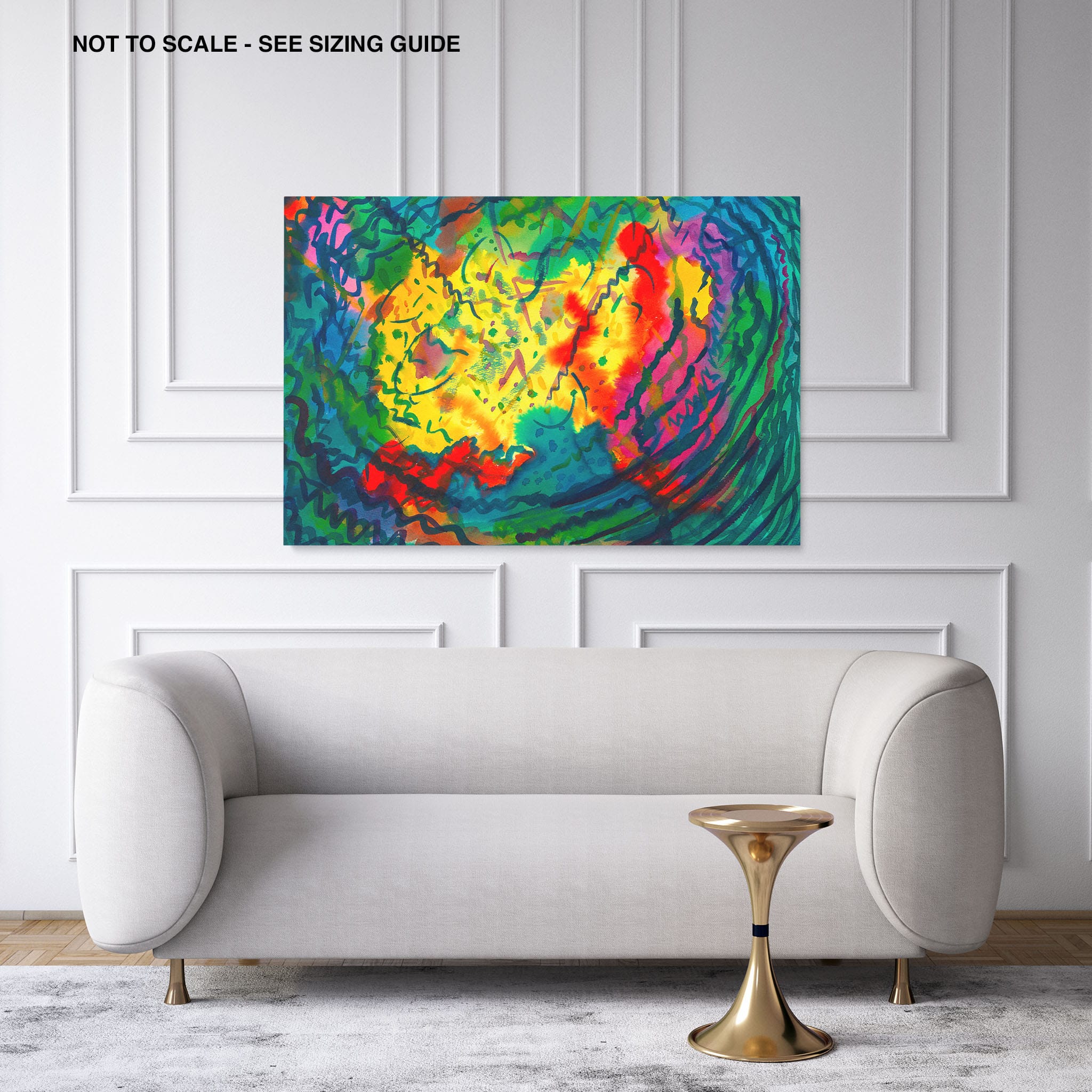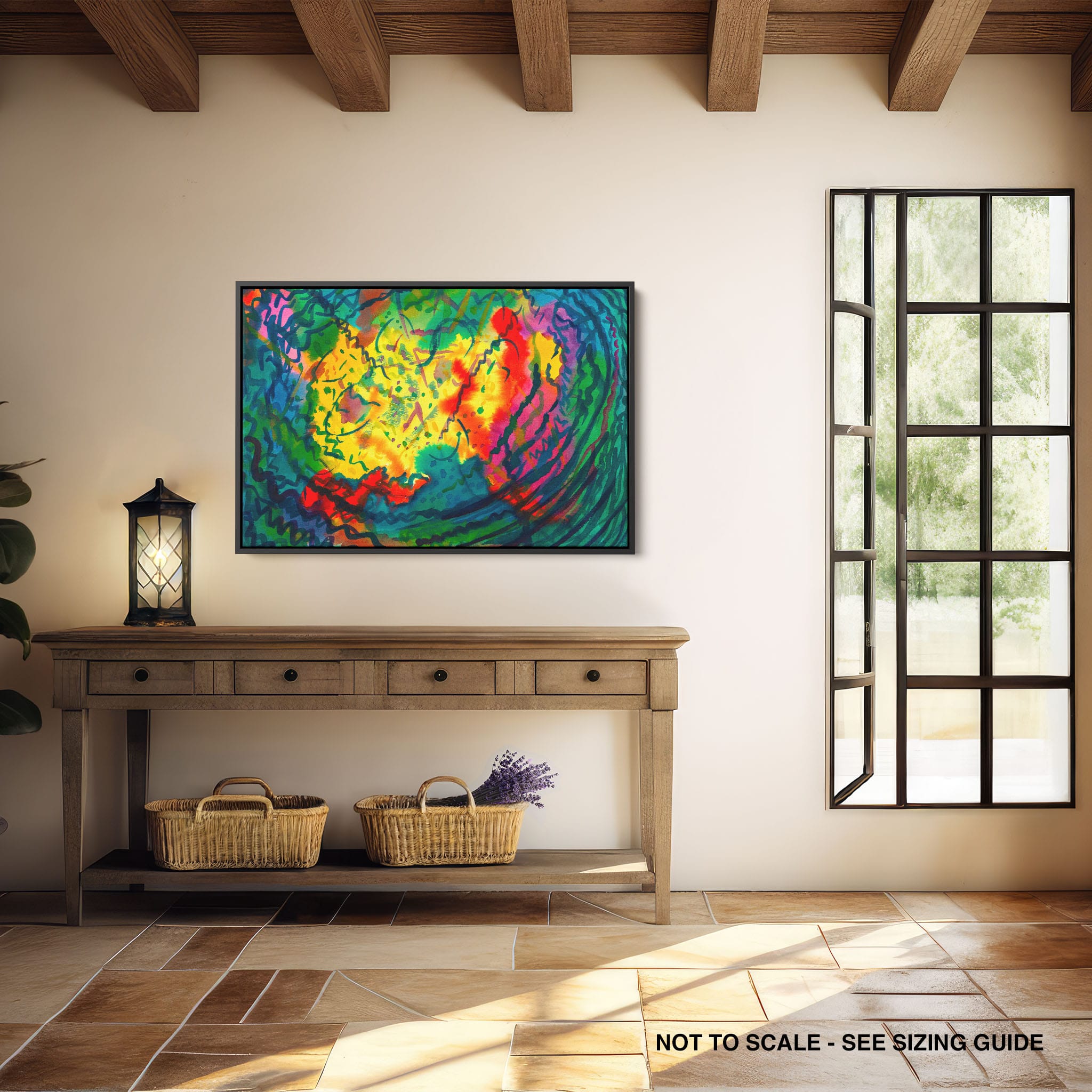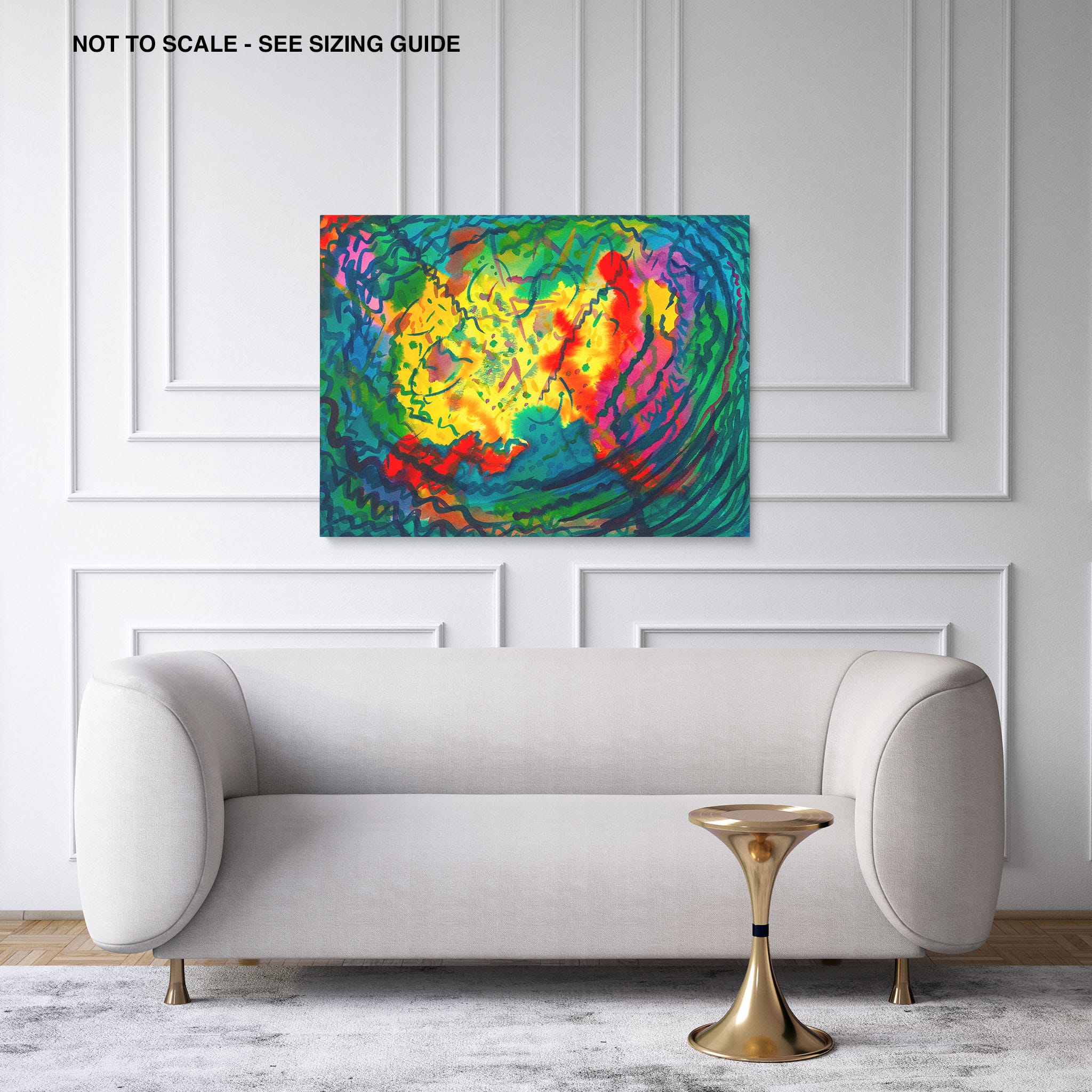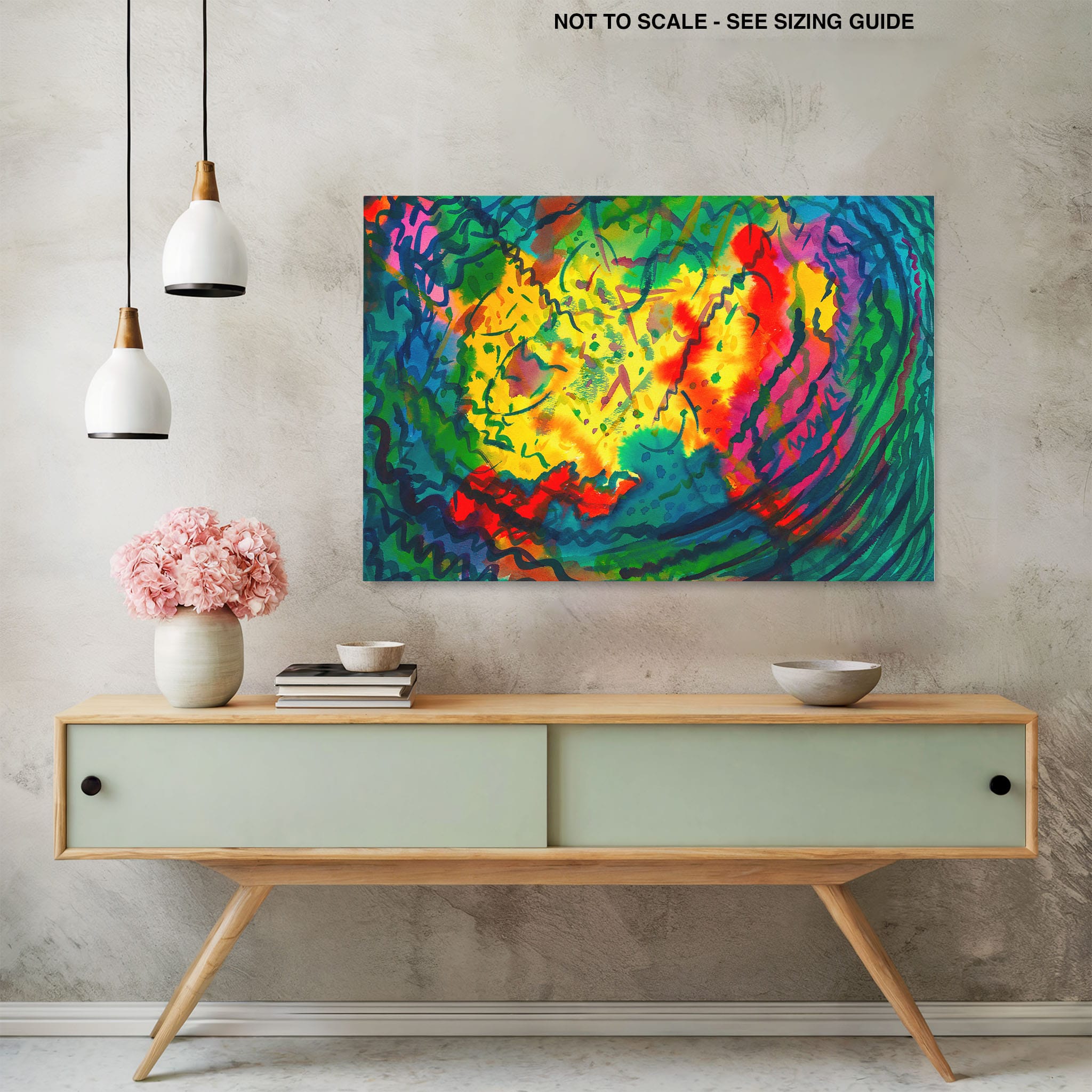 This artwork is titled "Auflösung" by Karl Wiener, painted in 1928. A vivid explosion of color radiates from the center, where brilliant yellows and reds dissolve into surrounding layers of blues, greens, and purples. Swirling dark lines spiral outward, as if capturing the moment of disintegration or release, reflecting the meaning of the title—“dissolution.” The spontaneous washes and dynamic outlines suggest energy escaping containment, both chaotic and harmonic. Rendered in watercolor, the blending and bleeding of pigment add an organic depth and motion. This fine art reproduction, sourced from a high-resolution photograph of the original, preserves the visual intensity and tactile flow. A bold piece for lovers of expressive color, abstraction, and 20th-century avant-garde aesthetics.