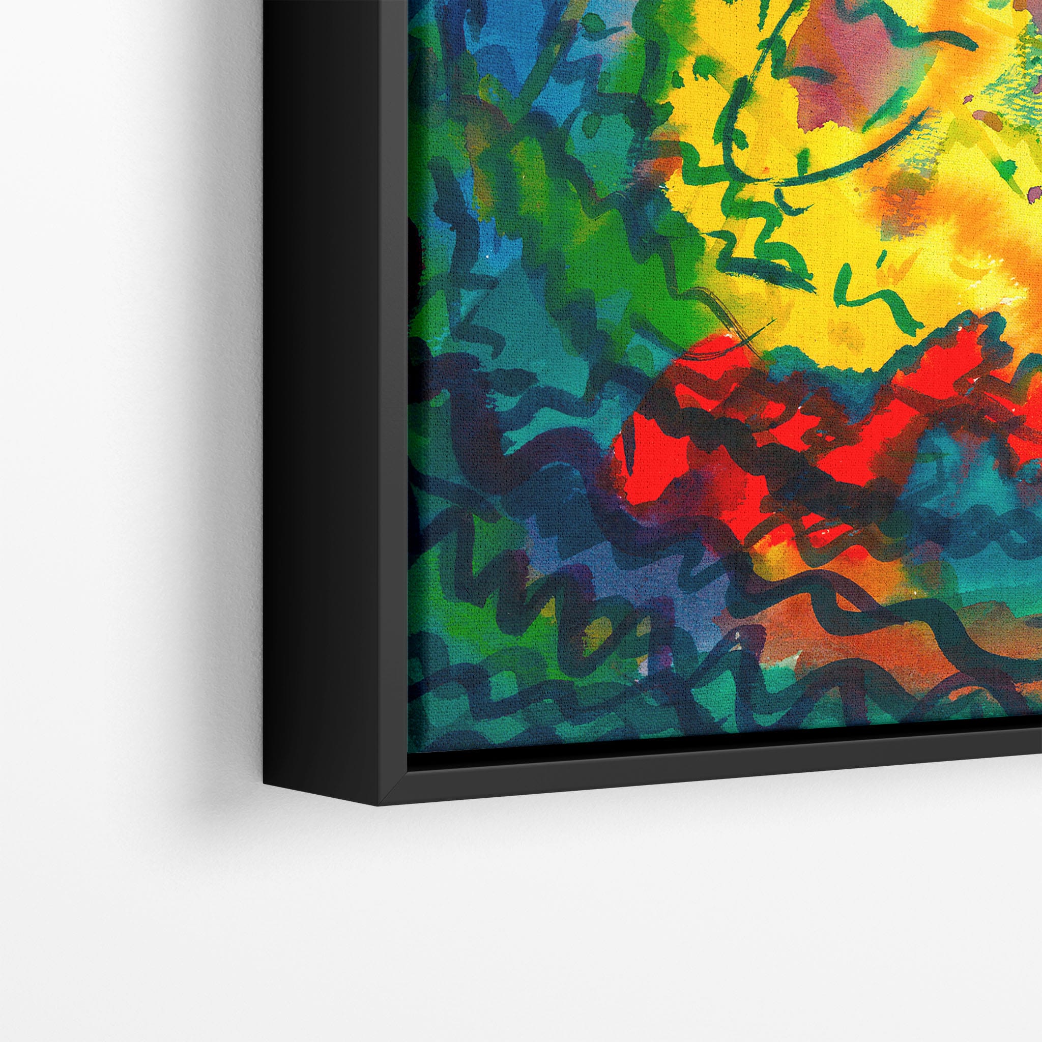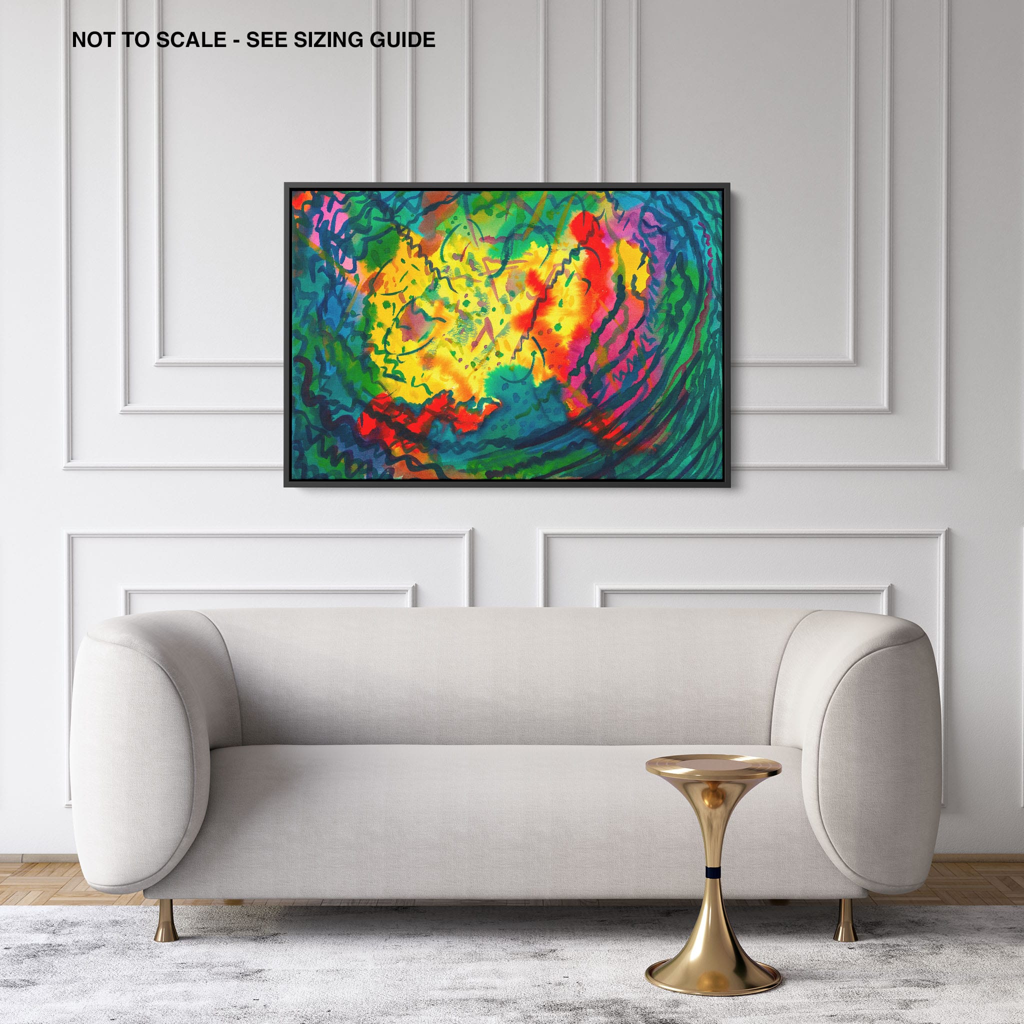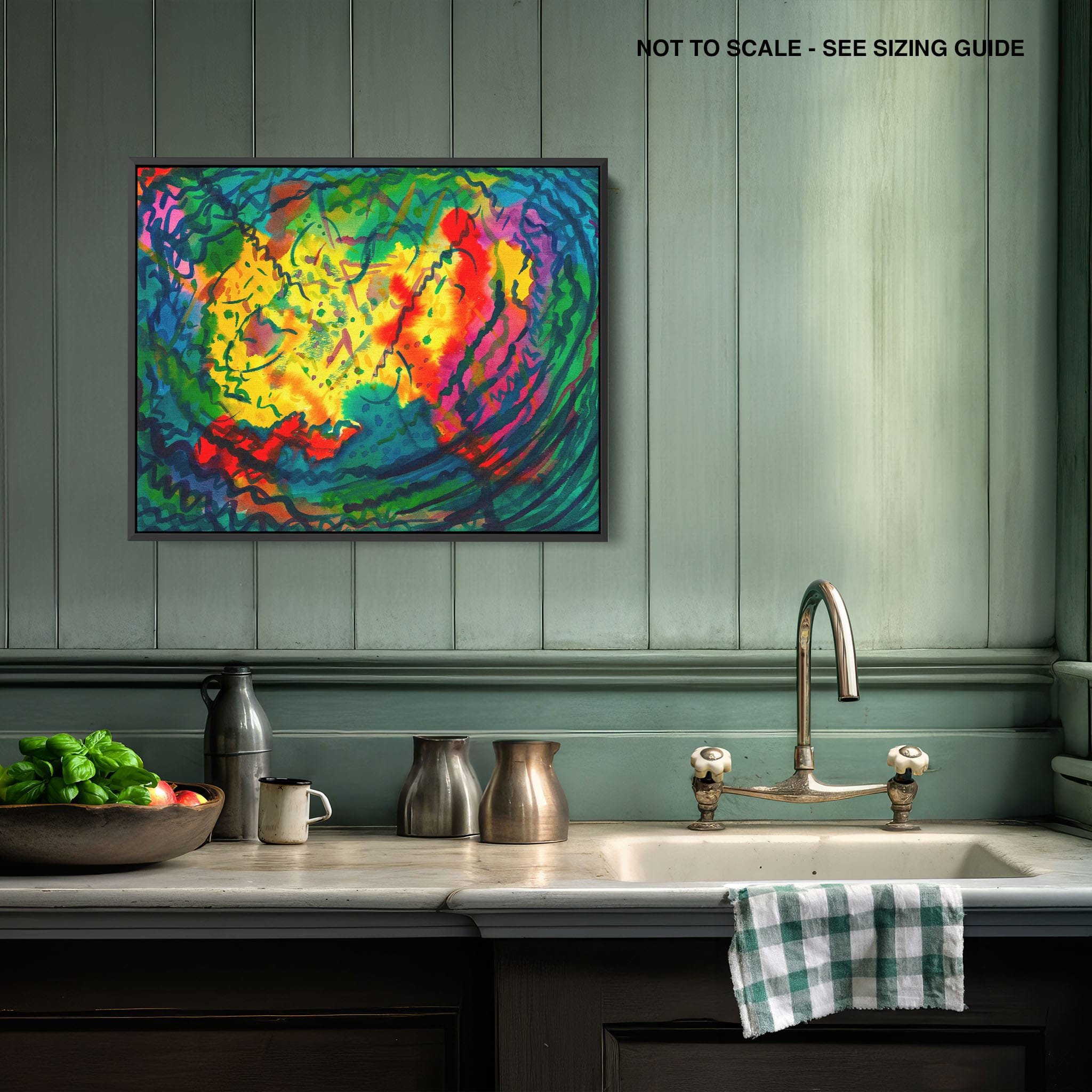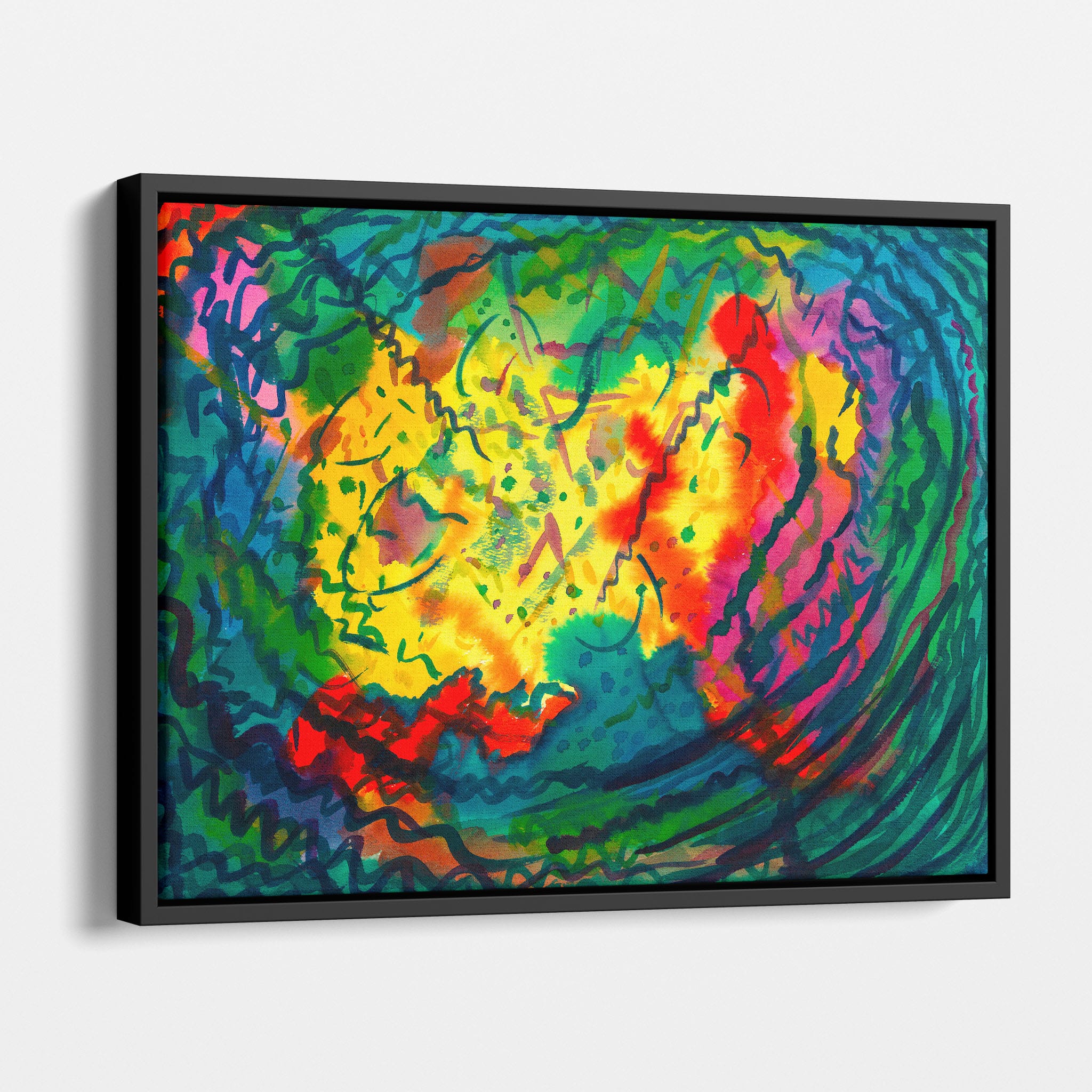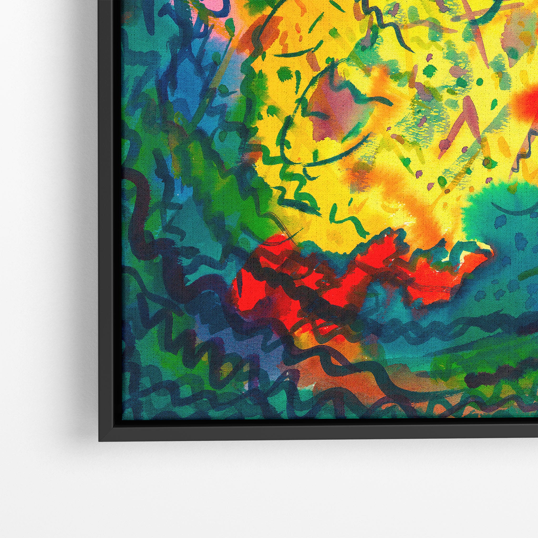 This artwork is titled "Auflösung" by Karl Wiener, painted in 1928. A vivid explosion of color radiates from the center, where brilliant yellows and reds dissolve into surrounding layers of blues, greens, and purples. Swirling dark lines spiral outward, as if capturing the moment of disintegration or release, reflecting the meaning of the title—“dissolution.” The spontaneous washes and dynamic outlines suggest energy escaping containment, both chaotic and harmonic. Rendered in watercolor, the blending and bleeding of pigment add an organic depth and motion. This fine art reproduction, sourced from a high-resolution photograph of the original, preserves the visual intensity and tactile flow. A bold piece for lovers of expressive color, abstraction, and 20th-century avant-garde aesthetics.