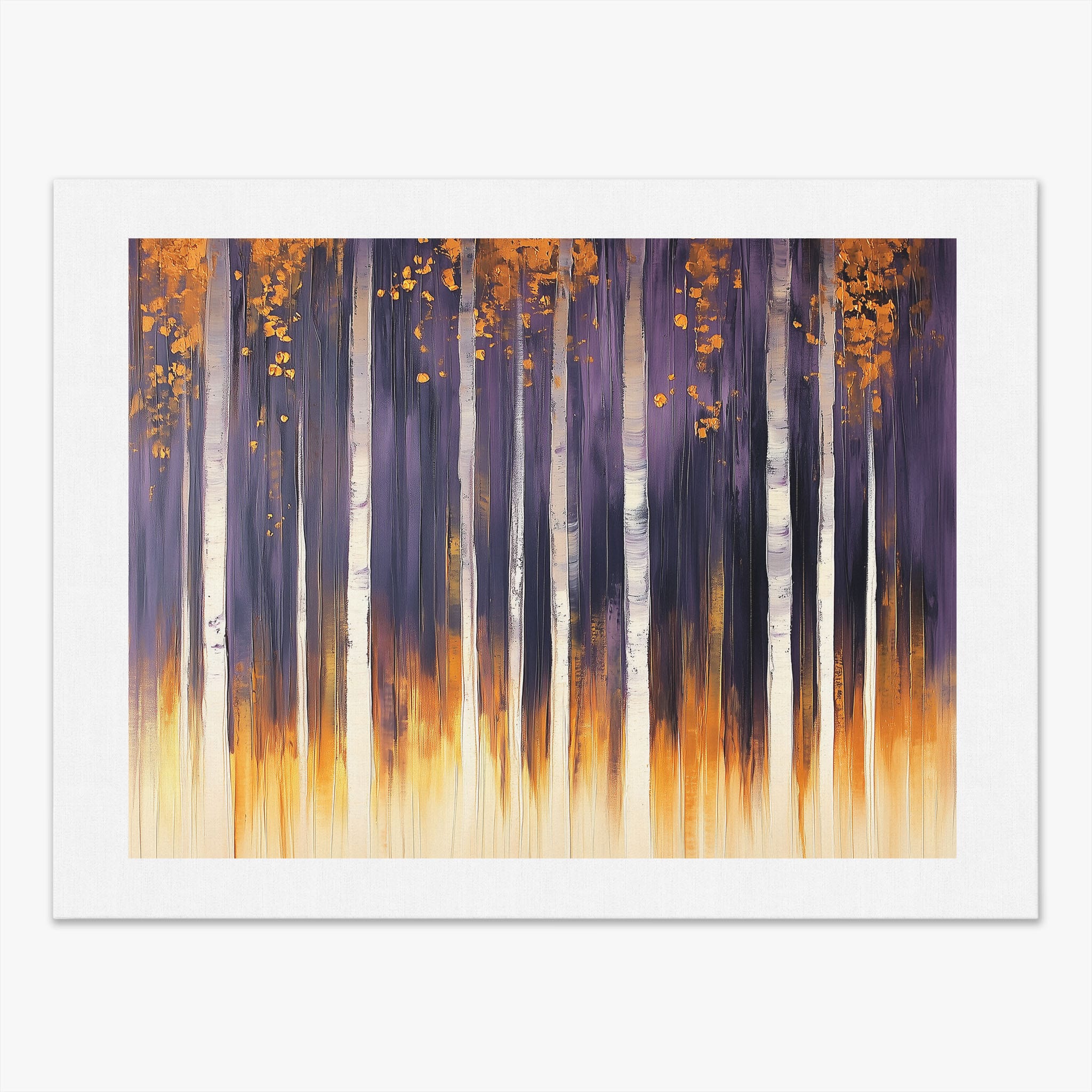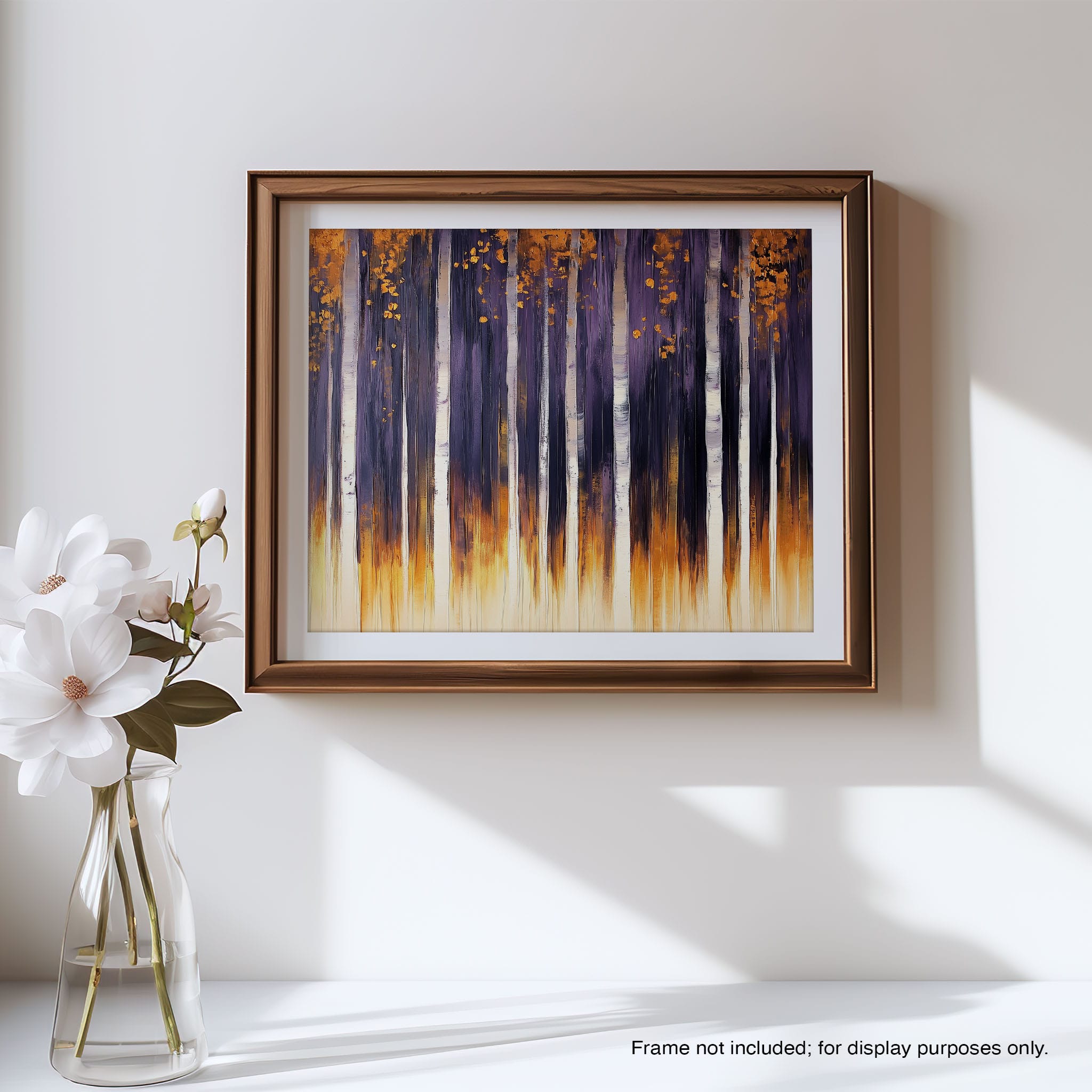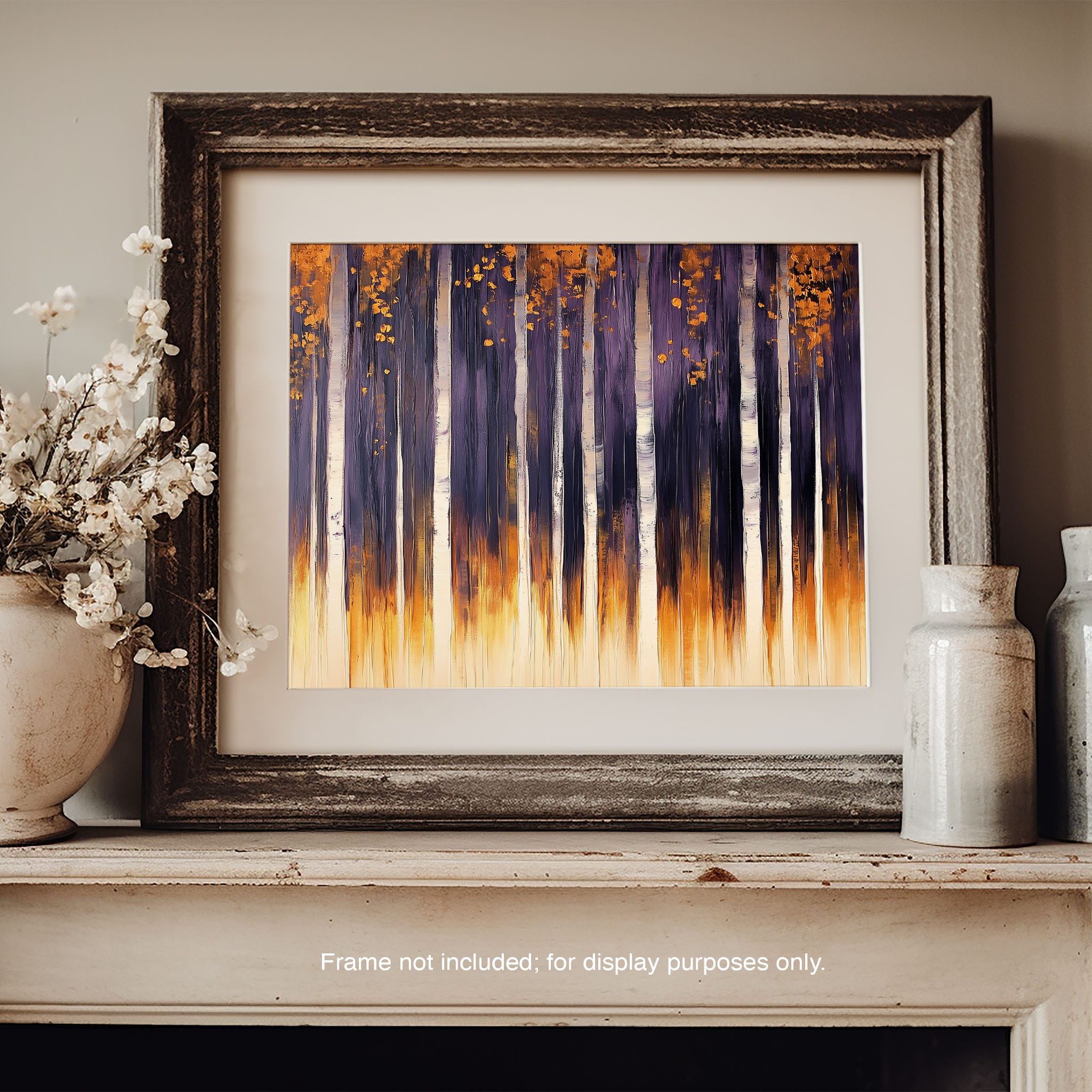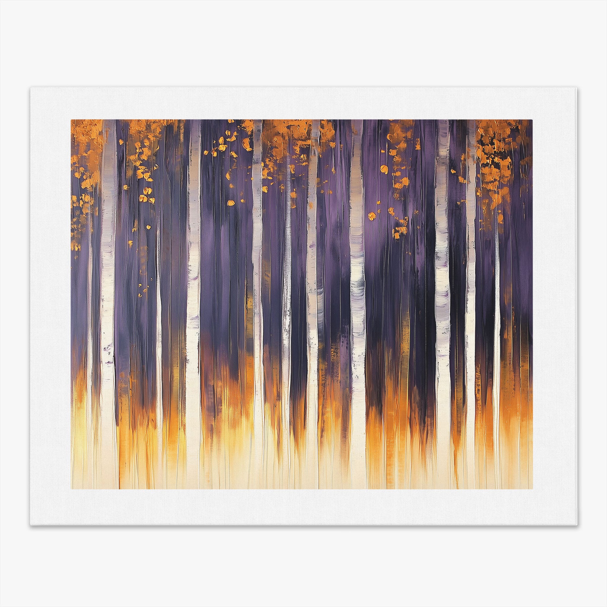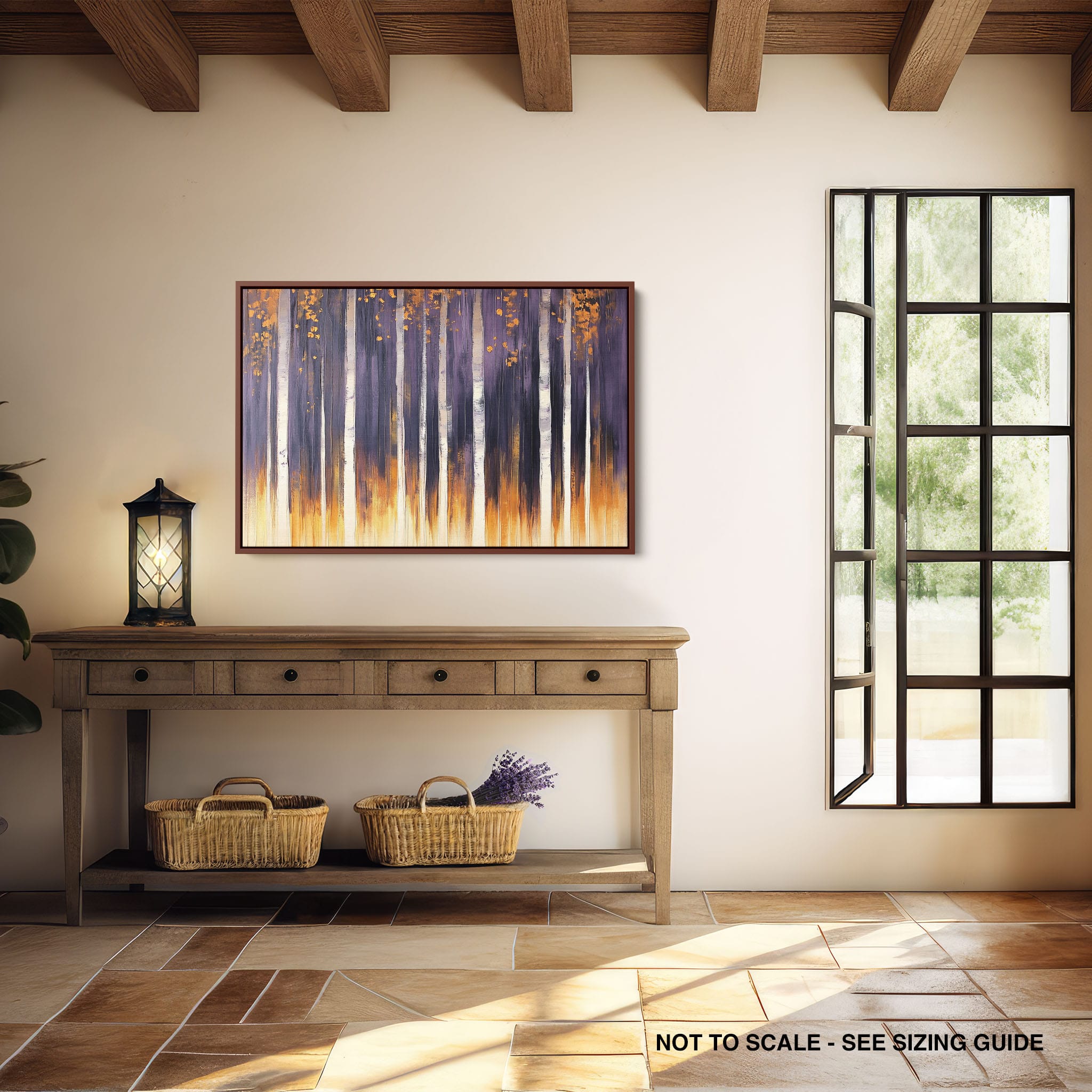 This painting captures an ethereal forest scene, illuminated by the fiery tones of autumn. Rich purples blend into vibrant oranges and golds, creating a visual spectacle that feels both serene and lively. This abstract expressionist work uses bold strokes and a modern approach to encapsulate the essence of fall, making it an eye-catching statement piece for any room. Ideal for those who appreciate nature's transient beauty and the artistry that can capture such fleeting moments. Add a touch of warmth and color to your living space with this compelling piece.