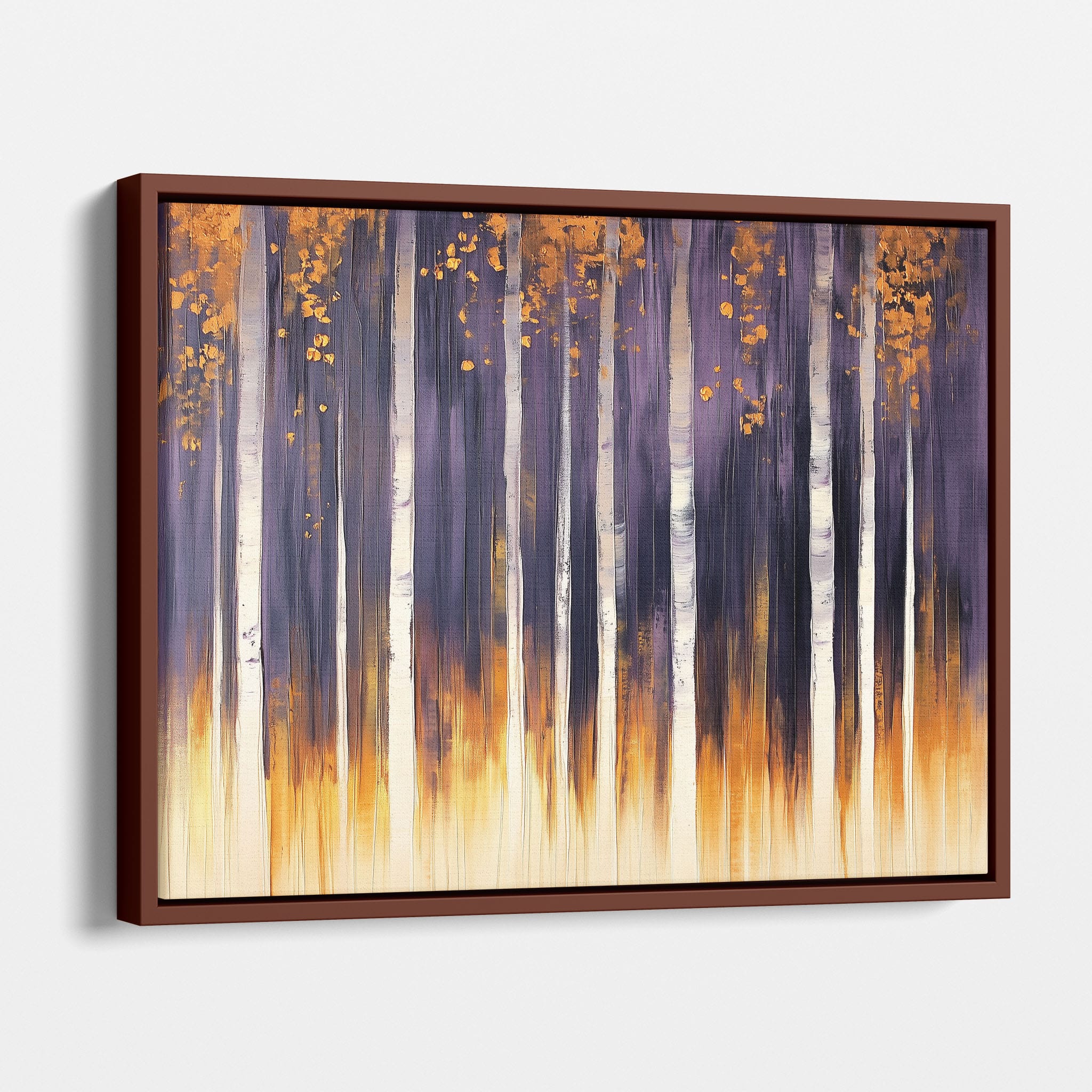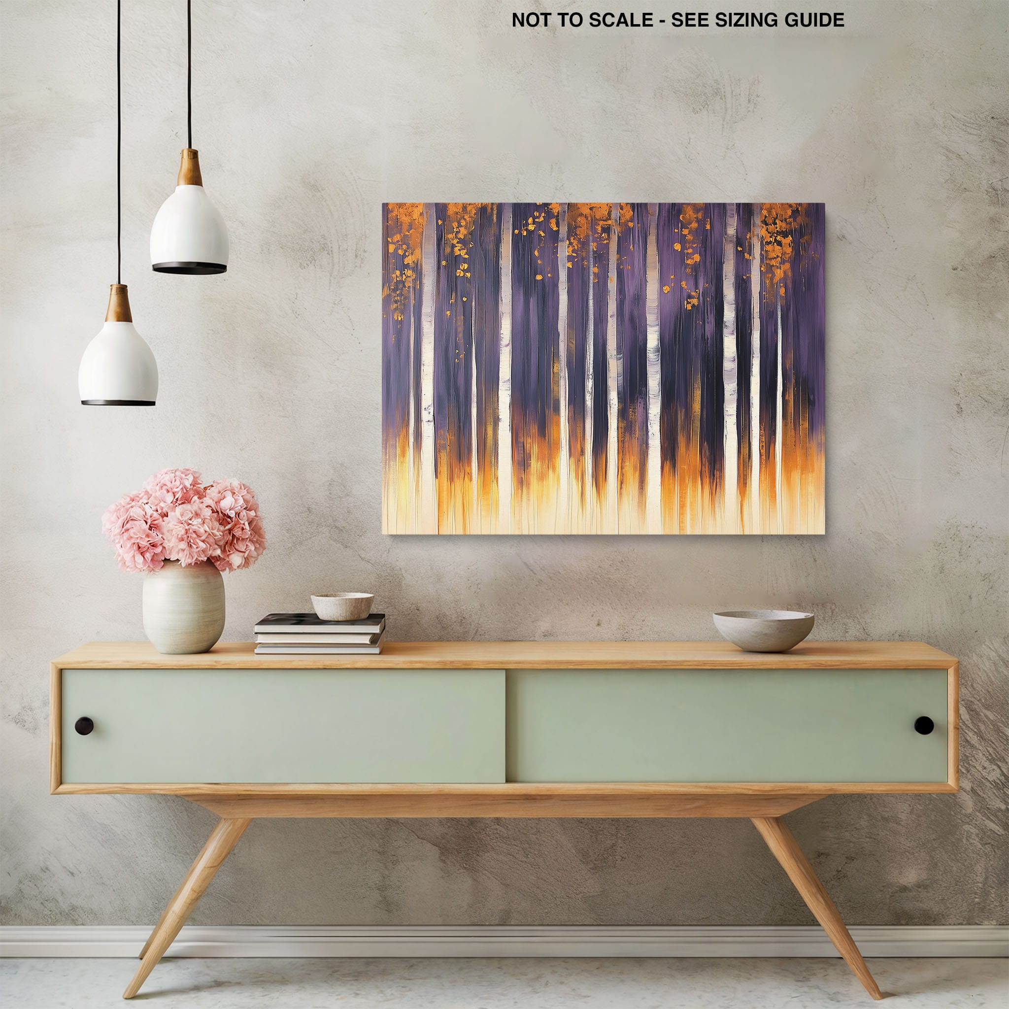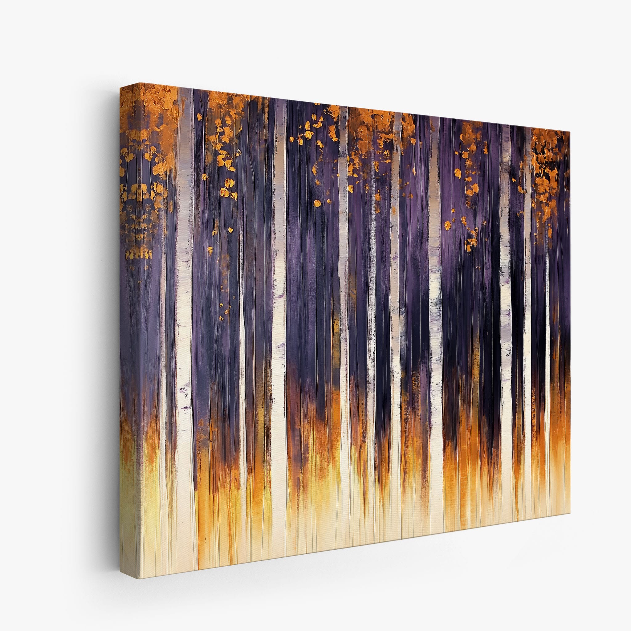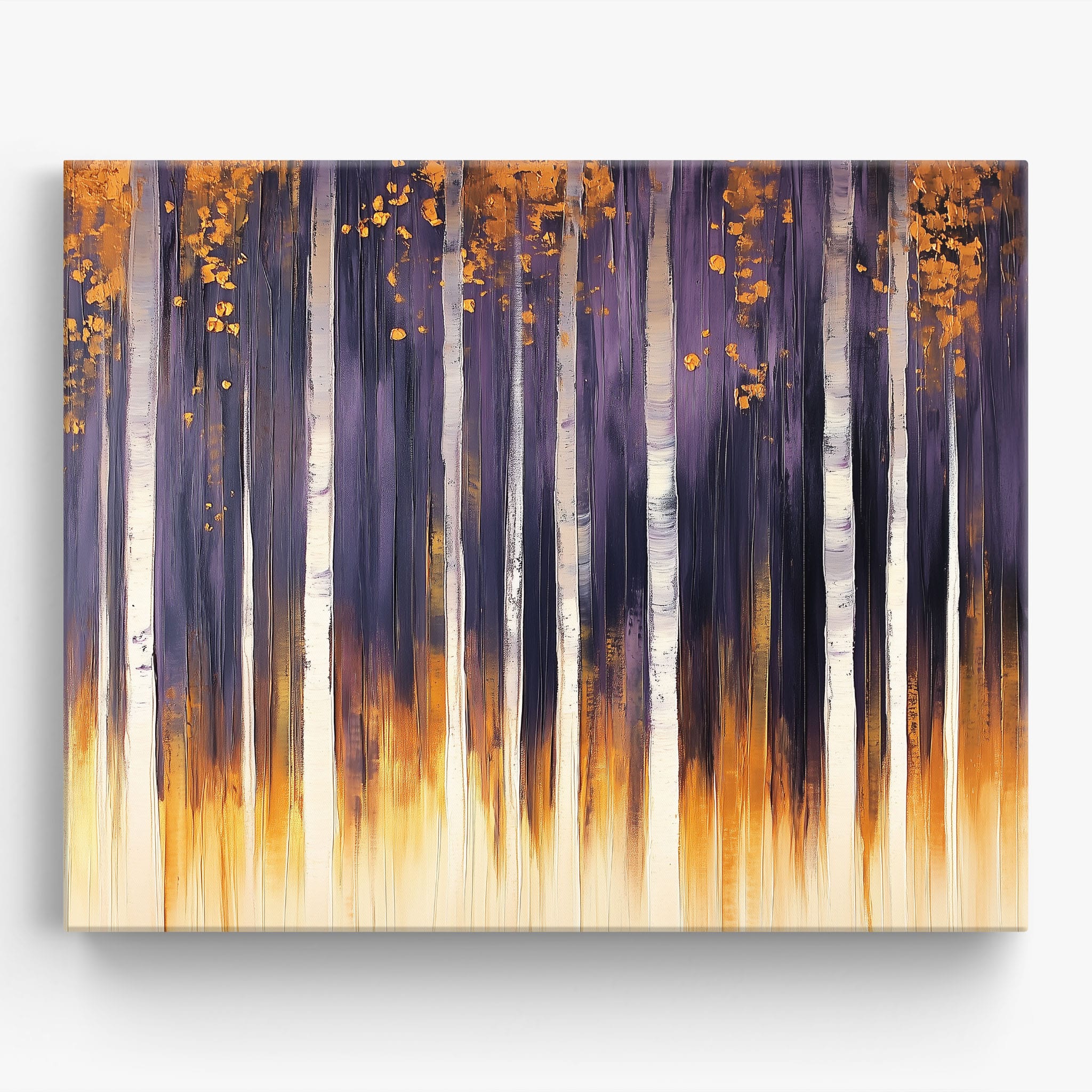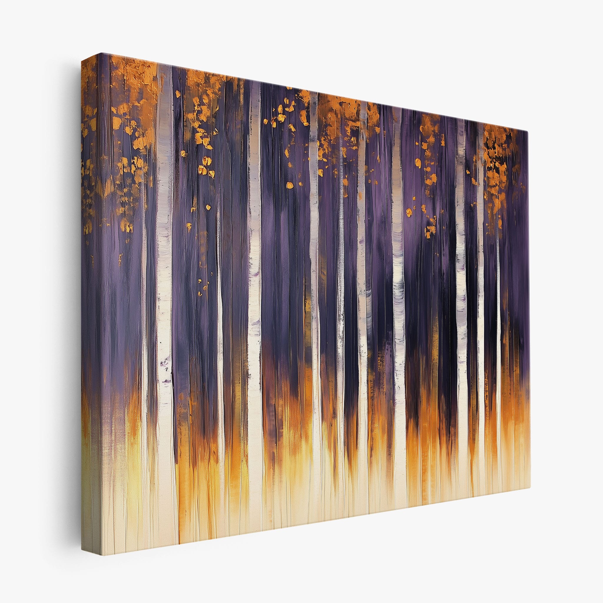 This painting captures an ethereal forest scene, illuminated by the fiery tones of autumn. Rich purples blend into vibrant oranges and golds, creating a visual spectacle that feels both serene and lively. This abstract expressionist work uses bold strokes and a modern approach to encapsulate the essence of fall, making it an eye-catching statement piece for any room. Ideal for those who appreciate nature's transient beauty and the artistry that can capture such fleeting moments. Add a touch of warmth and color to your living space with this compelling piece.