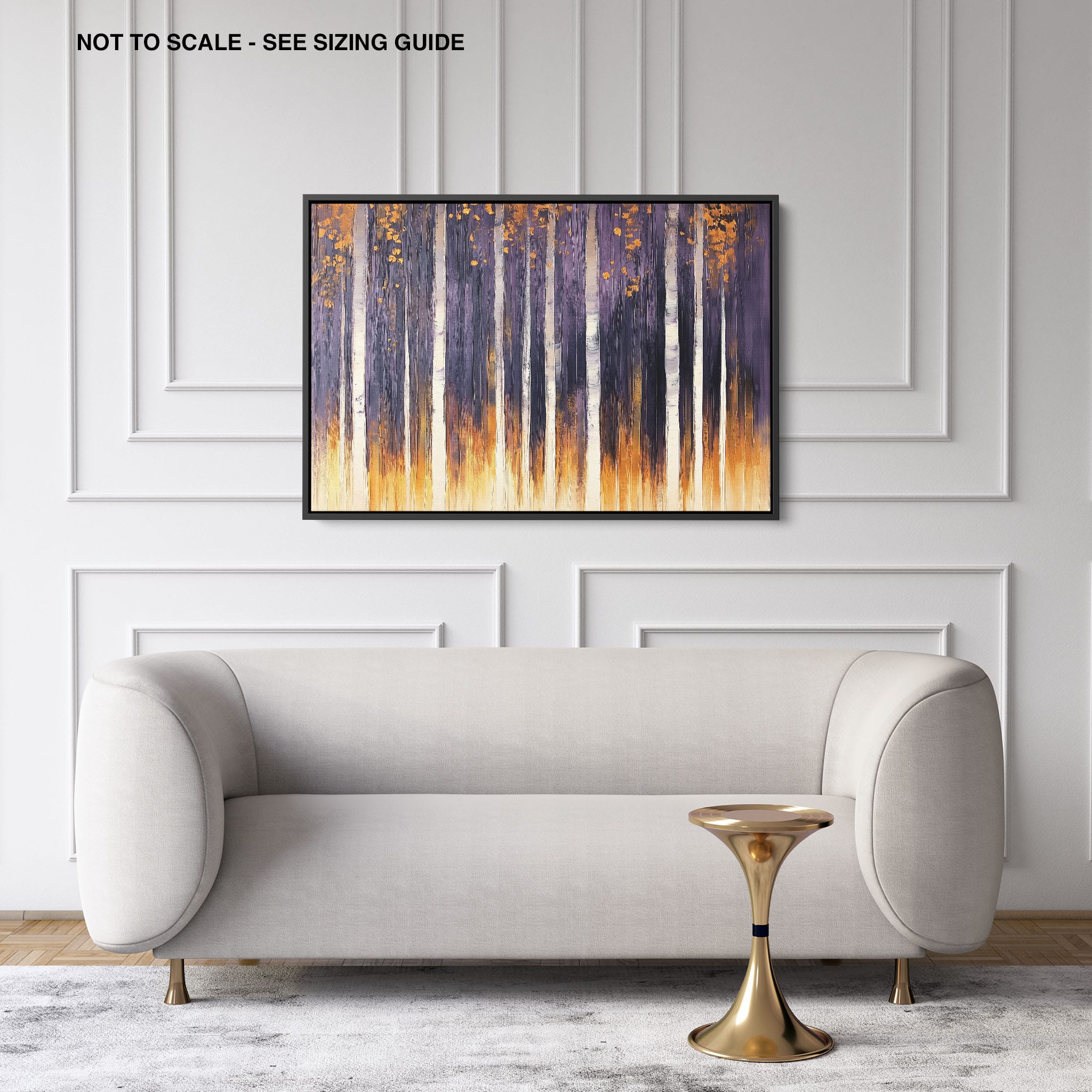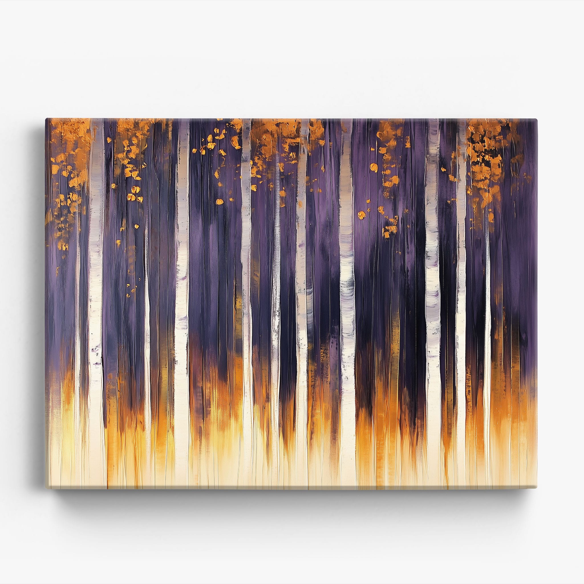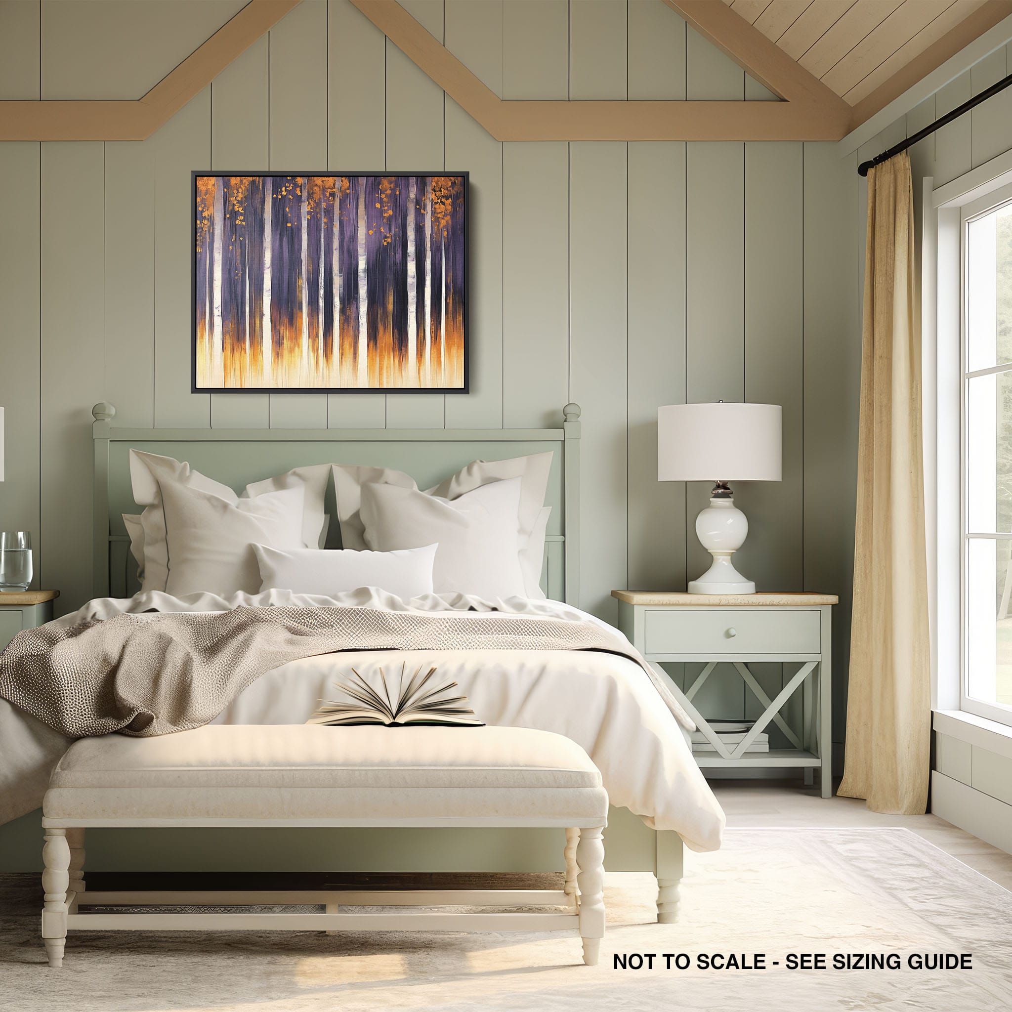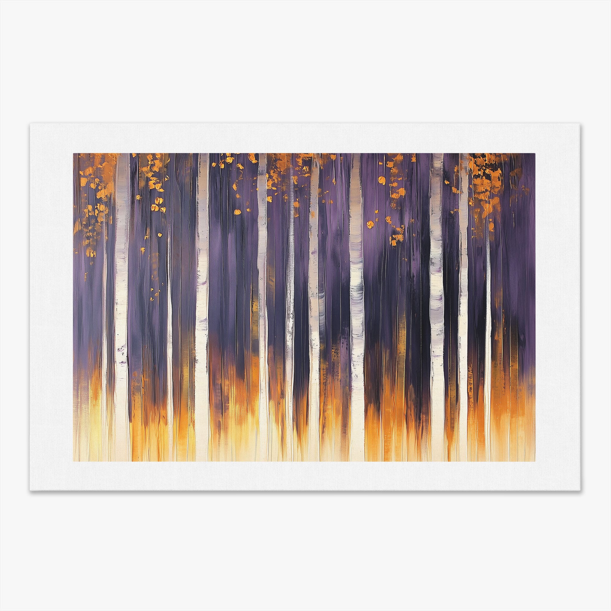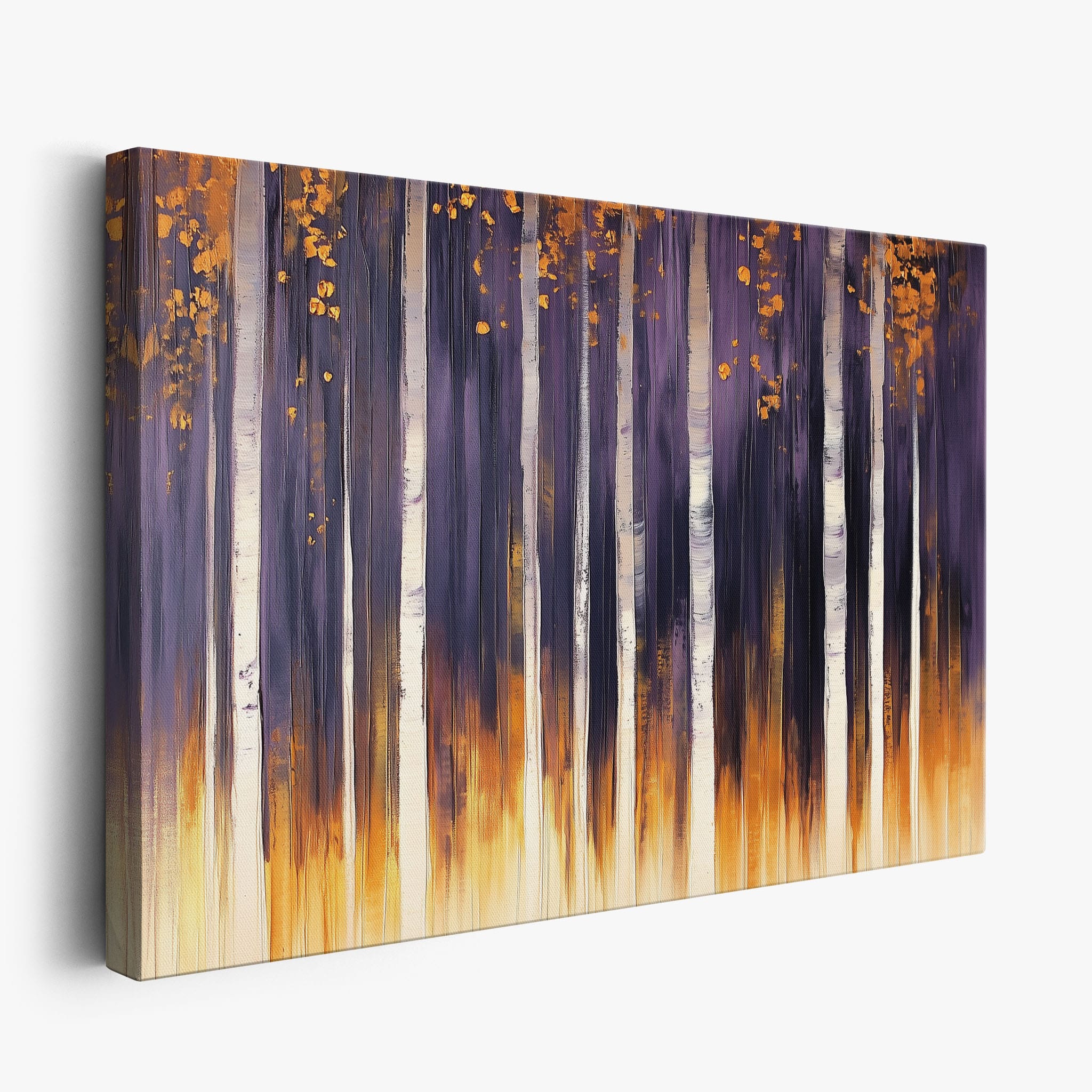 This painting captures an ethereal forest scene, illuminated by the fiery tones of autumn. Rich purples blend into vibrant oranges and golds, creating a visual spectacle that feels both serene and lively. This abstract expressionist work uses bold strokes and a modern approach to encapsulate the essence of fall, making it an eye-catching statement piece for any room. Ideal for those who appreciate nature's transient beauty and the artistry that can capture such fleeting moments. Add a touch of warmth and color to your living space with this compelling piece.