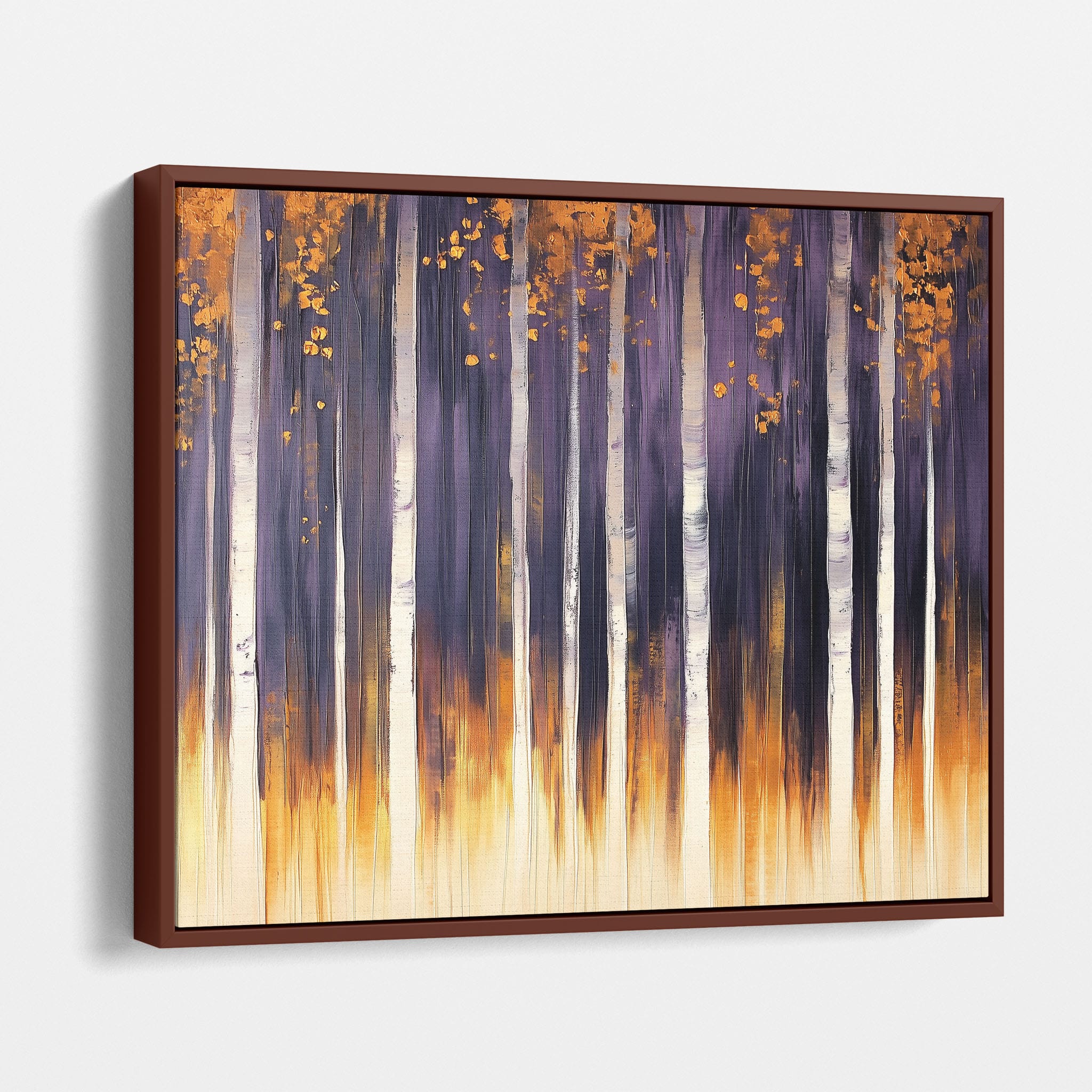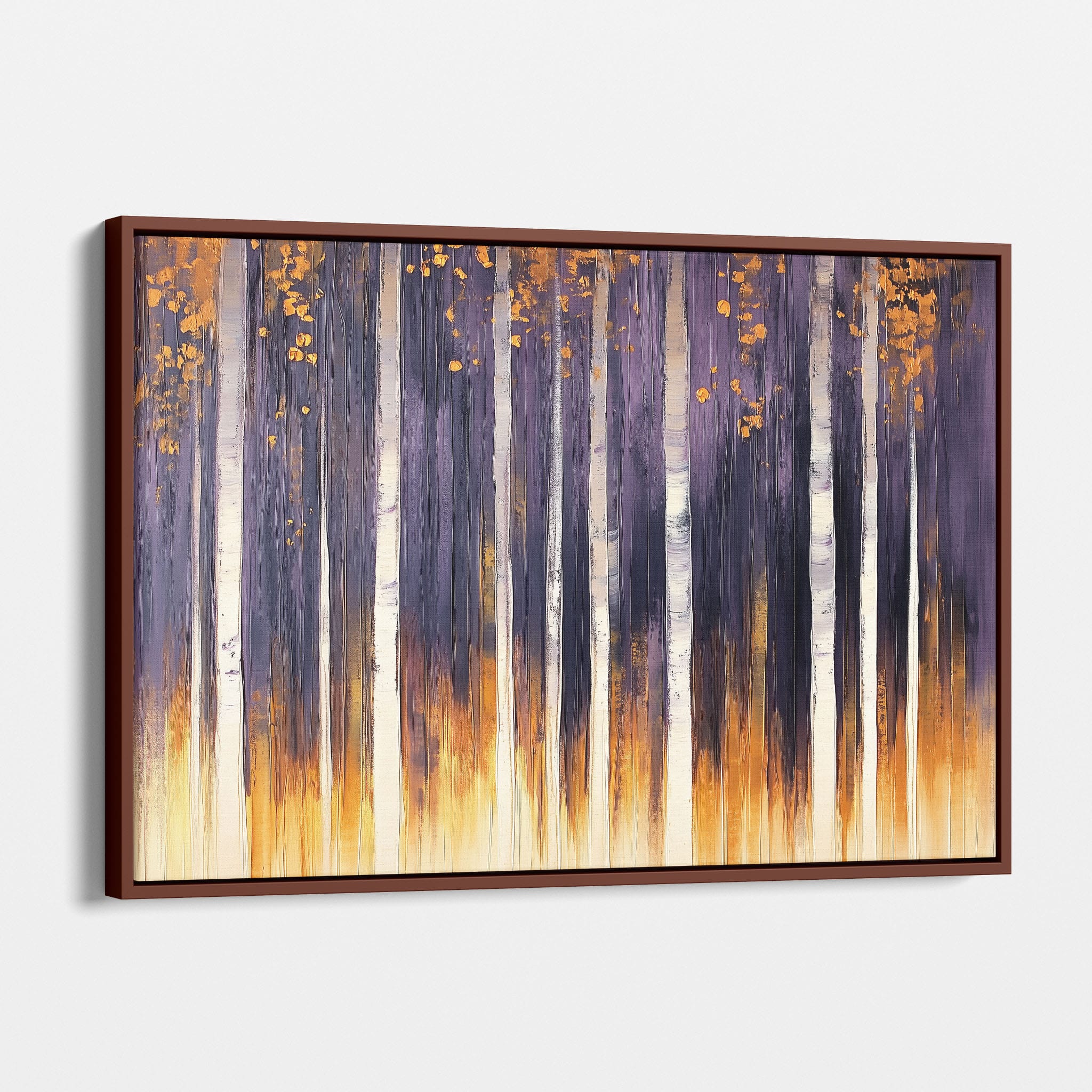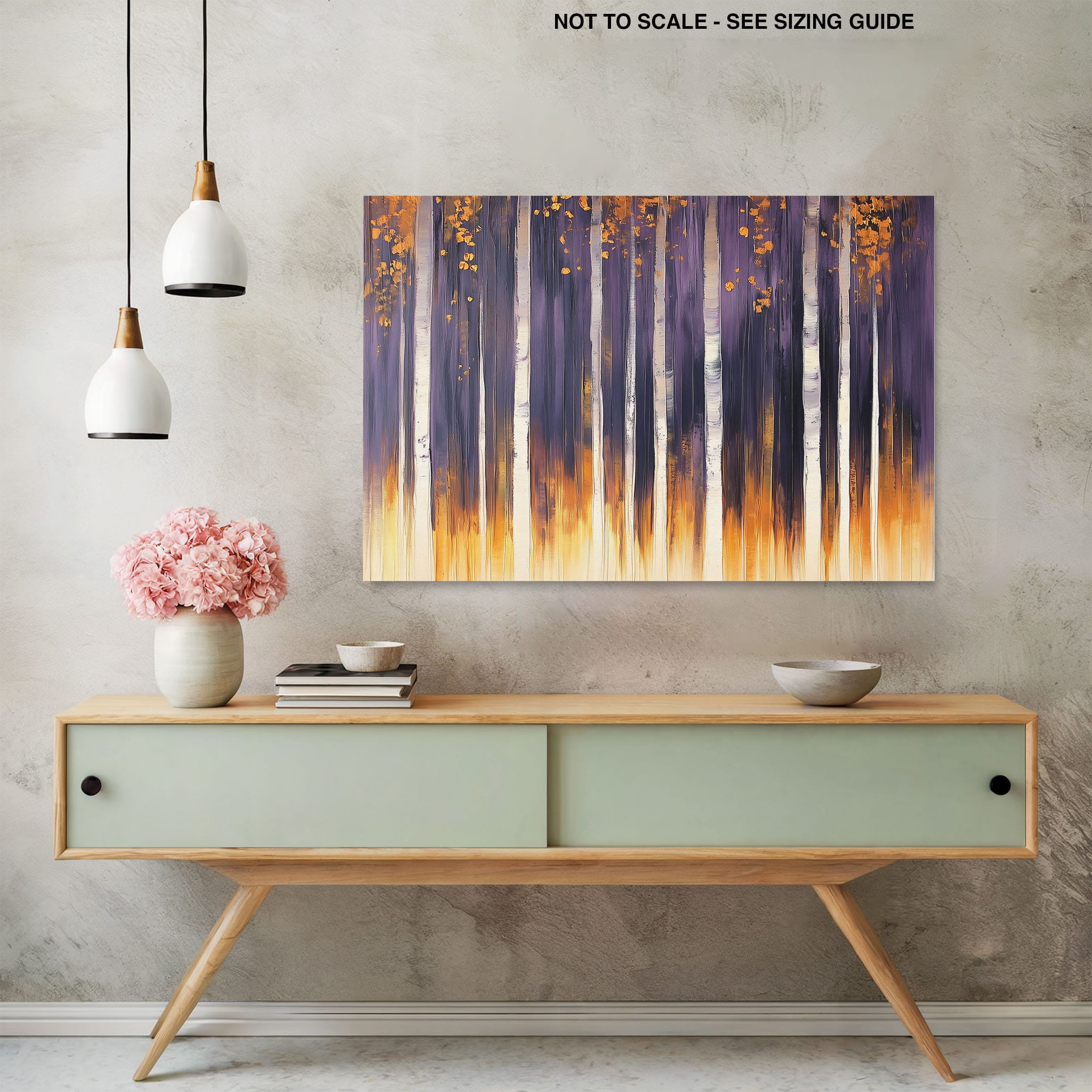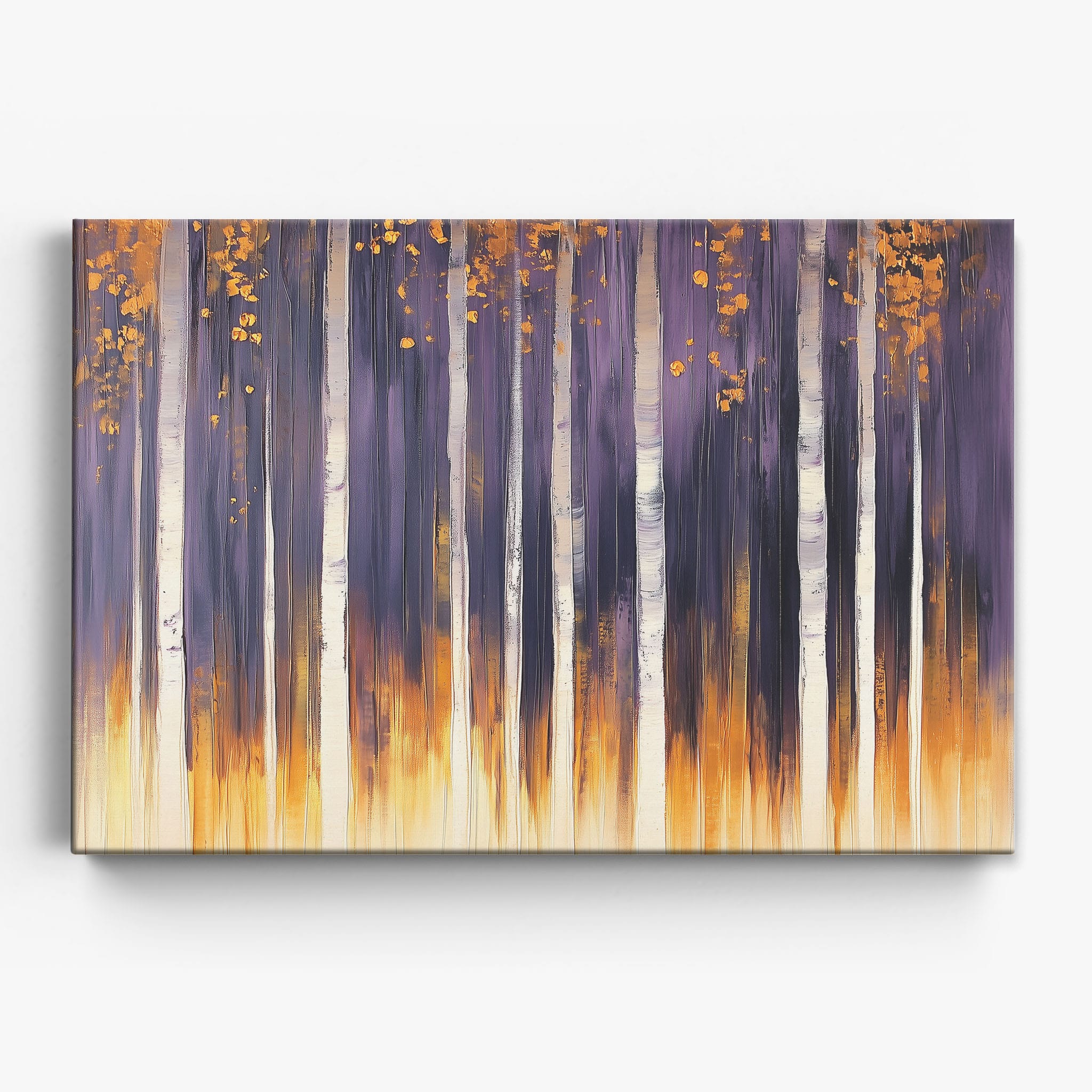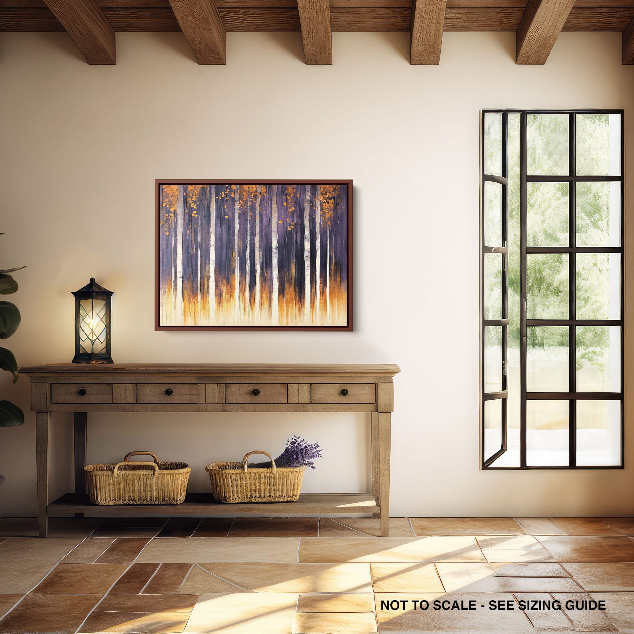 This painting captures an ethereal forest scene, illuminated by the fiery tones of autumn. Rich purples blend into vibrant oranges and golds, creating a visual spectacle that feels both serene and lively. This abstract expressionist work uses bold strokes and a modern approach to encapsulate the essence of fall, making it an eye-catching statement piece for any room. Ideal for those who appreciate nature's transient beauty and the artistry that can capture such fleeting moments. Add a touch of warmth and color to your living space with this compelling piece.