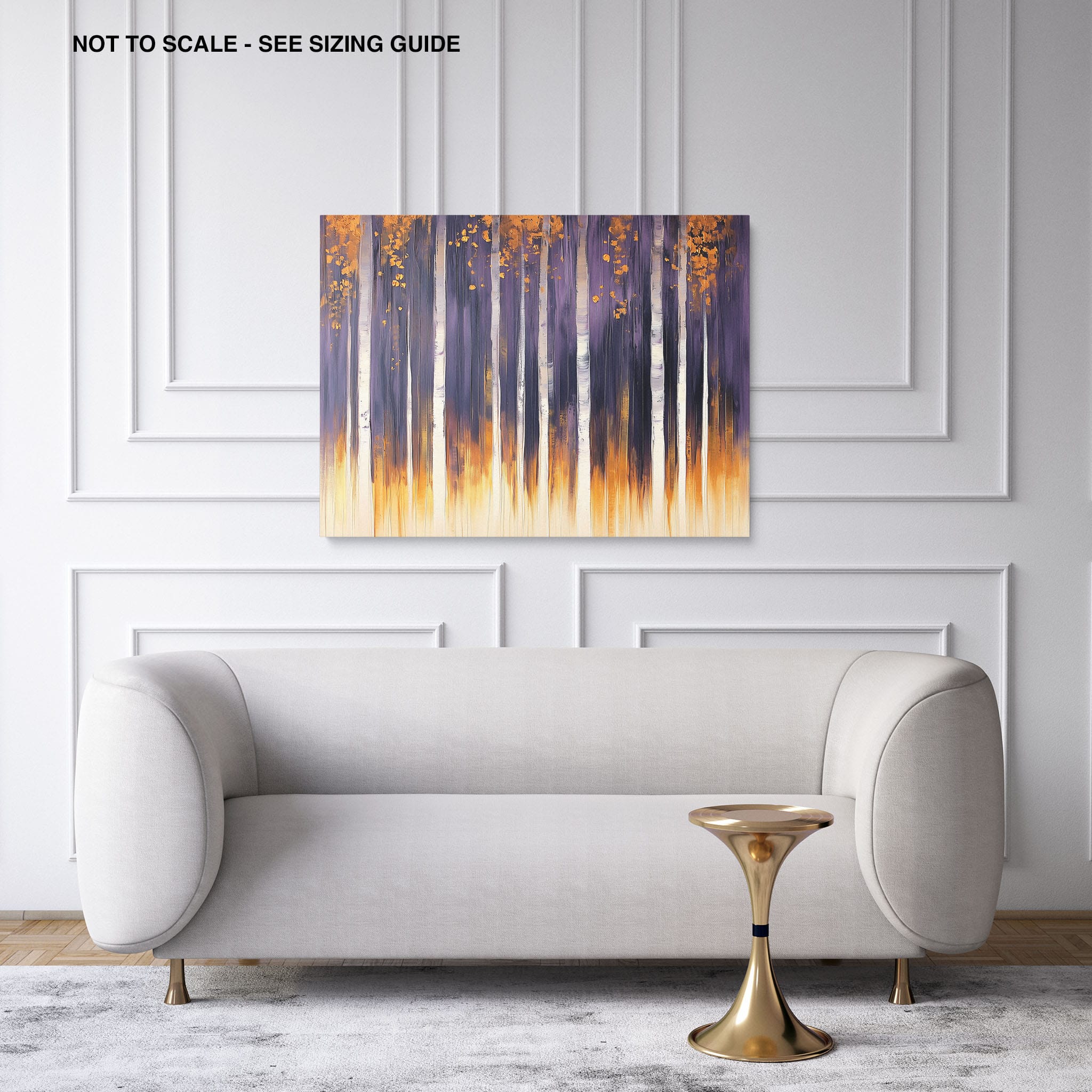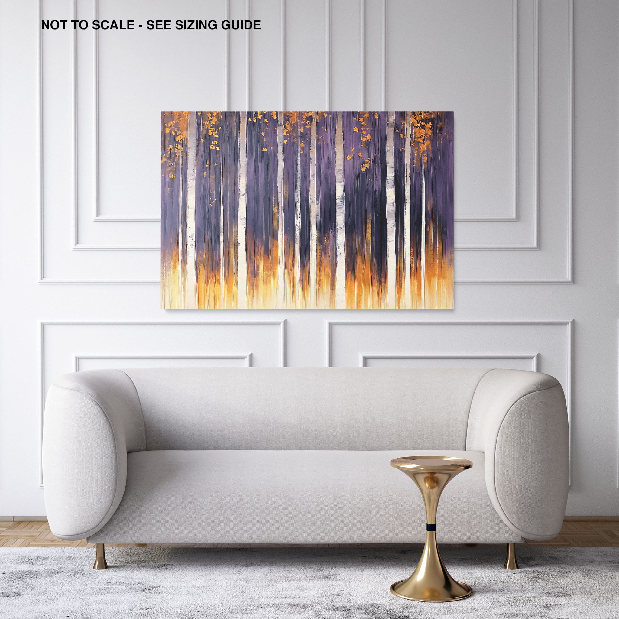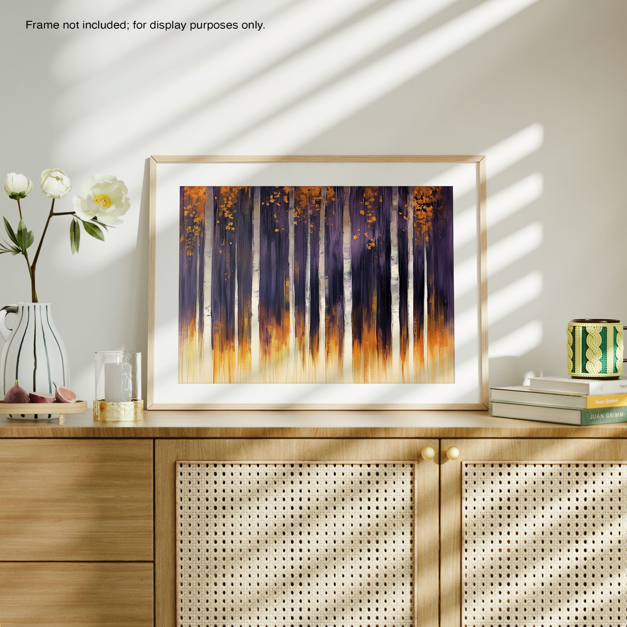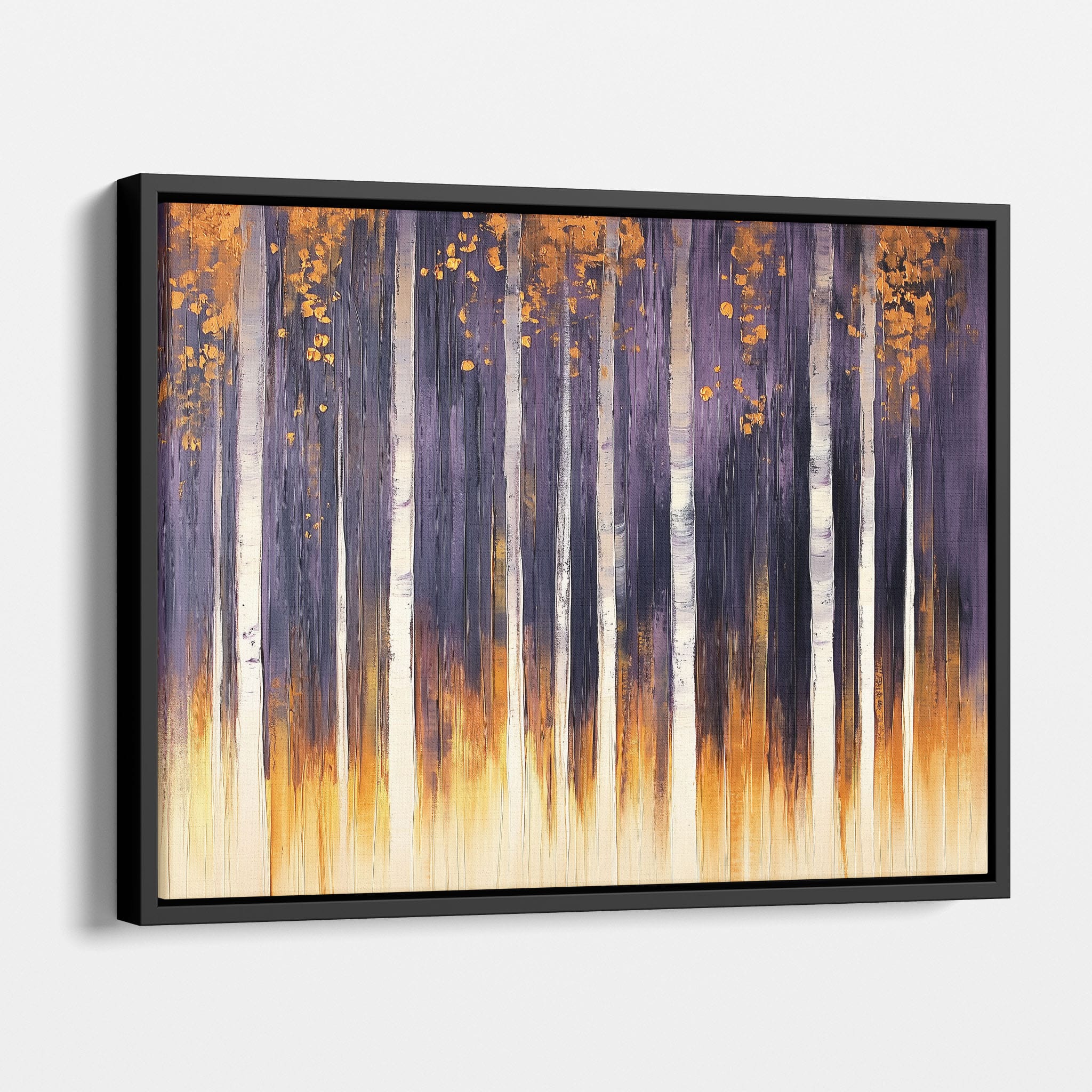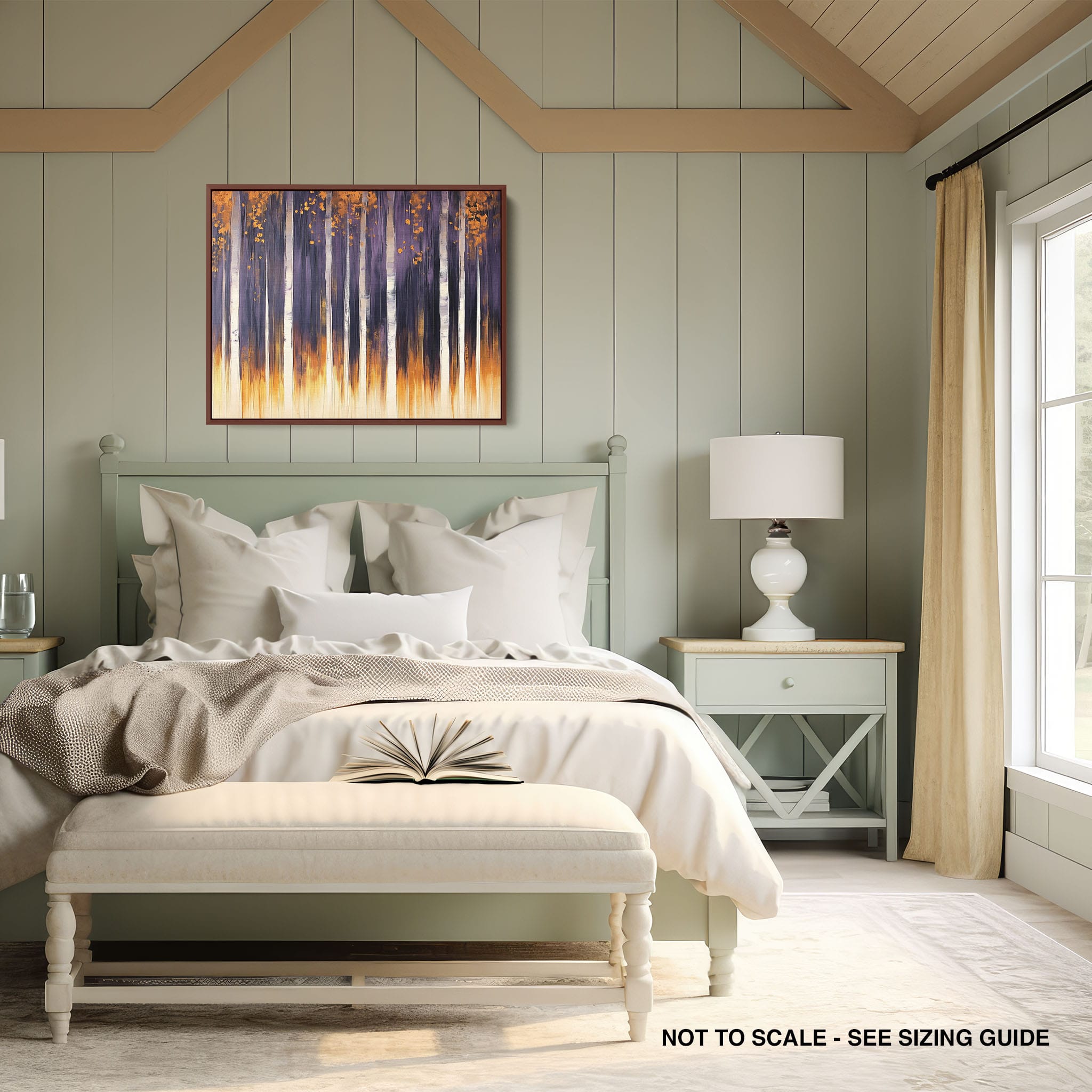 This painting captures an ethereal forest scene, illuminated by the fiery tones of autumn. Rich purples blend into vibrant oranges and golds, creating a visual spectacle that feels both serene and lively. This abstract expressionist work uses bold strokes and a modern approach to encapsulate the essence of fall, making it an eye-catching statement piece for any room. Ideal for those who appreciate nature's transient beauty and the artistry that can capture such fleeting moments. Add a touch of warmth and color to your living space with this compelling piece.