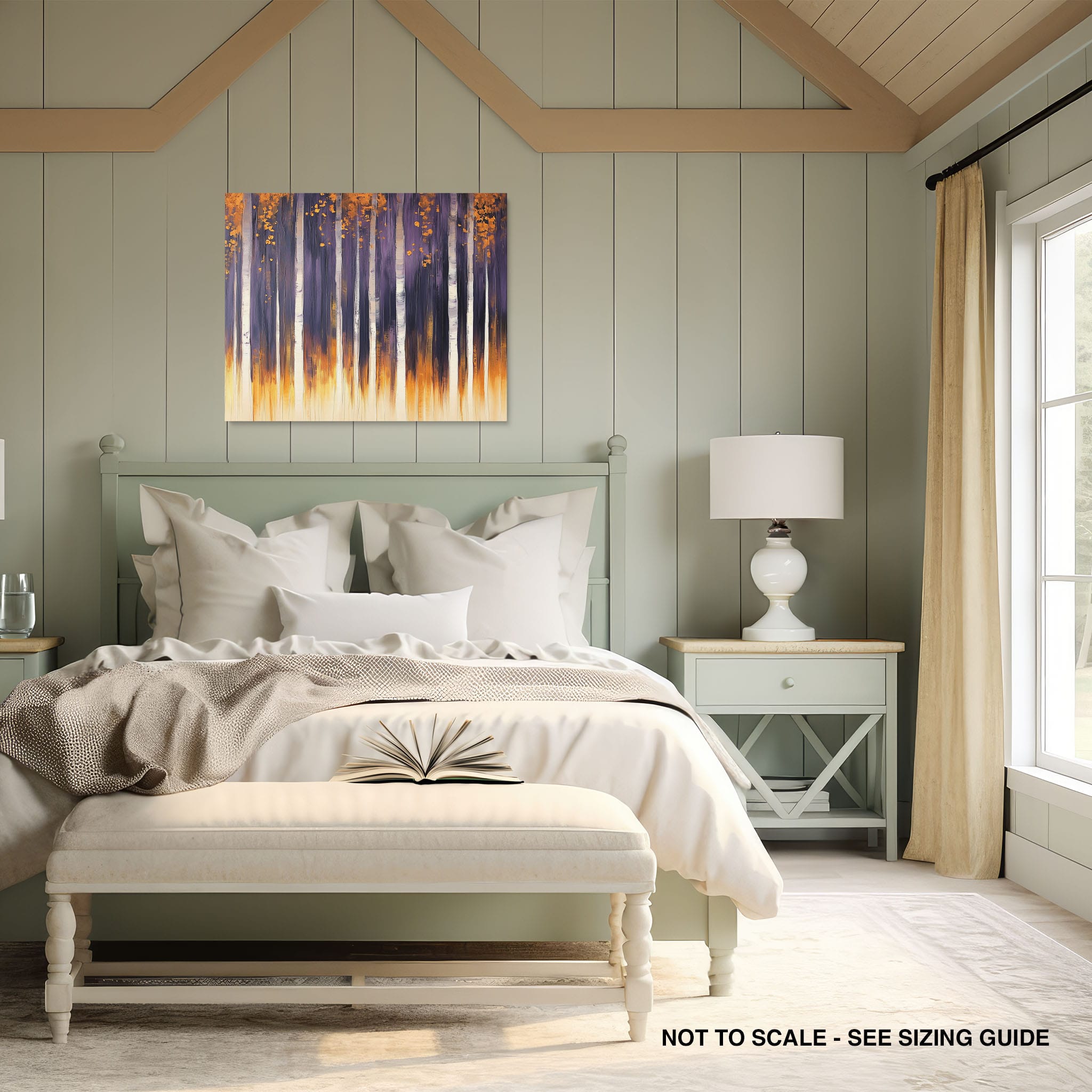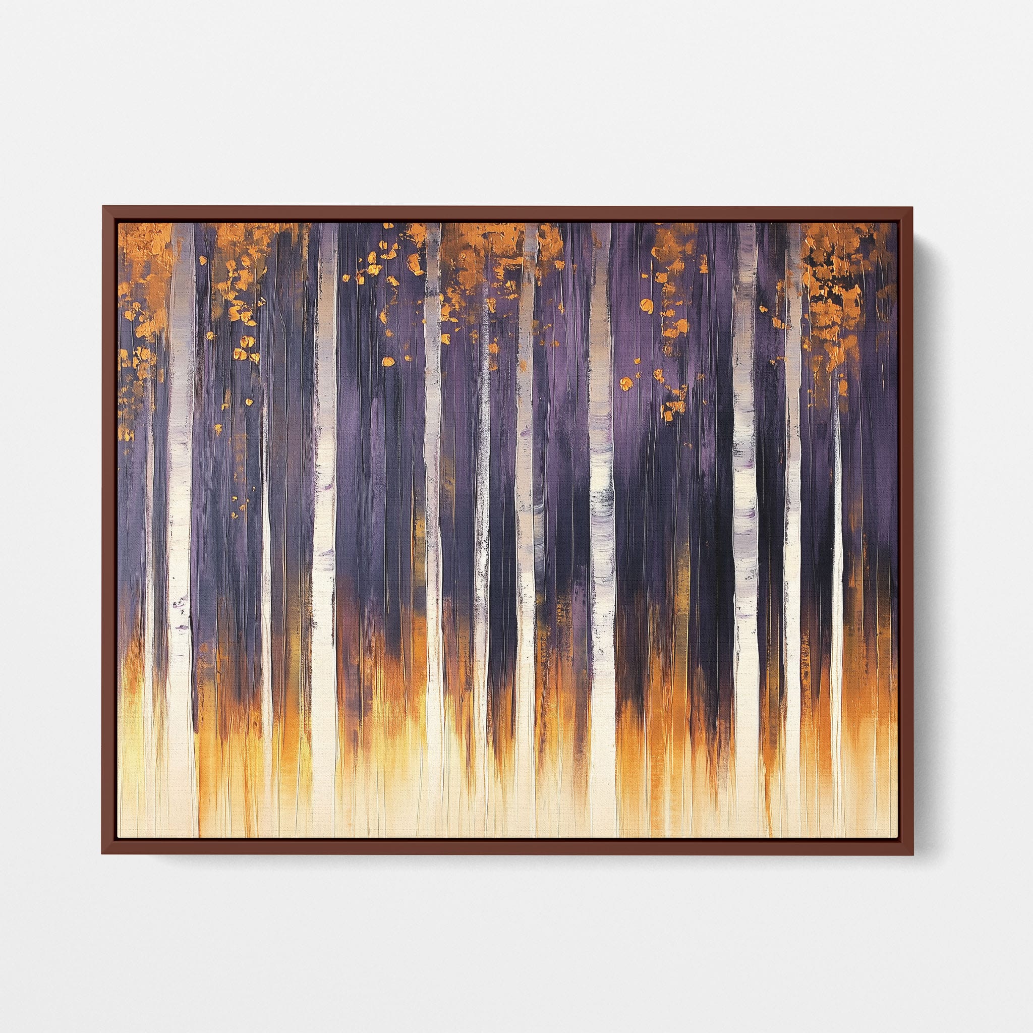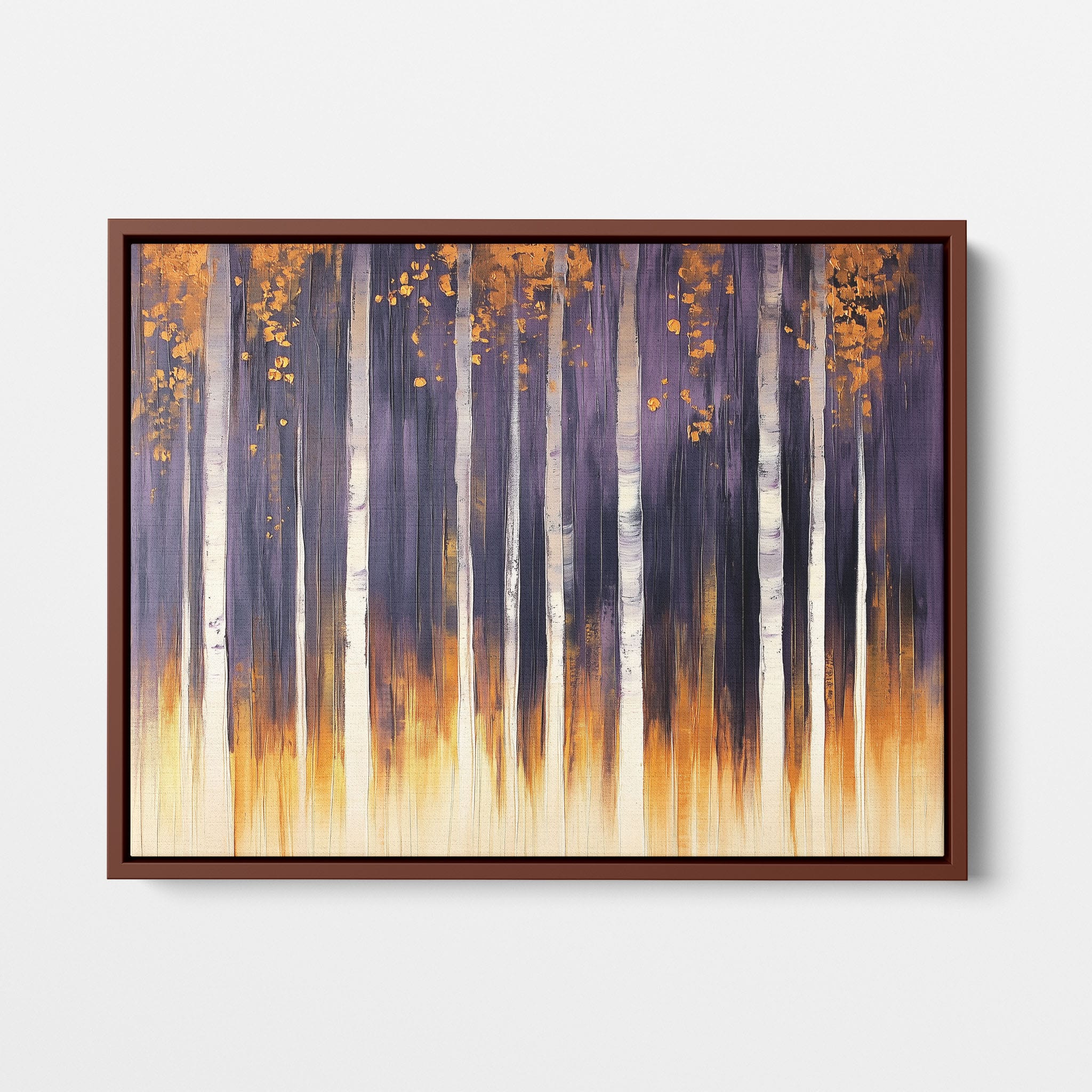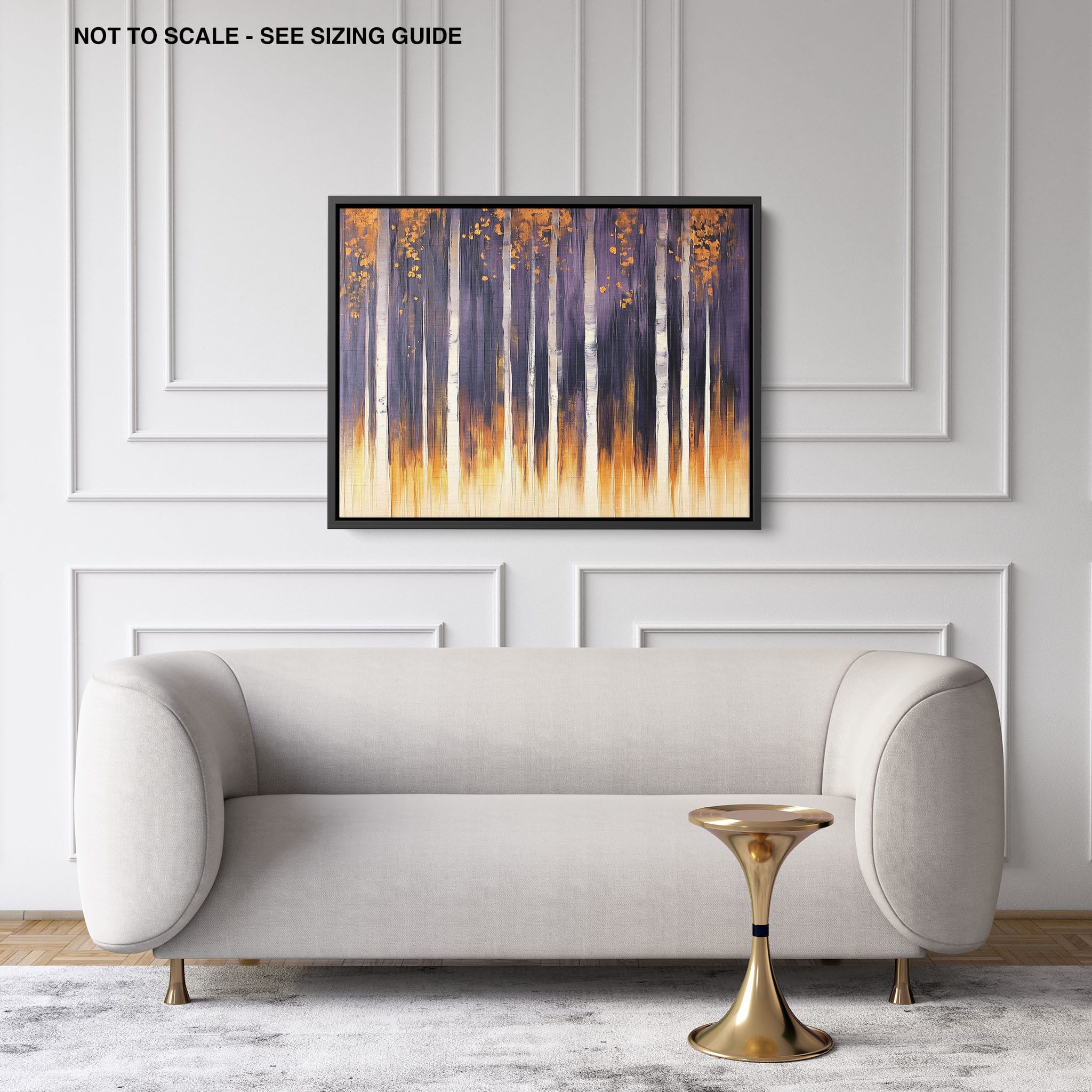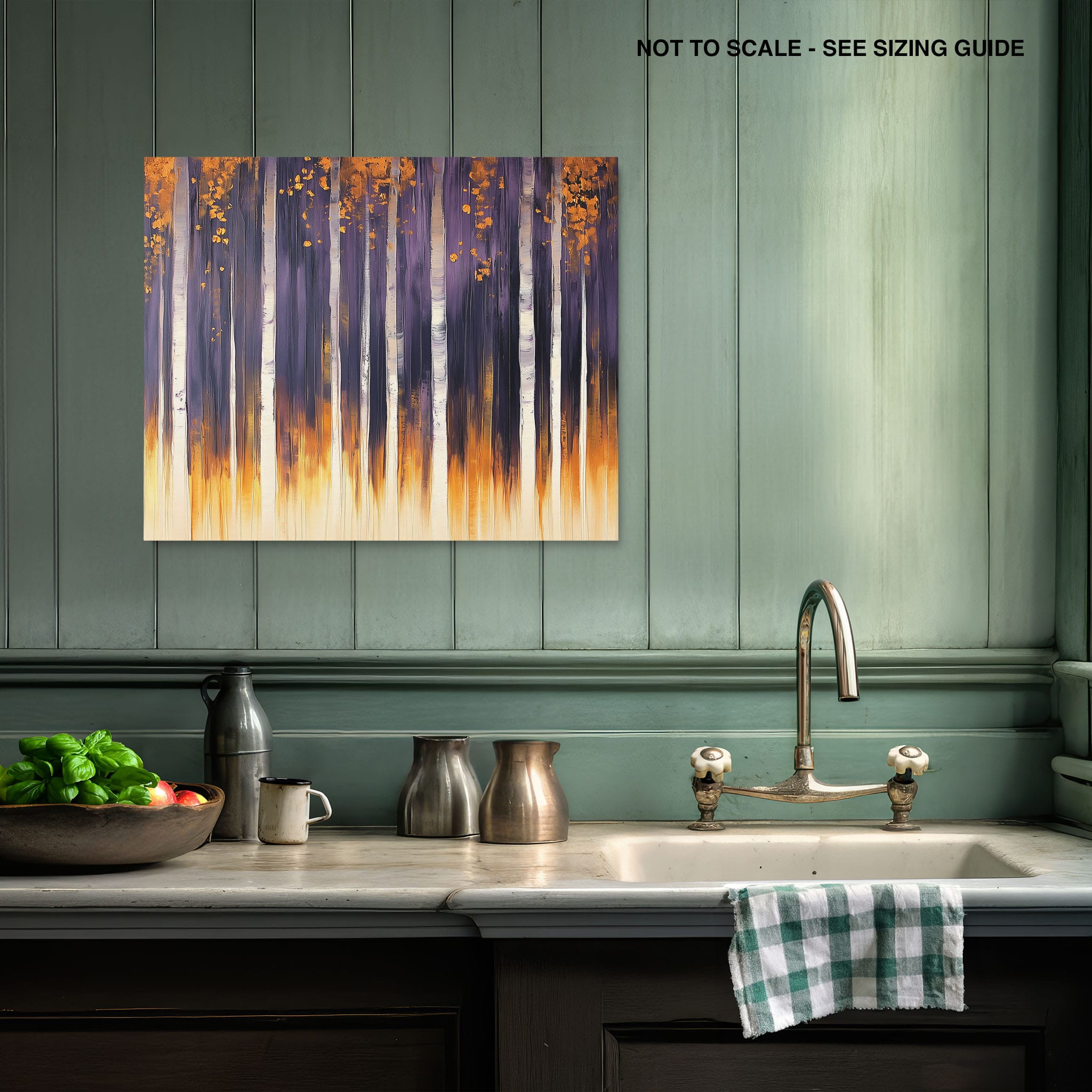 This painting captures an ethereal forest scene, illuminated by the fiery tones of autumn. Rich purples blend into vibrant oranges and golds, creating a visual spectacle that feels both serene and lively. This abstract expressionist work uses bold strokes and a modern approach to encapsulate the essence of fall, making it an eye-catching statement piece for any room. Ideal for those who appreciate nature's transient beauty and the artistry that can capture such fleeting moments. Add a touch of warmth and color to your living space with this compelling piece.