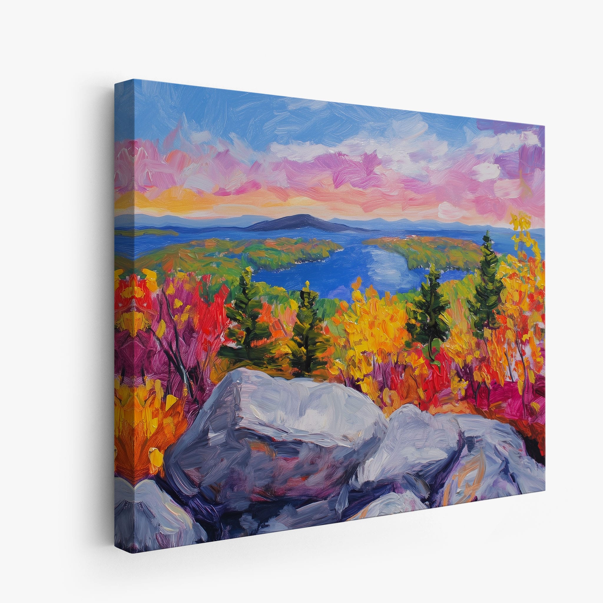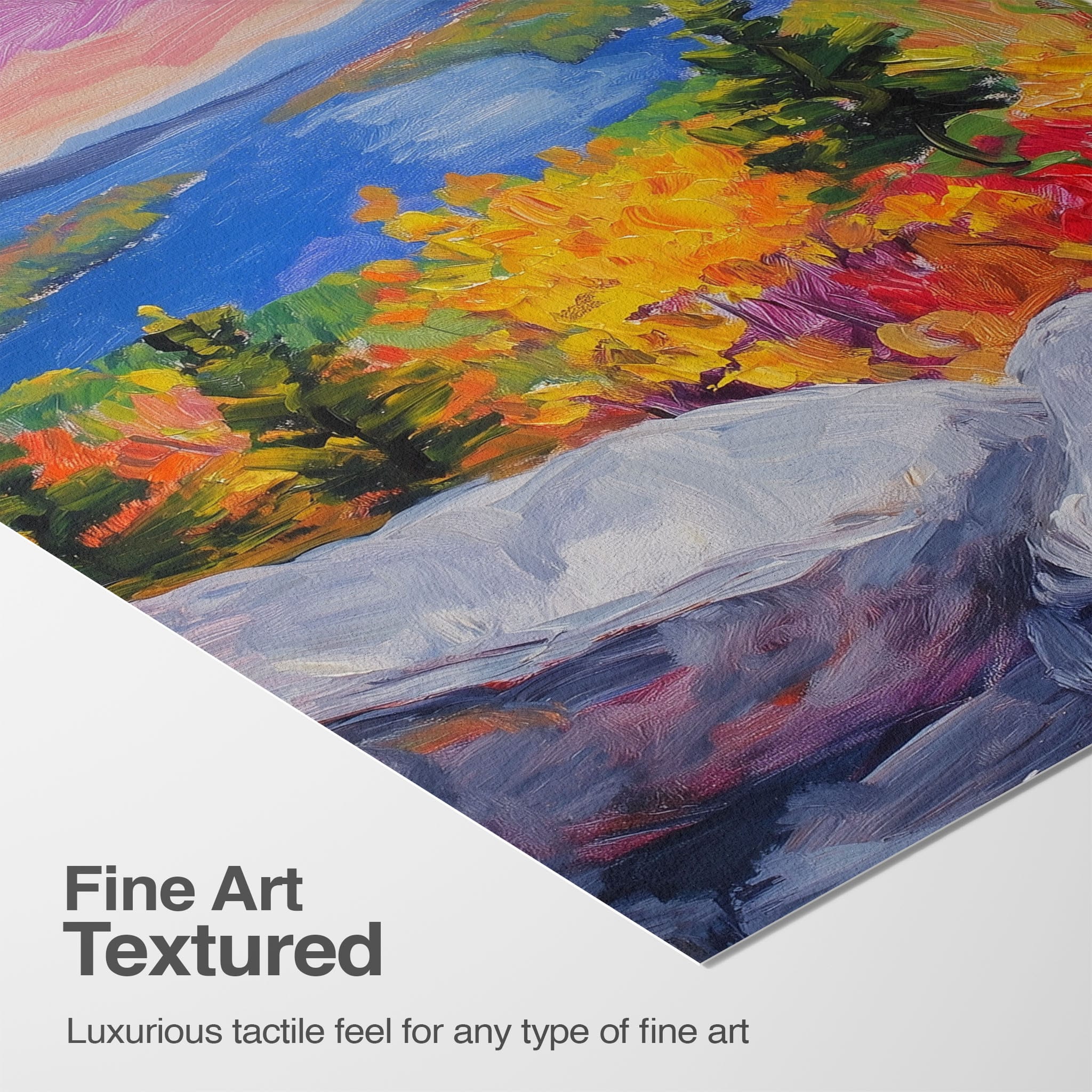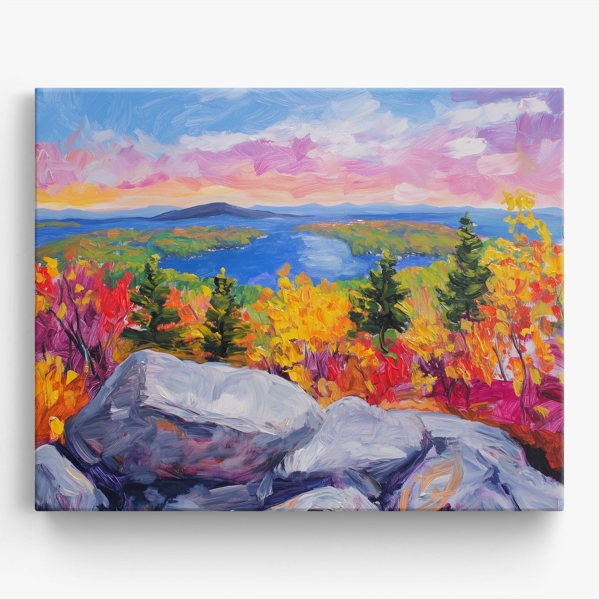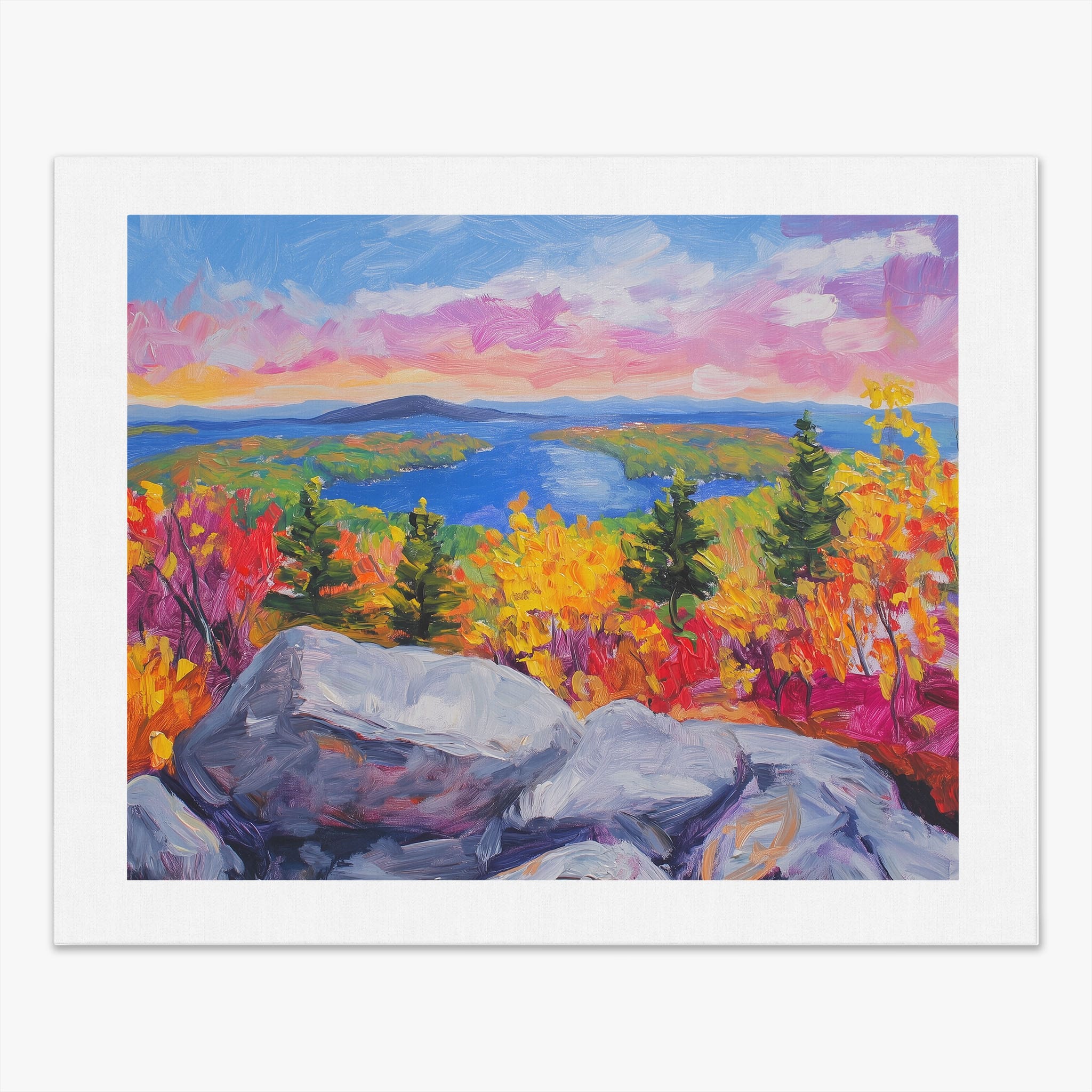 This vibrant oil painting captures a stirring landscape scene, brushing bold and dynamic colors across a forest’s autumn transformation. With expressive brushstrokes that evoke the energetic textures of nature, this work exudes the essence of Impressionism and Expressionism. The scene is set against a serene lake and a vast, captivating sky, contrasting the fiery foliage with calming blues. Perfect for any modern art lover looking to add a splash of color and emotion to their space, this piece sure resonates with those who appreciate the wild, untamed beauty of nature.