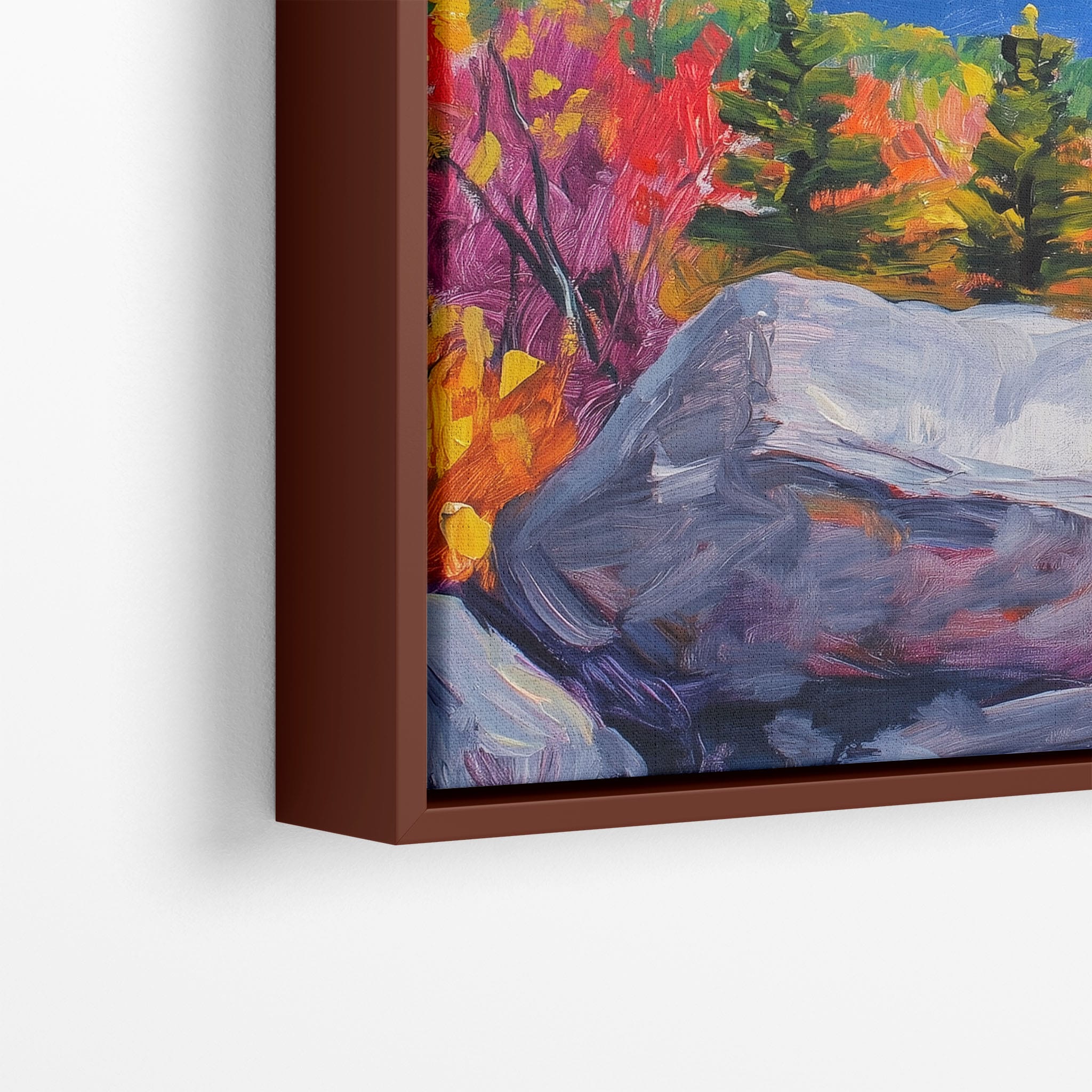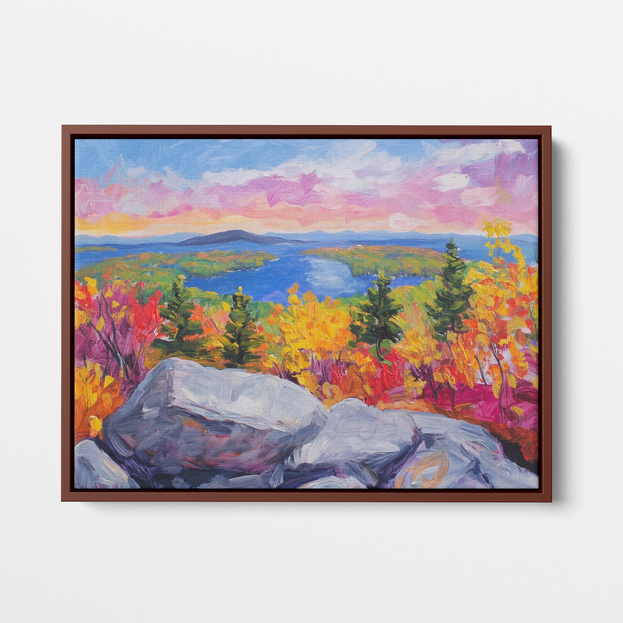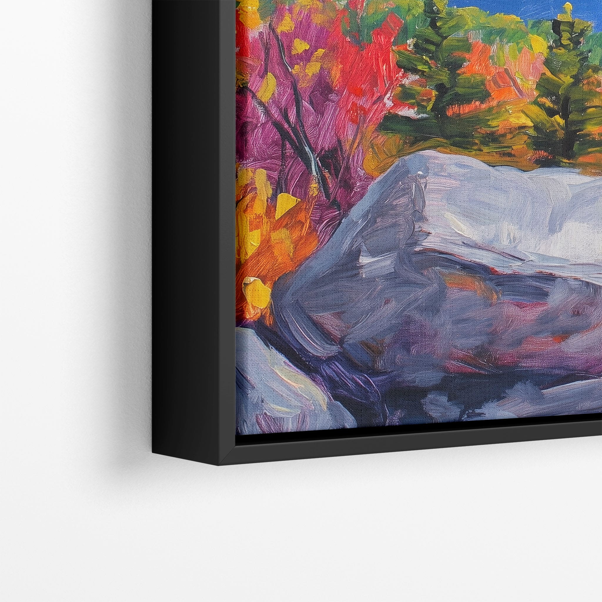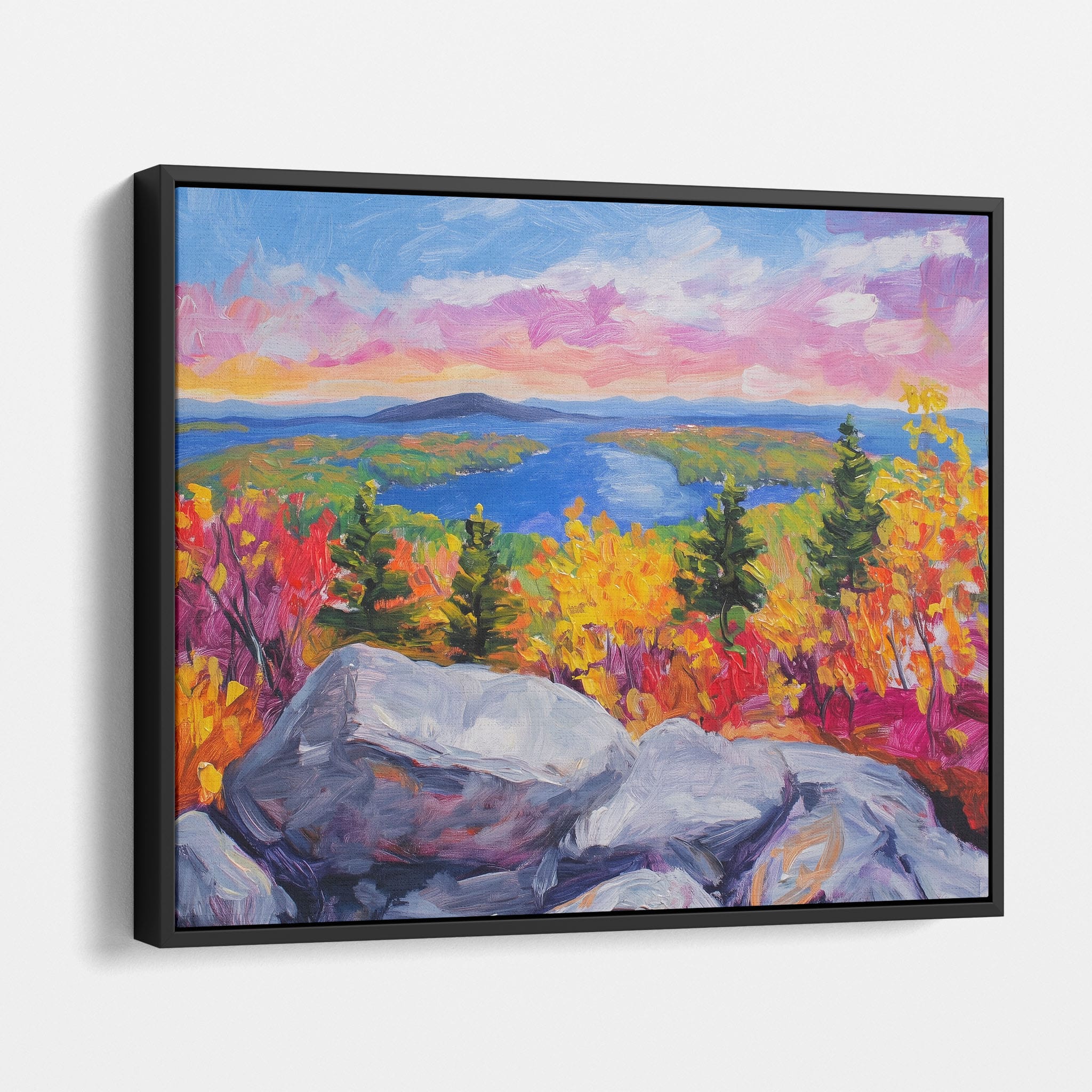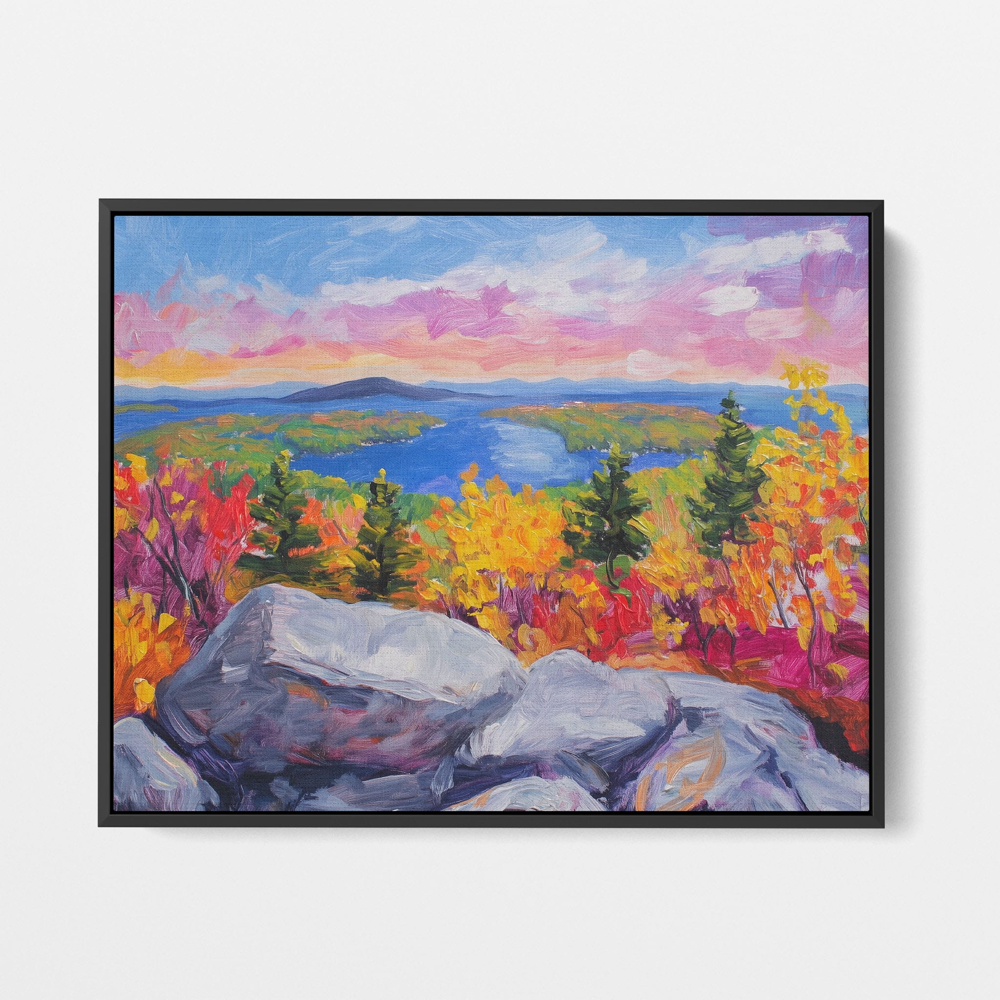 This vibrant oil painting captures a stirring landscape scene, brushing bold and dynamic colors across a forest’s autumn transformation. With expressive brushstrokes that evoke the energetic textures of nature, this work exudes the essence of Impressionism and Expressionism. The scene is set against a serene lake and a vast, captivating sky, contrasting the fiery foliage with calming blues. Perfect for any modern art lover looking to add a splash of color and emotion to their space, this piece sure resonates with those who appreciate the wild, untamed beauty of nature.
