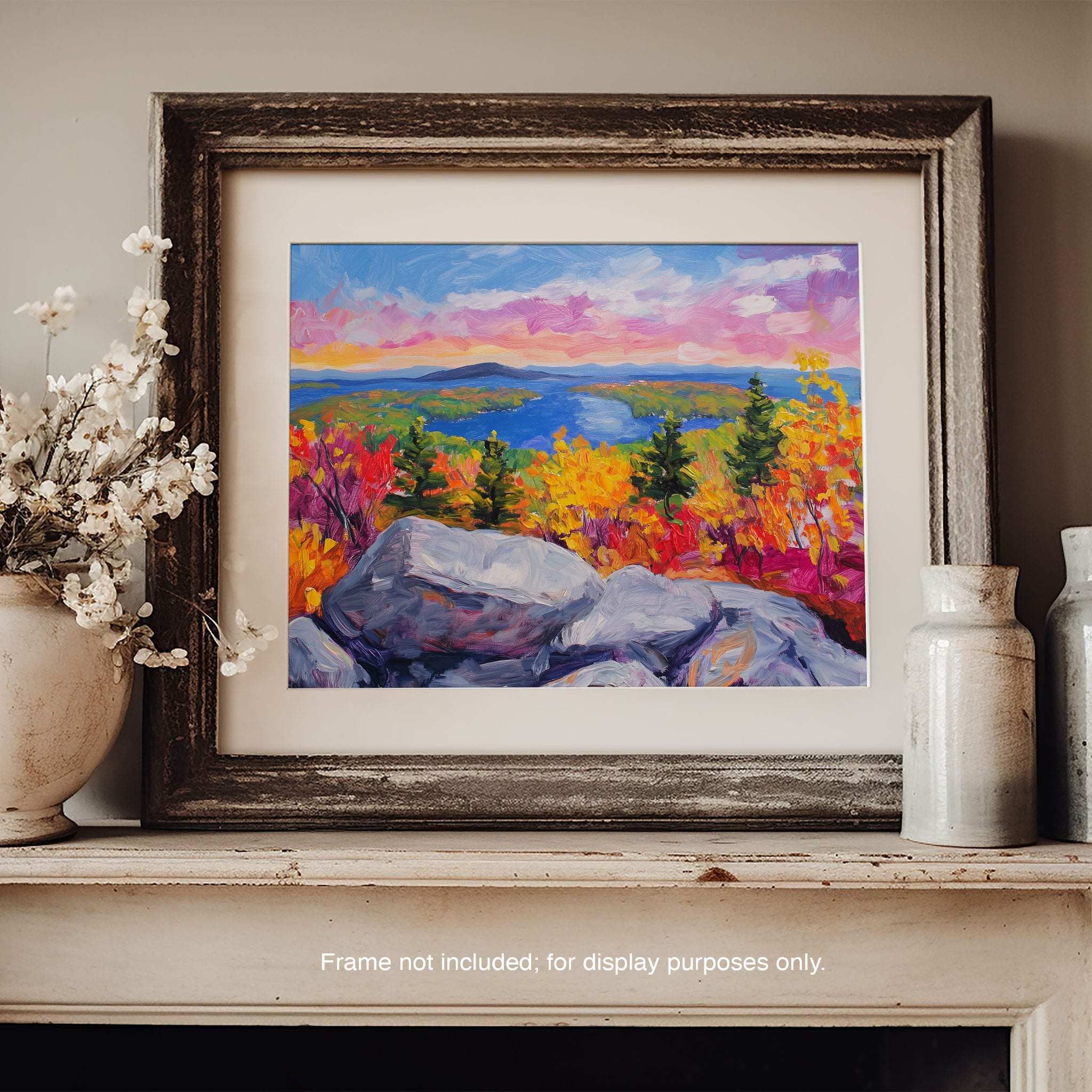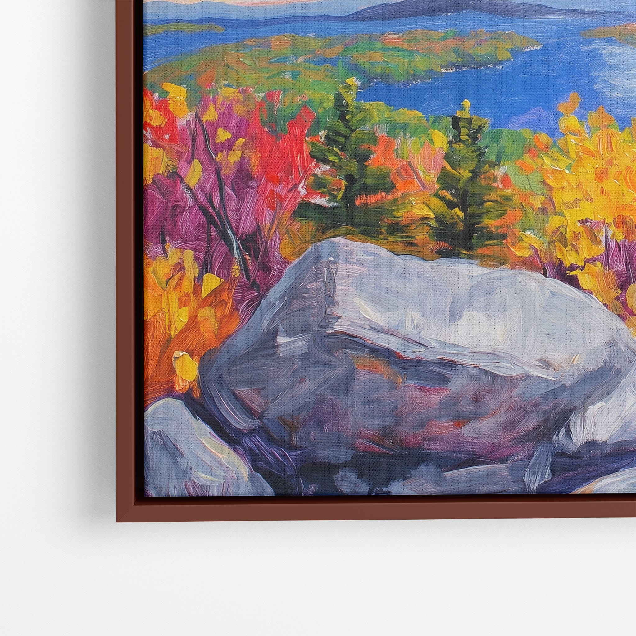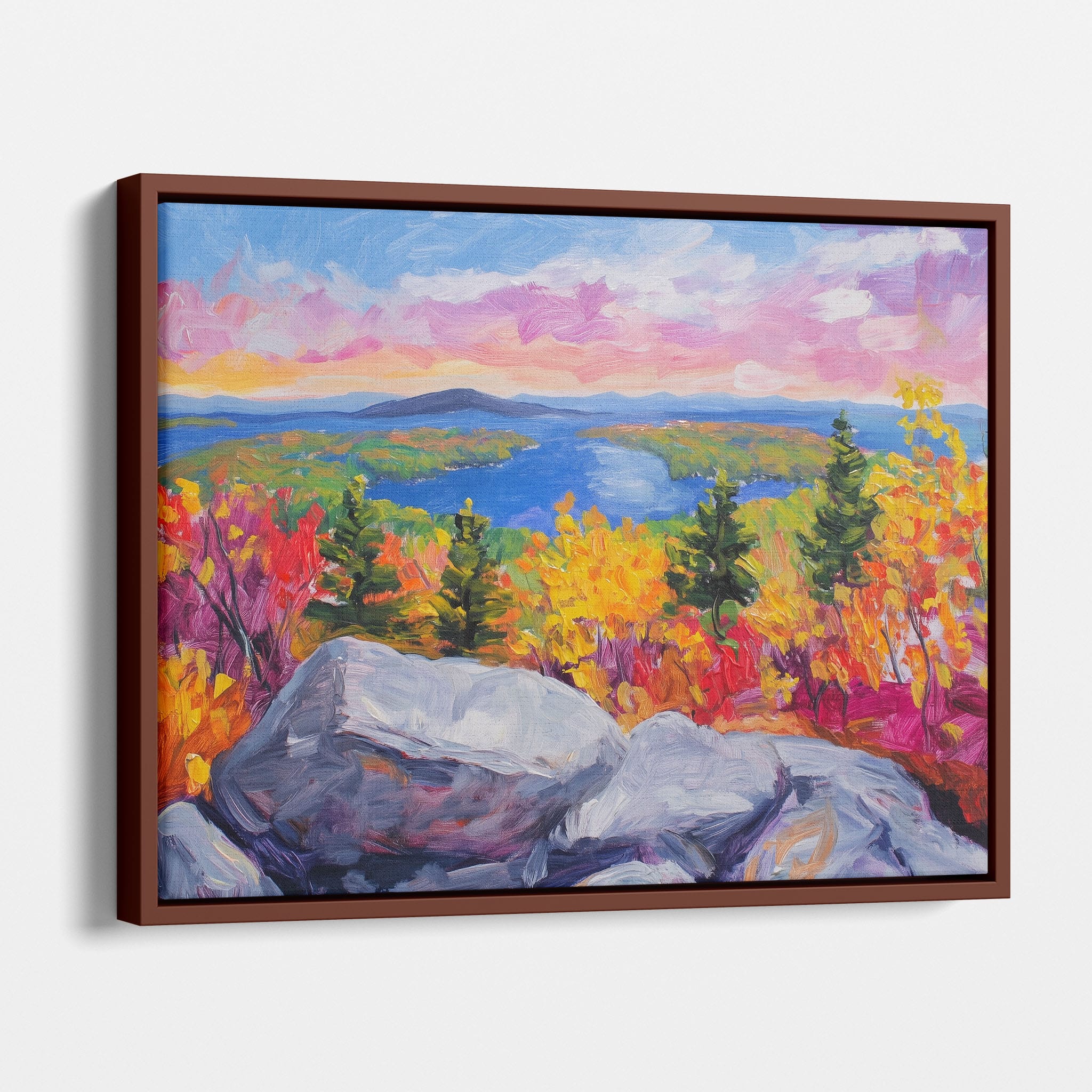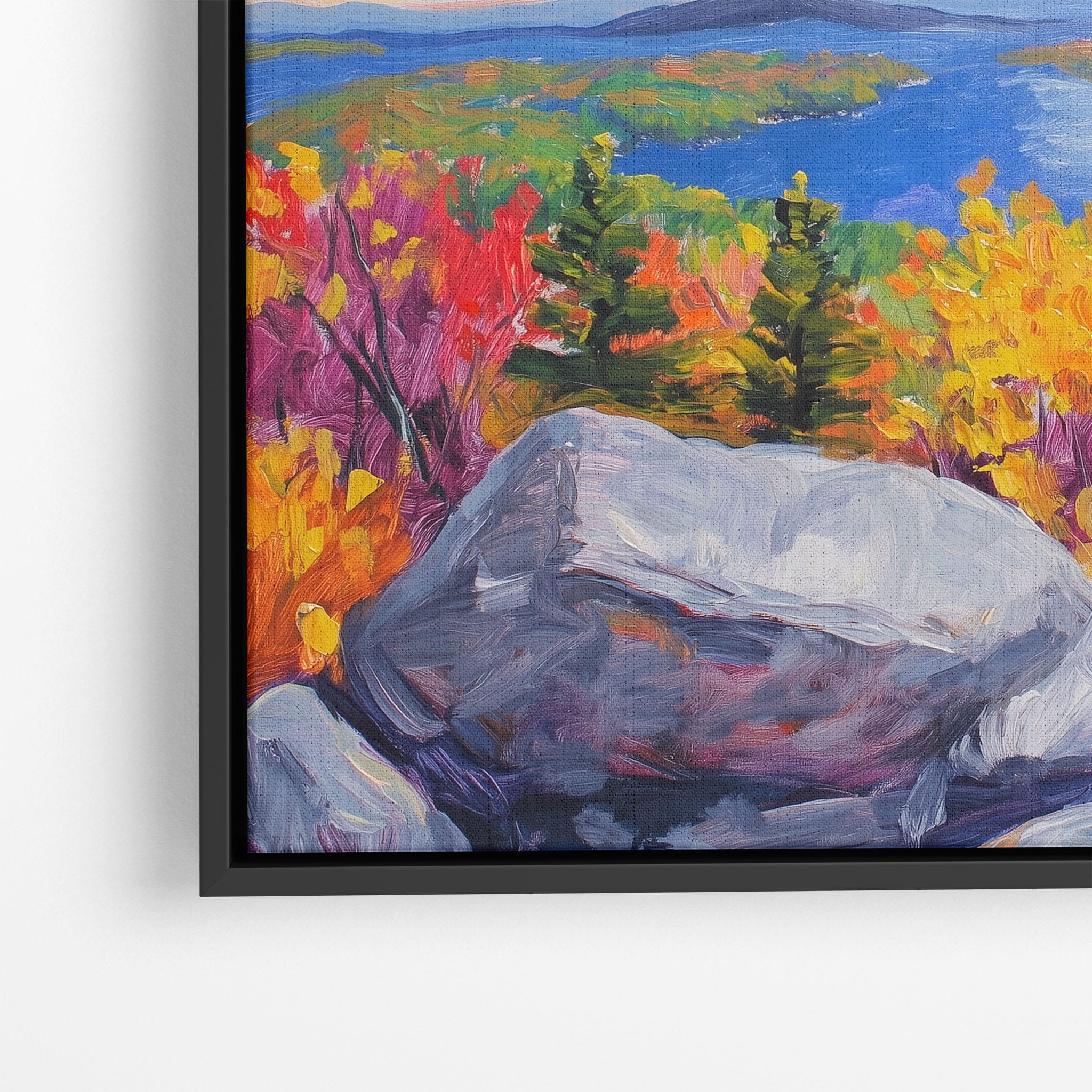 This vibrant oil painting captures a stirring landscape scene, brushing bold and dynamic colors across a forest’s autumn transformation. With expressive brushstrokes that evoke the energetic textures of nature, this work exudes the essence of Impressionism and Expressionism. The scene is set against a serene lake and a vast, captivating sky, contrasting the fiery foliage with calming blues. Perfect for any modern art lover looking to add a splash of color and emotion to their space, this piece sure resonates with those who appreciate the wild, untamed beauty of nature.