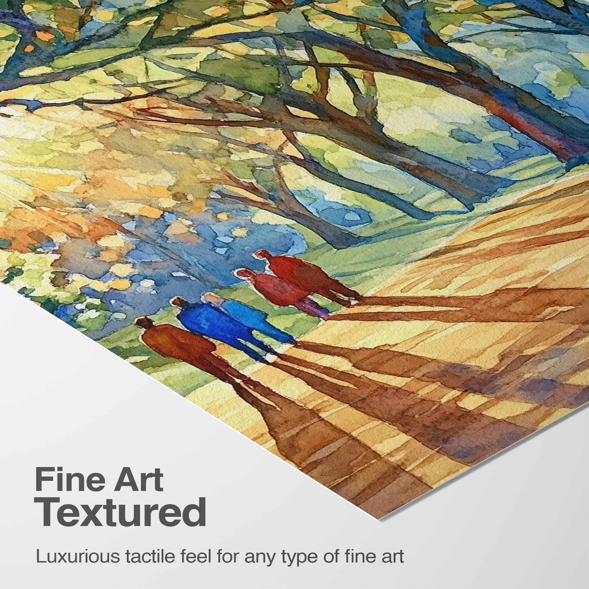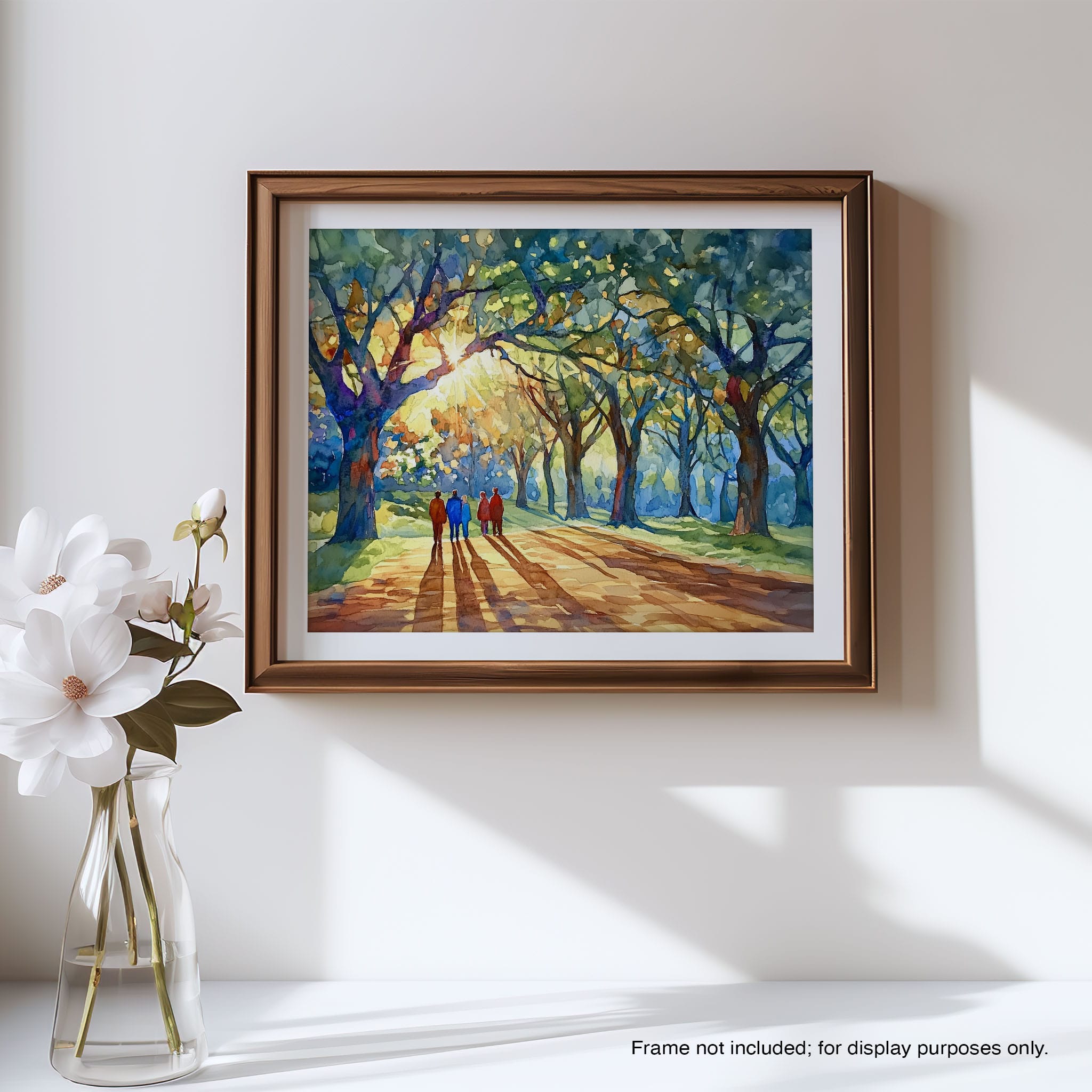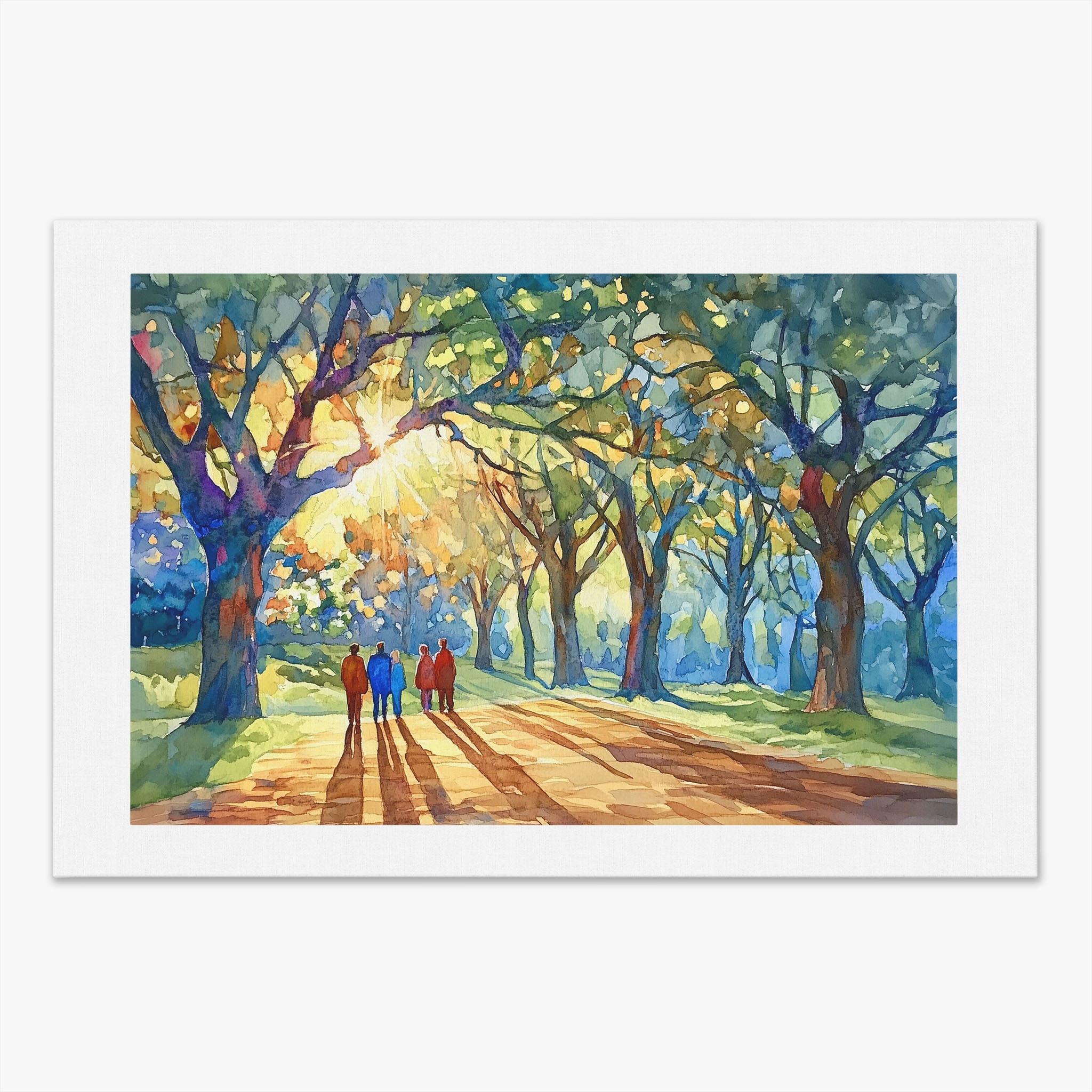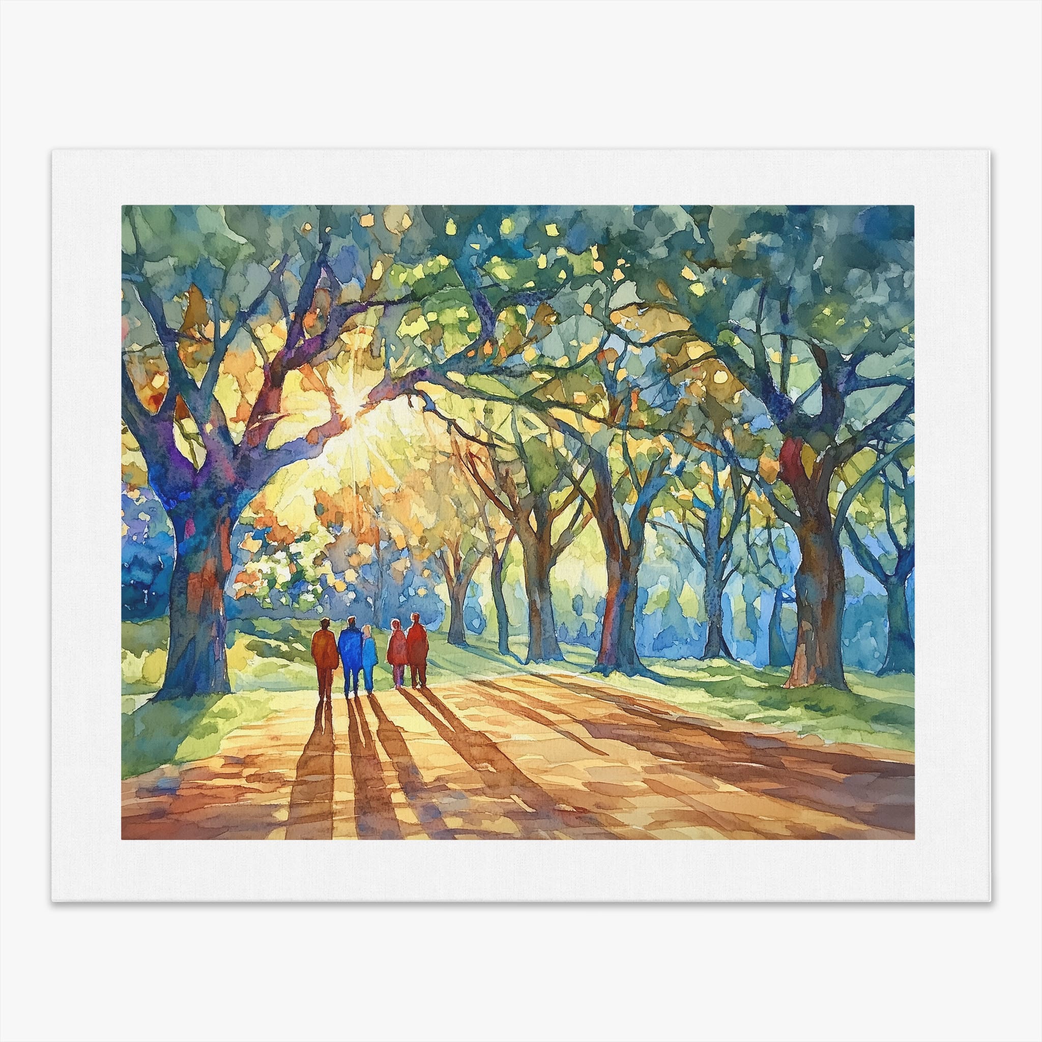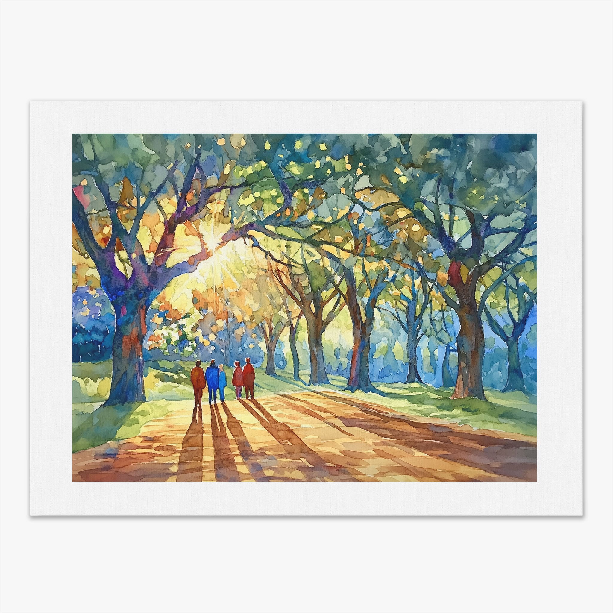 This enchanting digital watercolor painting captures a serene moment as three figures amble through a vivid autumnal landscape, their long shadows stretching across a sunlit park path. Its impressionistic style brings each brushstroke to life, showcasing a beautiful interplay of light and color. The whimsical portrayal of the fleeting nature of an autumn day offers a visual retreat for nature lovers and art aficionados alike. Perfect for adding a splash of vibrant colors and serene vibes to any space, this artwork is a must-have for those looking to brighten their surroundings with a piece of seasonal poetry.