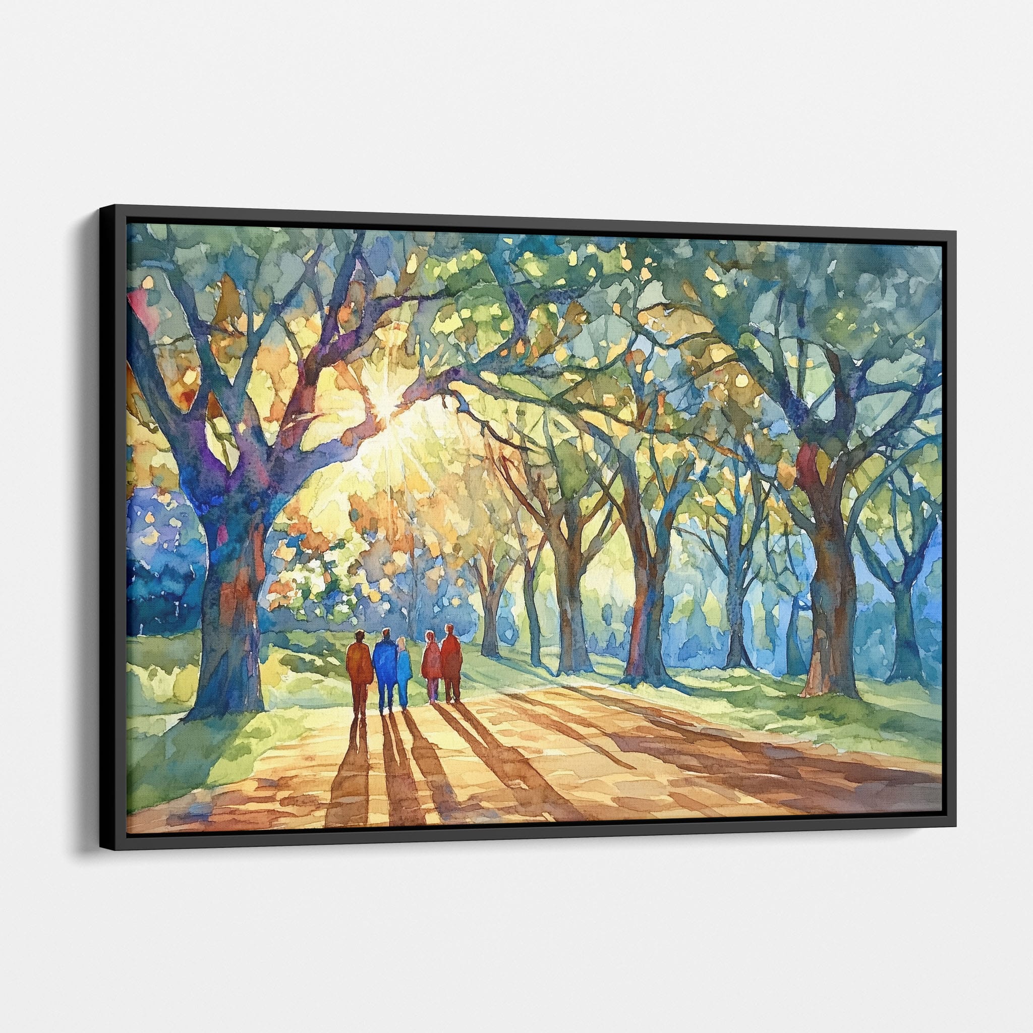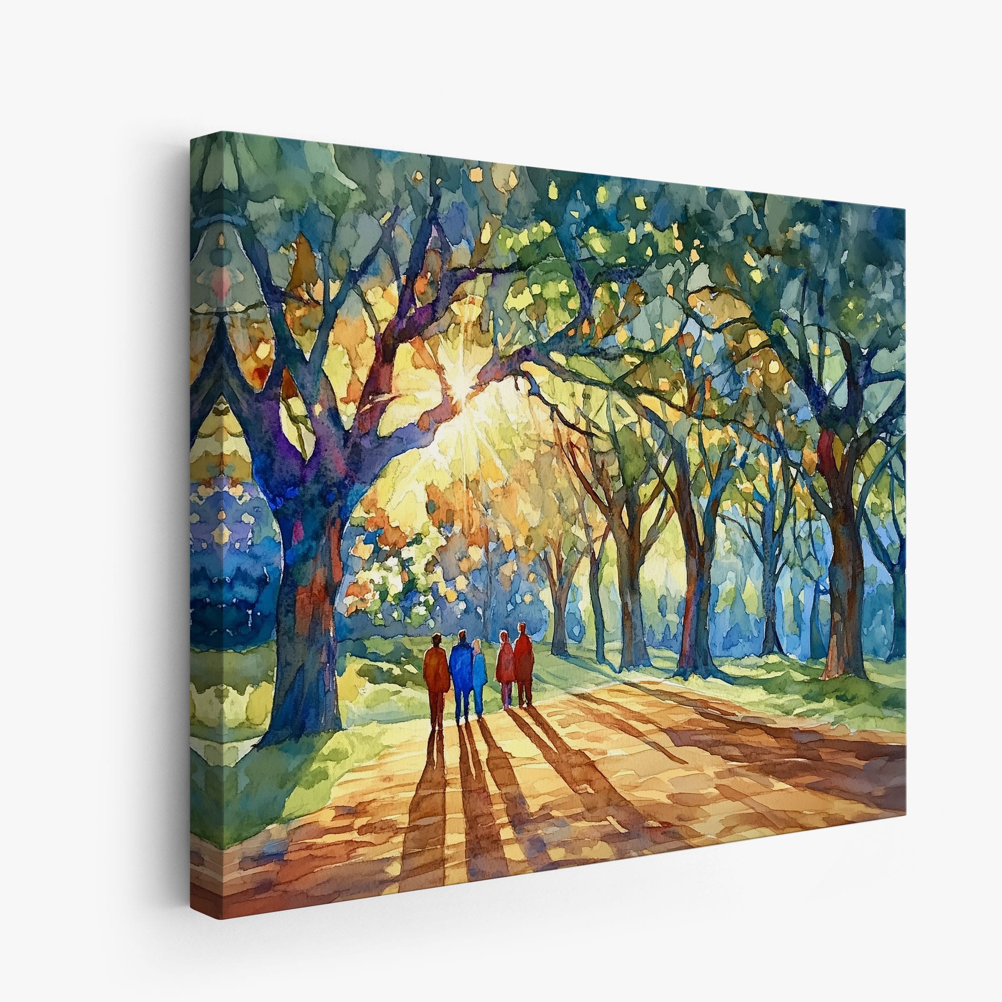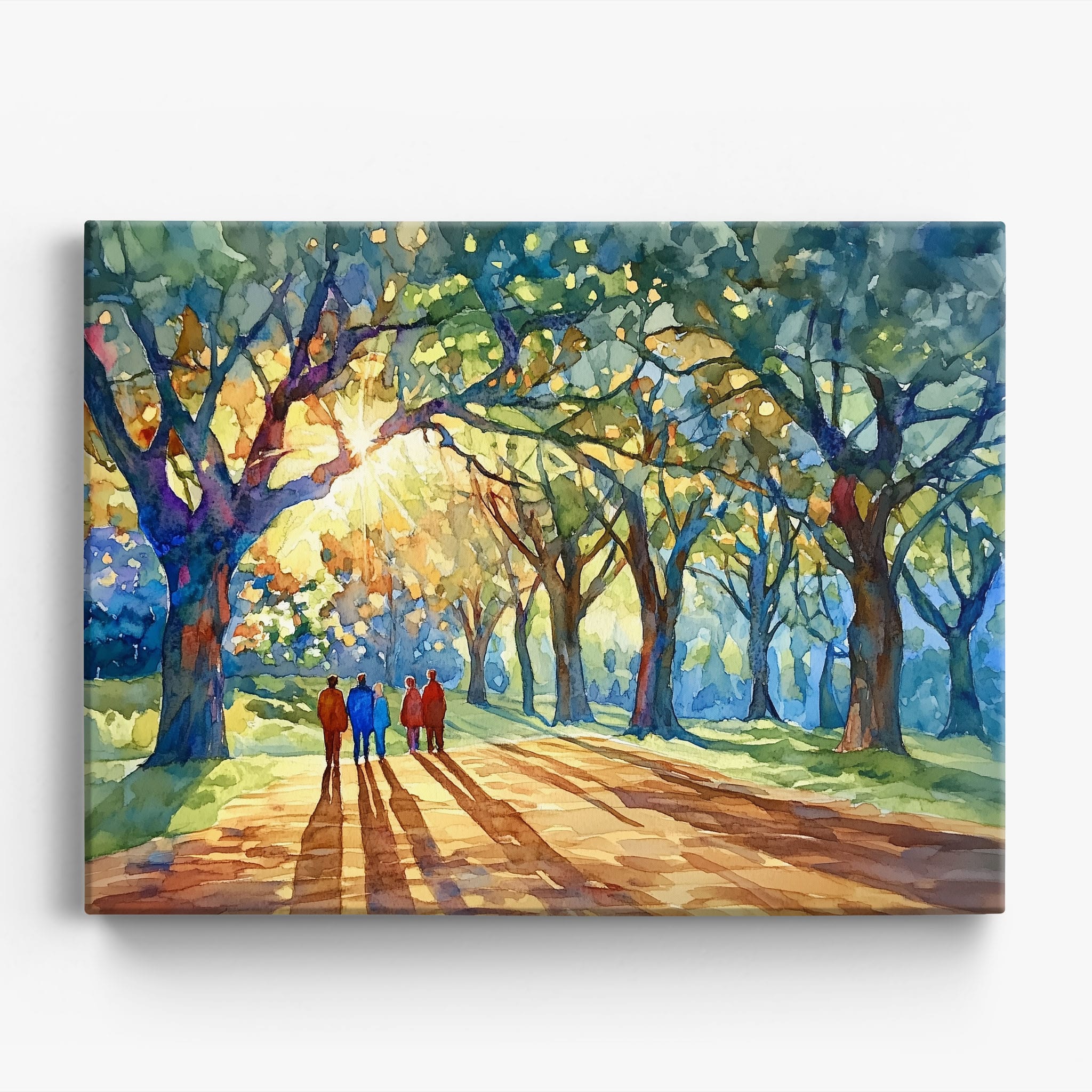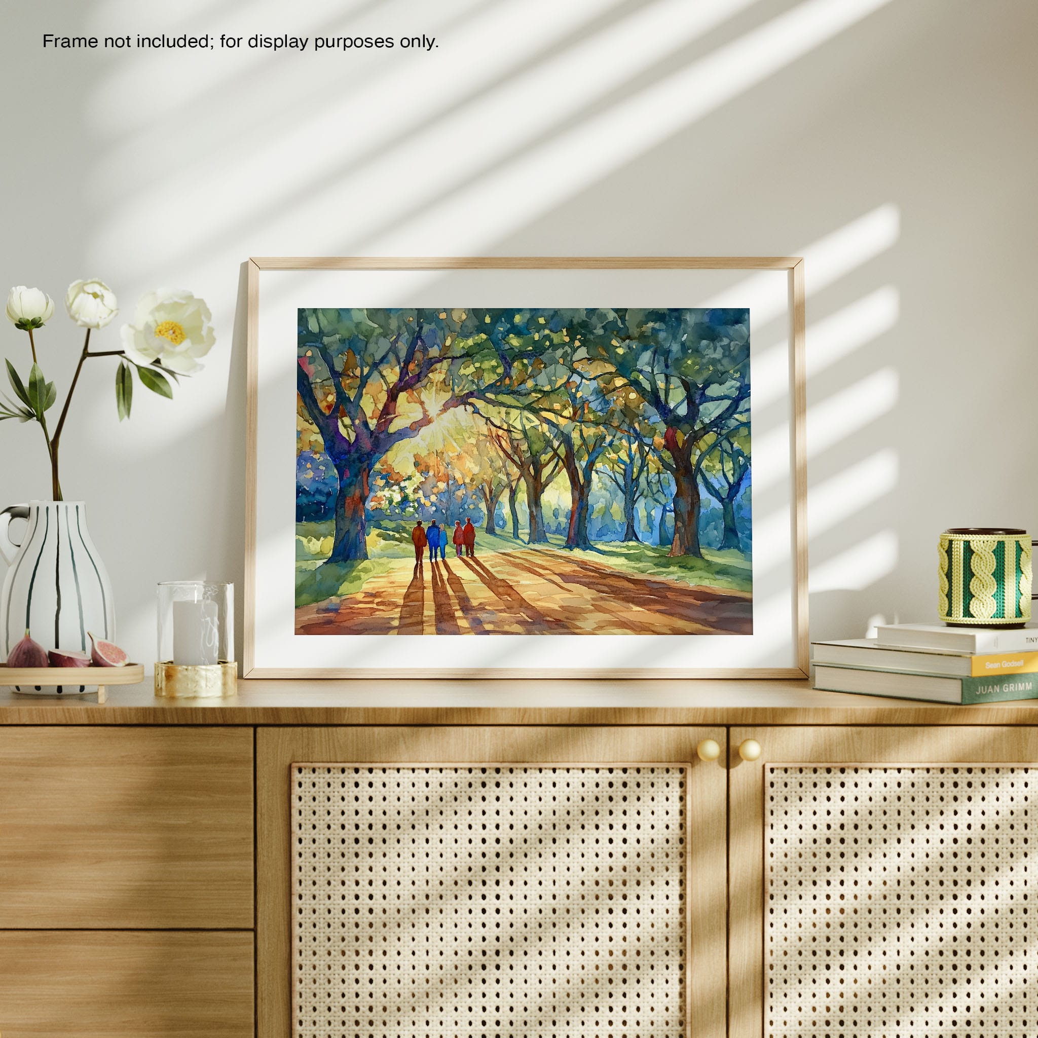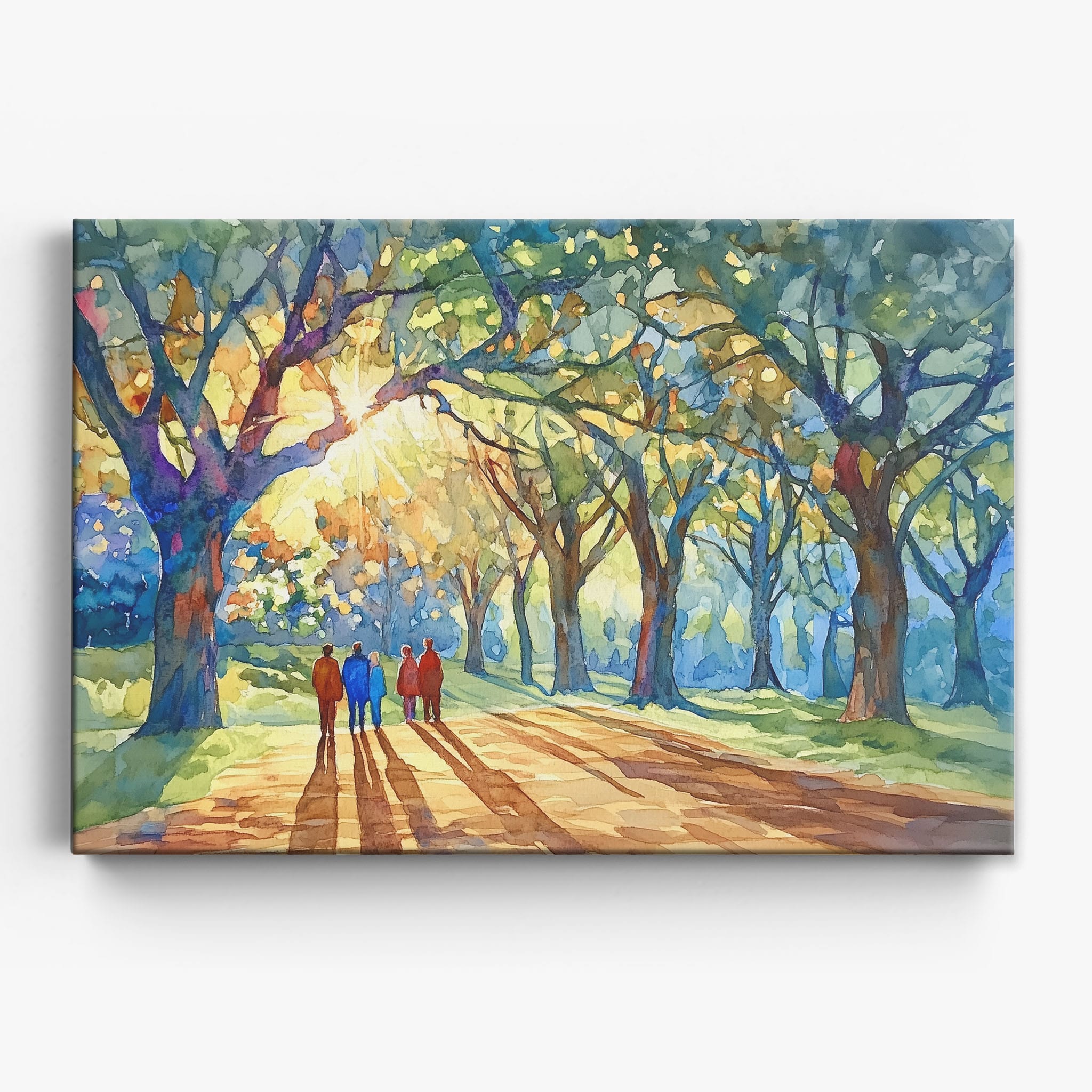 This enchanting digital watercolor painting captures a serene moment as three figures amble through a vivid autumnal landscape, their long shadows stretching across a sunlit park path. Its impressionistic style brings each brushstroke to life, showcasing a beautiful interplay of light and color. The whimsical portrayal of the fleeting nature of an autumn day offers a visual retreat for nature lovers and art aficionados alike. Perfect for adding a splash of vibrant colors and serene vibes to any space, this artwork is a must-have for those looking to brighten their surroundings with a piece of seasonal poetry.