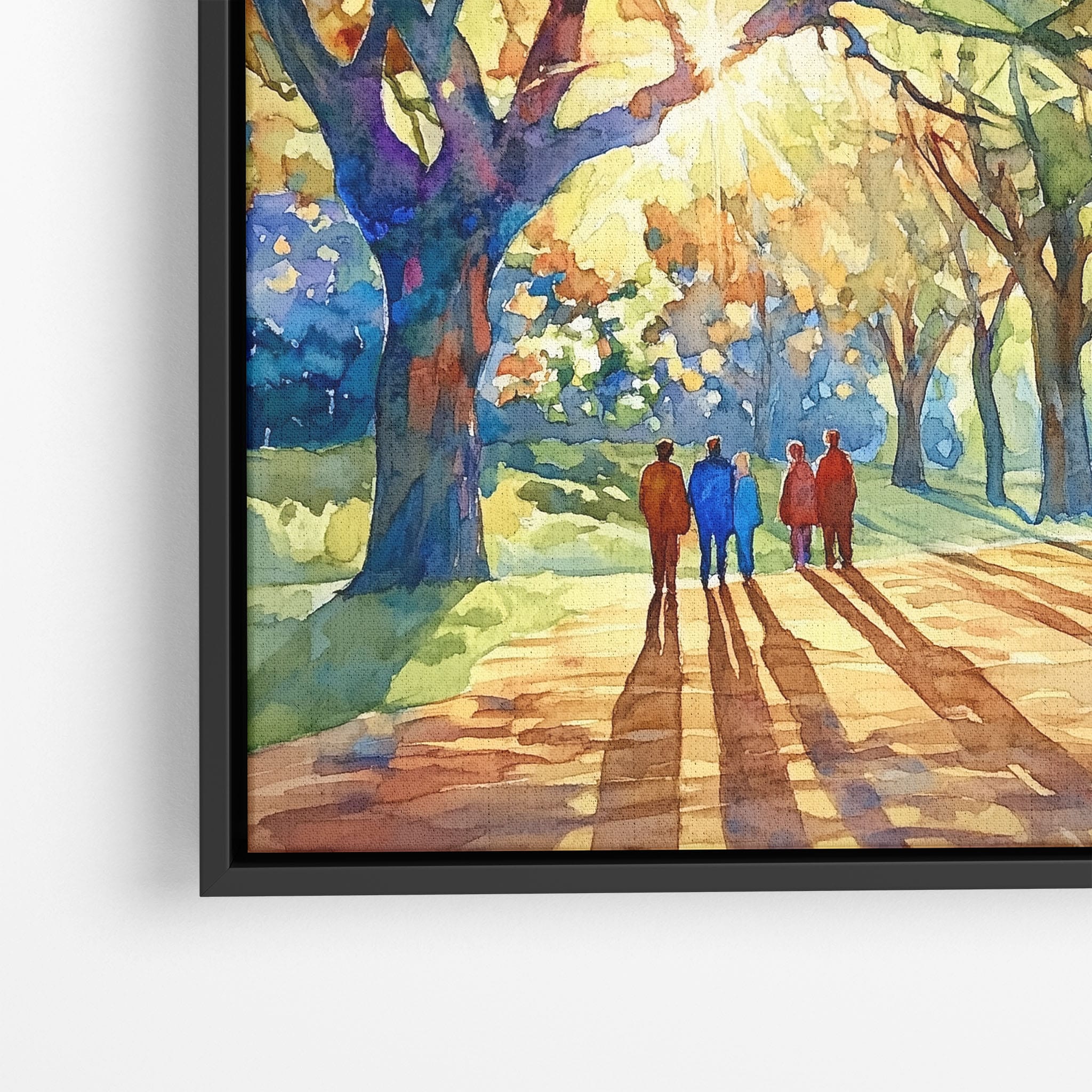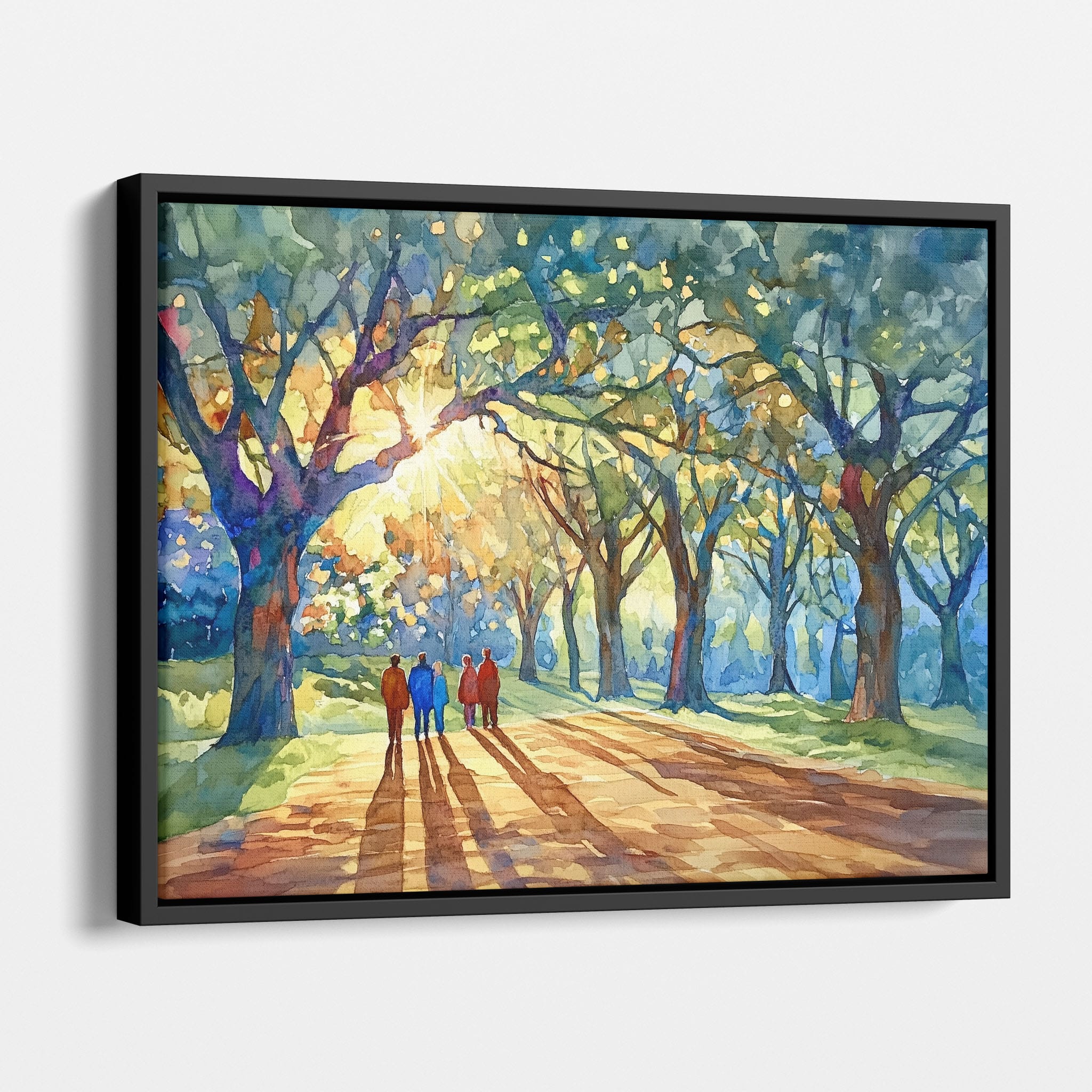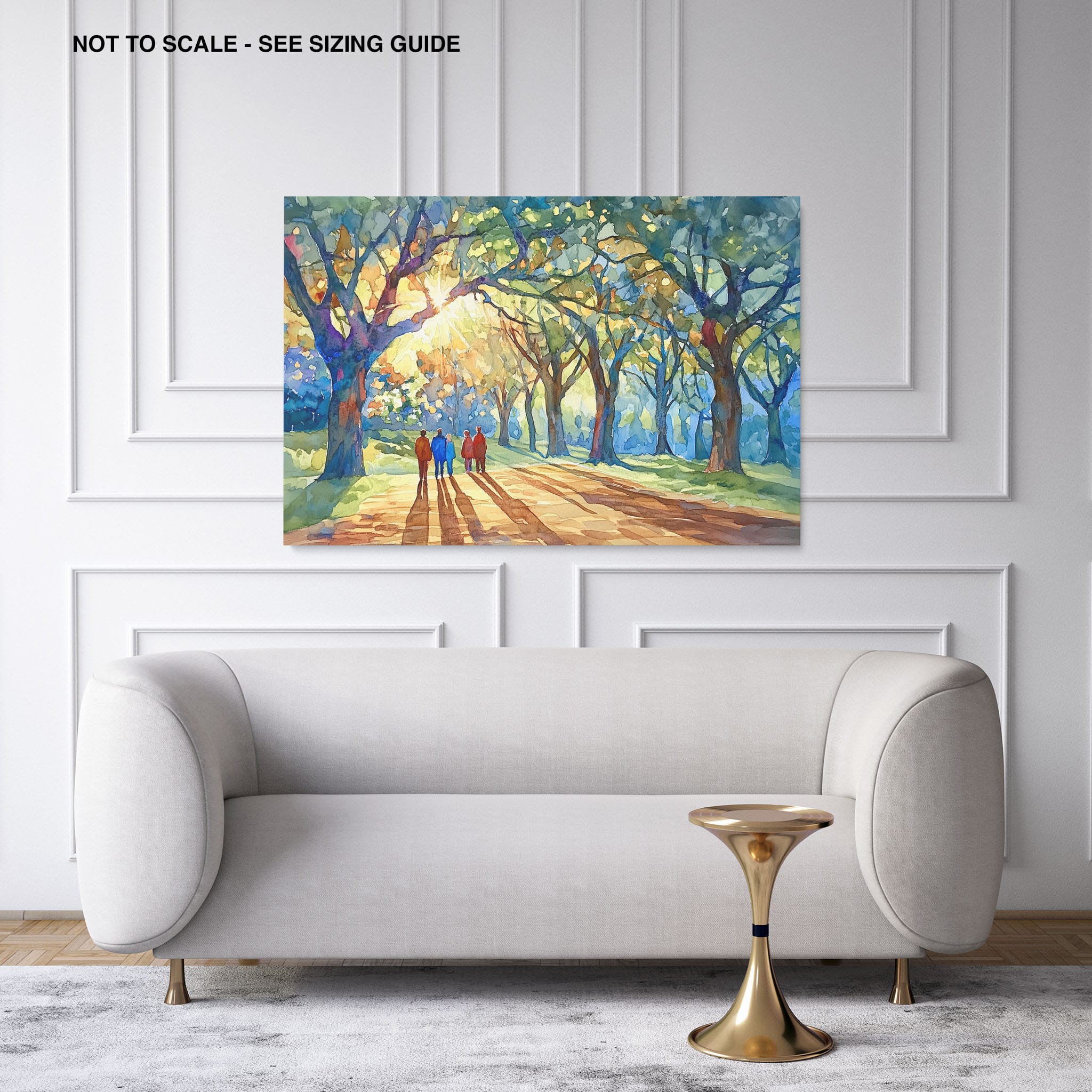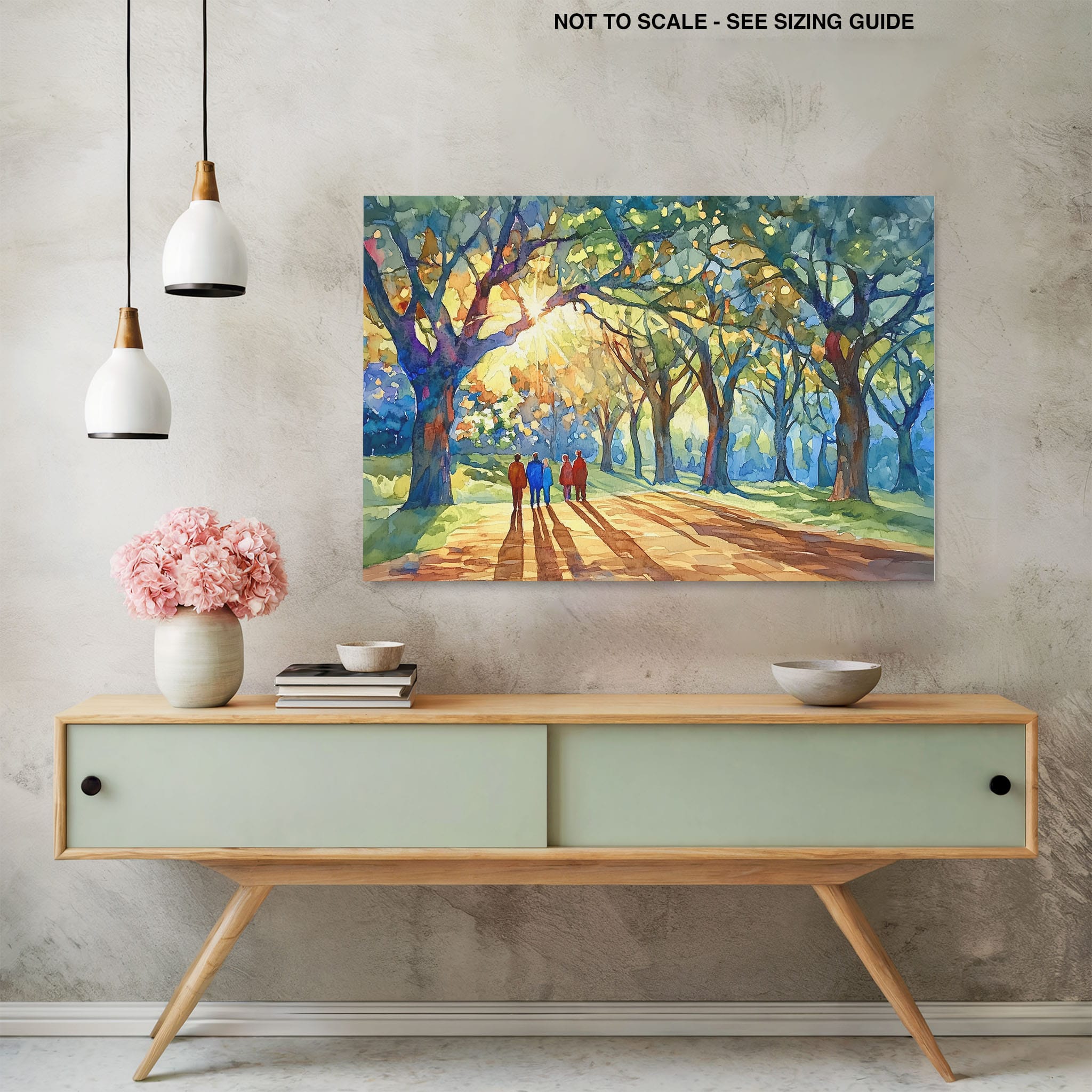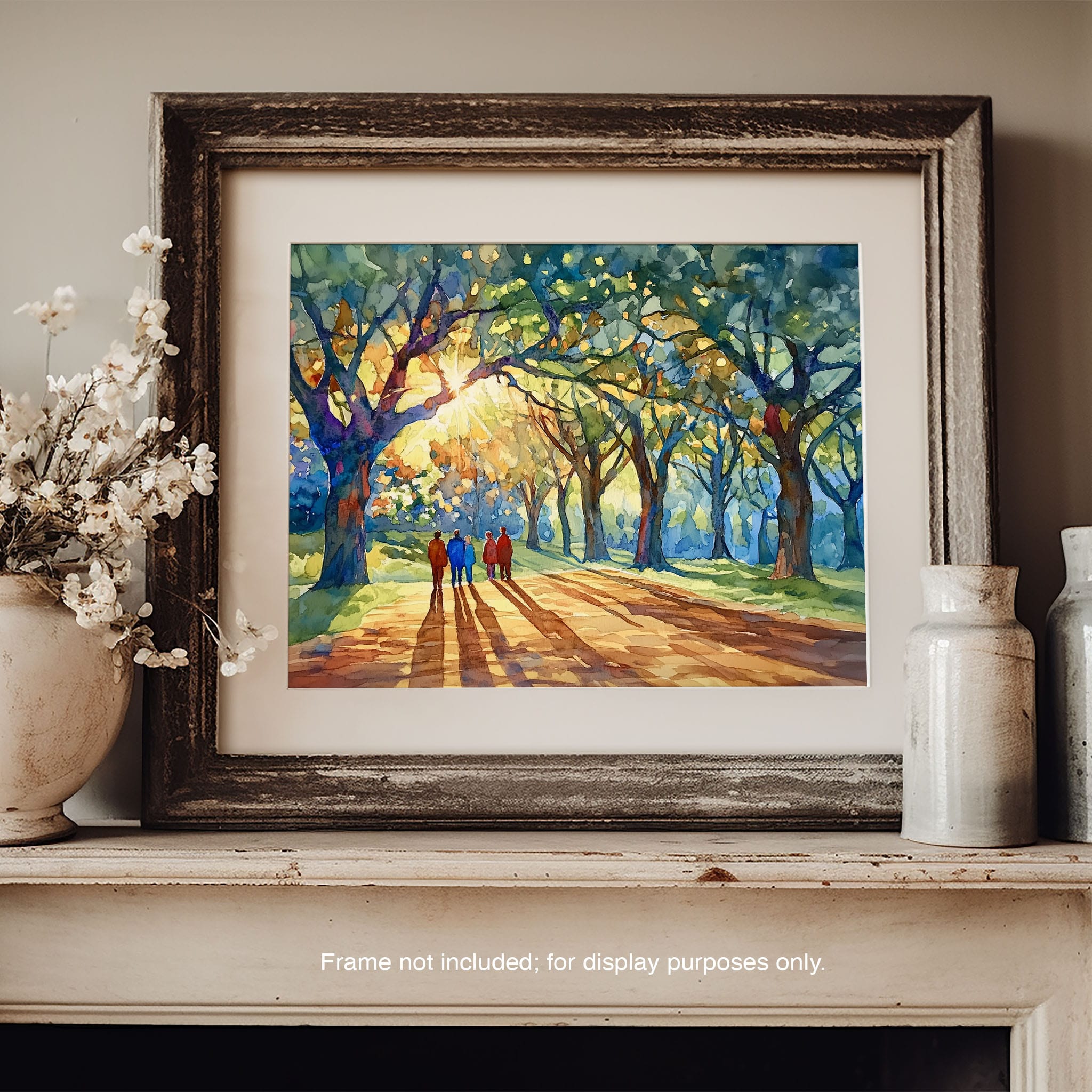 This enchanting digital watercolor painting captures a serene moment as three figures amble through a vivid autumnal landscape, their long shadows stretching across a sunlit park path. Its impressionistic style brings each brushstroke to life, showcasing a beautiful interplay of light and color. The whimsical portrayal of the fleeting nature of an autumn day offers a visual retreat for nature lovers and art aficionados alike. Perfect for adding a splash of vibrant colors and serene vibes to any space, this artwork is a must-have for those looking to brighten their surroundings with a piece of seasonal poetry.