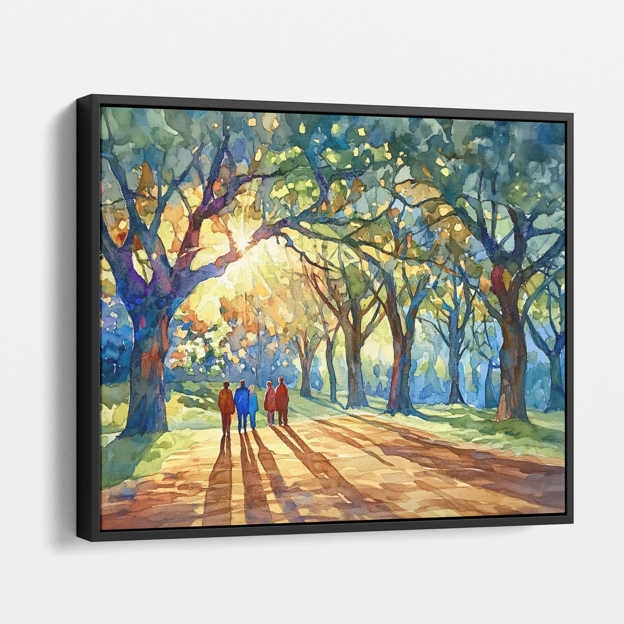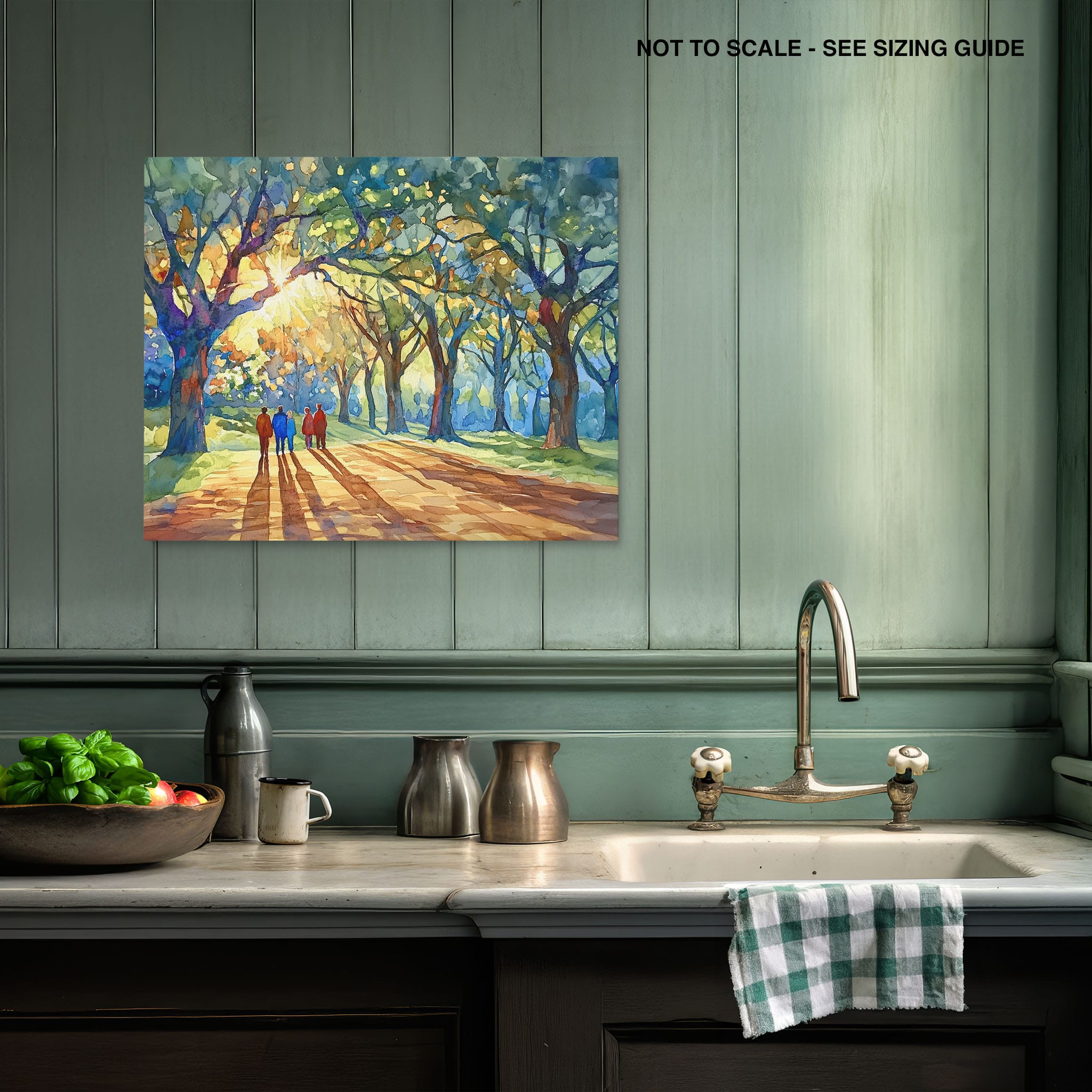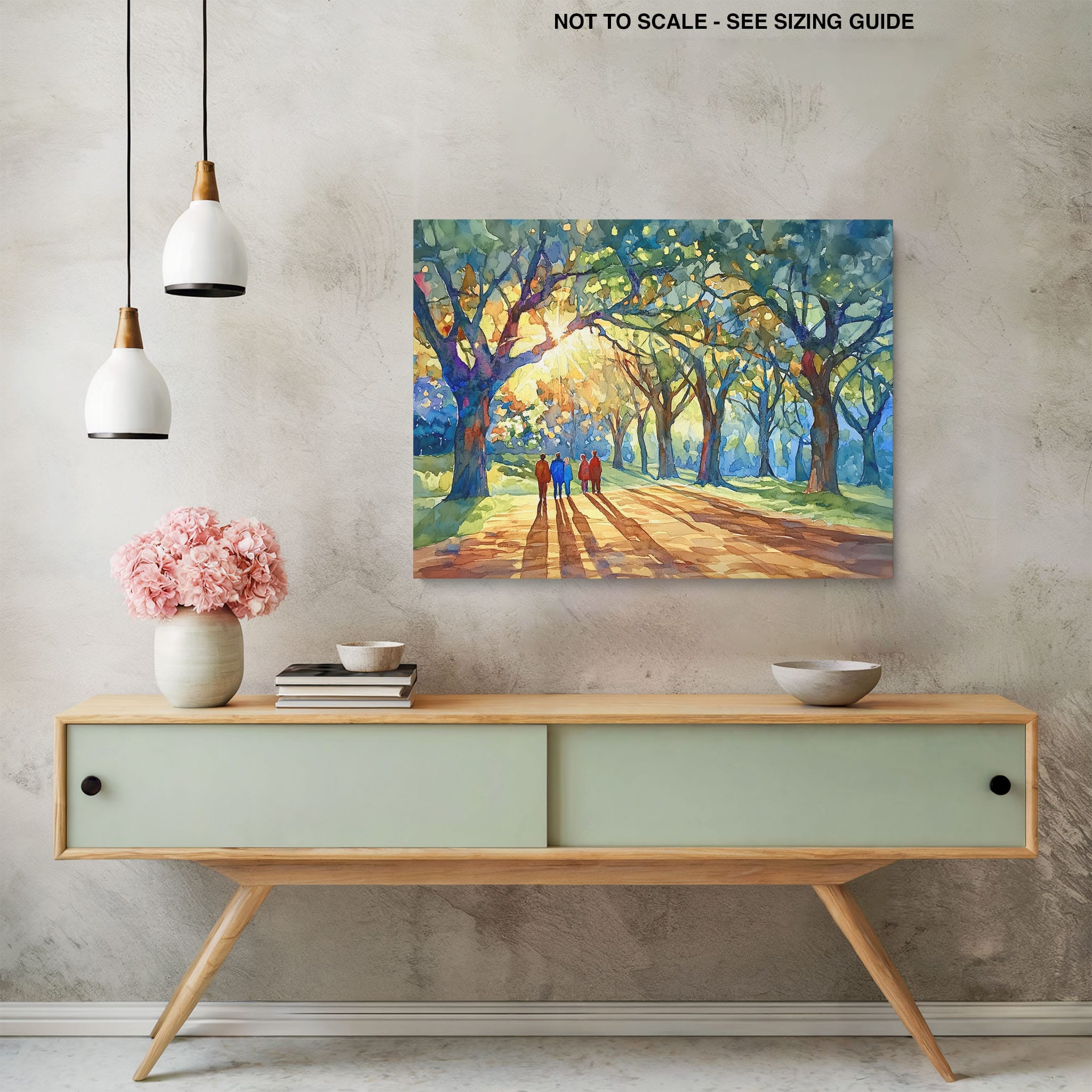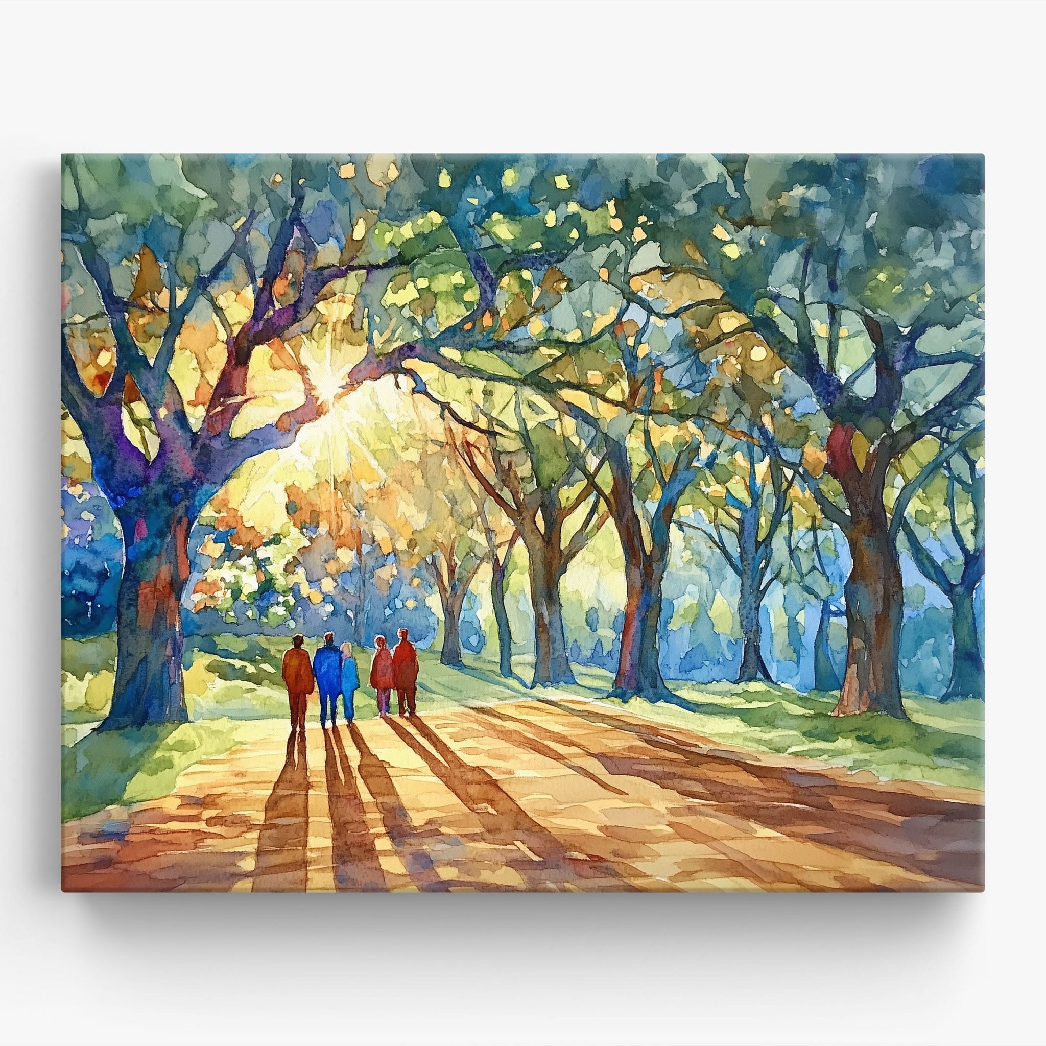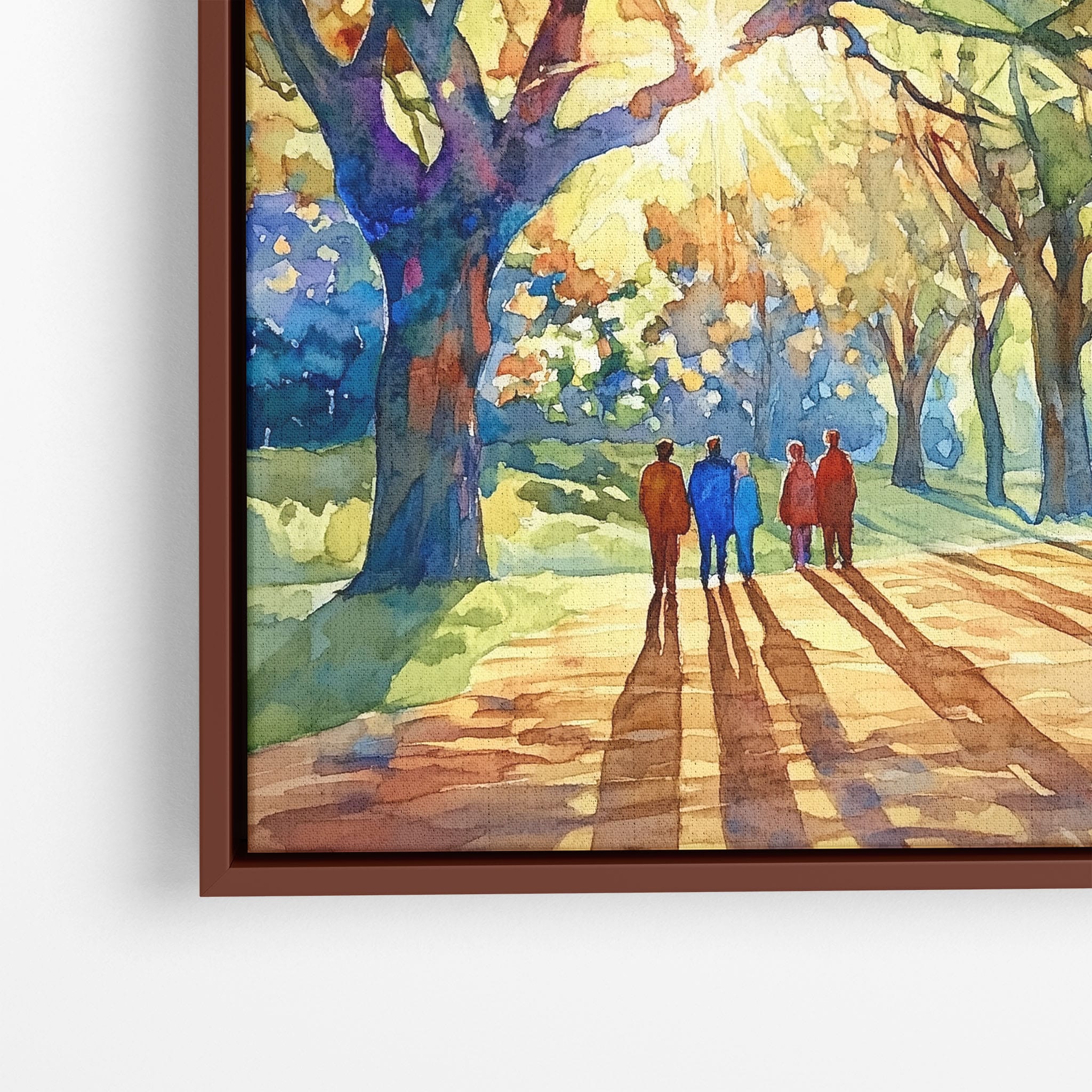 This enchanting digital watercolor painting captures a serene moment as three figures amble through a vivid autumnal landscape, their long shadows stretching across a sunlit park path. Its impressionistic style brings each brushstroke to life, showcasing a beautiful interplay of light and color. The whimsical portrayal of the fleeting nature of an autumn day offers a visual retreat for nature lovers and art aficionados alike. Perfect for adding a splash of vibrant colors and serene vibes to any space, this artwork is a must-have for those looking to brighten their surroundings with a piece of seasonal poetry.