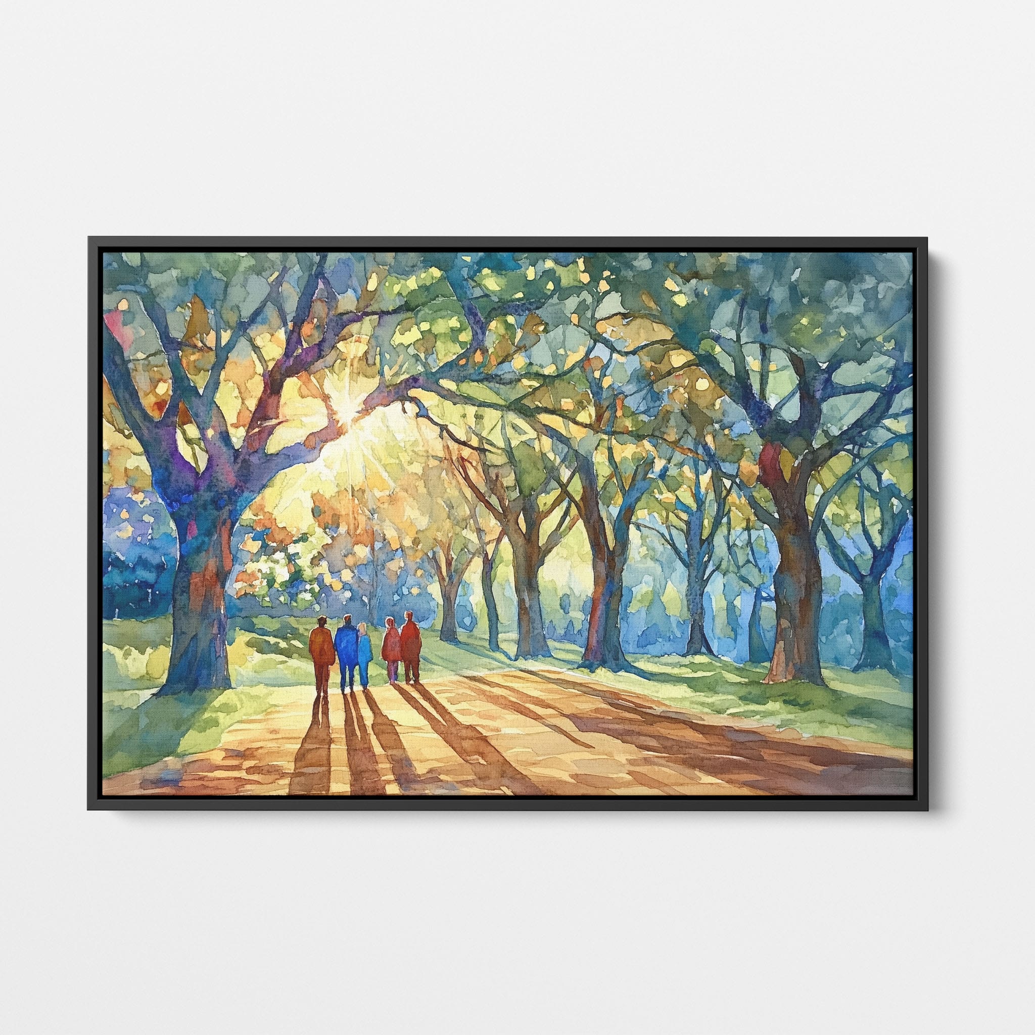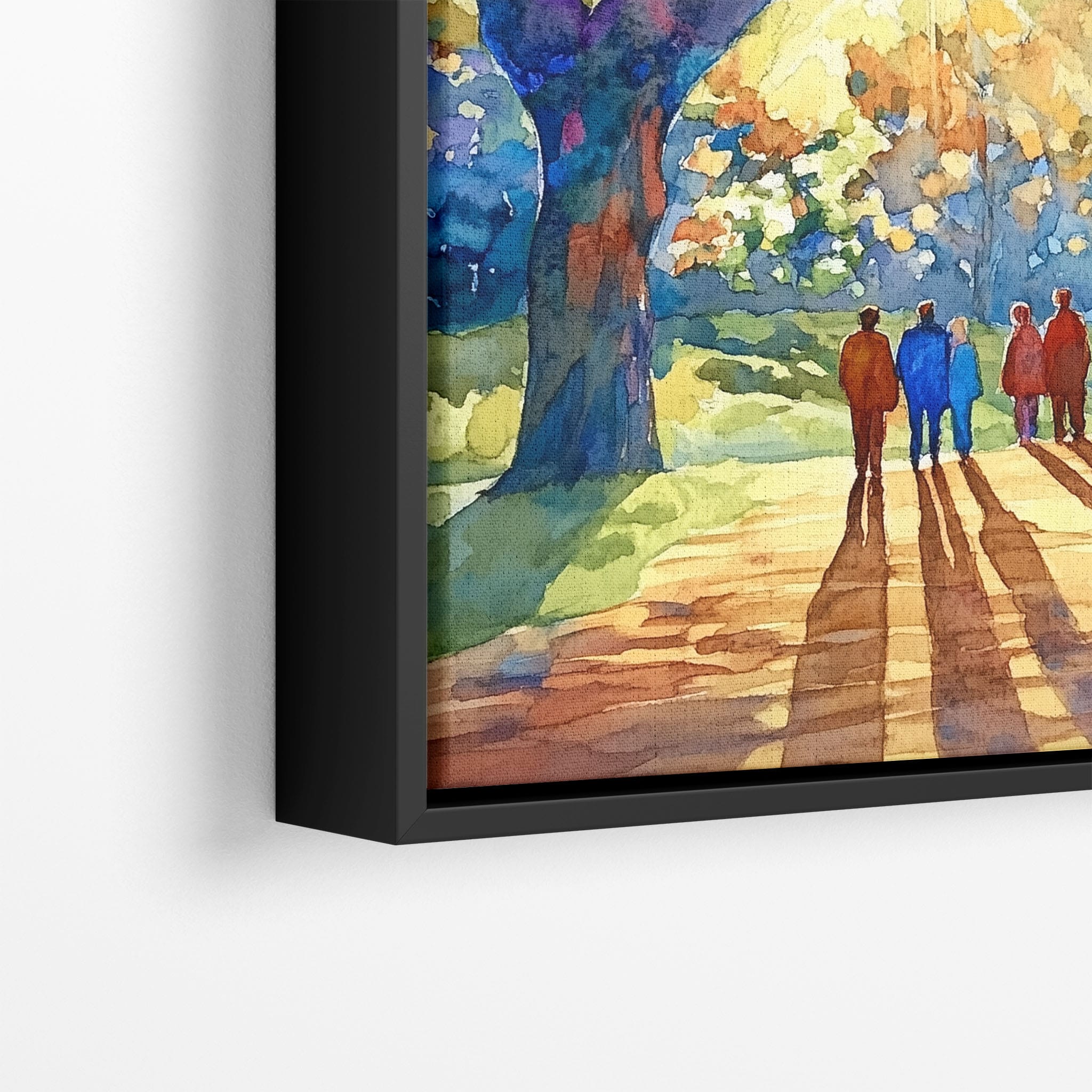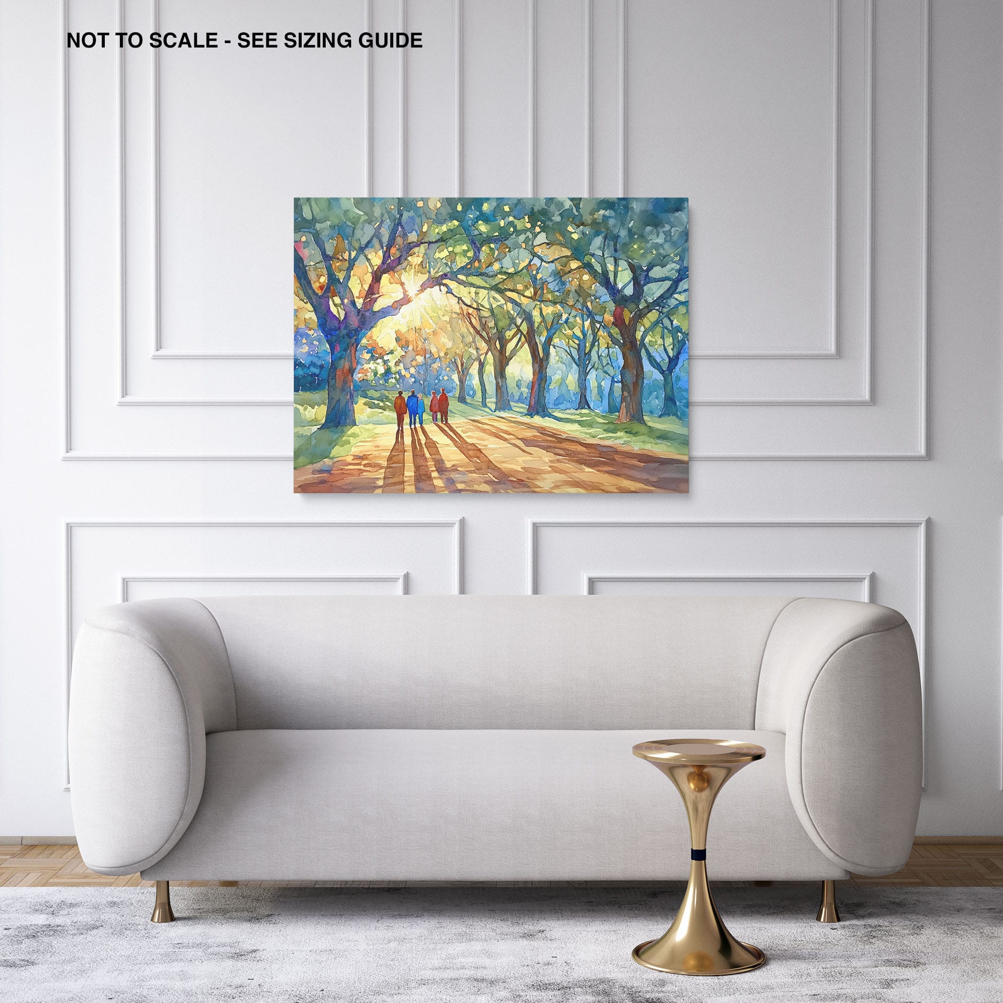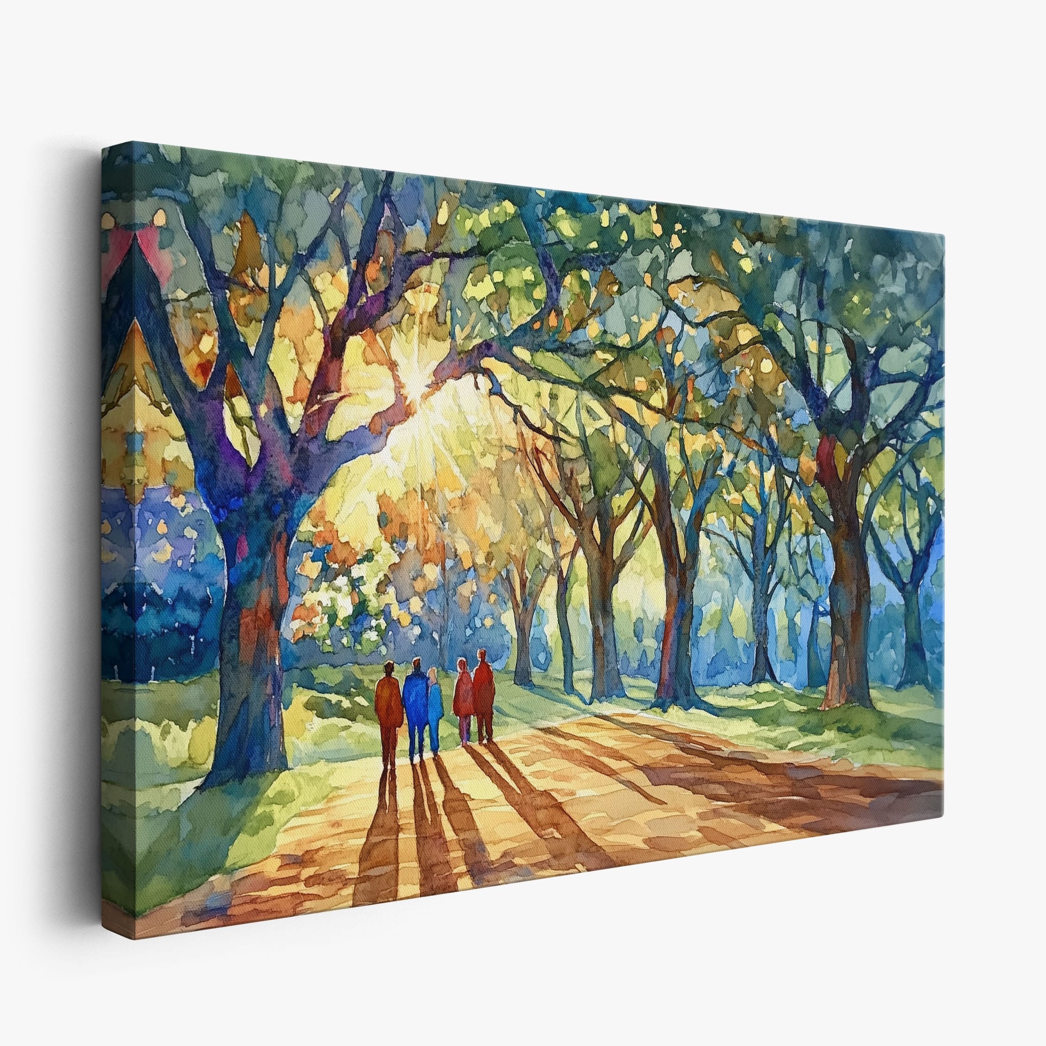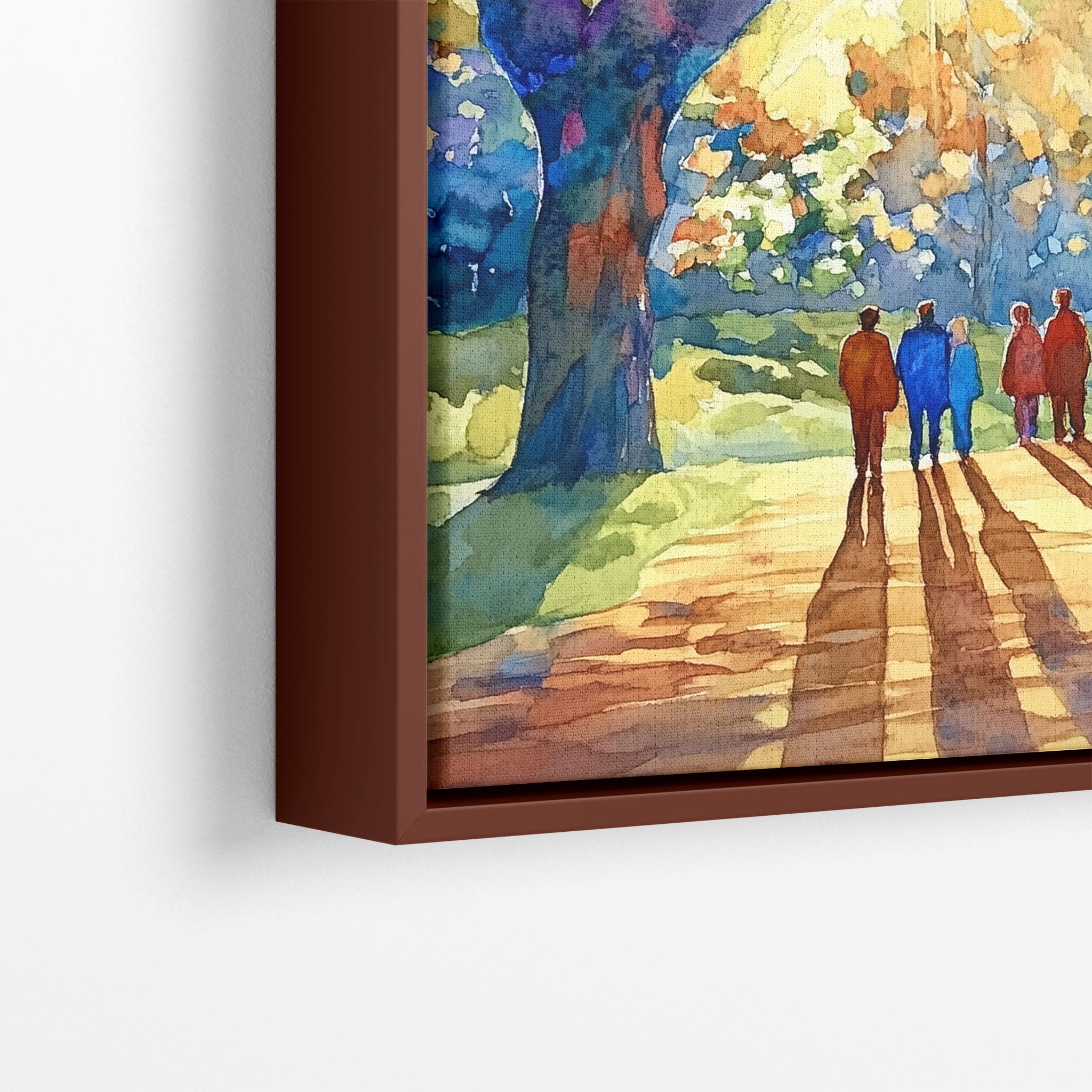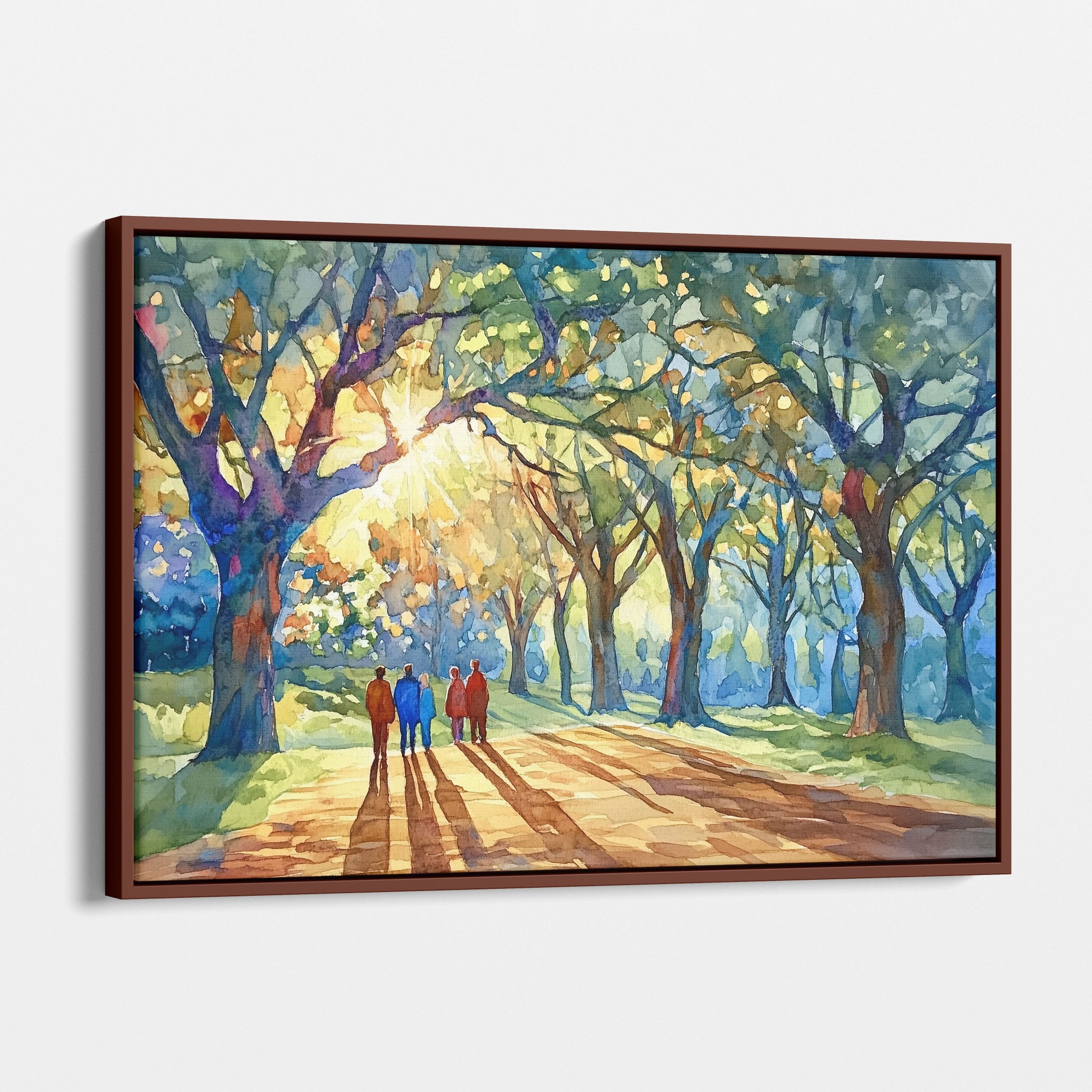 This enchanting digital watercolor painting captures a serene moment as three figures amble through a vivid autumnal landscape, their long shadows stretching across a sunlit park path. Its impressionistic style brings each brushstroke to life, showcasing a beautiful interplay of light and color. The whimsical portrayal of the fleeting nature of an autumn day offers a visual retreat for nature lovers and art aficionados alike. Perfect for adding a splash of vibrant colors and serene vibes to any space, this artwork is a must-have for those looking to brighten their surroundings with a piece of seasonal poetry.