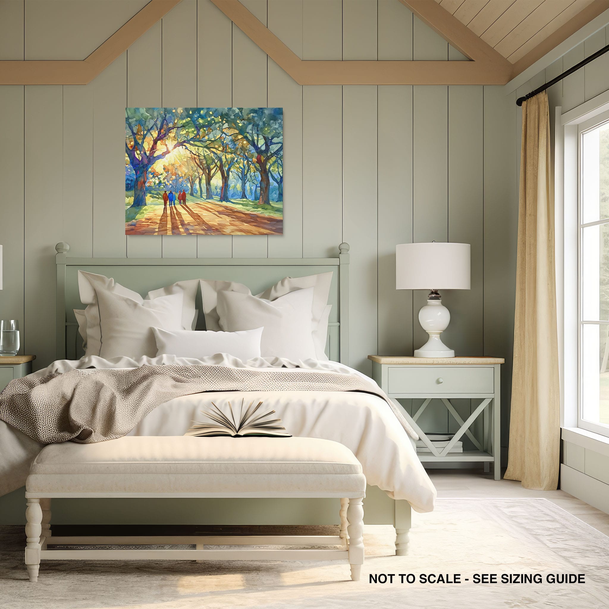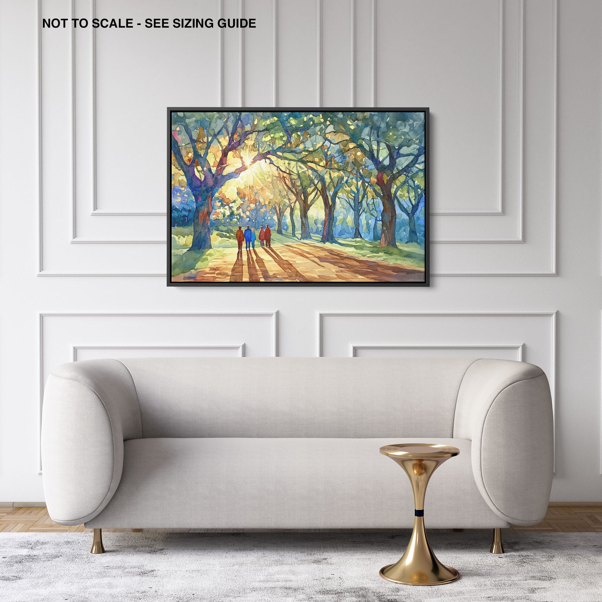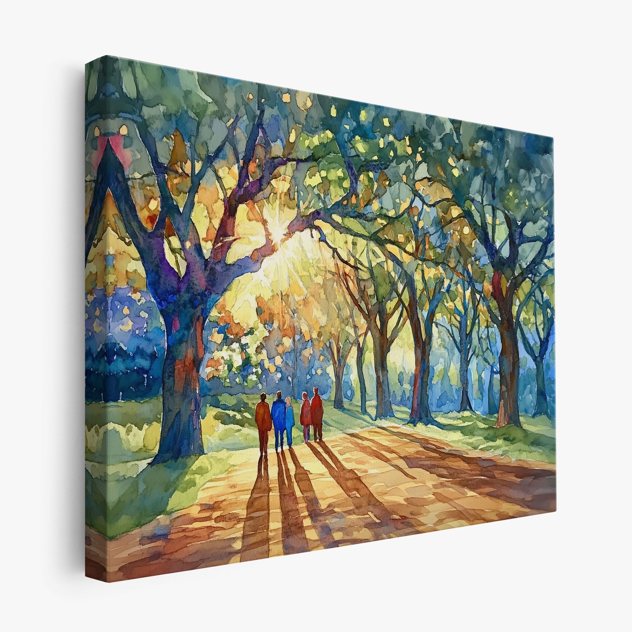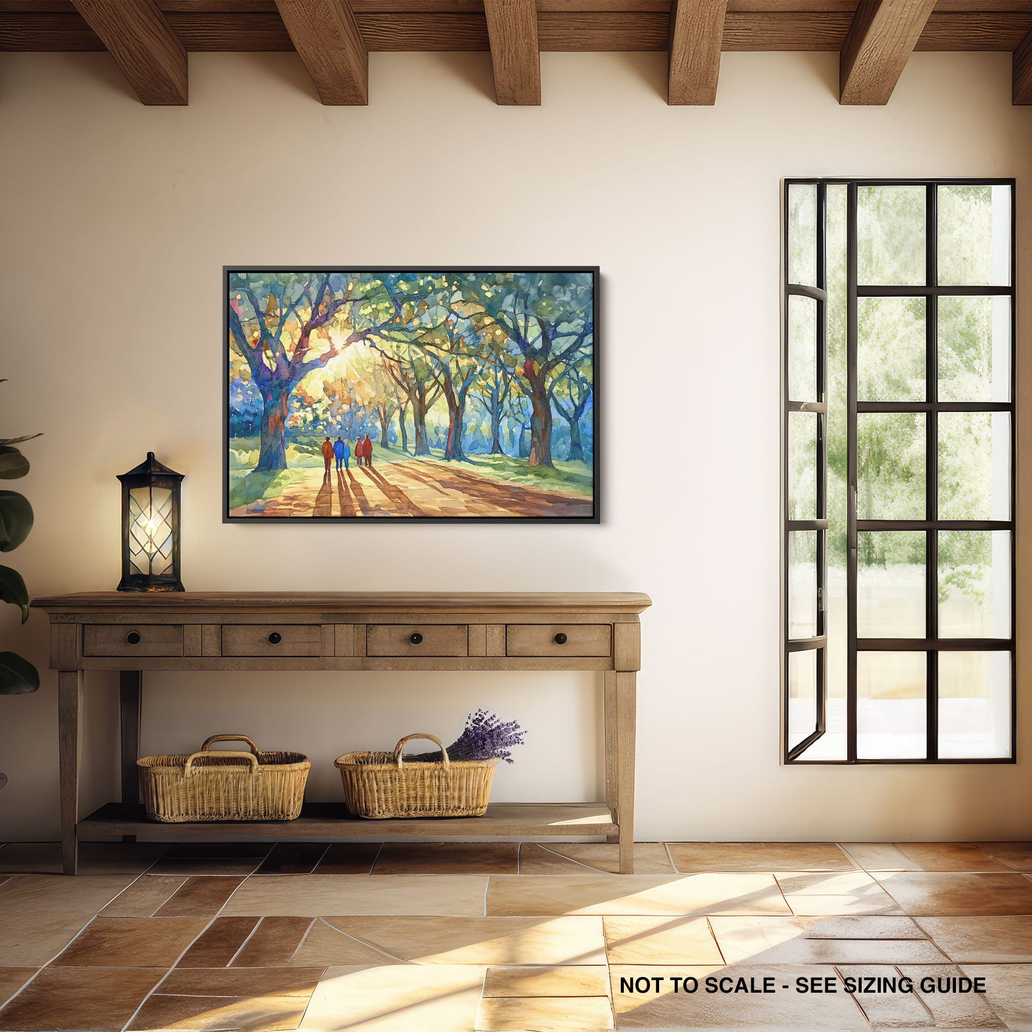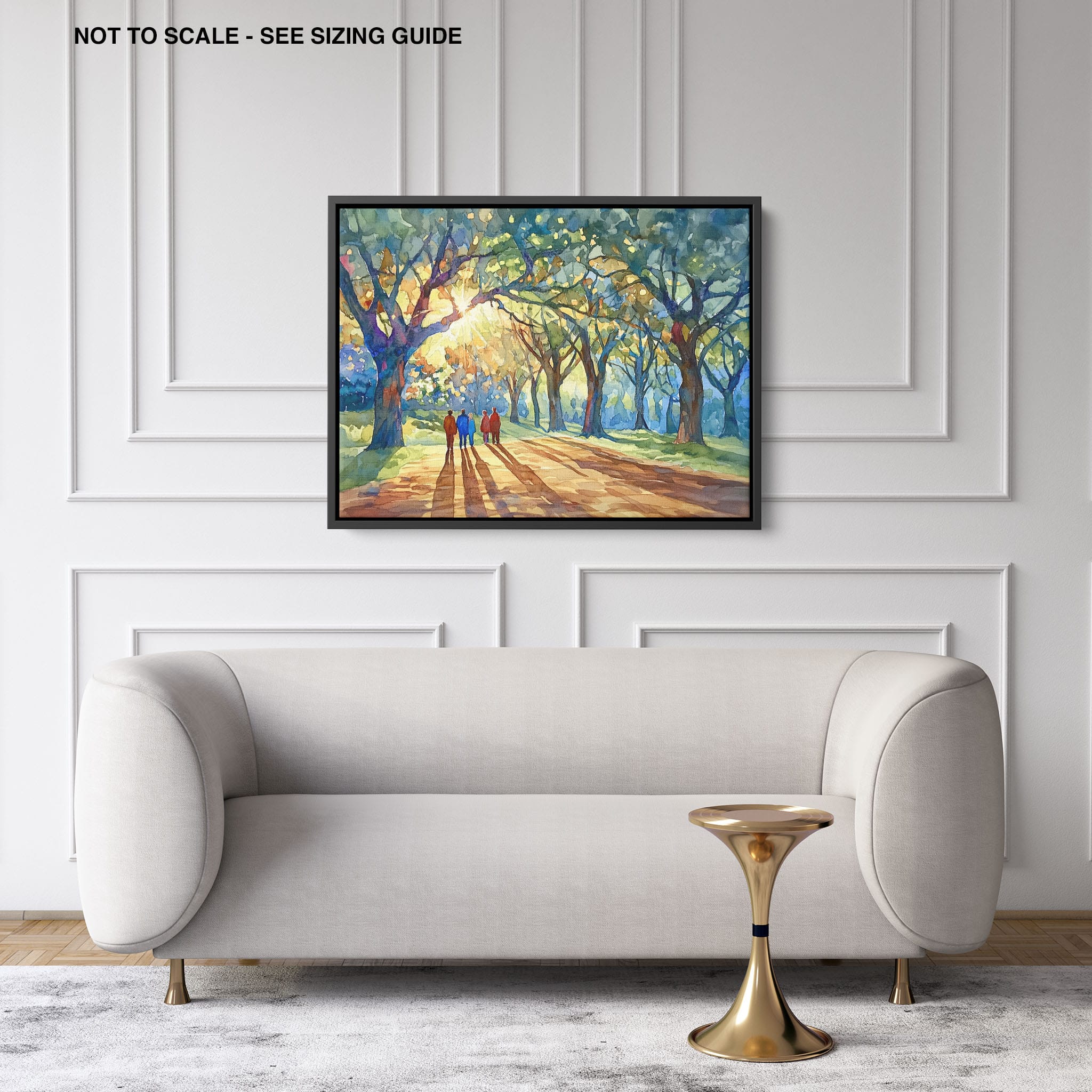 This enchanting digital watercolor painting captures a serene moment as three figures amble through a vivid autumnal landscape, their long shadows stretching across a sunlit park path. Its impressionistic style brings each brushstroke to life, showcasing a beautiful interplay of light and color. The whimsical portrayal of the fleeting nature of an autumn day offers a visual retreat for nature lovers and art aficionados alike. Perfect for adding a splash of vibrant colors and serene vibes to any space, this artwork is a must-have for those looking to brighten their surroundings with a piece of seasonal poetry.