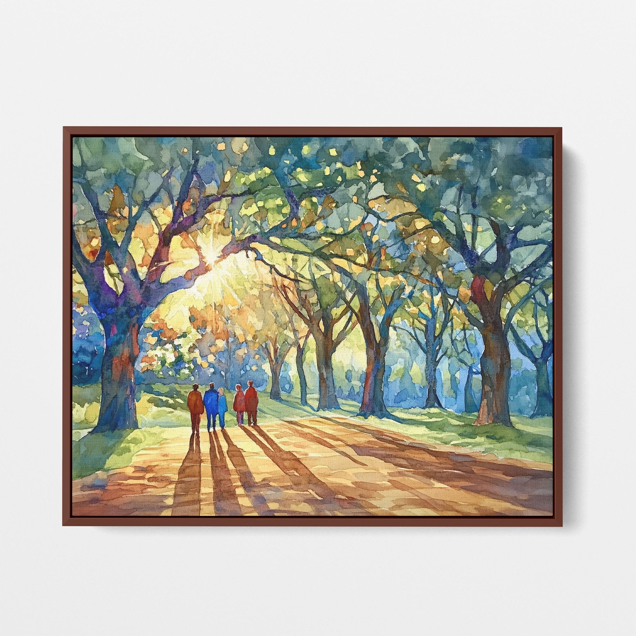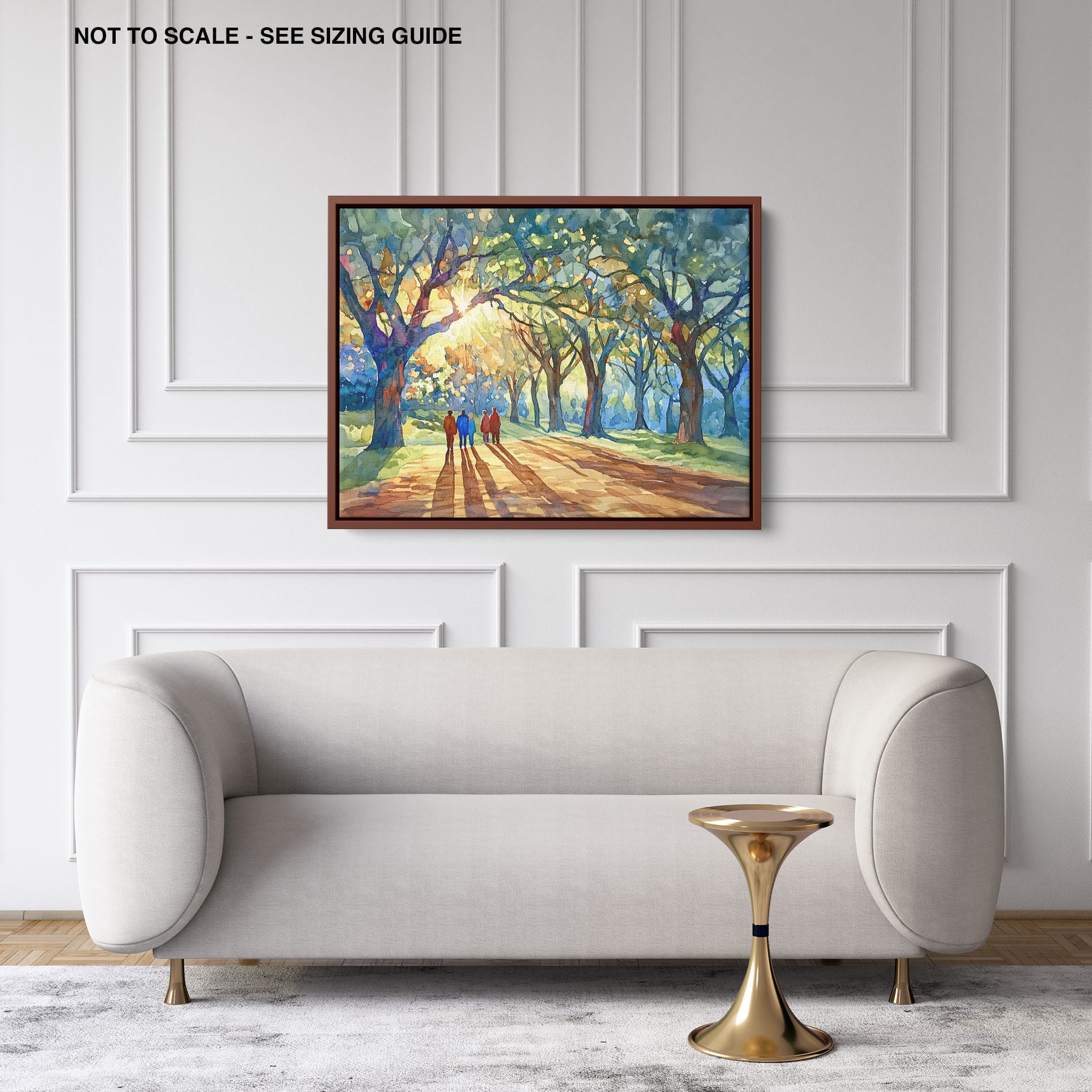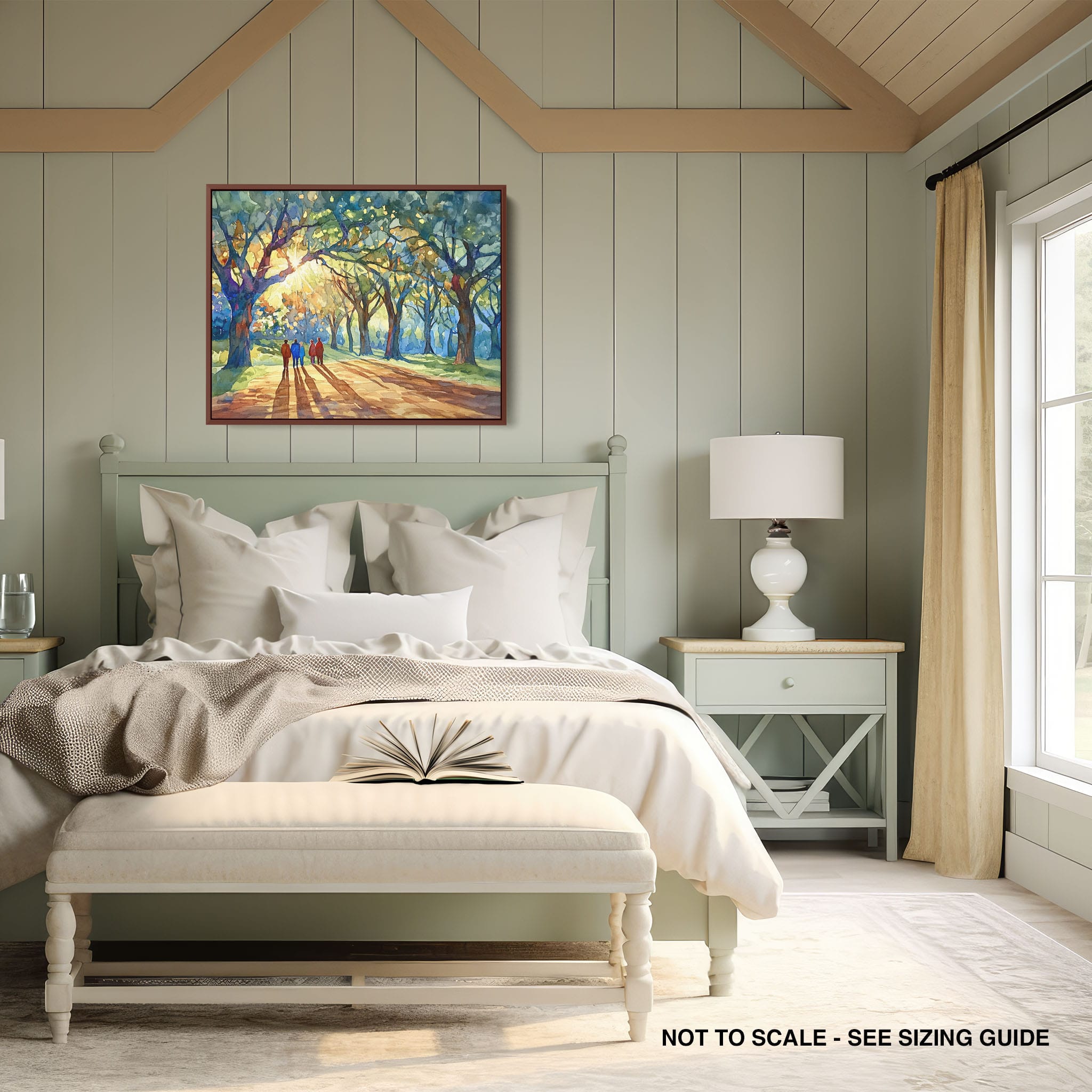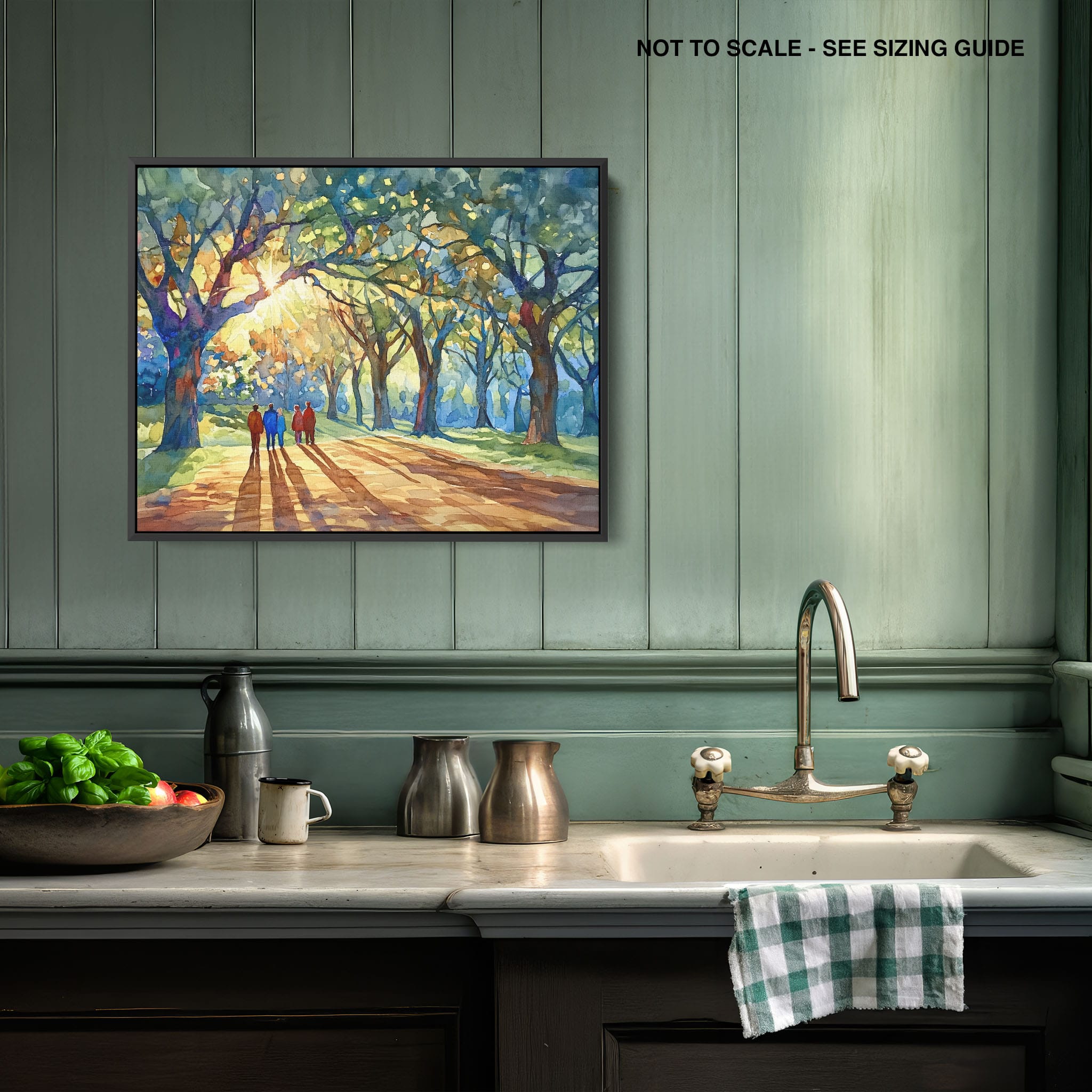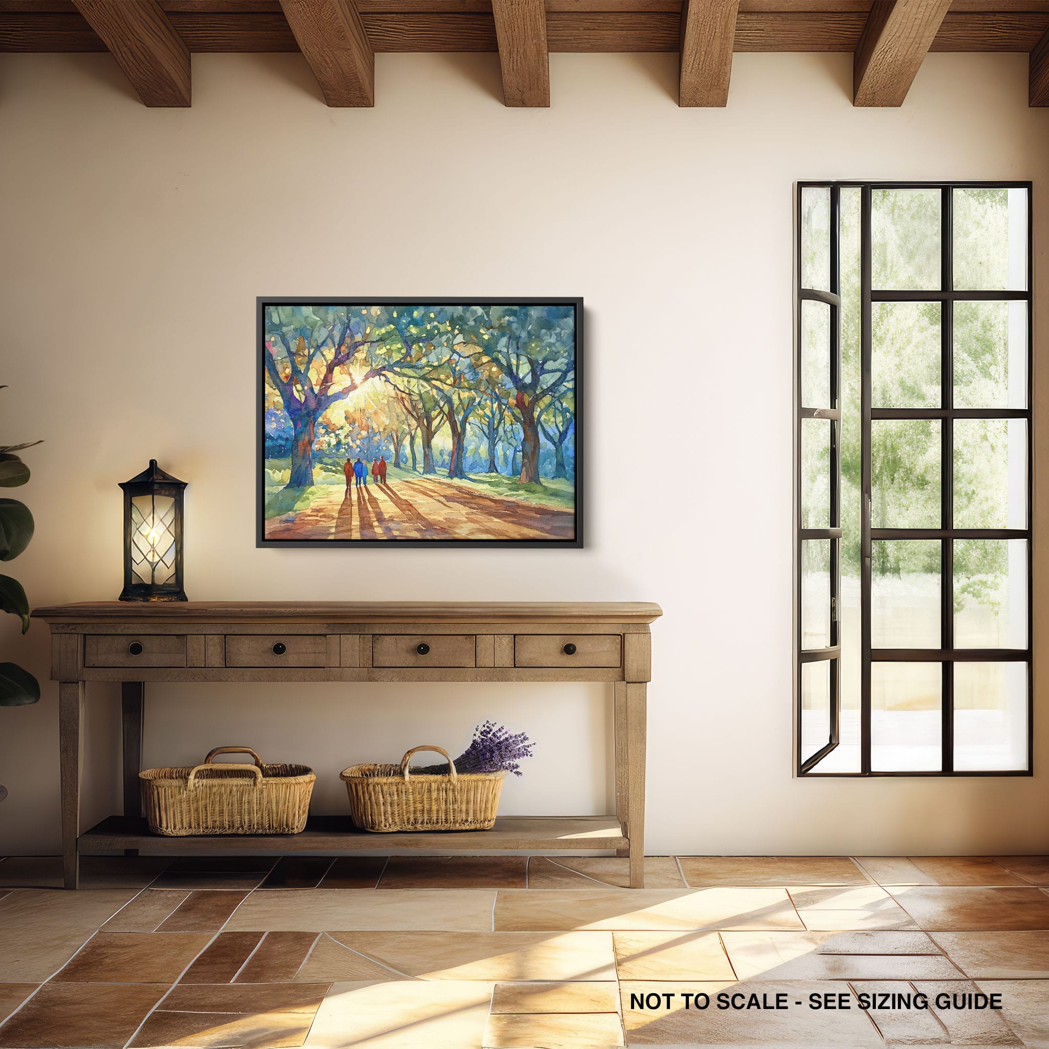 This enchanting digital watercolor painting captures a serene moment as three figures amble through a vivid autumnal landscape, their long shadows stretching across a sunlit park path. Its impressionistic style brings each brushstroke to life, showcasing a beautiful interplay of light and color. The whimsical portrayal of the fleeting nature of an autumn day offers a visual retreat for nature lovers and art aficionados alike. Perfect for adding a splash of vibrant colors and serene vibes to any space, this artwork is a must-have for those looking to brighten their surroundings with a piece of seasonal poetry.