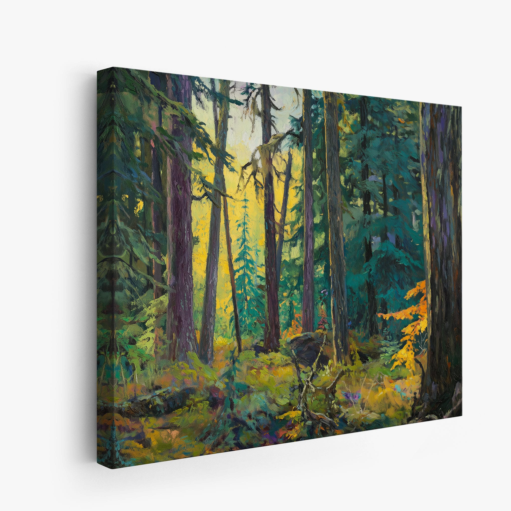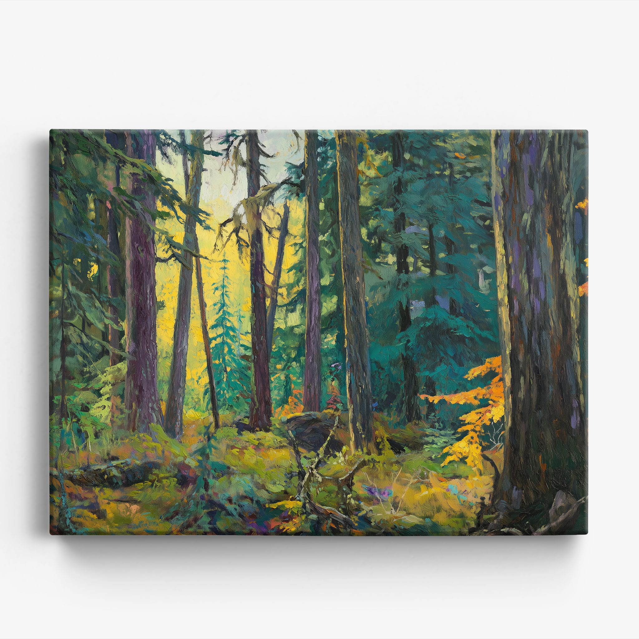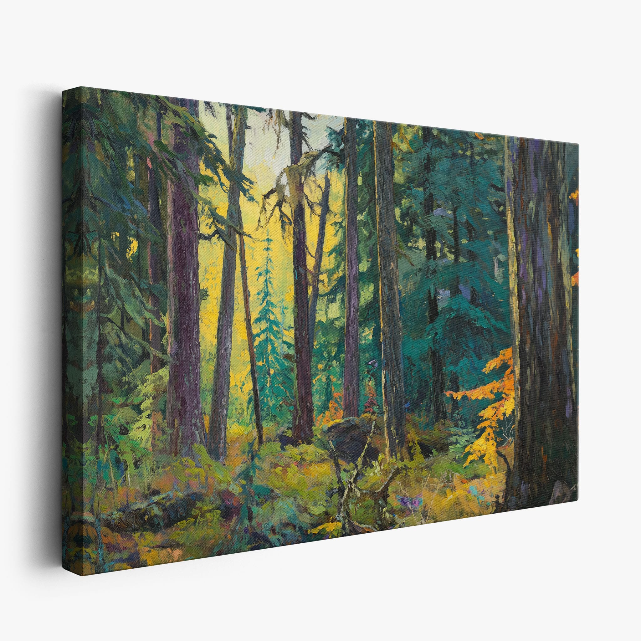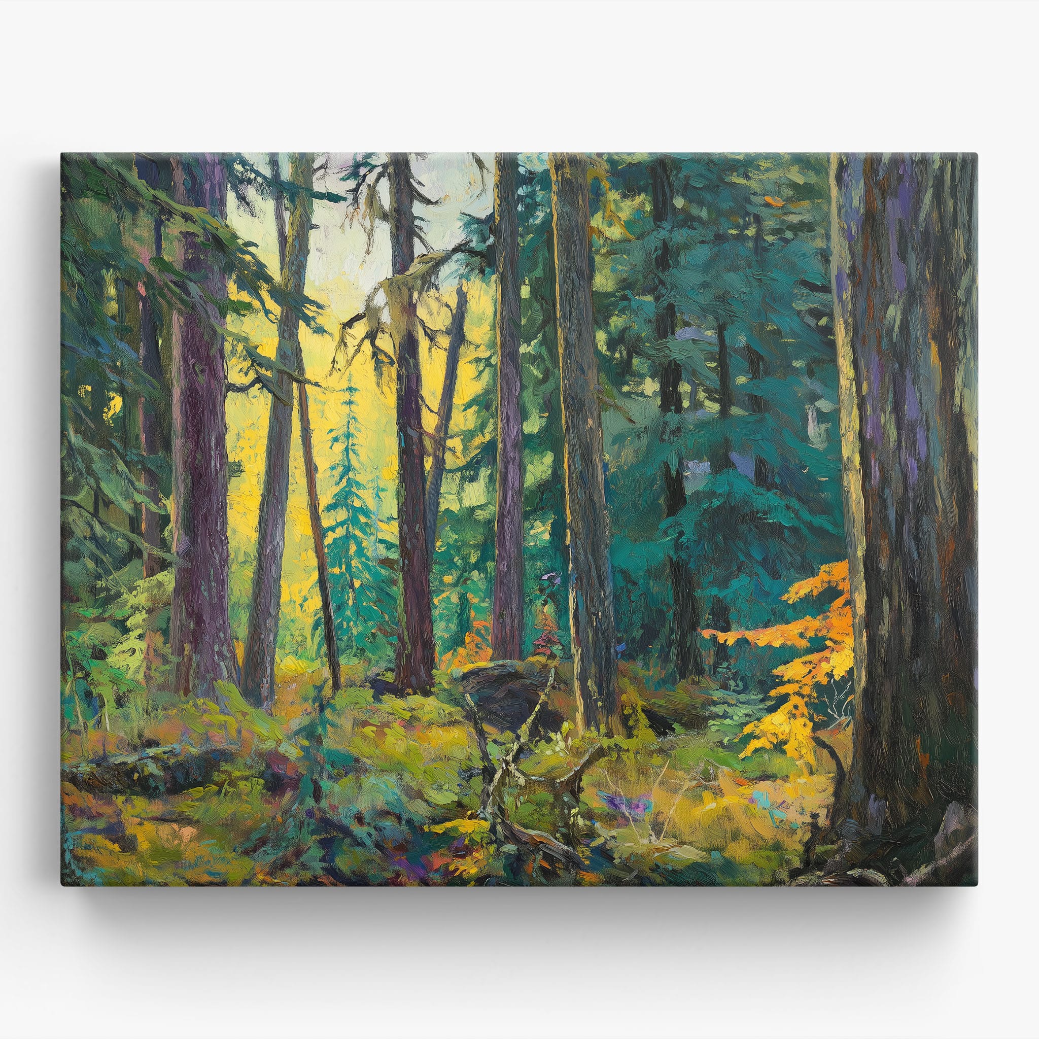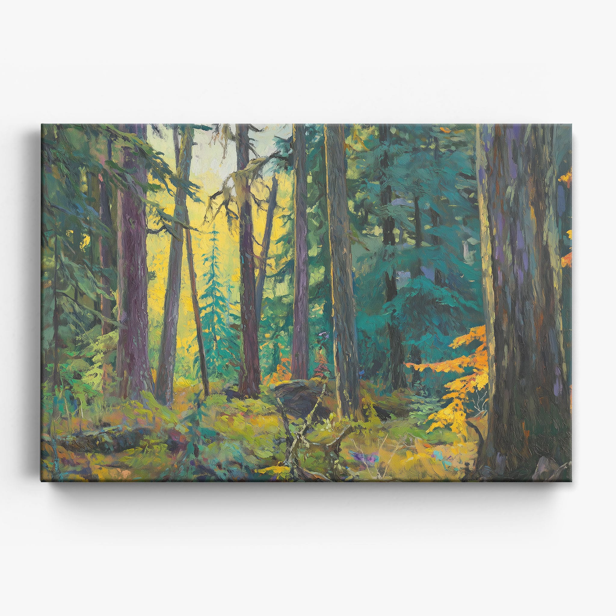 This vibrant painting captures the serene beauty of a densely wooded forest bathed in autumn light. Rich hues of green, yellow, and orange paint a scene that speaks to the soul of nature enthusiasts and art lovers alike. The artwork skillfully employs Impressionism to suggest the fleeting quality of light filtering through the tree canopy, while the Realism style grounds the scene in a palpable sense of place. Perfect for anyone looking to add a touch of natural elegance to their living space, this painting invites viewers to lose themselves in the tranquil depths of the wild forest.