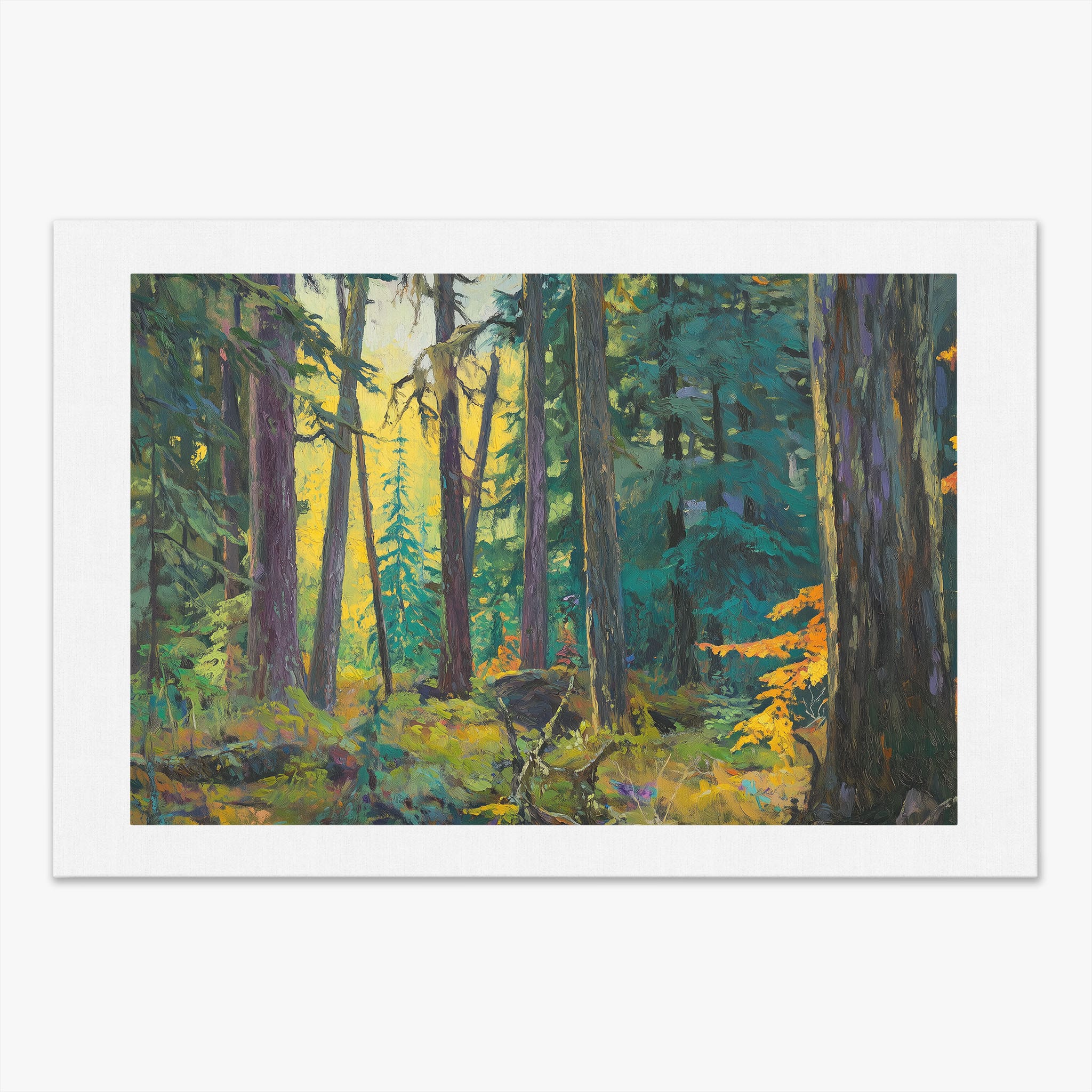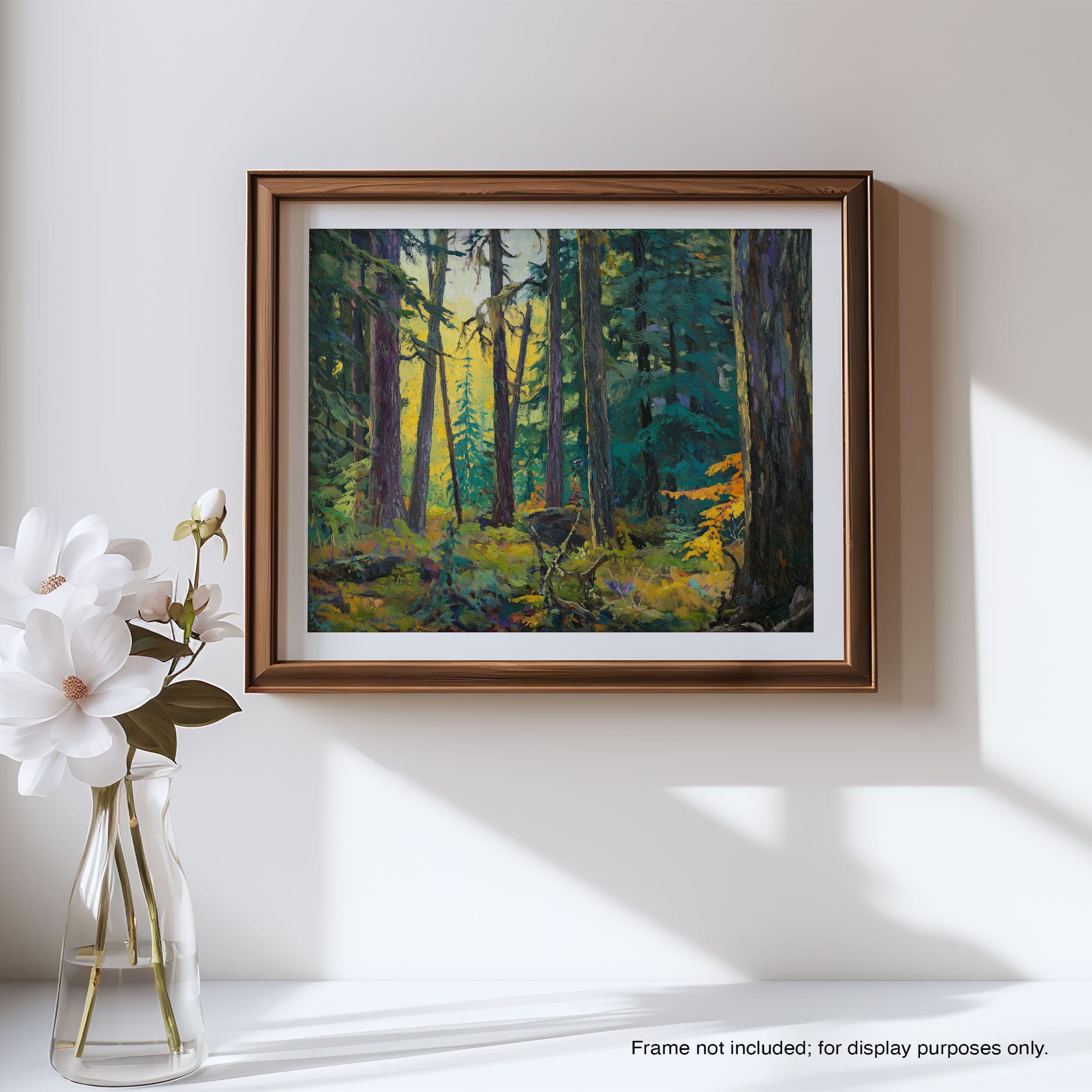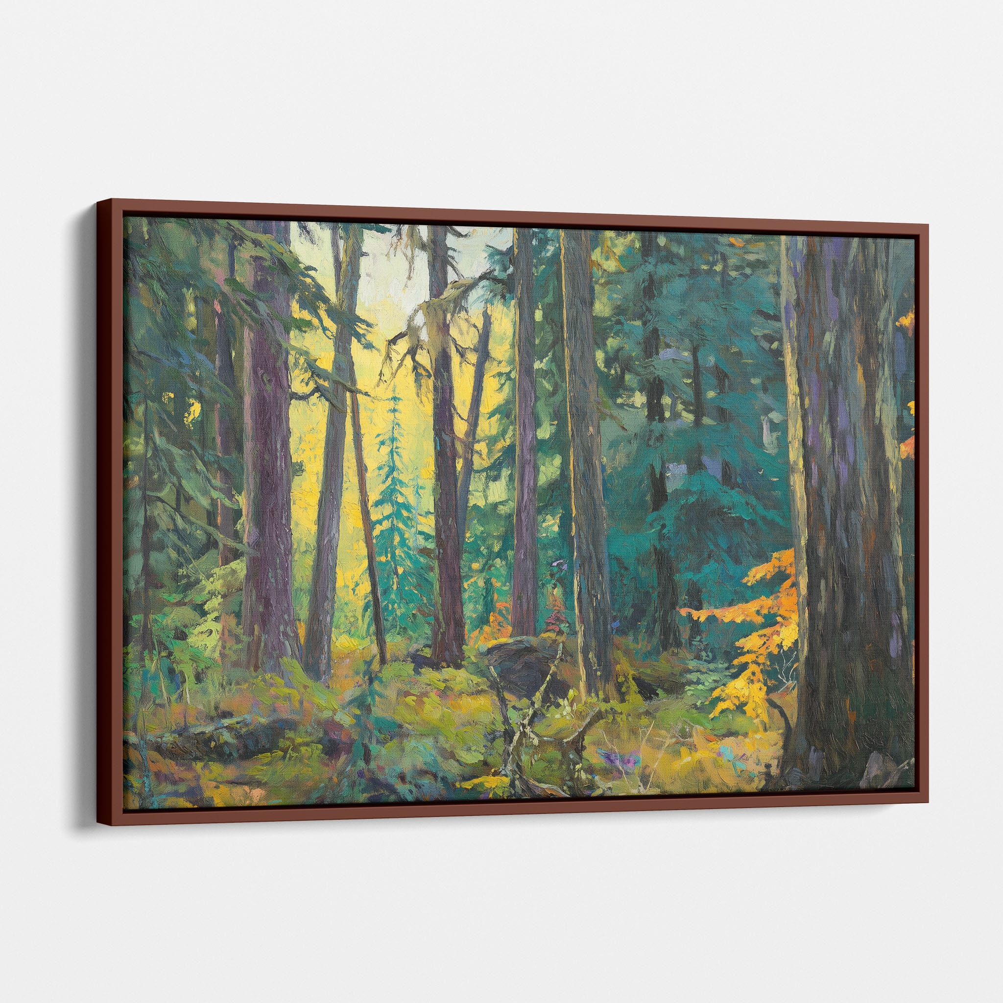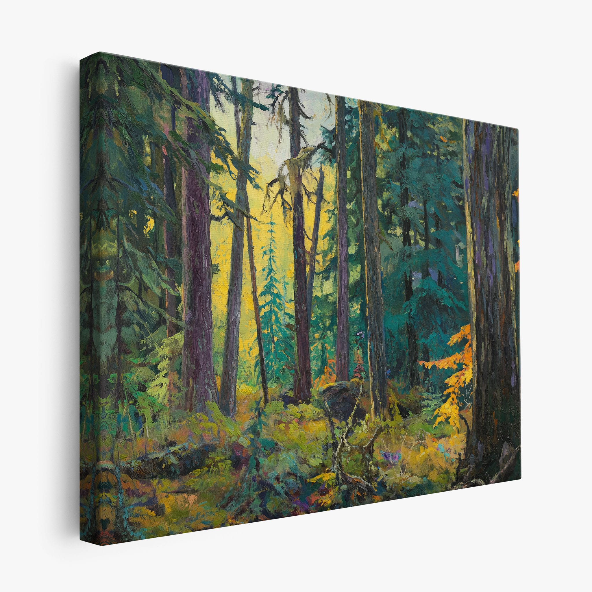 This vibrant painting captures the serene beauty of a densely wooded forest bathed in autumn light. Rich hues of green, yellow, and orange paint a scene that speaks to the soul of nature enthusiasts and art lovers alike. The artwork skillfully employs Impressionism to suggest the fleeting quality of light filtering through the tree canopy, while the Realism style grounds the scene in a palpable sense of place. Perfect for anyone looking to add a touch of natural elegance to their living space, this painting invites viewers to lose themselves in the tranquil depths of the wild forest.