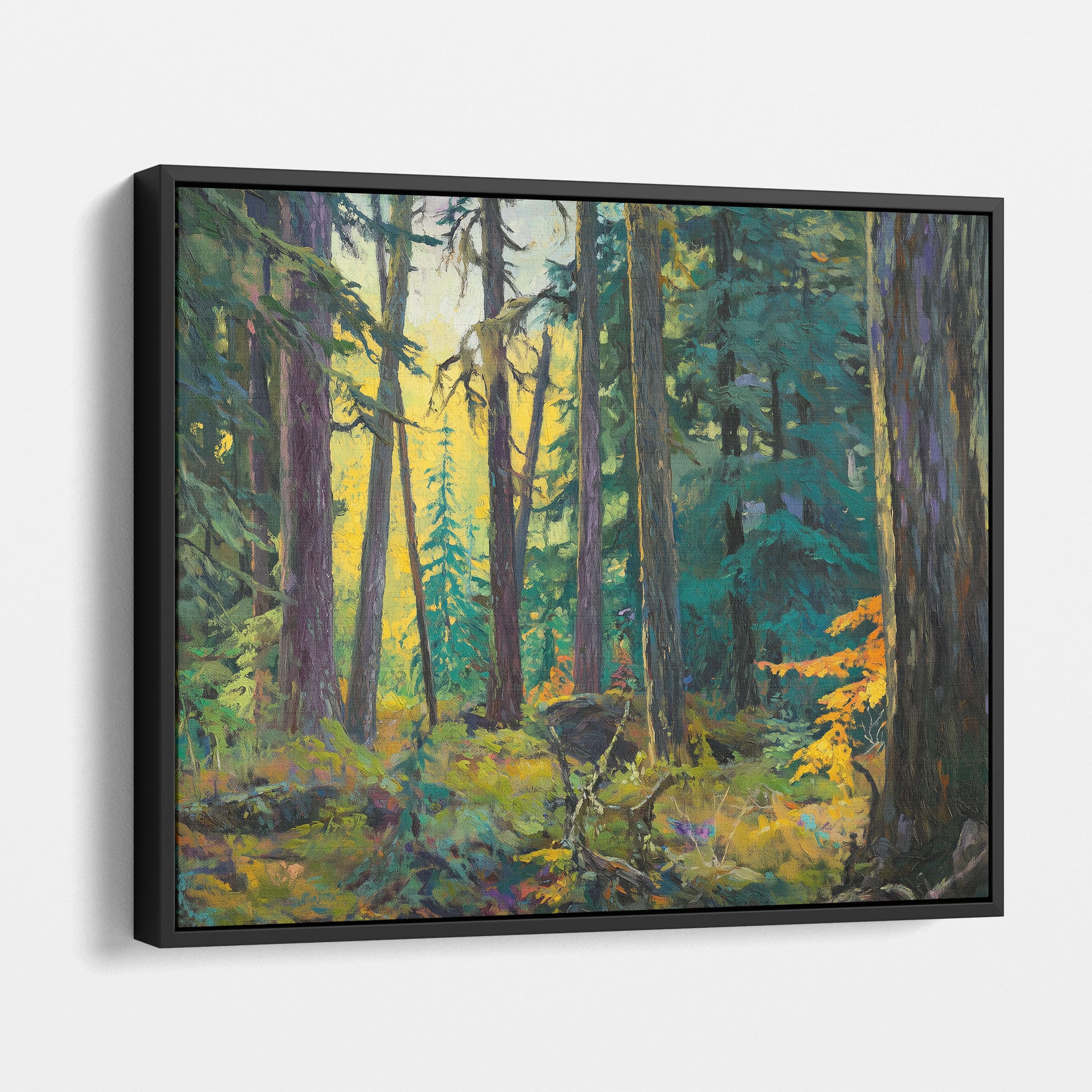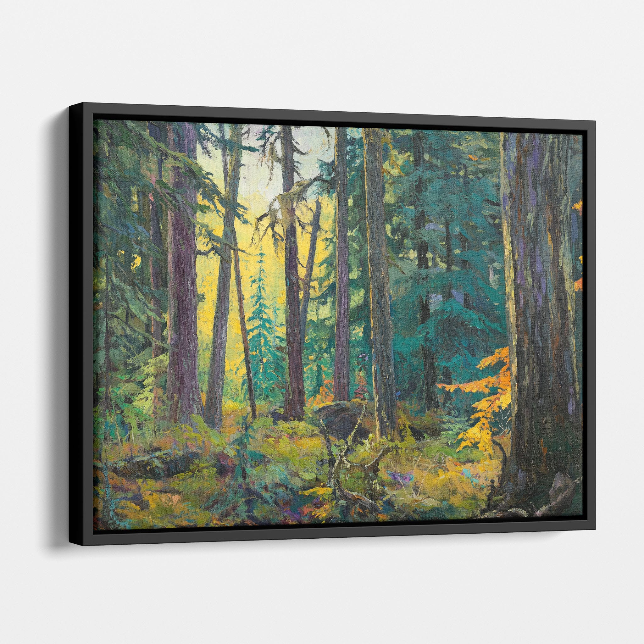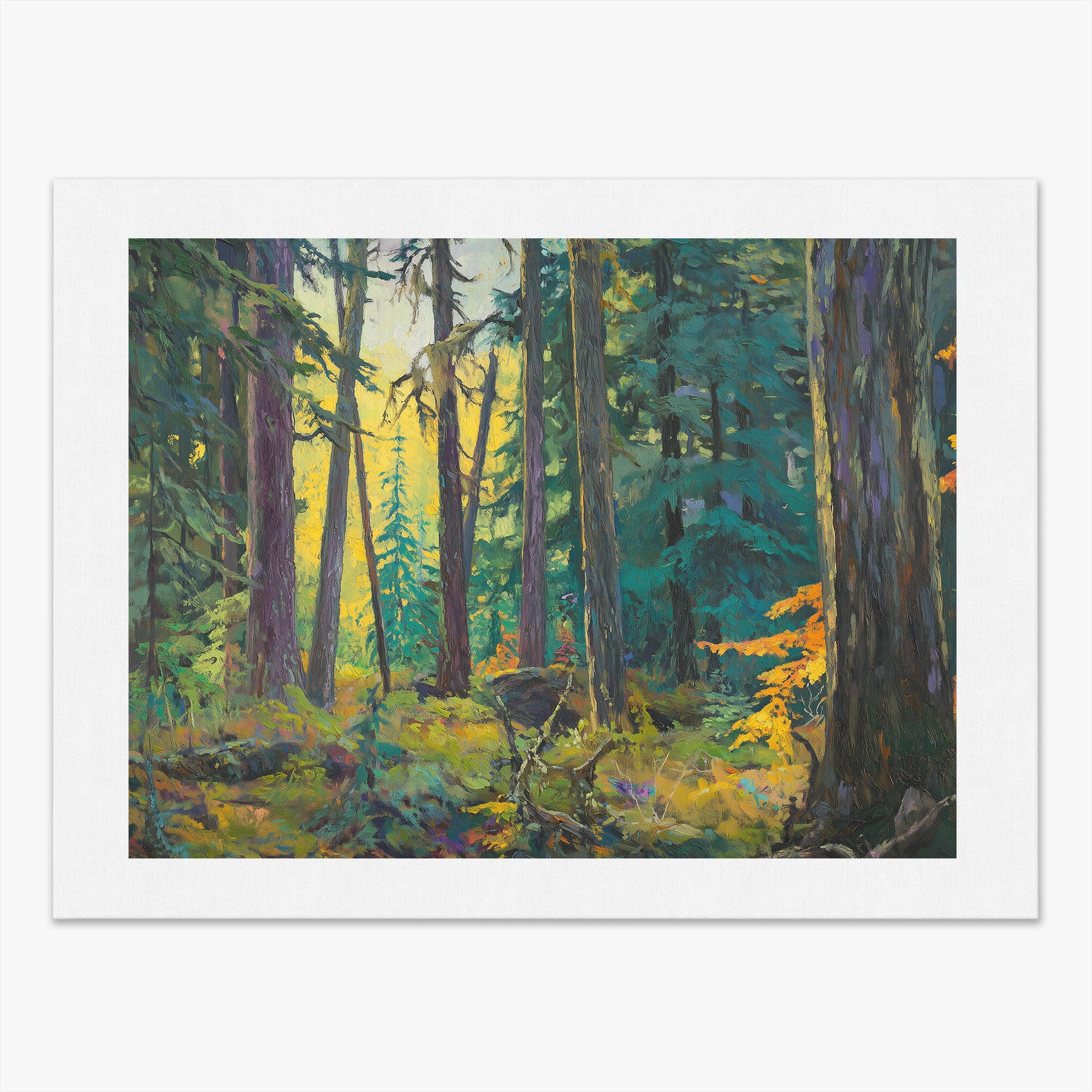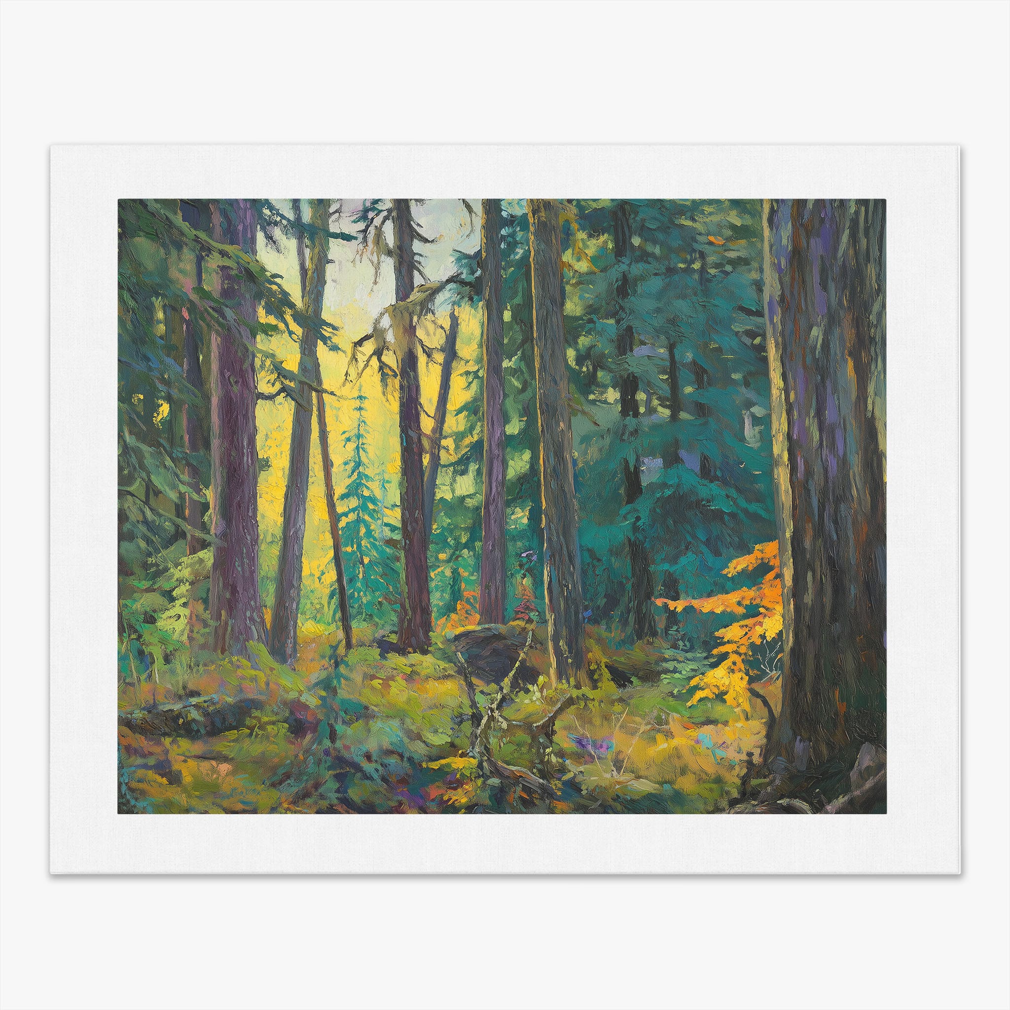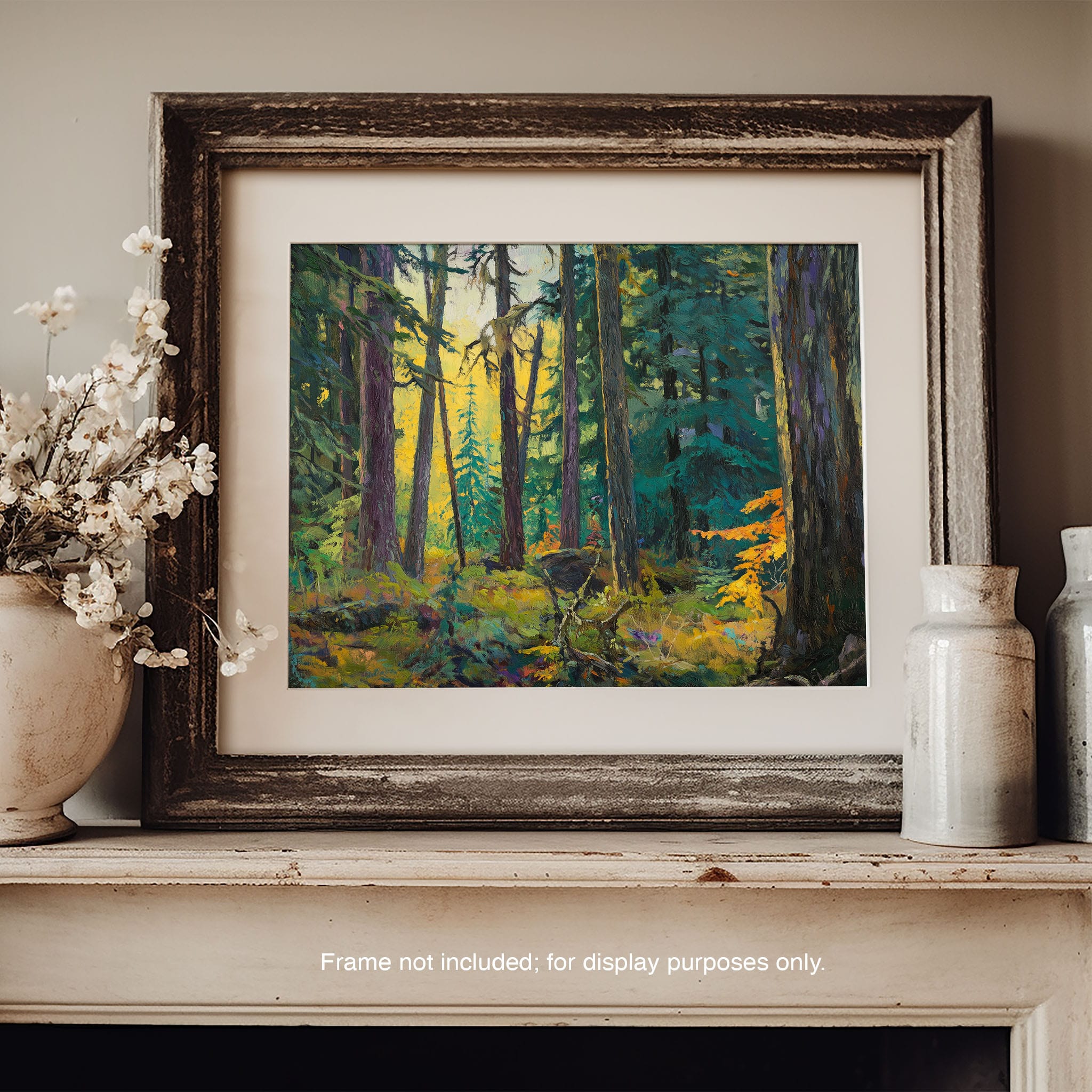 This vibrant painting captures the serene beauty of a densely wooded forest bathed in autumn light. Rich hues of green, yellow, and orange paint a scene that speaks to the soul of nature enthusiasts and art lovers alike. The artwork skillfully employs Impressionism to suggest the fleeting quality of light filtering through the tree canopy, while the Realism style grounds the scene in a palpable sense of place. Perfect for anyone looking to add a touch of natural elegance to their living space, this painting invites viewers to lose themselves in the tranquil depths of the wild forest.