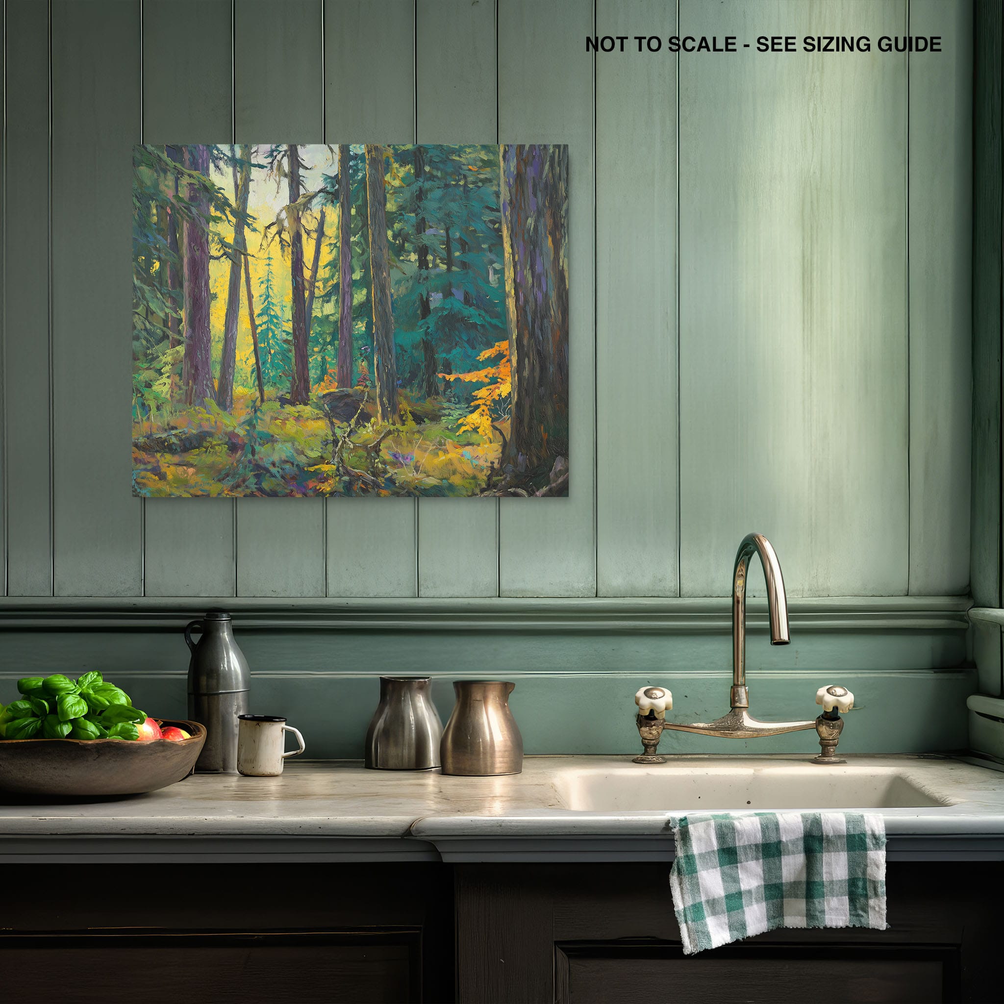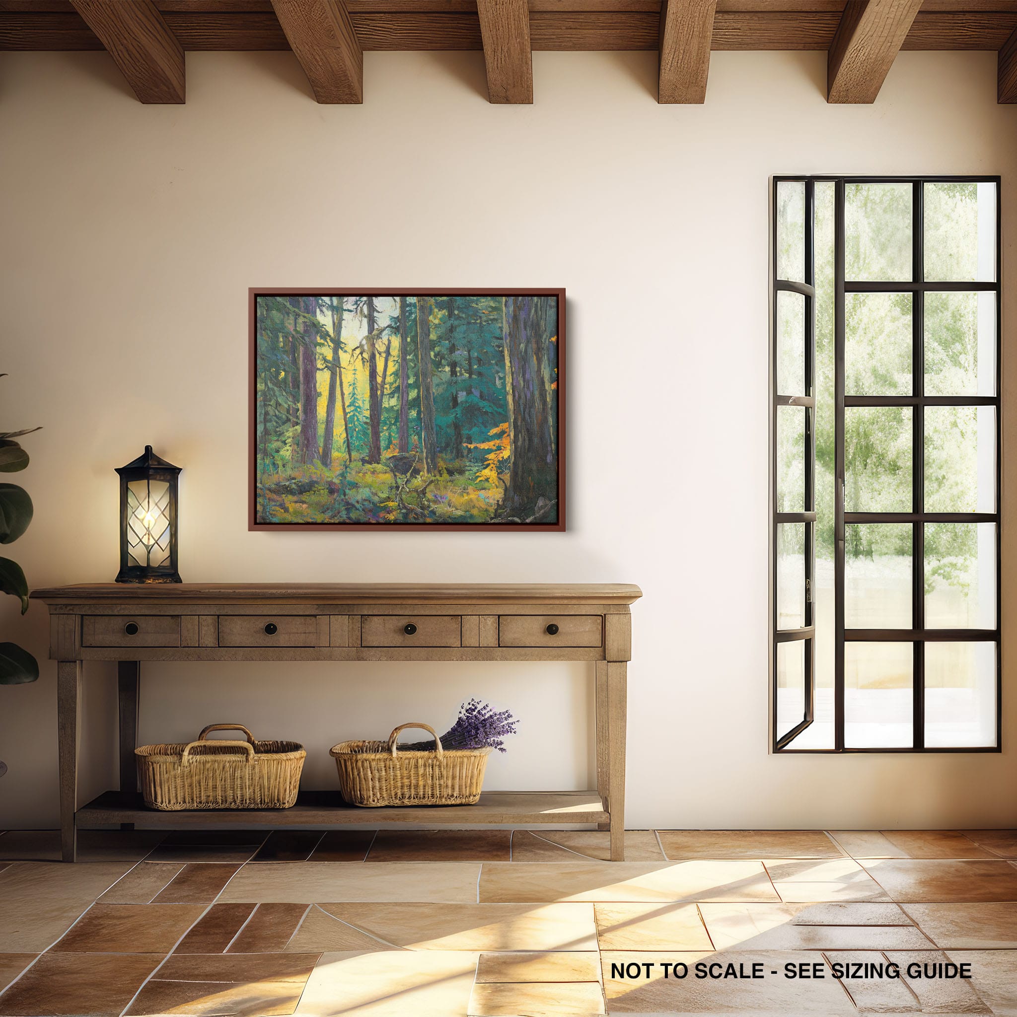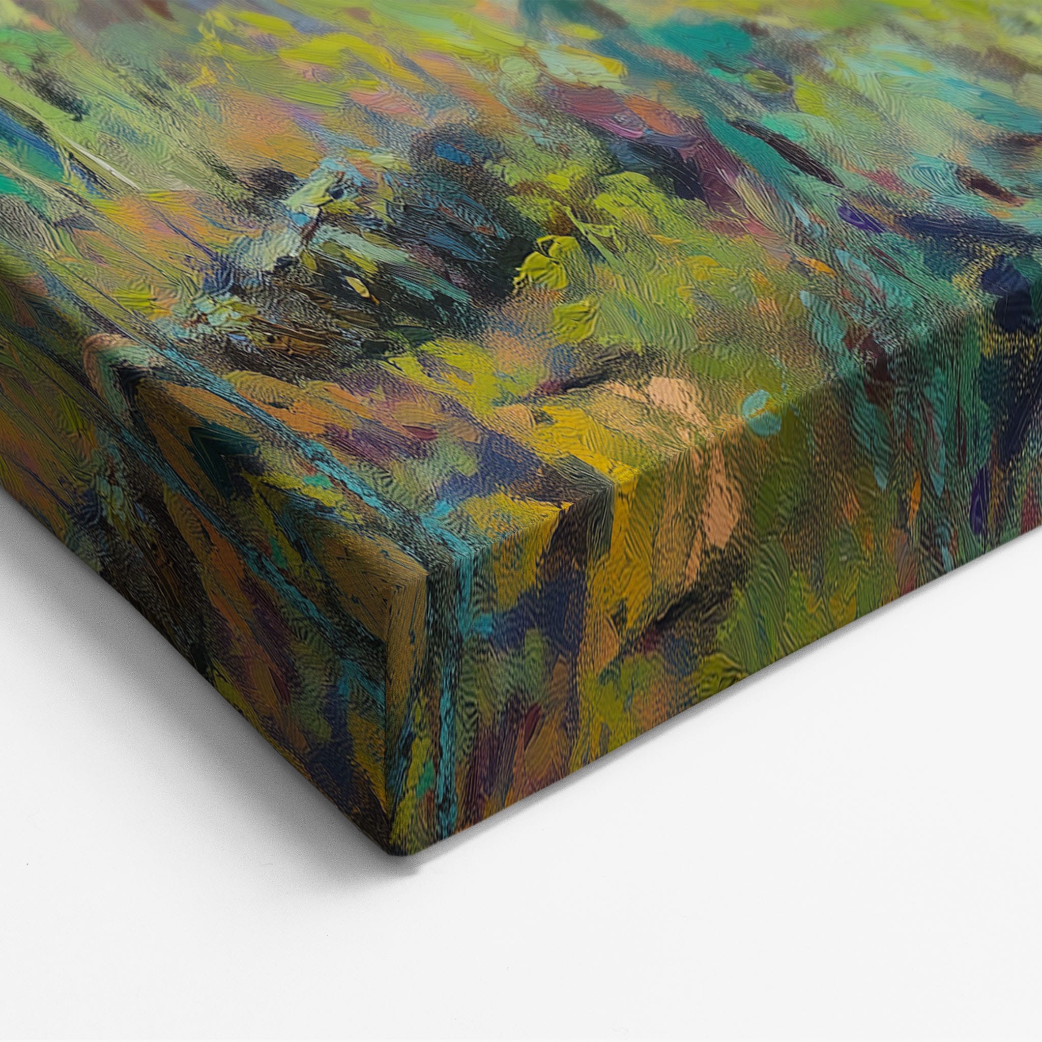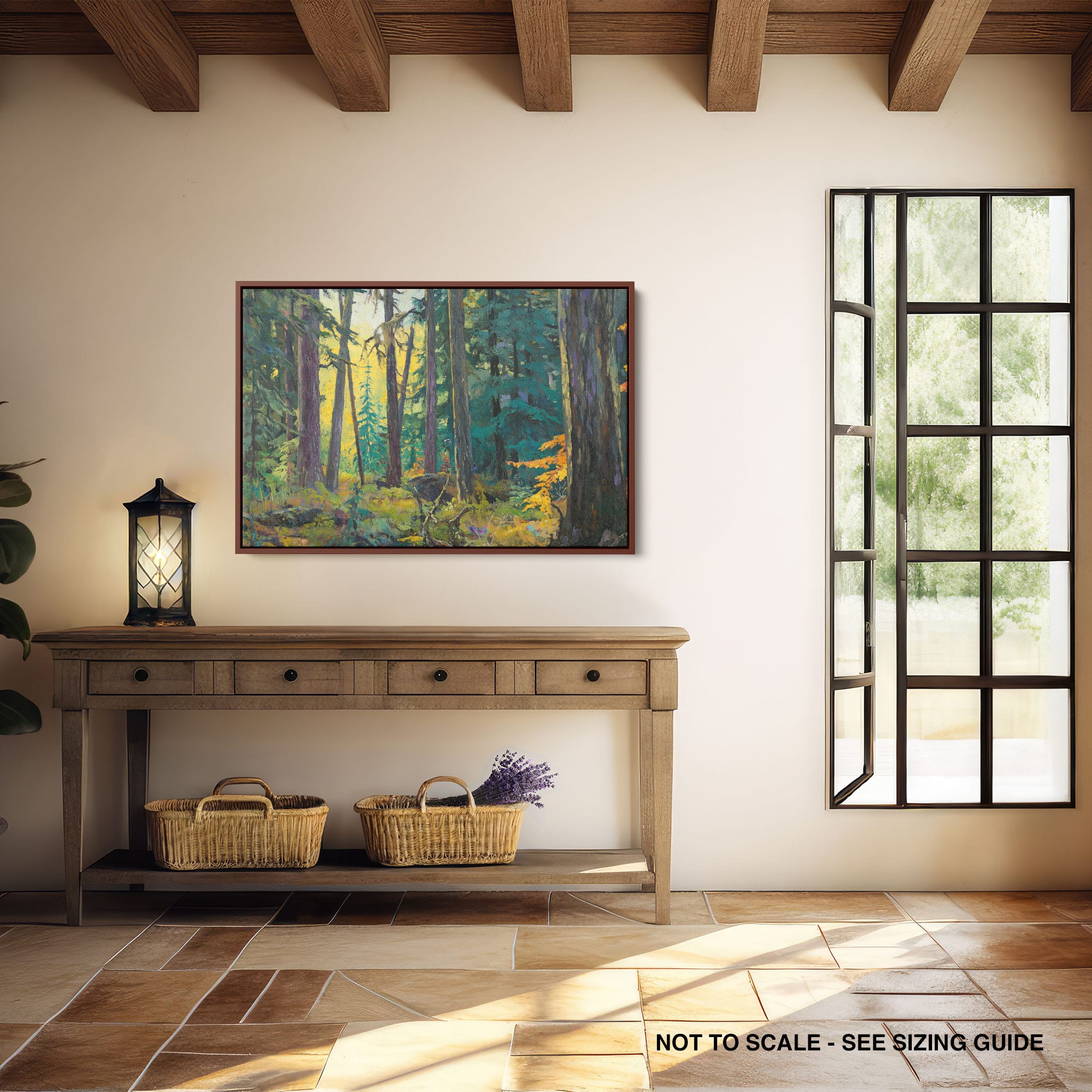 This vibrant painting captures the serene beauty of a densely wooded forest bathed in autumn light. Rich hues of green, yellow, and orange paint a scene that speaks to the soul of nature enthusiasts and art lovers alike. The artwork skillfully employs Impressionism to suggest the fleeting quality of light filtering through the tree canopy, while the Realism style grounds the scene in a palpable sense of place. Perfect for anyone looking to add a touch of natural elegance to their living space, this painting invites viewers to lose themselves in the tranquil depths of the wild forest.