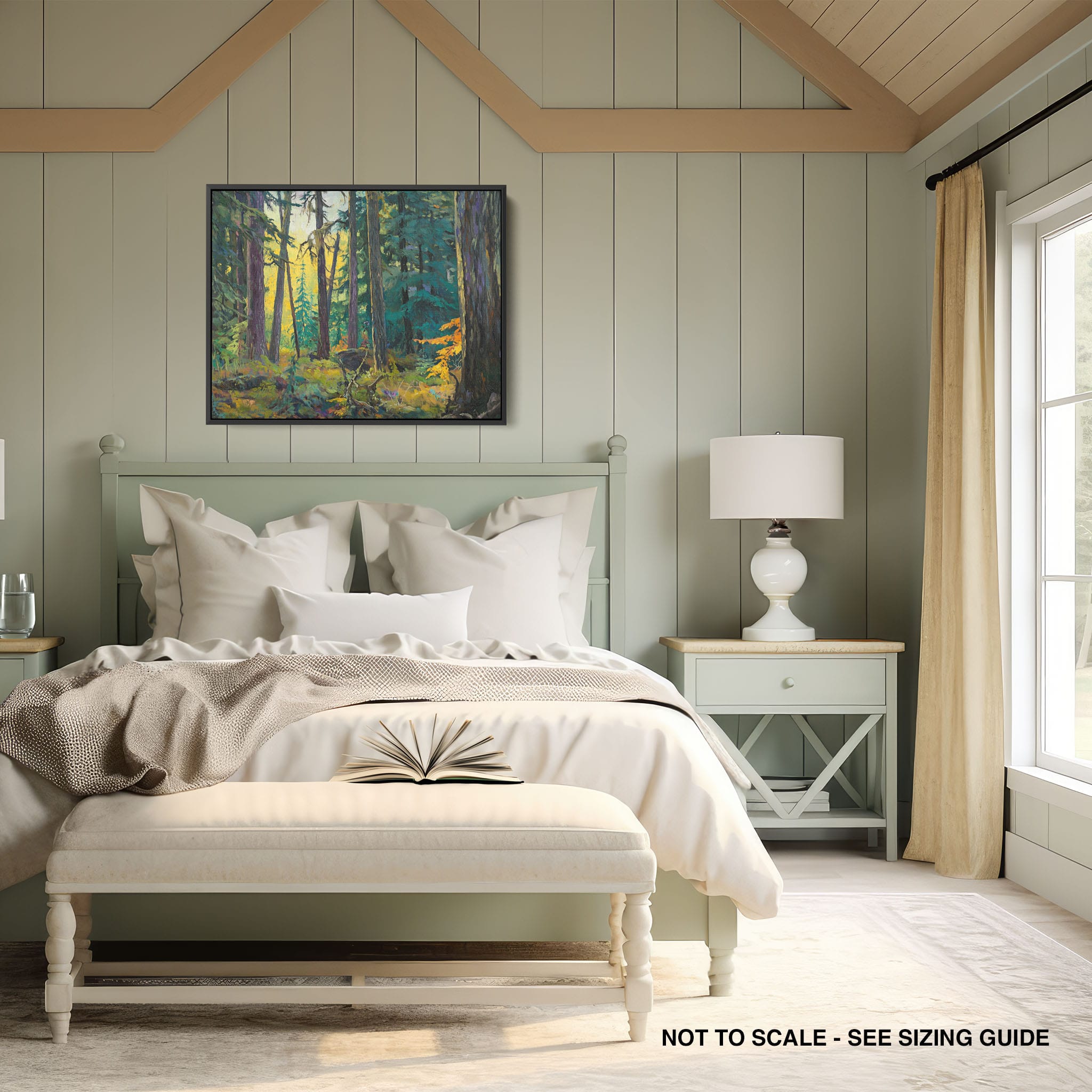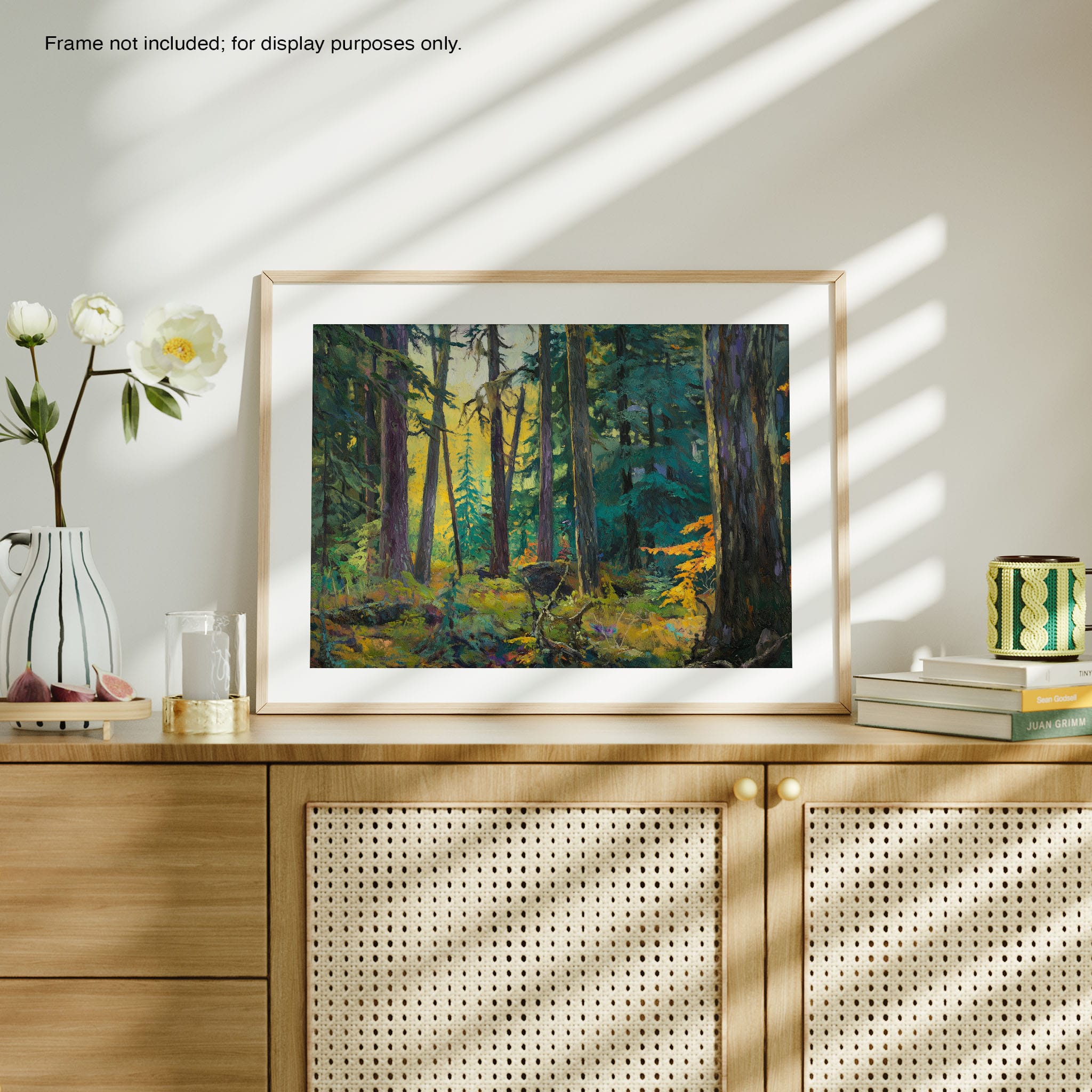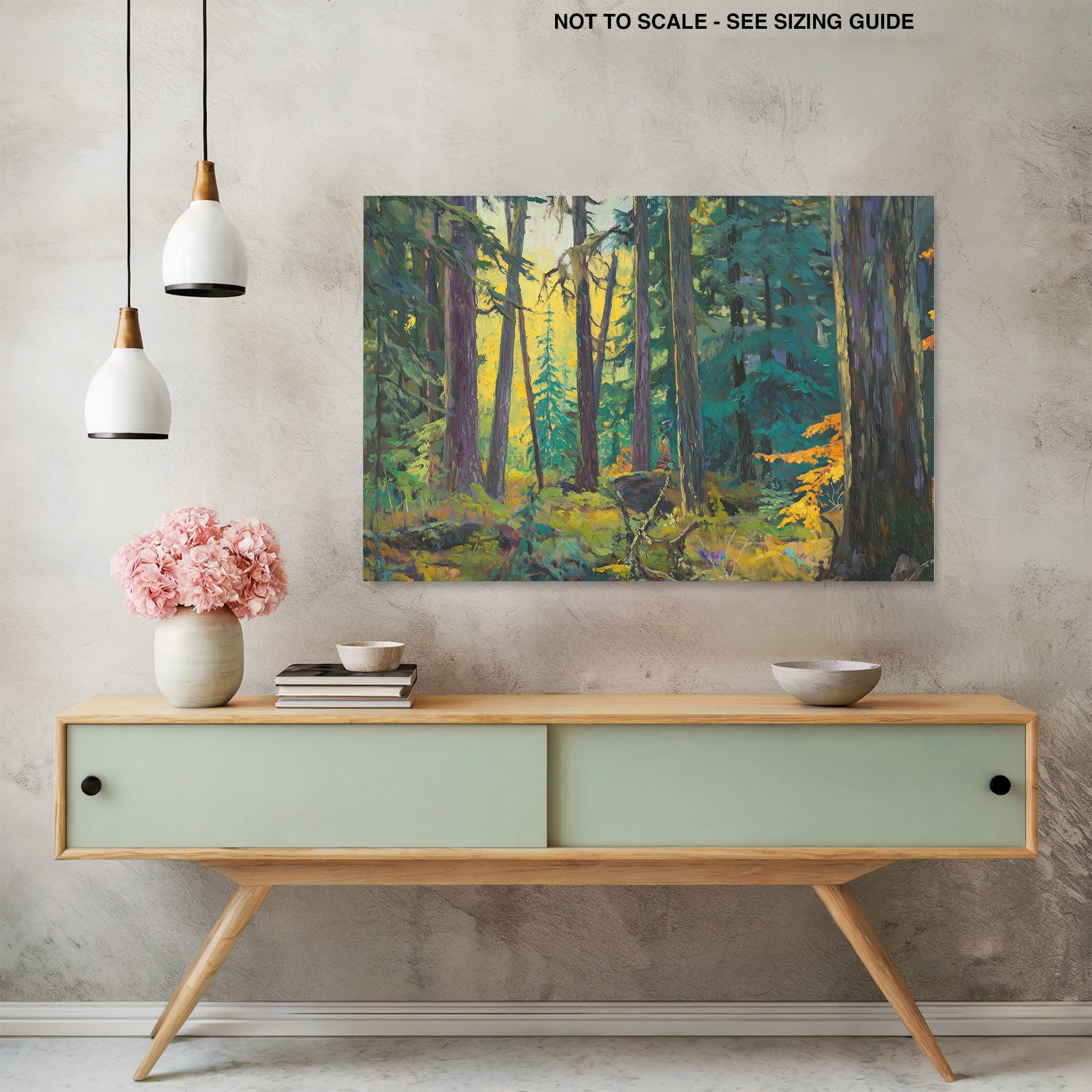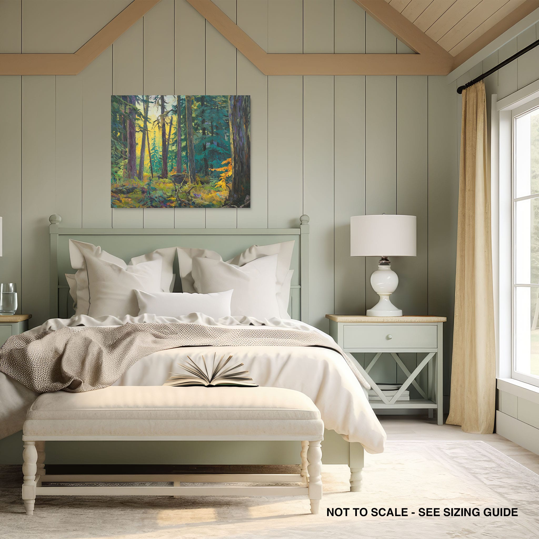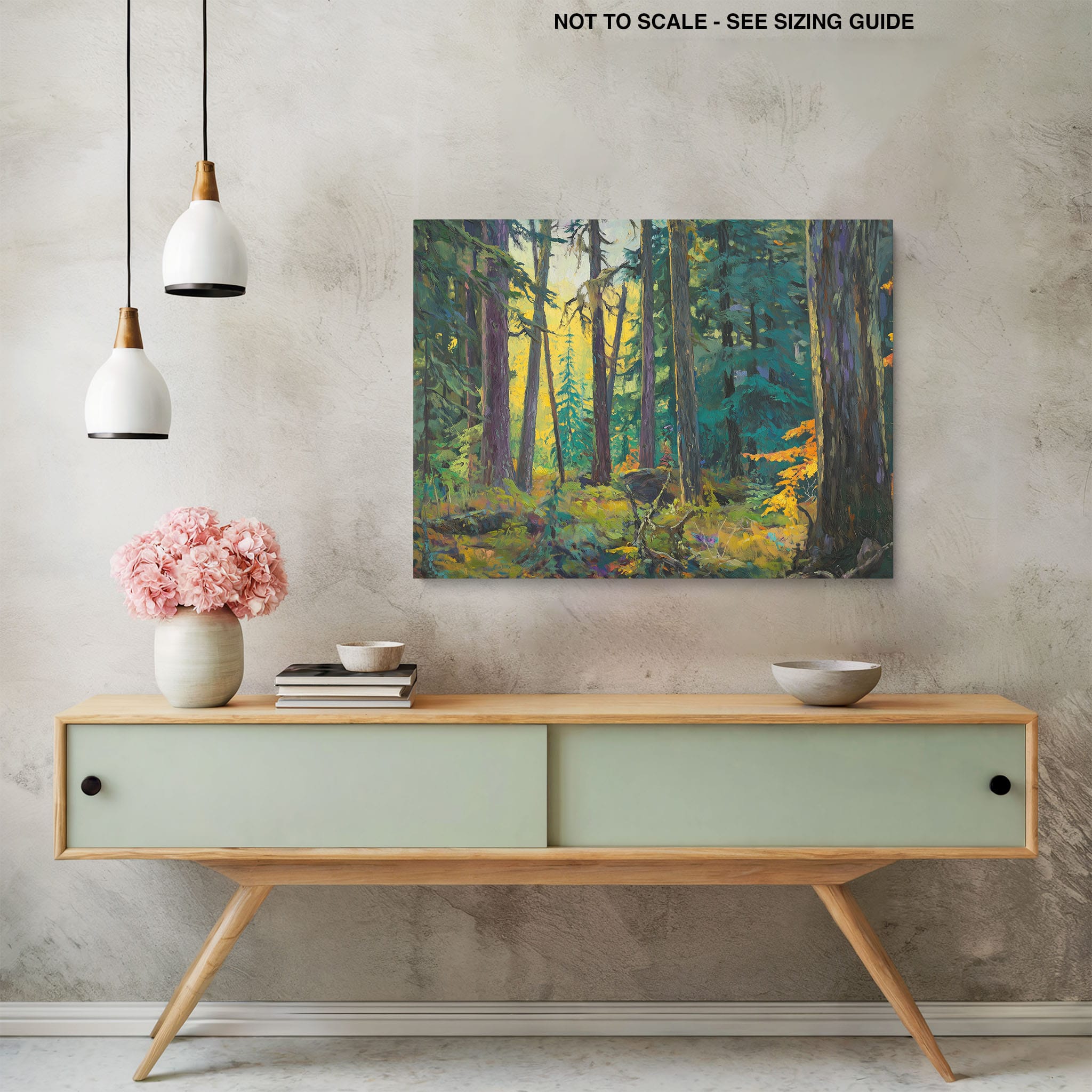 This vibrant painting captures the serene beauty of a densely wooded forest bathed in autumn light. Rich hues of green, yellow, and orange paint a scene that speaks to the soul of nature enthusiasts and art lovers alike. The artwork skillfully employs Impressionism to suggest the fleeting quality of light filtering through the tree canopy, while the Realism style grounds the scene in a palpable sense of place. Perfect for anyone looking to add a touch of natural elegance to their living space, this painting invites viewers to lose themselves in the tranquil depths of the wild forest.