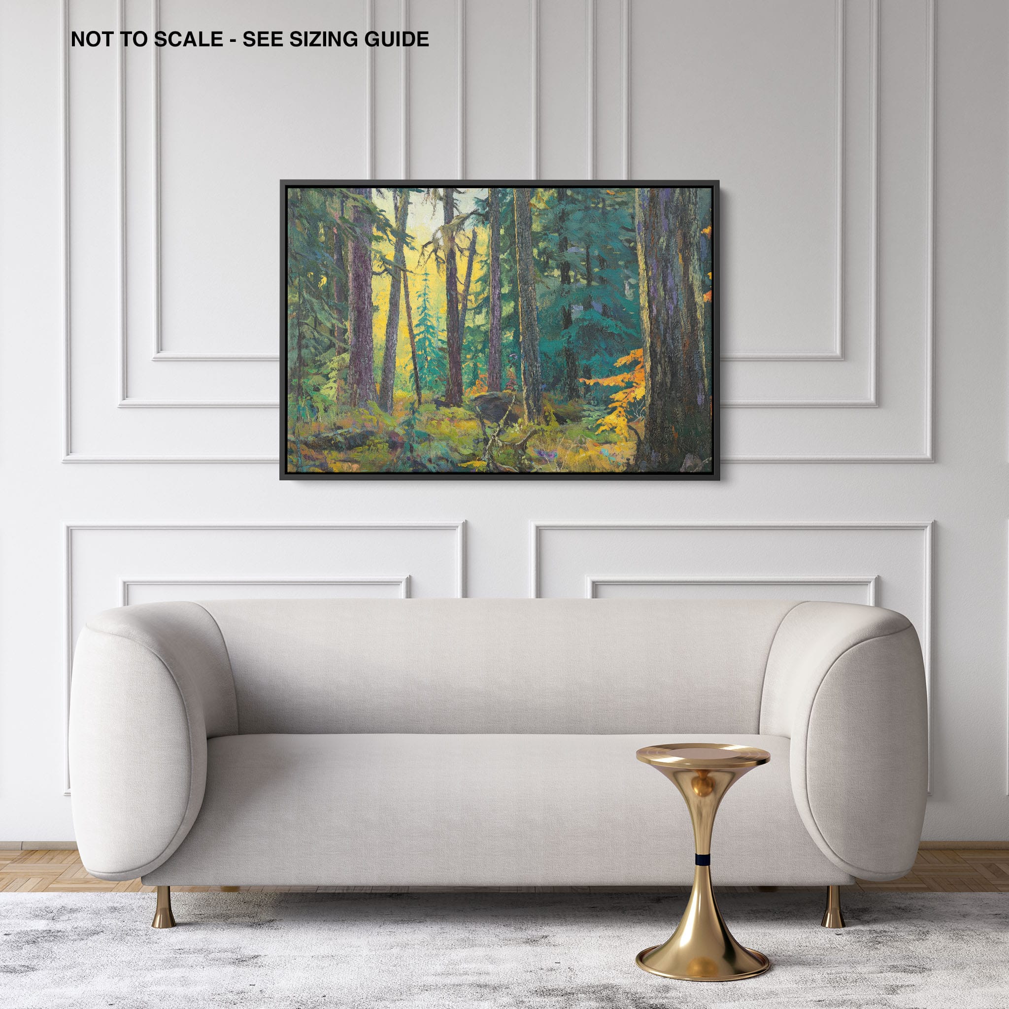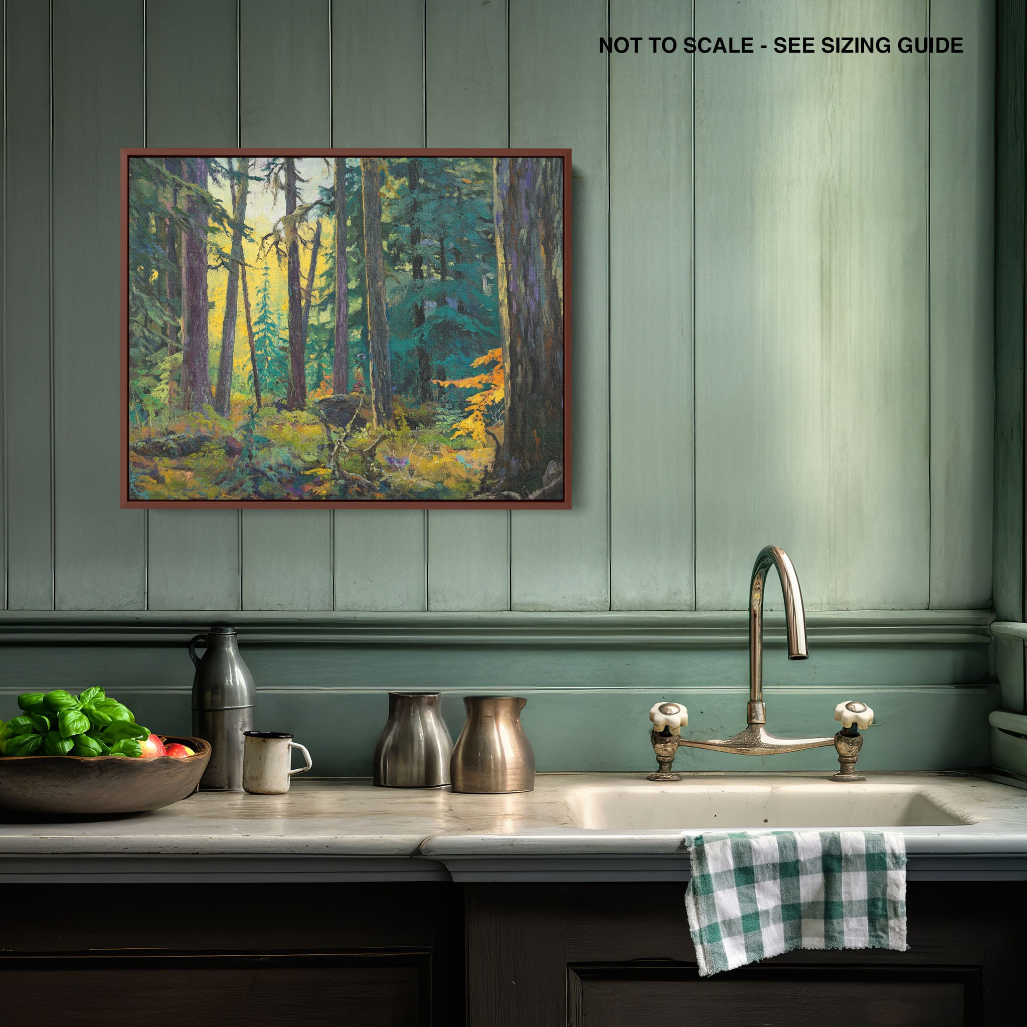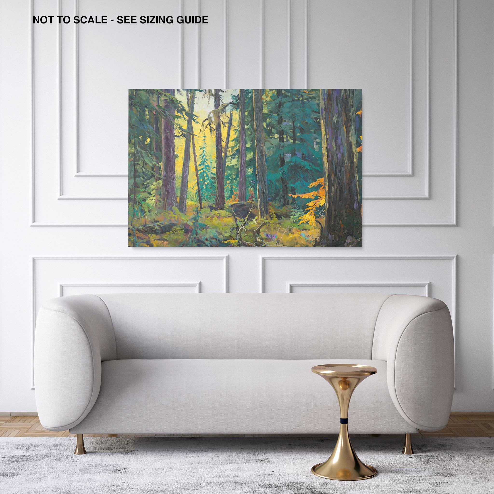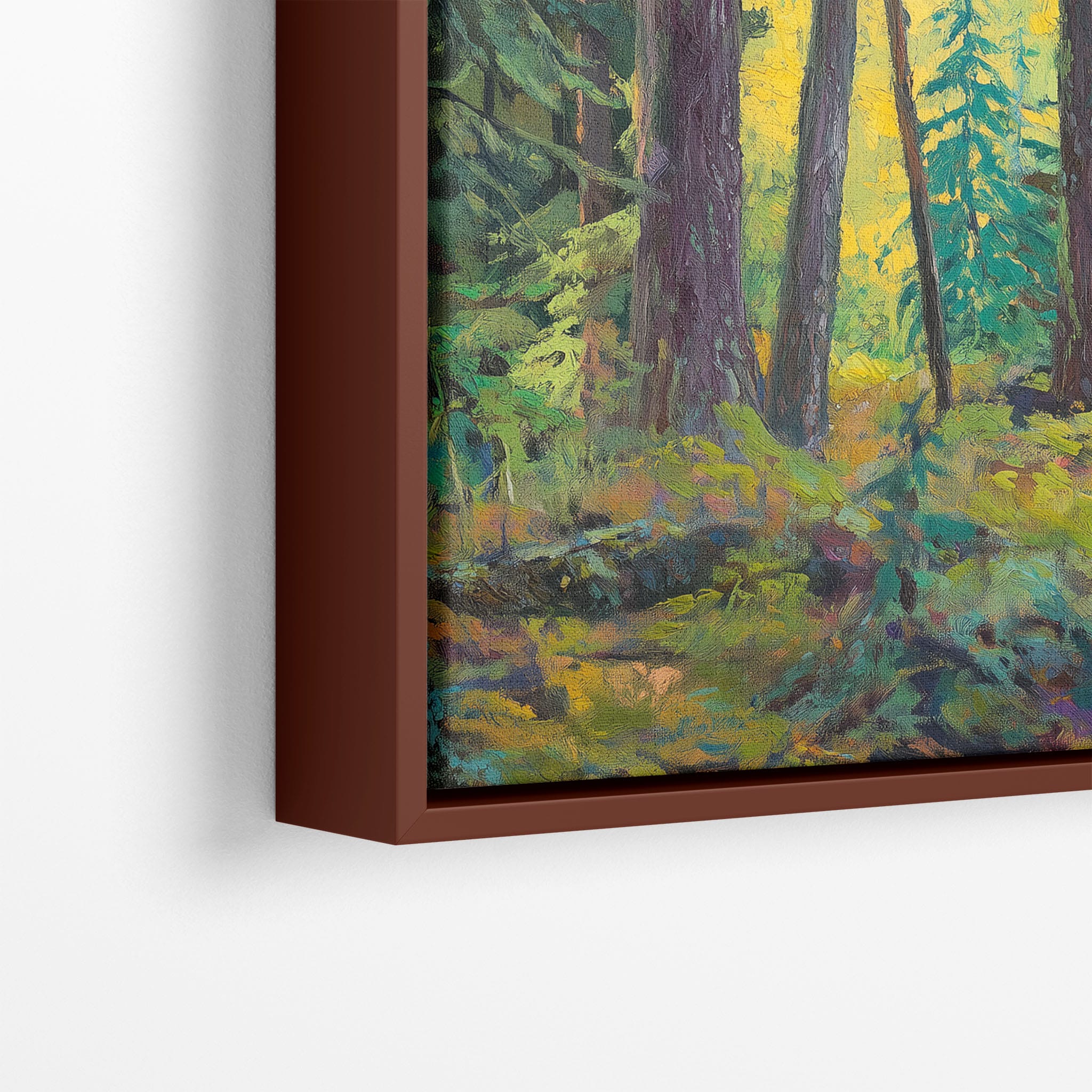 This vibrant painting captures the serene beauty of a densely wooded forest bathed in autumn light. Rich hues of green, yellow, and orange paint a scene that speaks to the soul of nature enthusiasts and art lovers alike. The artwork skillfully employs Impressionism to suggest the fleeting quality of light filtering through the tree canopy, while the Realism style grounds the scene in a palpable sense of place. Perfect for anyone looking to add a touch of natural elegance to their living space, this painting invites viewers to lose themselves in the tranquil depths of the wild forest.