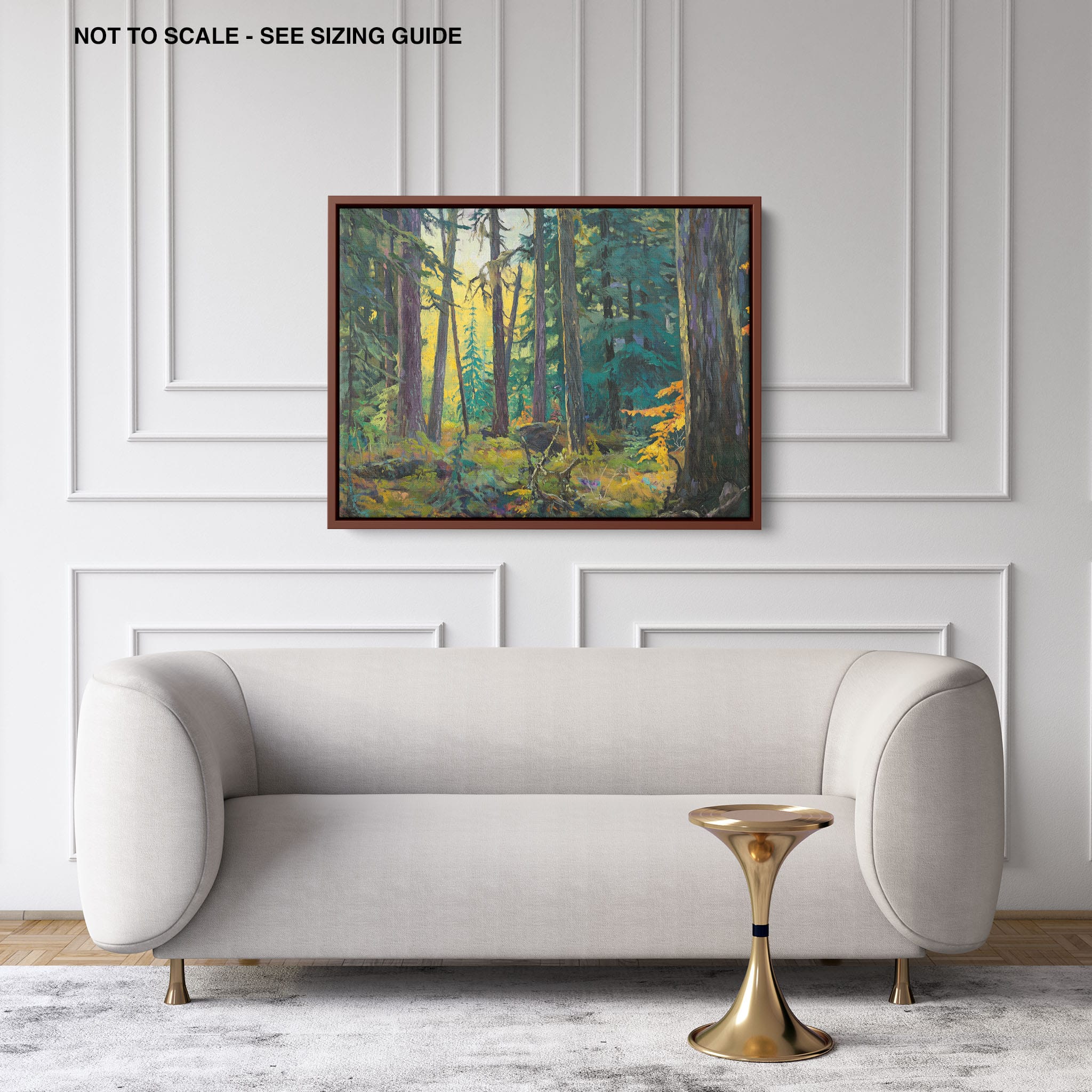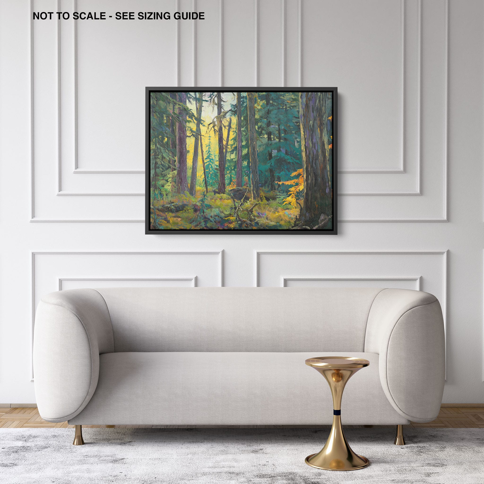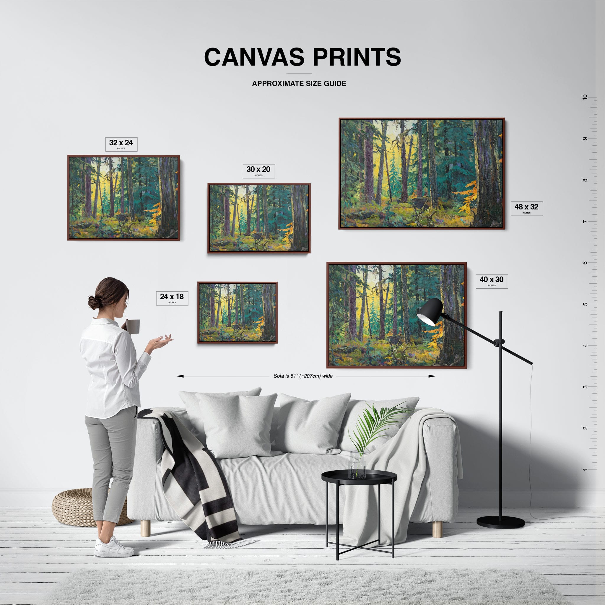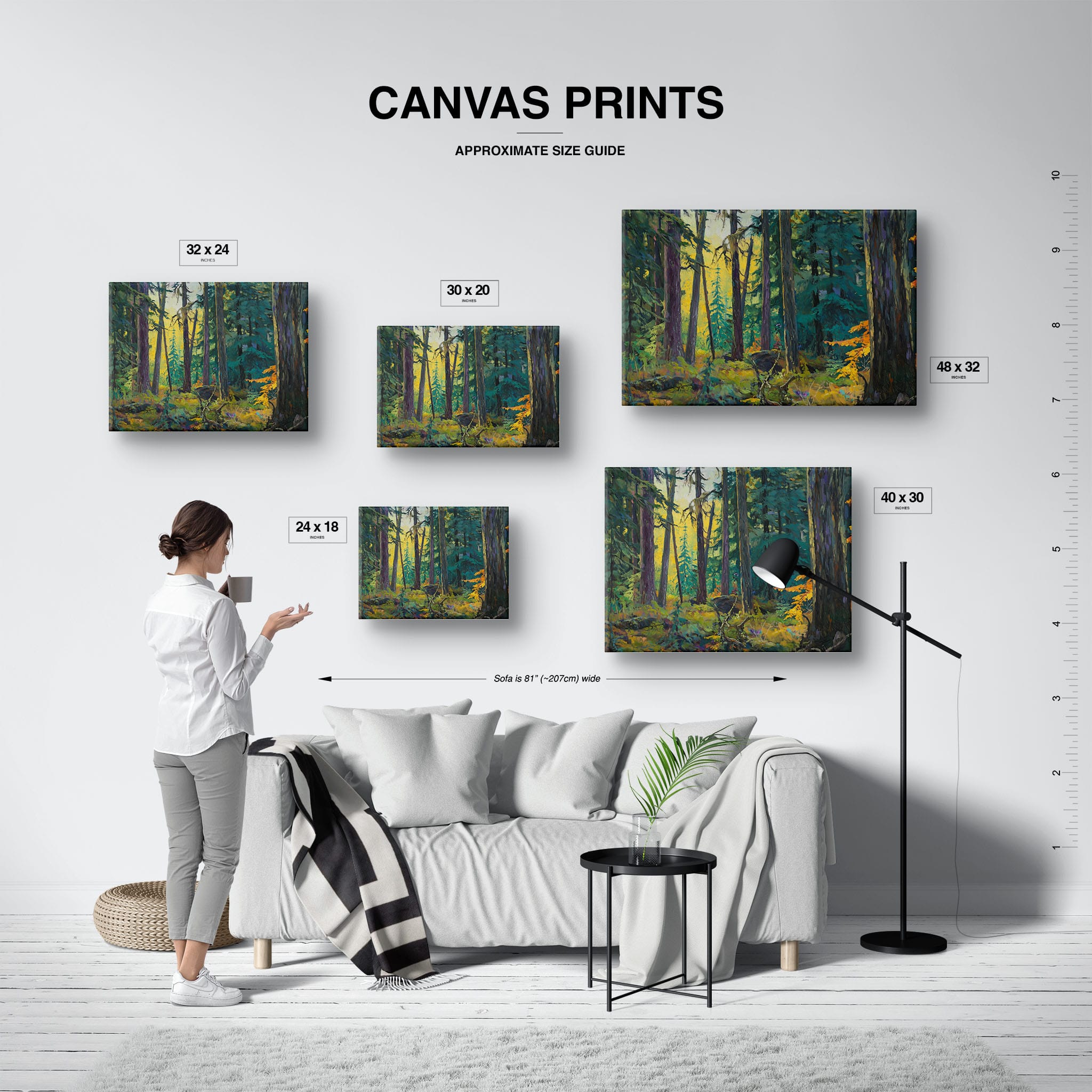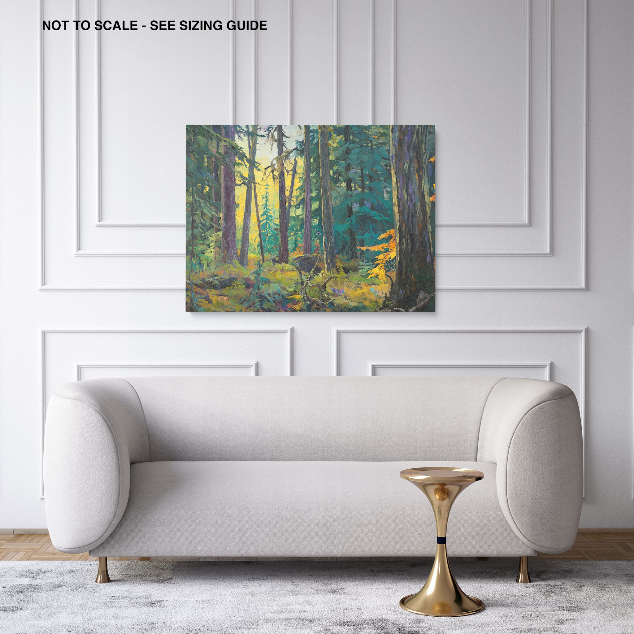 This vibrant painting captures the serene beauty of a densely wooded forest bathed in autumn light. Rich hues of green, yellow, and orange paint a scene that speaks to the soul of nature enthusiasts and art lovers alike. The artwork skillfully employs Impressionism to suggest the fleeting quality of light filtering through the tree canopy, while the Realism style grounds the scene in a palpable sense of place. Perfect for anyone looking to add a touch of natural elegance to their living space, this painting invites viewers to lose themselves in the tranquil depths of the wild forest.
