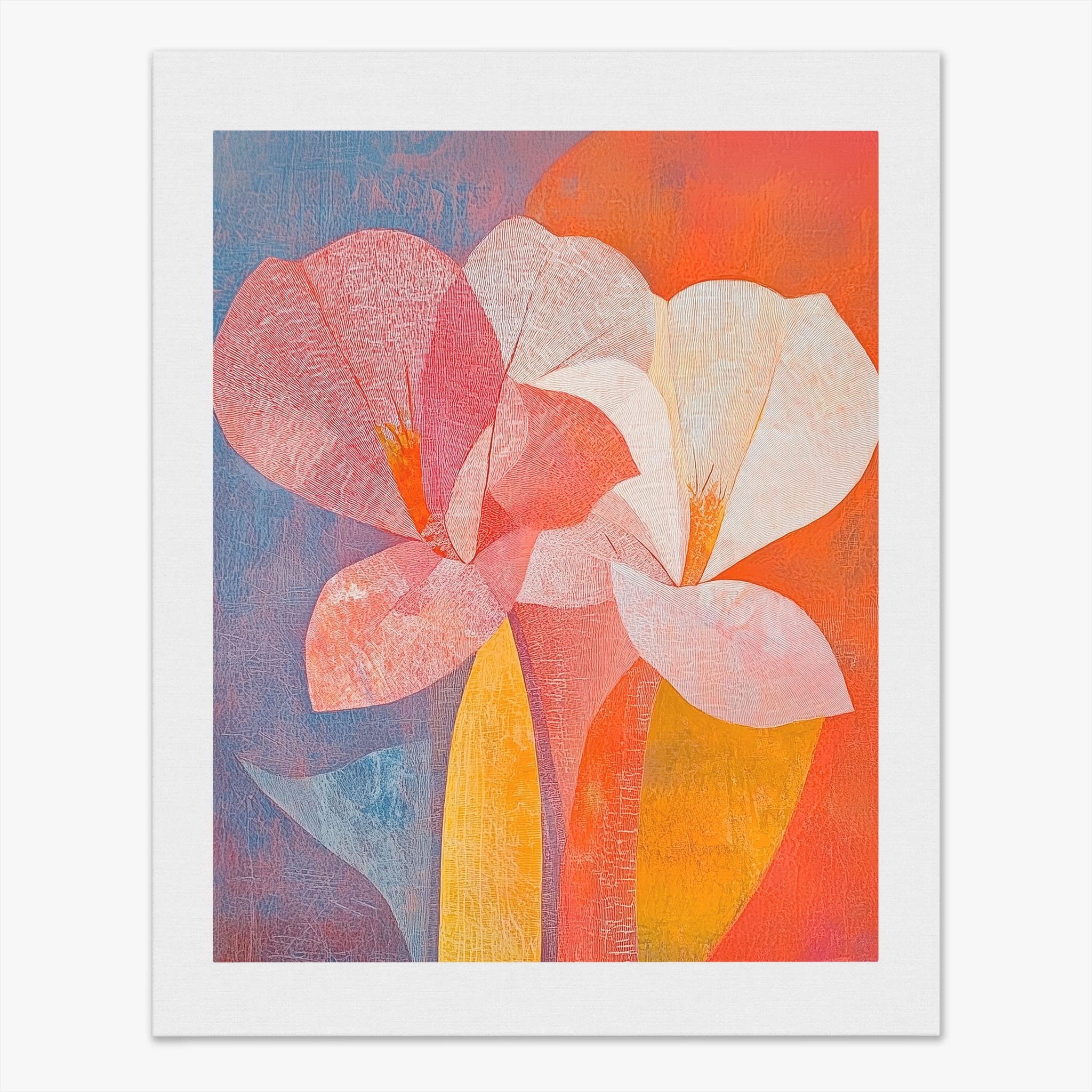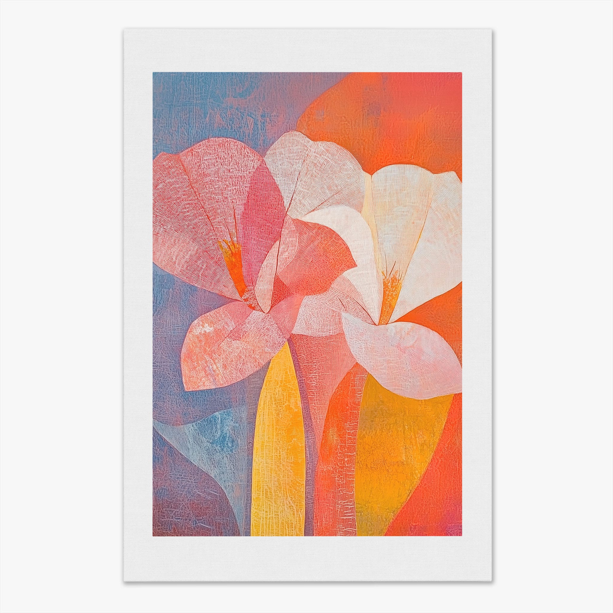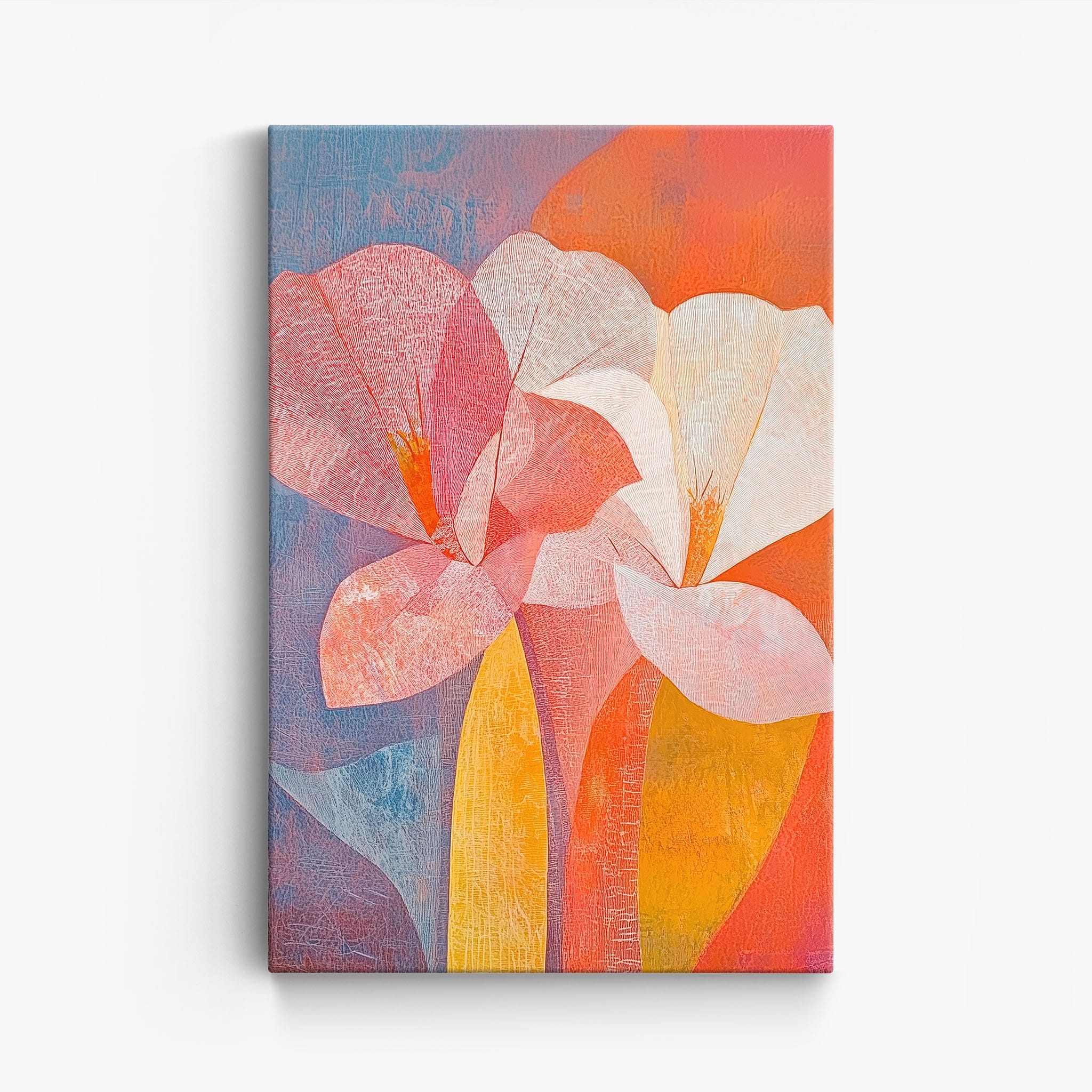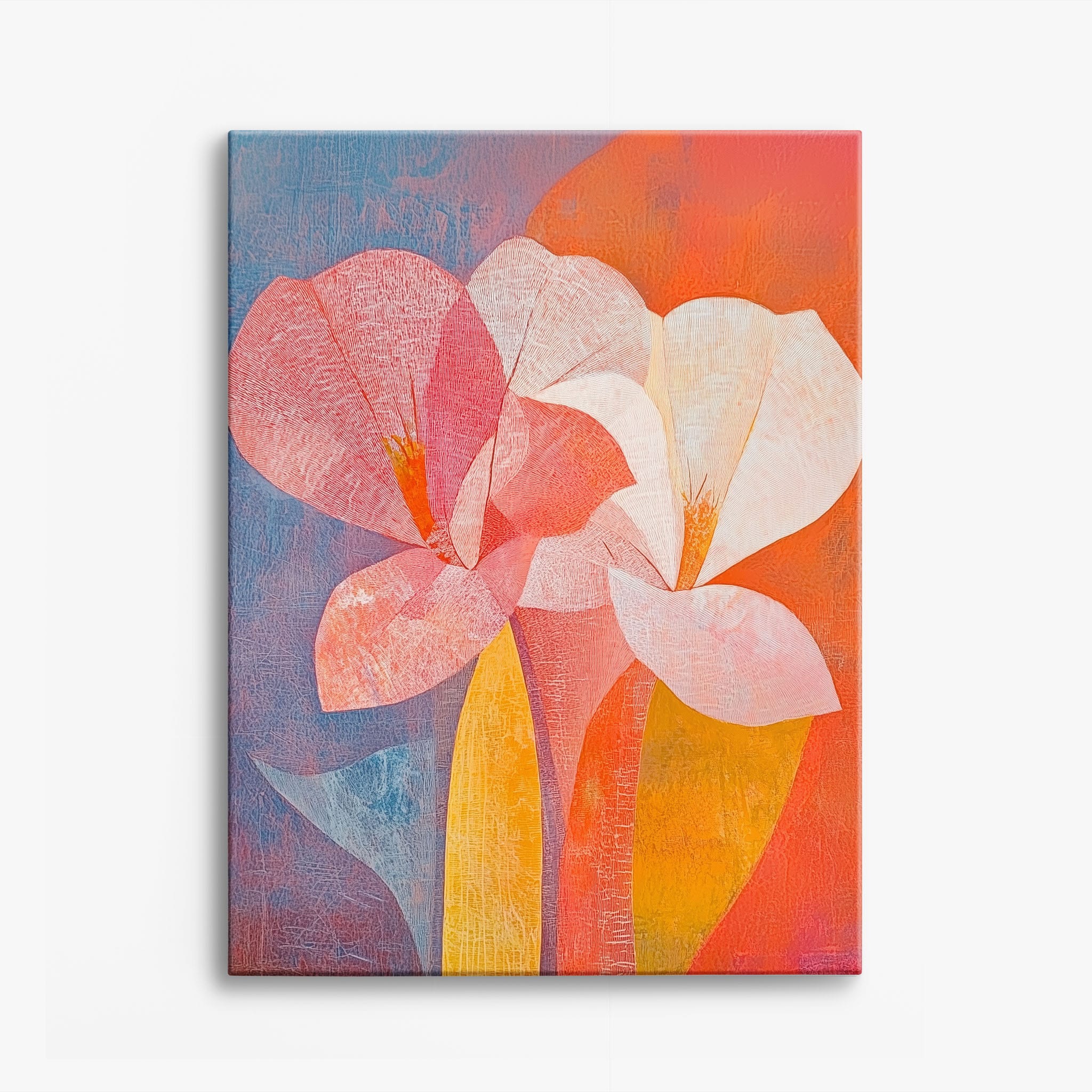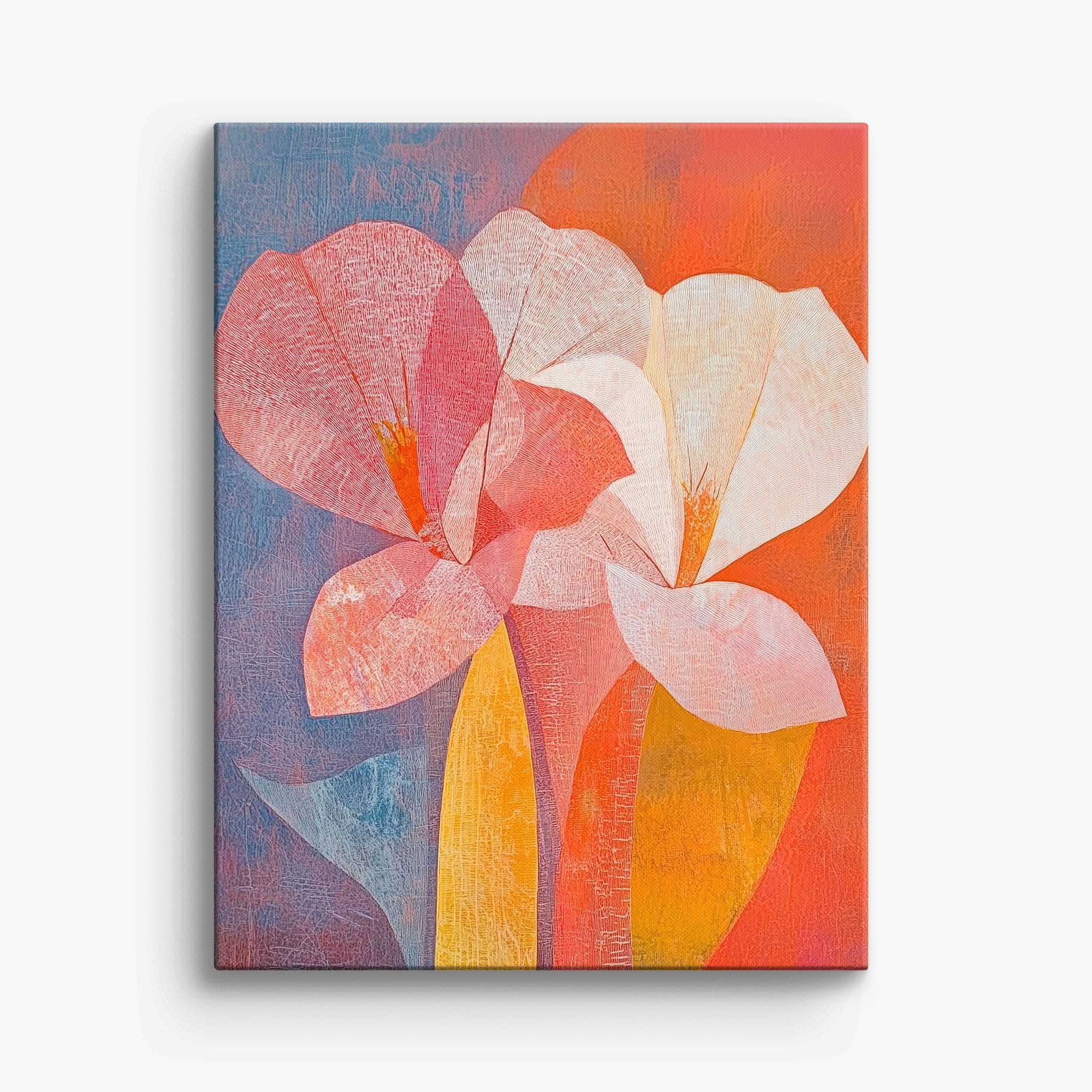 This vibrant abstract painting captures the essence of a blossoming flower through bold and soothing color transitions. With an expressionist touch, the artist masterfully layers orange, pink, and blue hues to evoke a sense of growth and warmth. The visible brush strokes and textural depth draw viewers into a modern interpretation of nature's simple beauty. Perfect for adding a touch of sophistication and color to any room, this artwork appeals to those who appreciate a contemporary perspective on botanical themes. Add this piece to your space for an immediate artistic uplift.