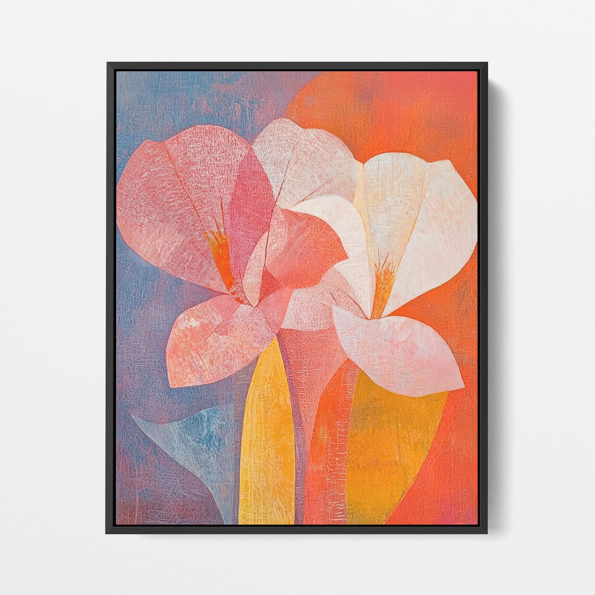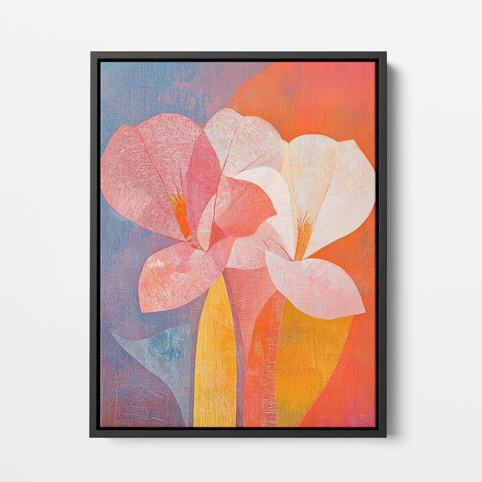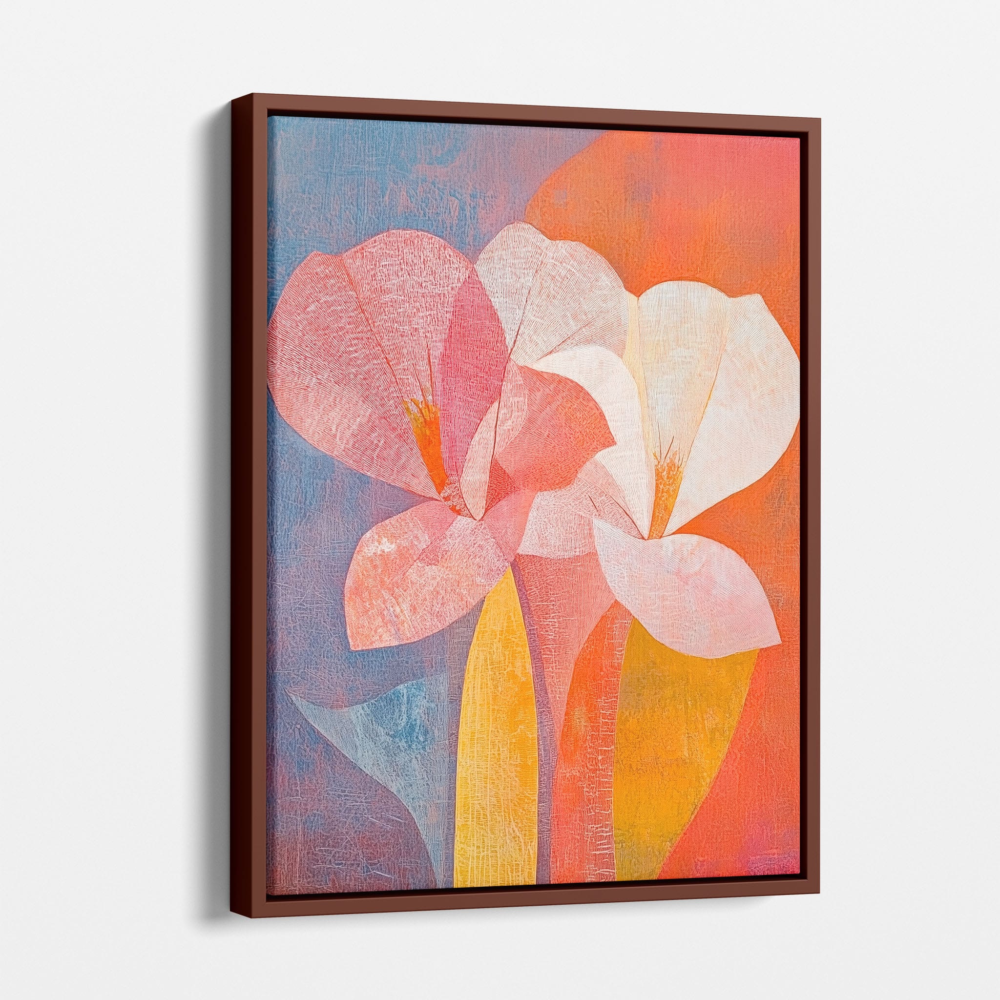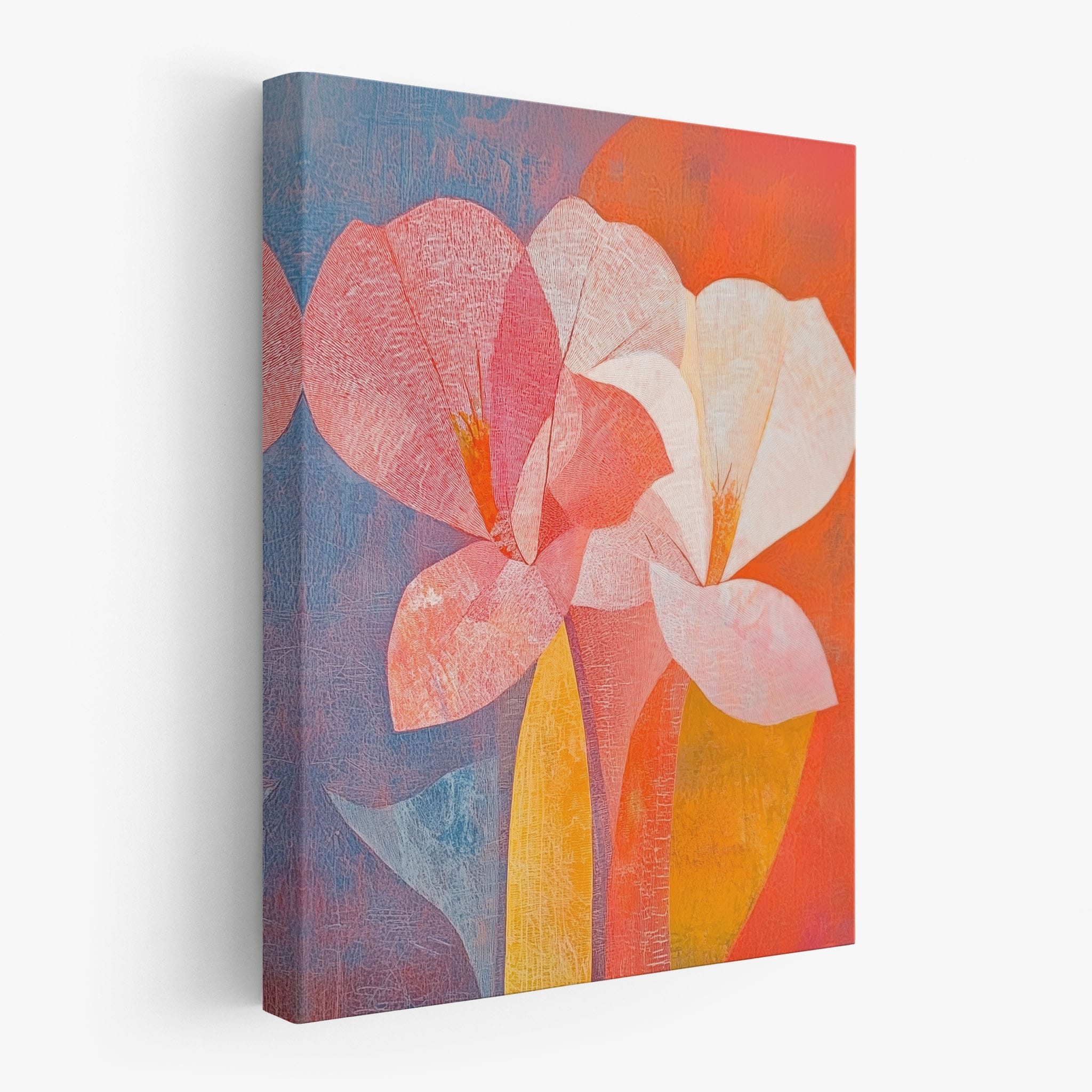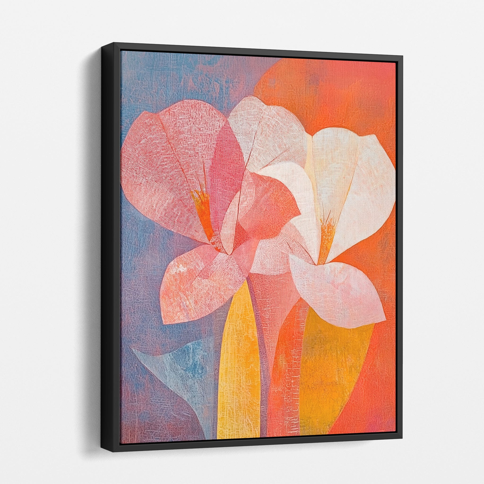 This vibrant abstract painting captures the essence of a blossoming flower through bold and soothing color transitions. With an expressionist touch, the artist masterfully layers orange, pink, and blue hues to evoke a sense of growth and warmth. The visible brush strokes and textural depth draw viewers into a modern interpretation of nature's simple beauty. Perfect for adding a touch of sophistication and color to any room, this artwork appeals to those who appreciate a contemporary perspective on botanical themes. Add this piece to your space for an immediate artistic uplift.