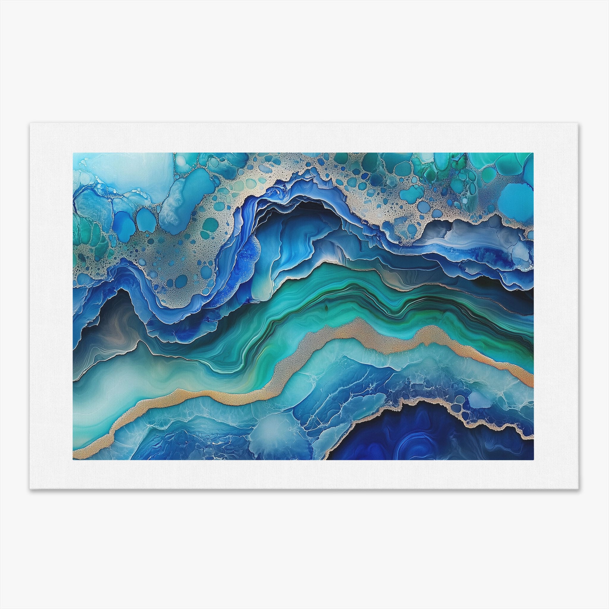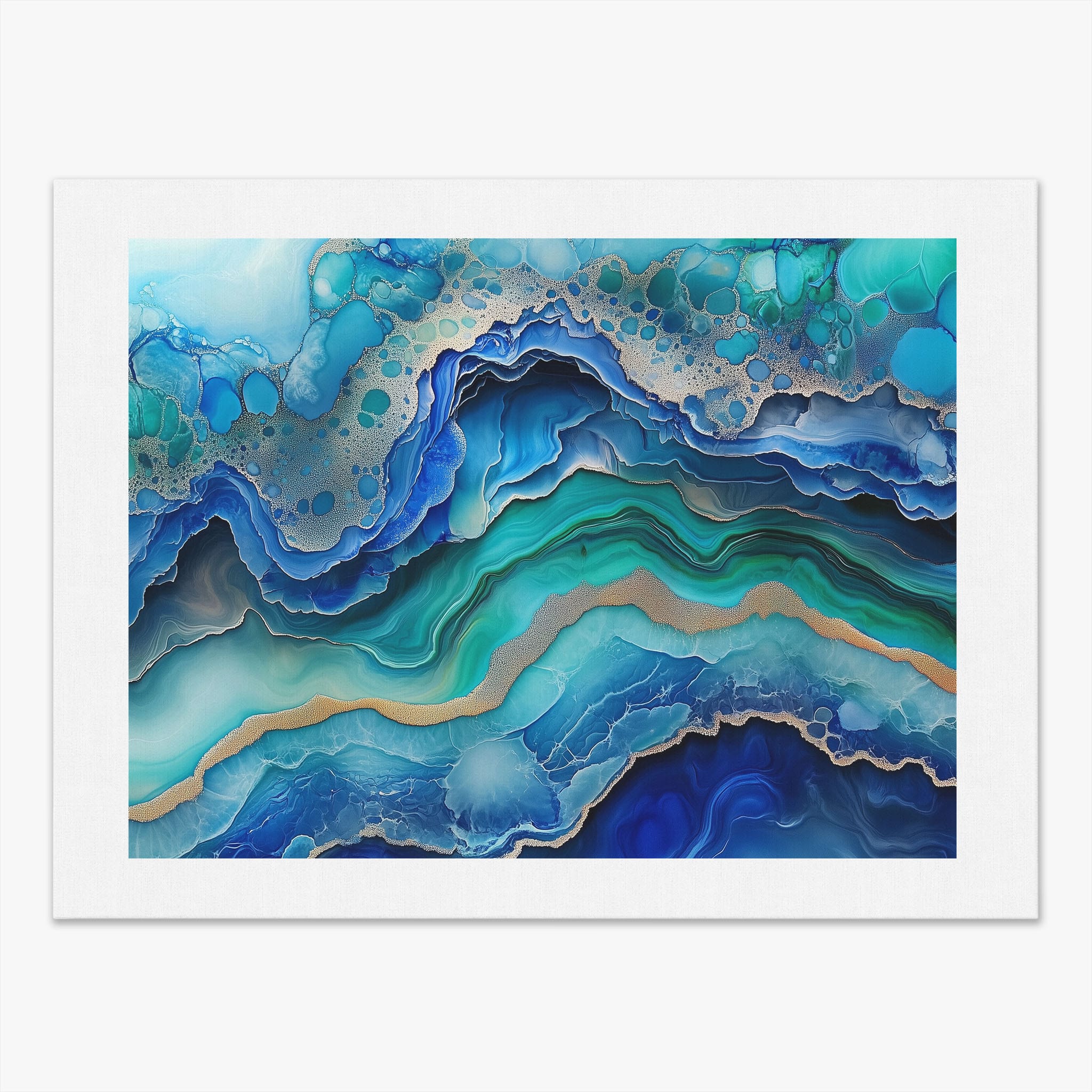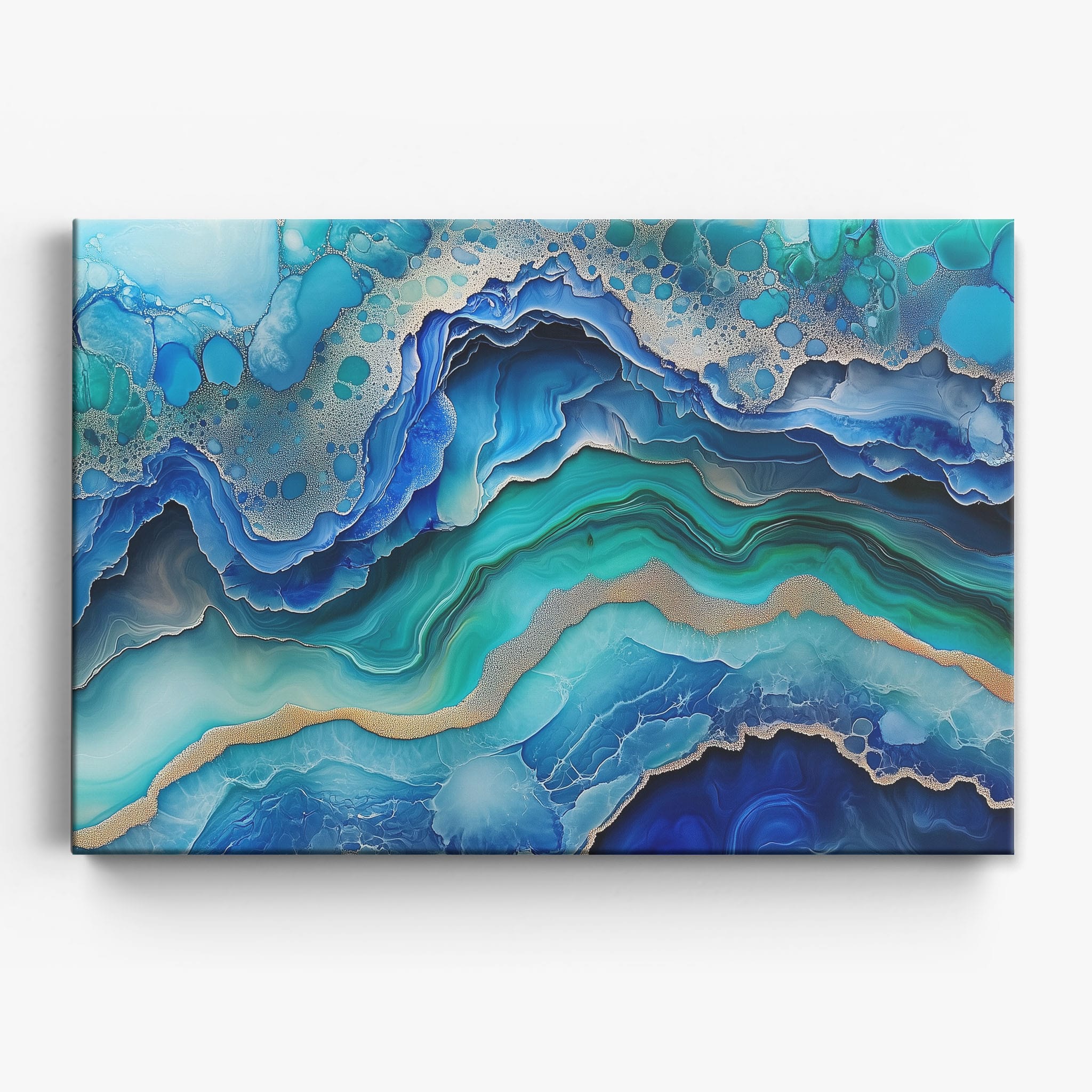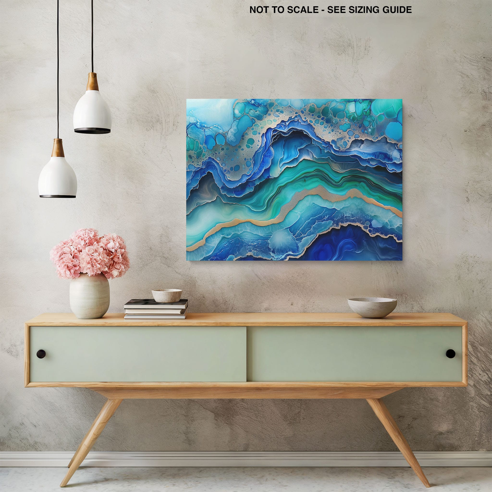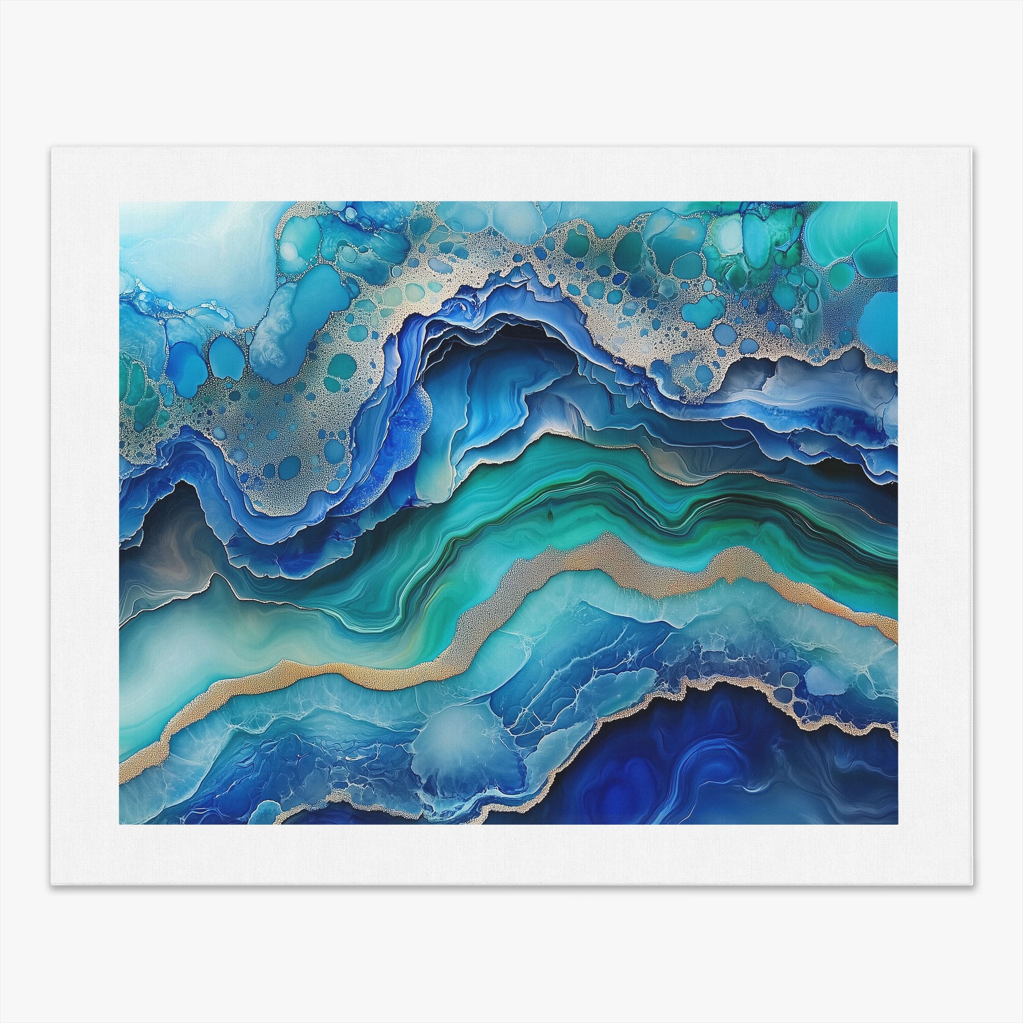 This stunning digital illustration invites the viewer into a deep, mesmerizing exploration of abstract and surreal forms reminiscent of layered ocean waves. Interplaying shades of blue and aquamarine meld with sand-like textures, evoking a serene yet dynamic seascape that captivates and soothes. This piece is perfect for adding a touch of tranquility and artistic flair to any modern decor. Captured through the finesse of digital art, it brings a contemporary edge to any space. Ideal for those looking to enhance their surroundings with a jewel-toned visual feast.
