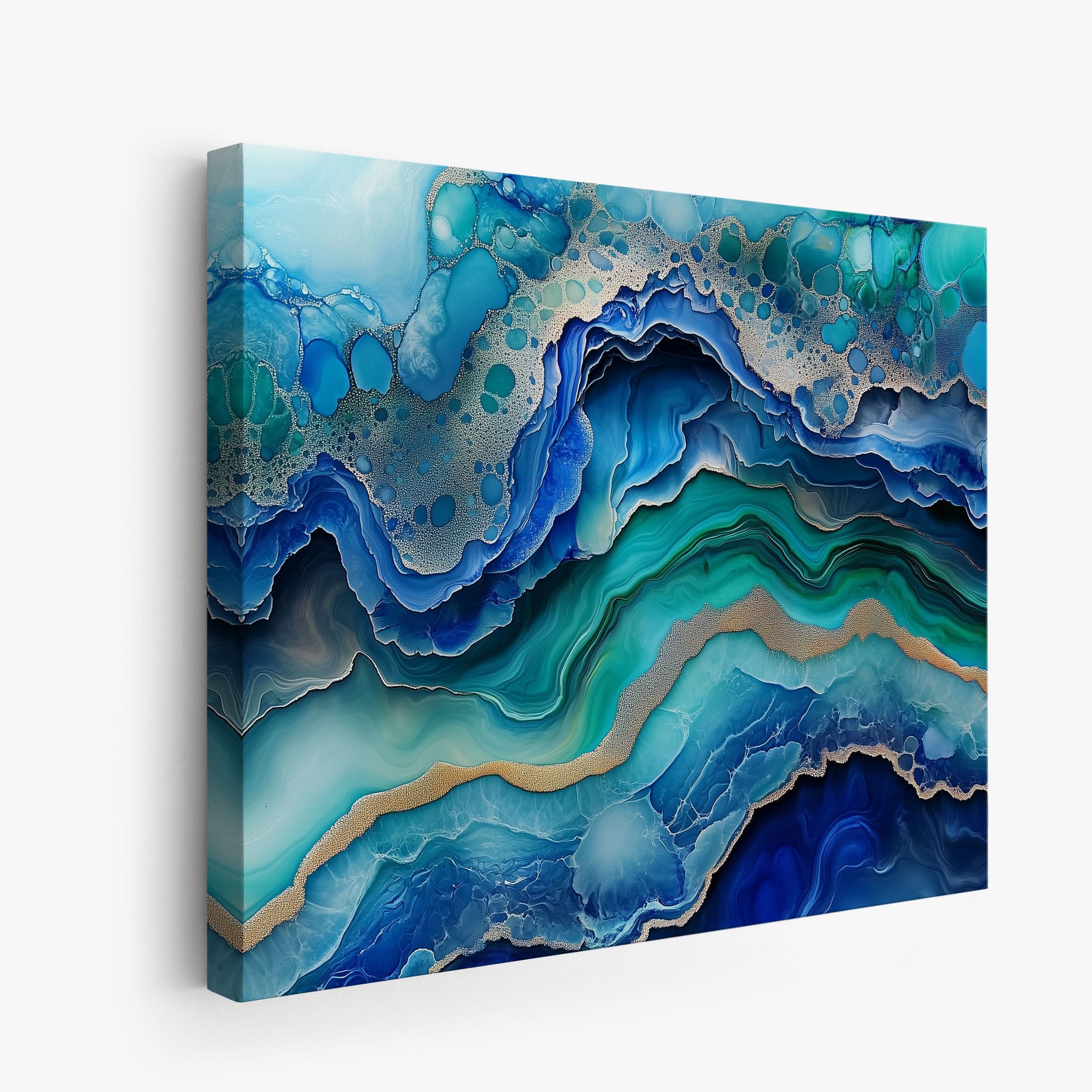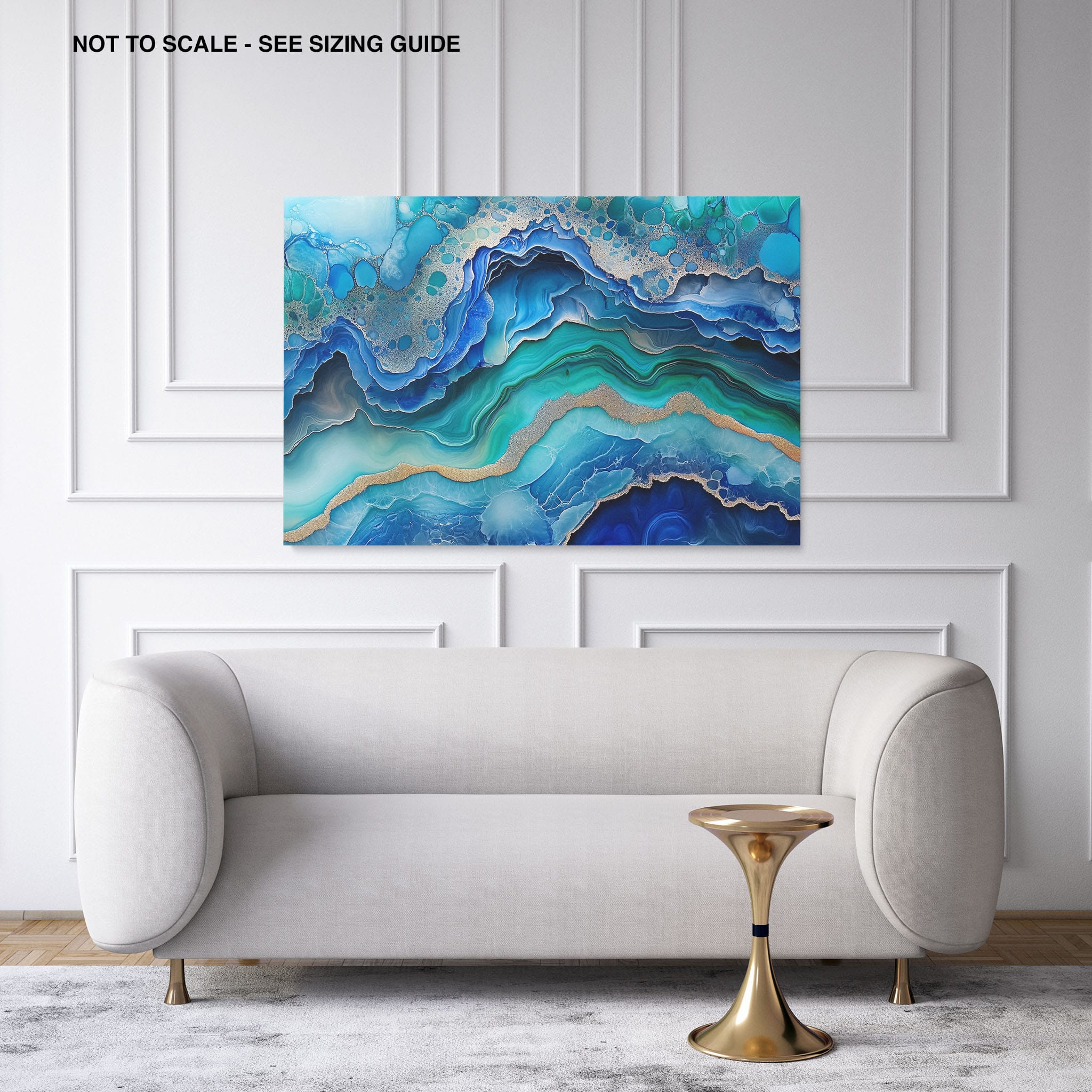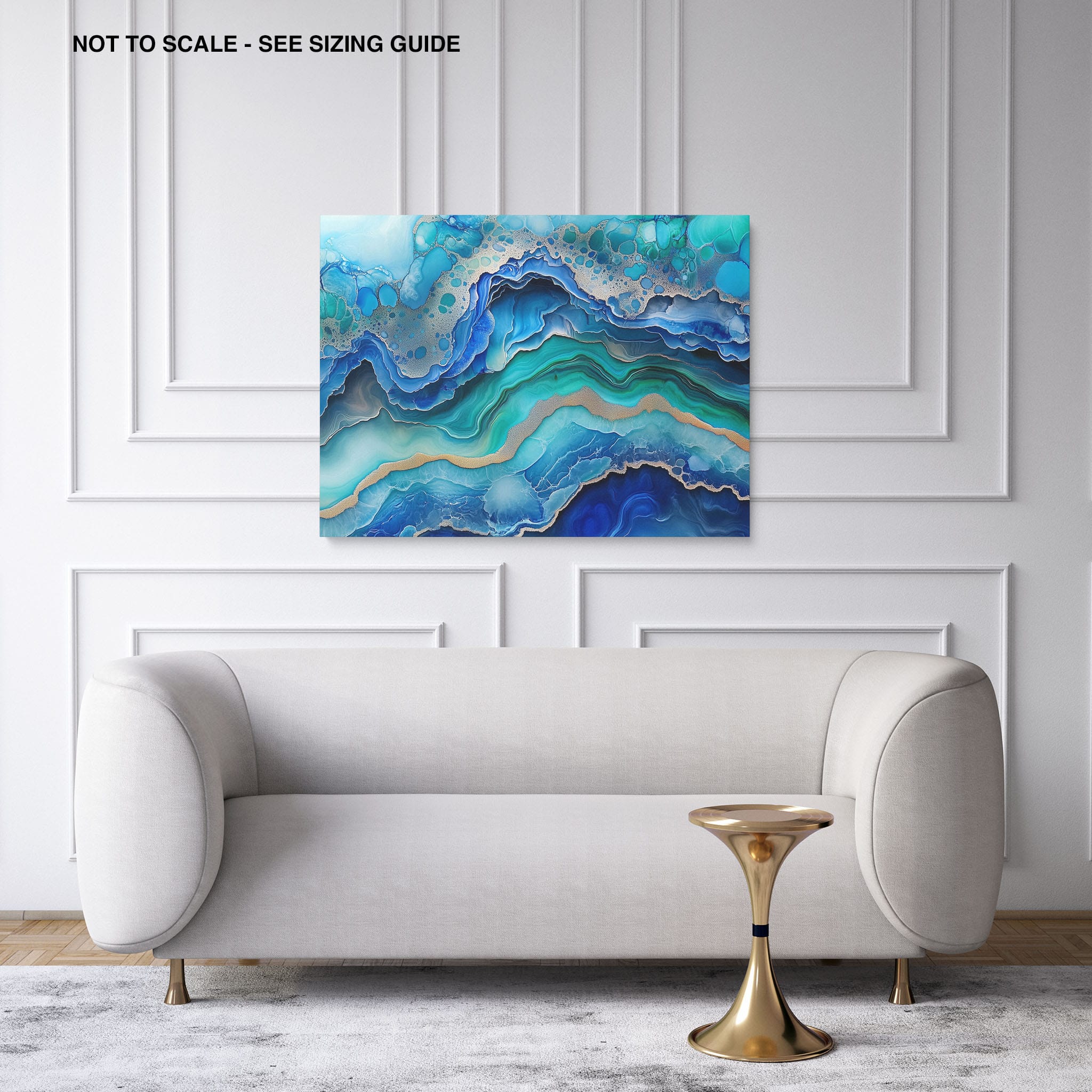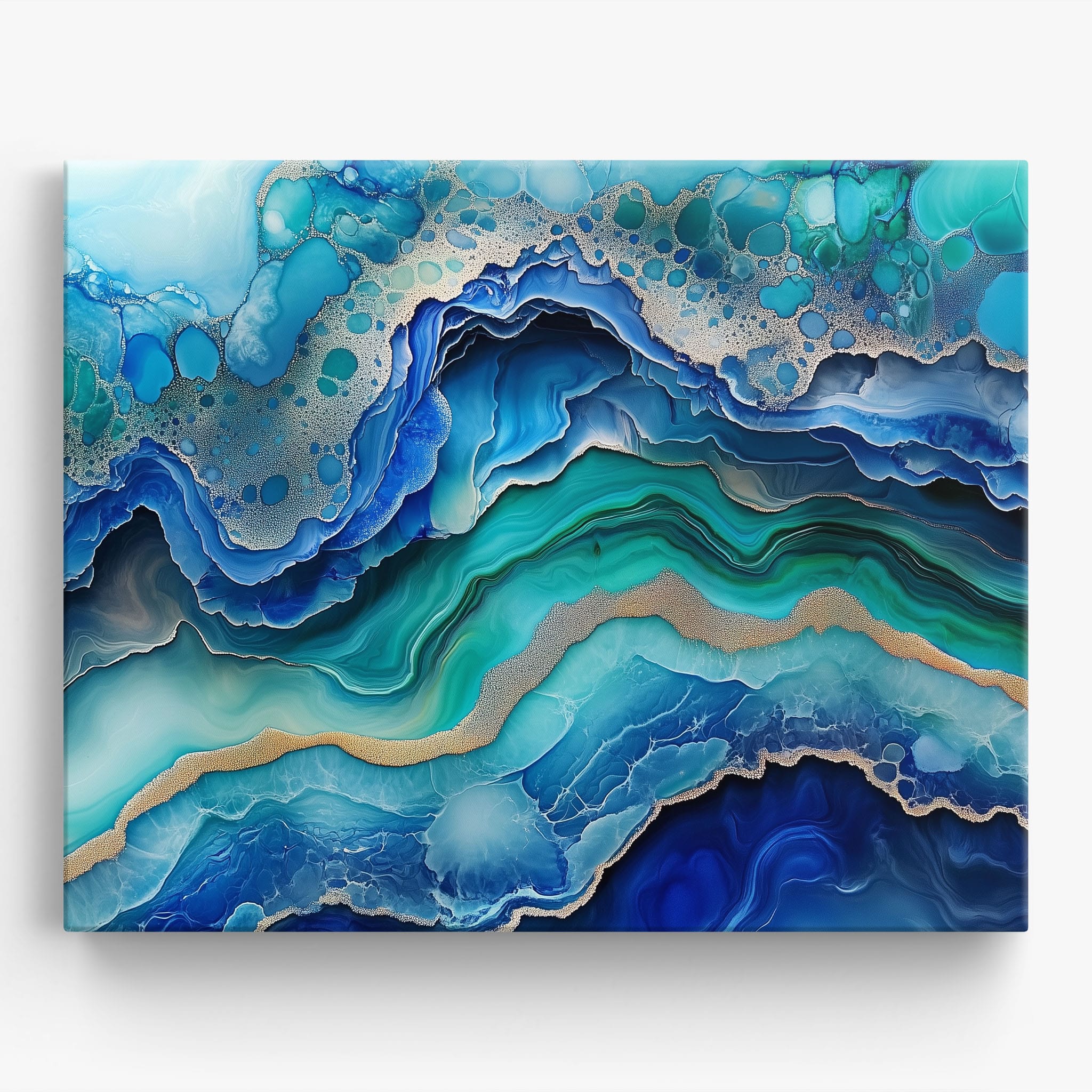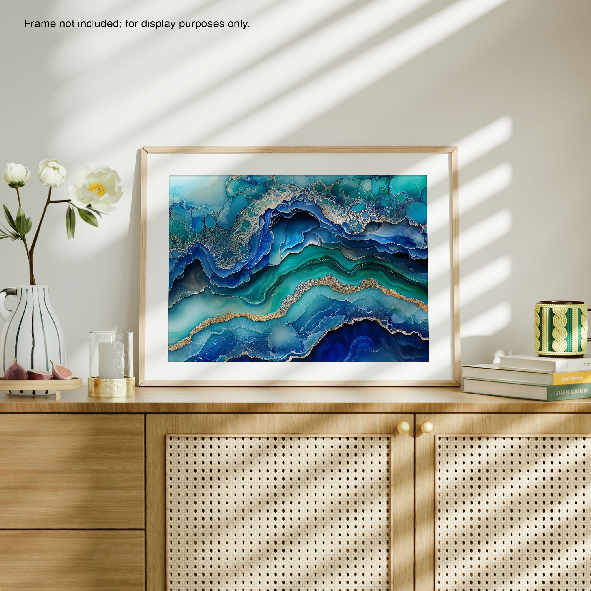 This stunning digital illustration invites the viewer into a deep, mesmerizing exploration of abstract and surreal forms reminiscent of layered ocean waves. Interplaying shades of blue and aquamarine meld with sand-like textures, evoking a serene yet dynamic seascape that captivates and soothes. This piece is perfect for adding a touch of tranquility and artistic flair to any modern decor. Captured through the finesse of digital art, it brings a contemporary edge to any space. Ideal for those looking to enhance their surroundings with a jewel-toned visual feast.