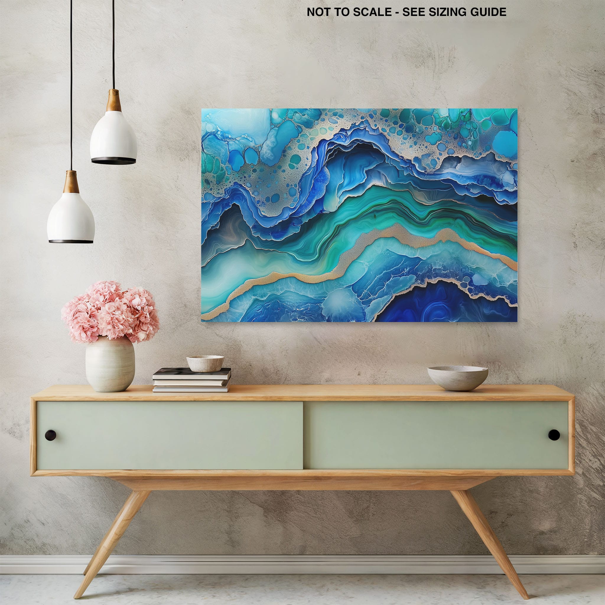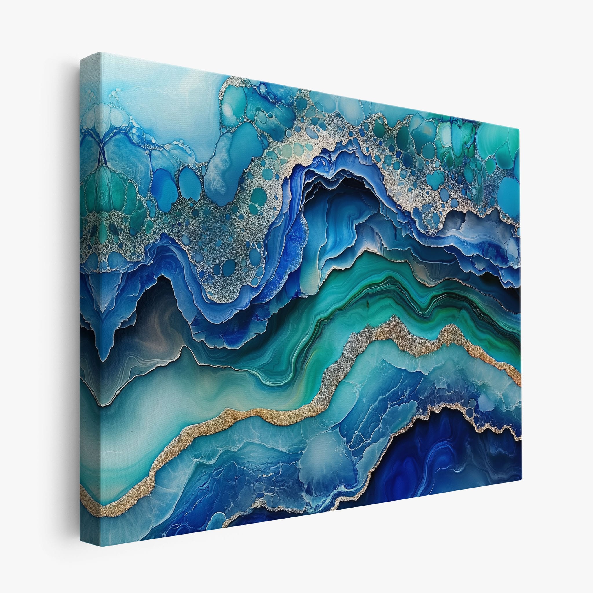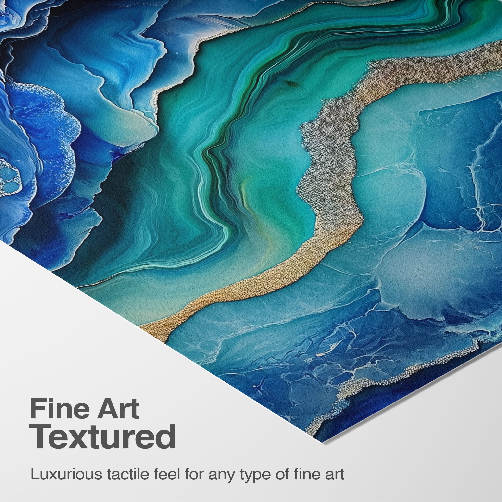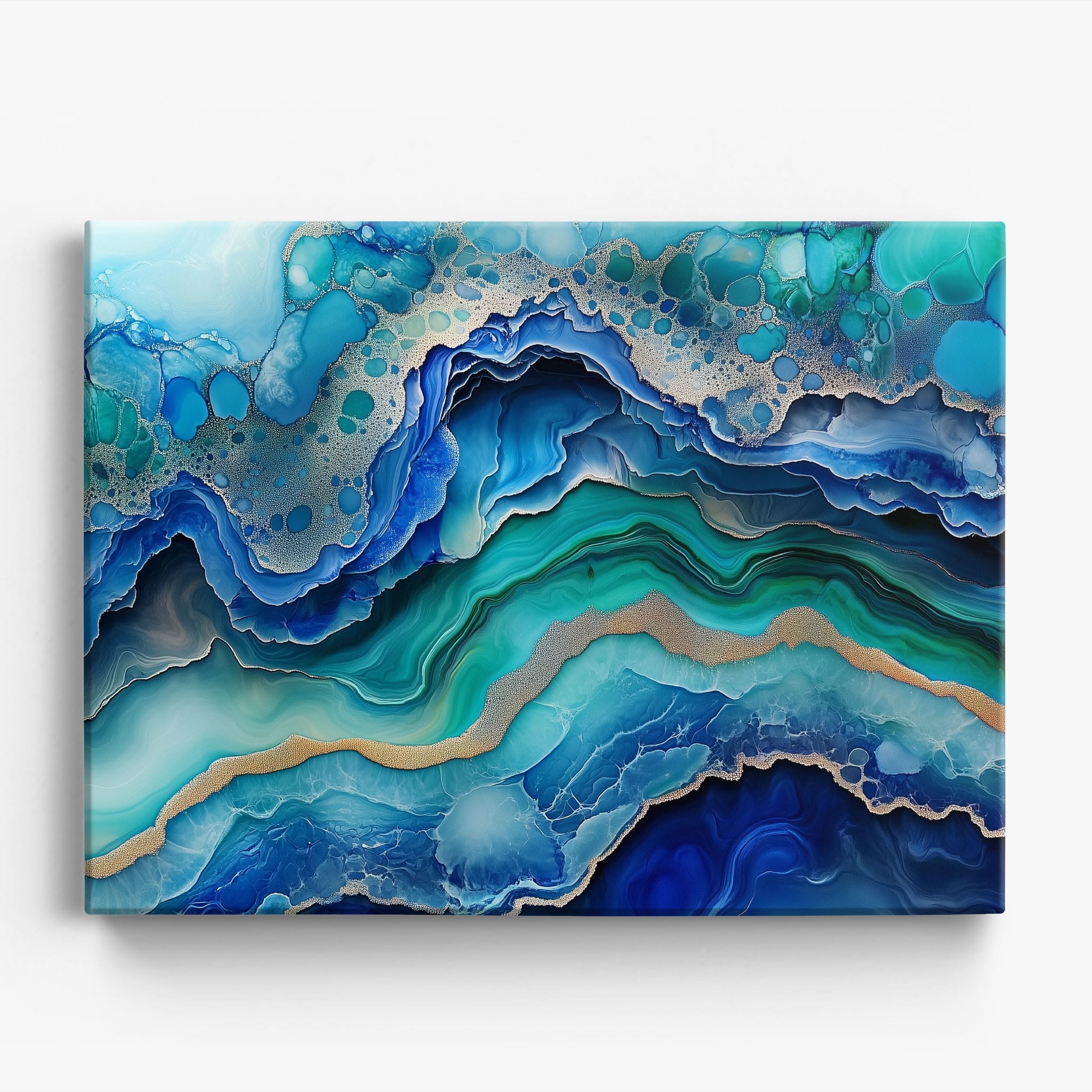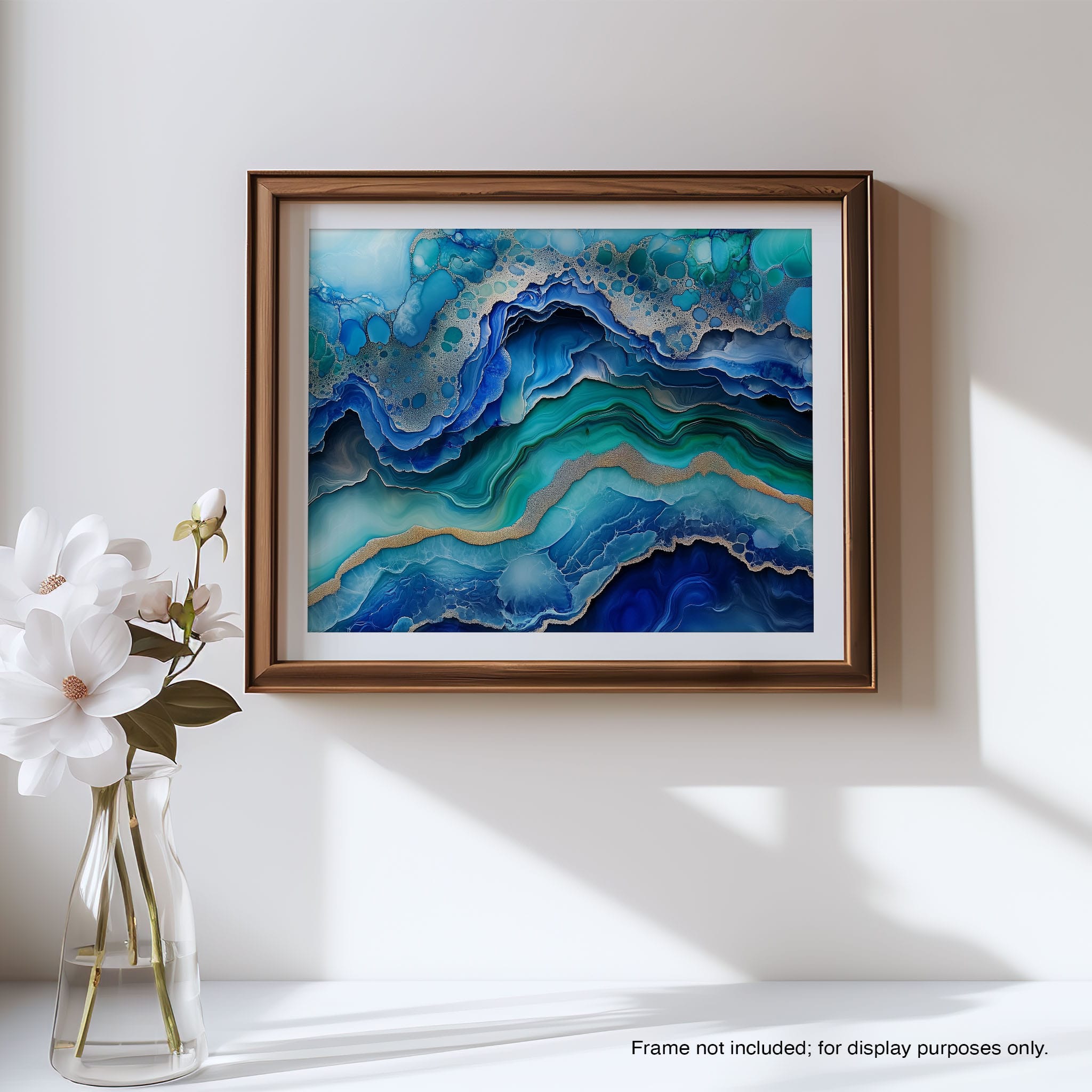 This stunning digital illustration invites the viewer into a deep, mesmerizing exploration of abstract and surreal forms reminiscent of layered ocean waves. Interplaying shades of blue and aquamarine meld with sand-like textures, evoking a serene yet dynamic seascape that captivates and soothes. This piece is perfect for adding a touch of tranquility and artistic flair to any modern decor. Captured through the finesse of digital art, it brings a contemporary edge to any space. Ideal for those looking to enhance their surroundings with a jewel-toned visual feast.