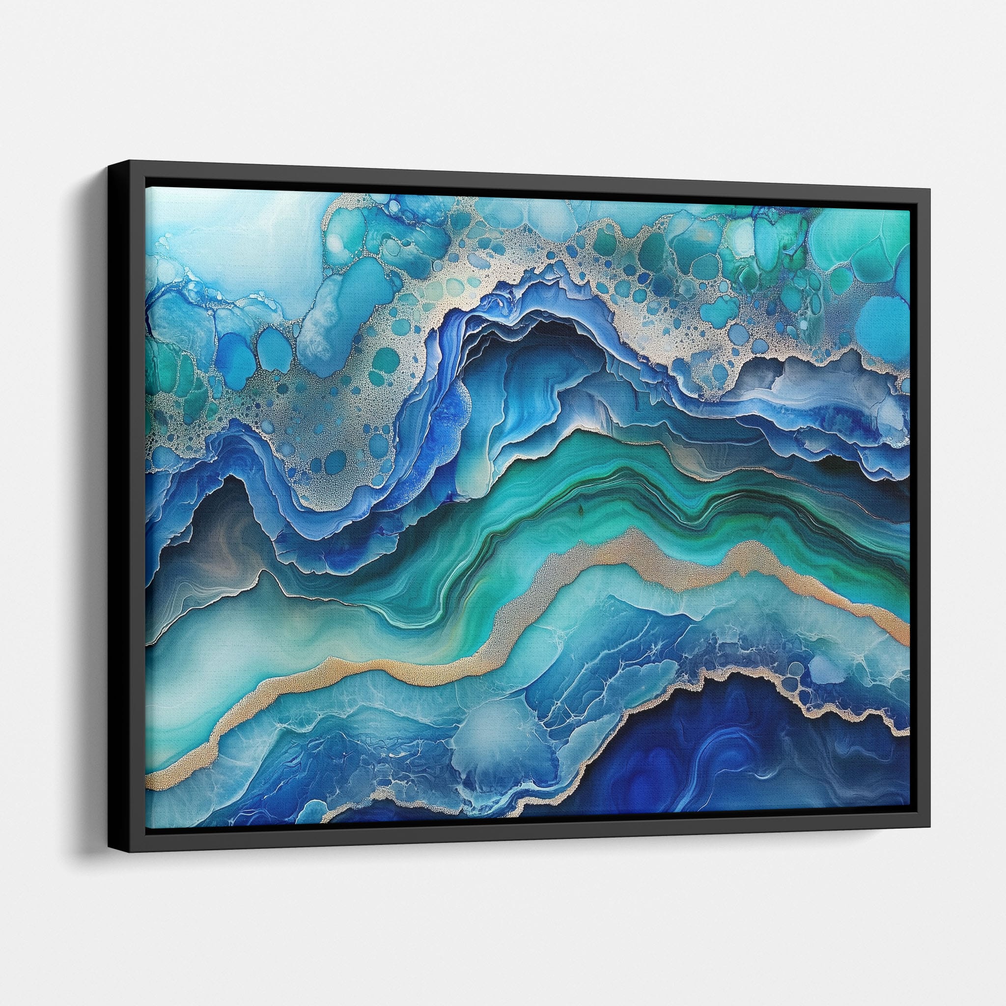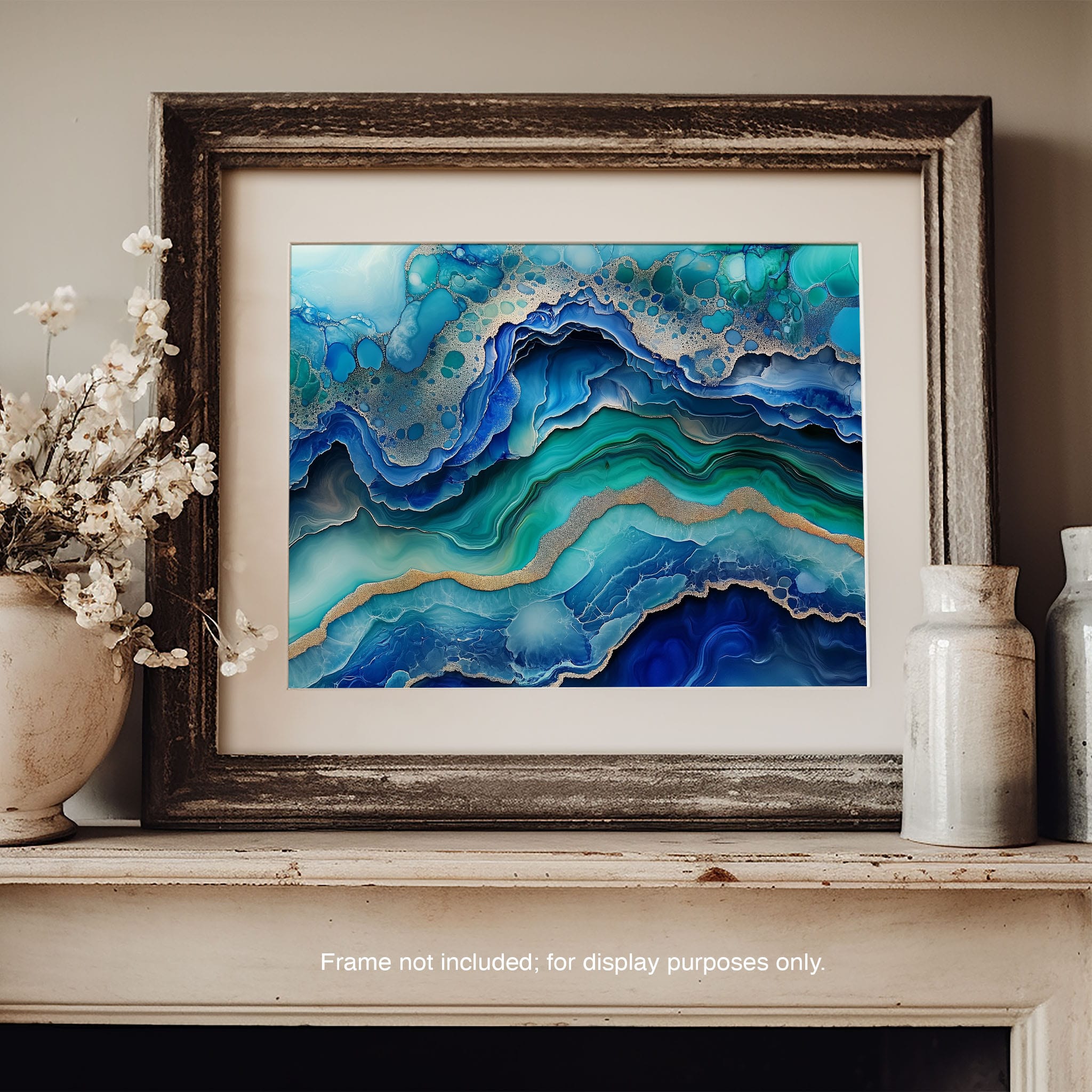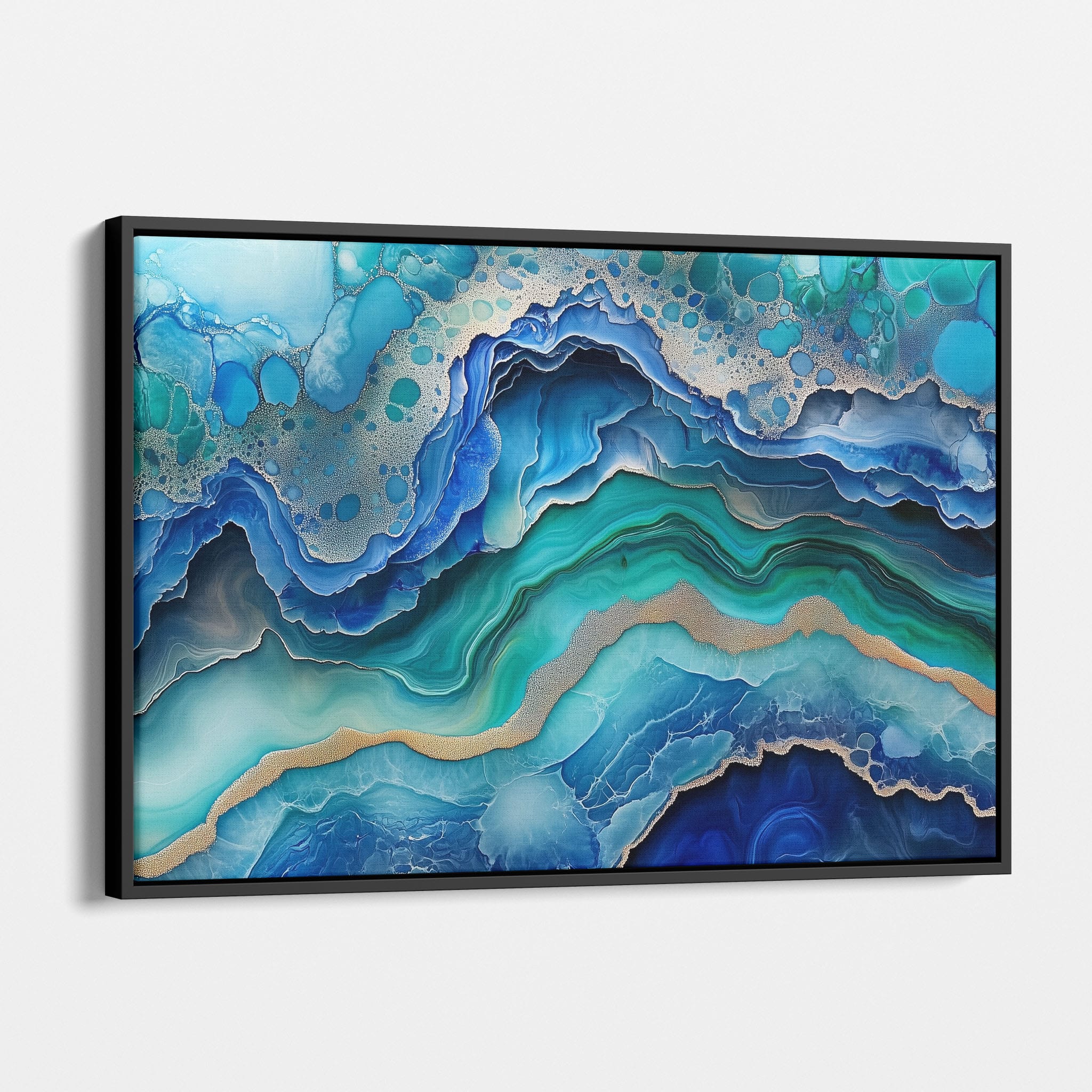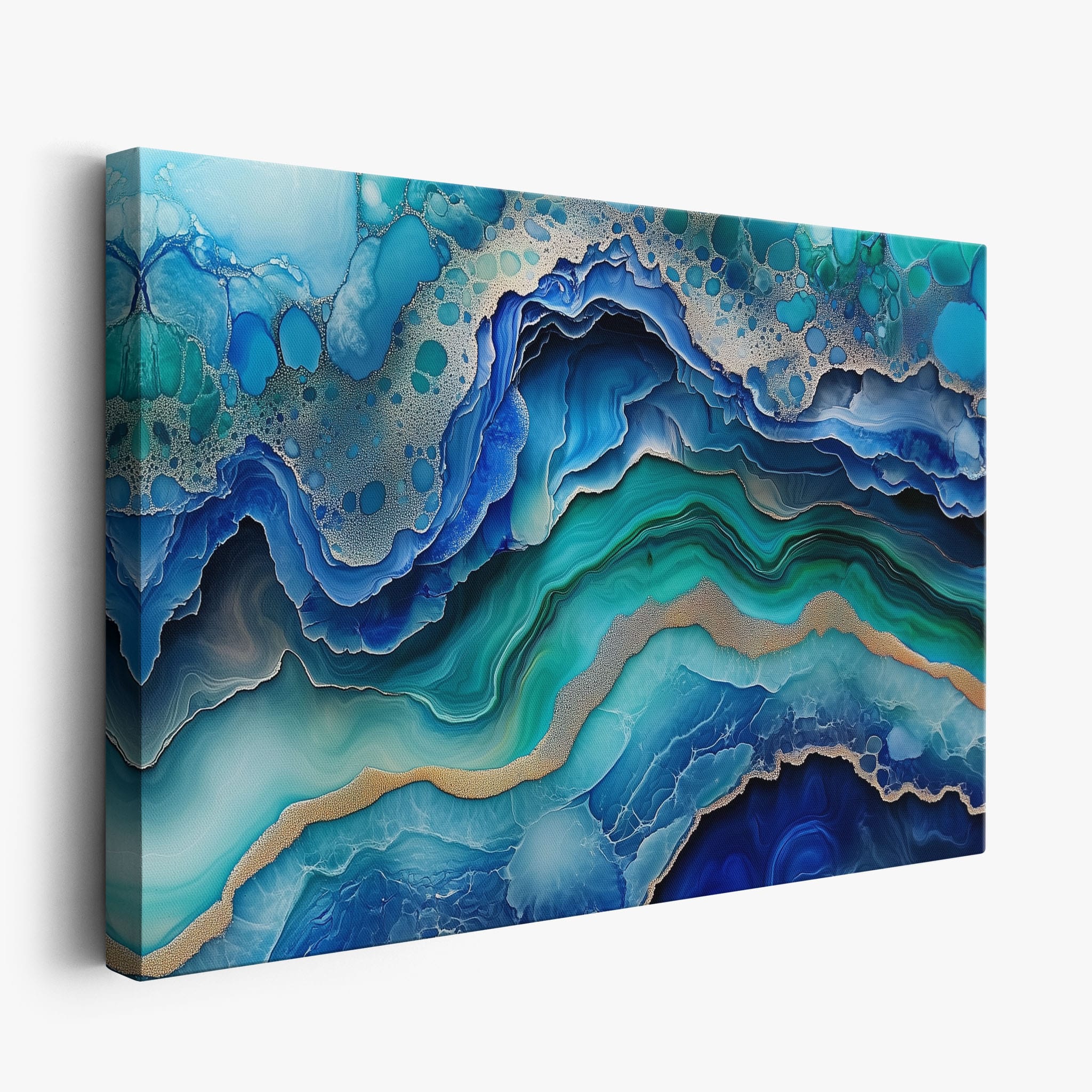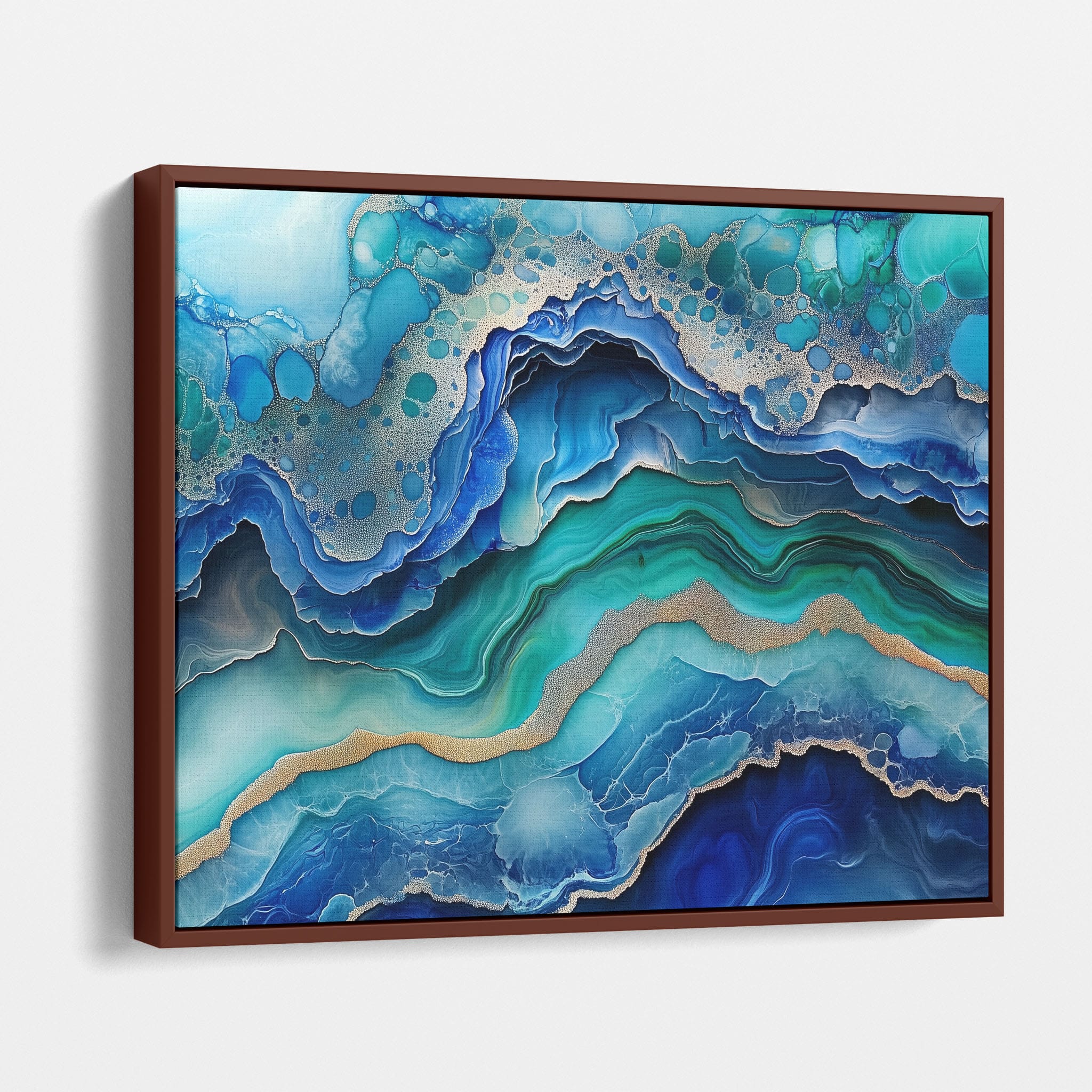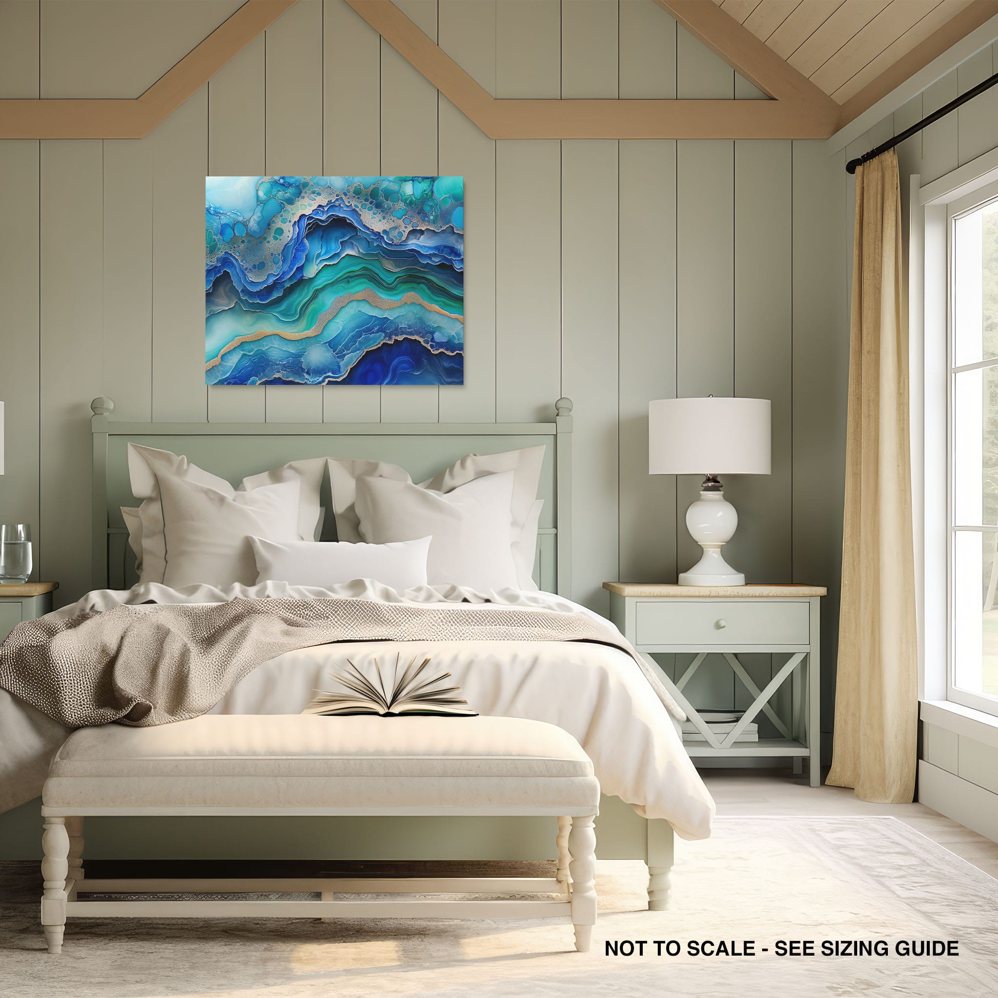 This stunning digital illustration invites the viewer into a deep, mesmerizing exploration of abstract and surreal forms reminiscent of layered ocean waves. Interplaying shades of blue and aquamarine meld with sand-like textures, evoking a serene yet dynamic seascape that captivates and soothes. This piece is perfect for adding a touch of tranquility and artistic flair to any modern decor. Captured through the finesse of digital art, it brings a contemporary edge to any space. Ideal for those looking to enhance their surroundings with a jewel-toned visual feast.