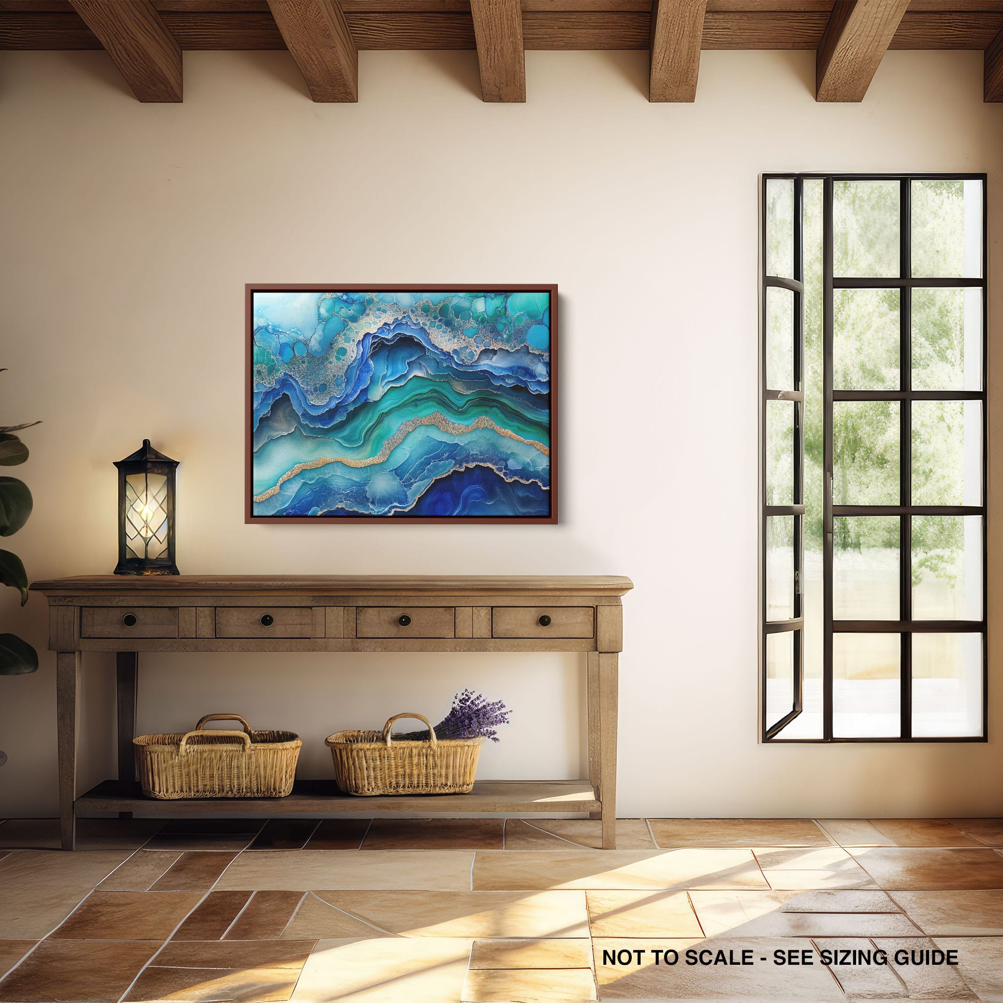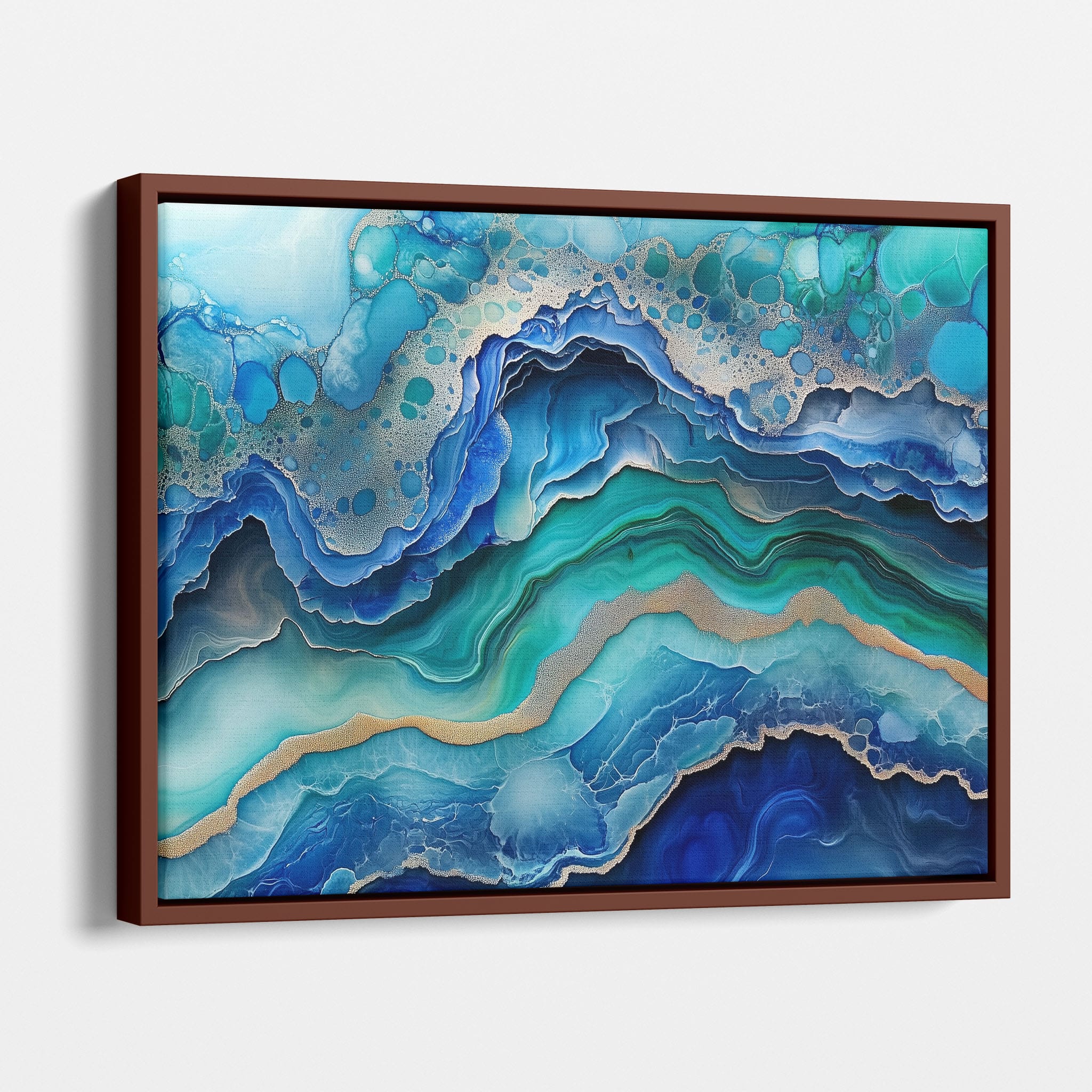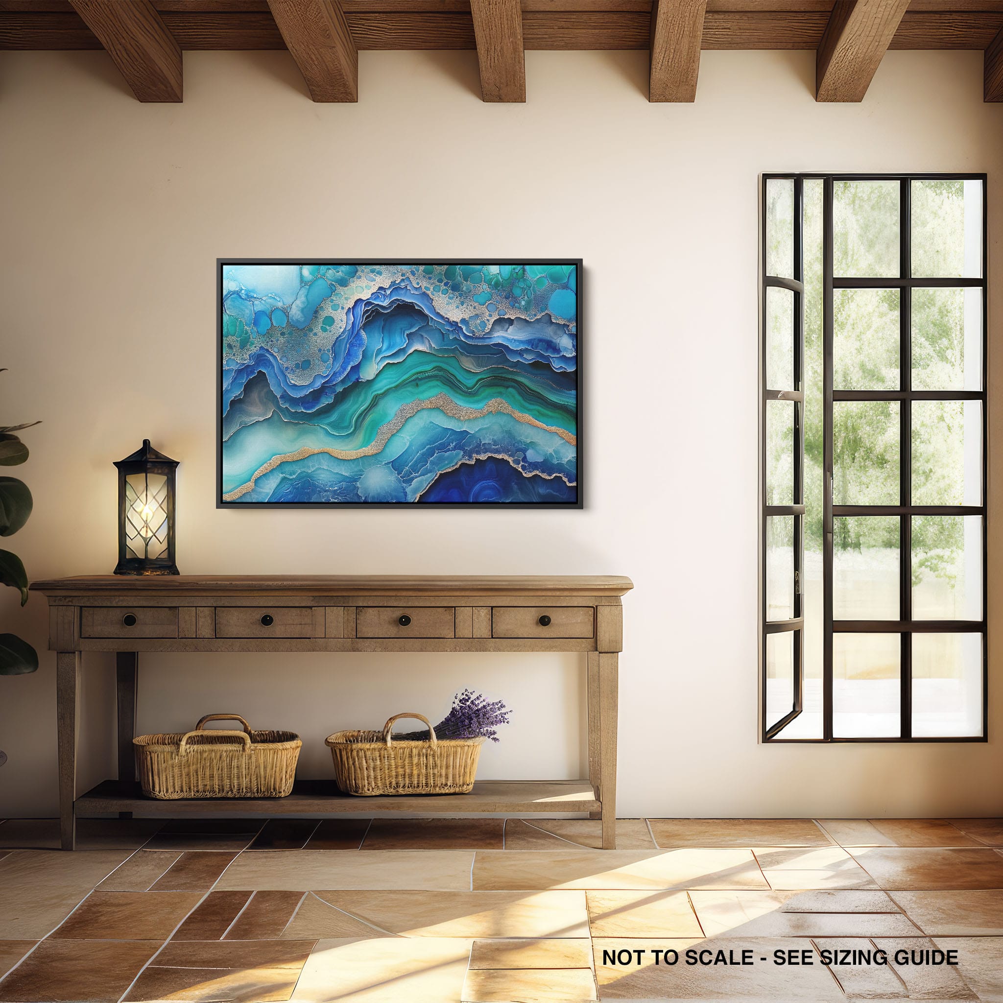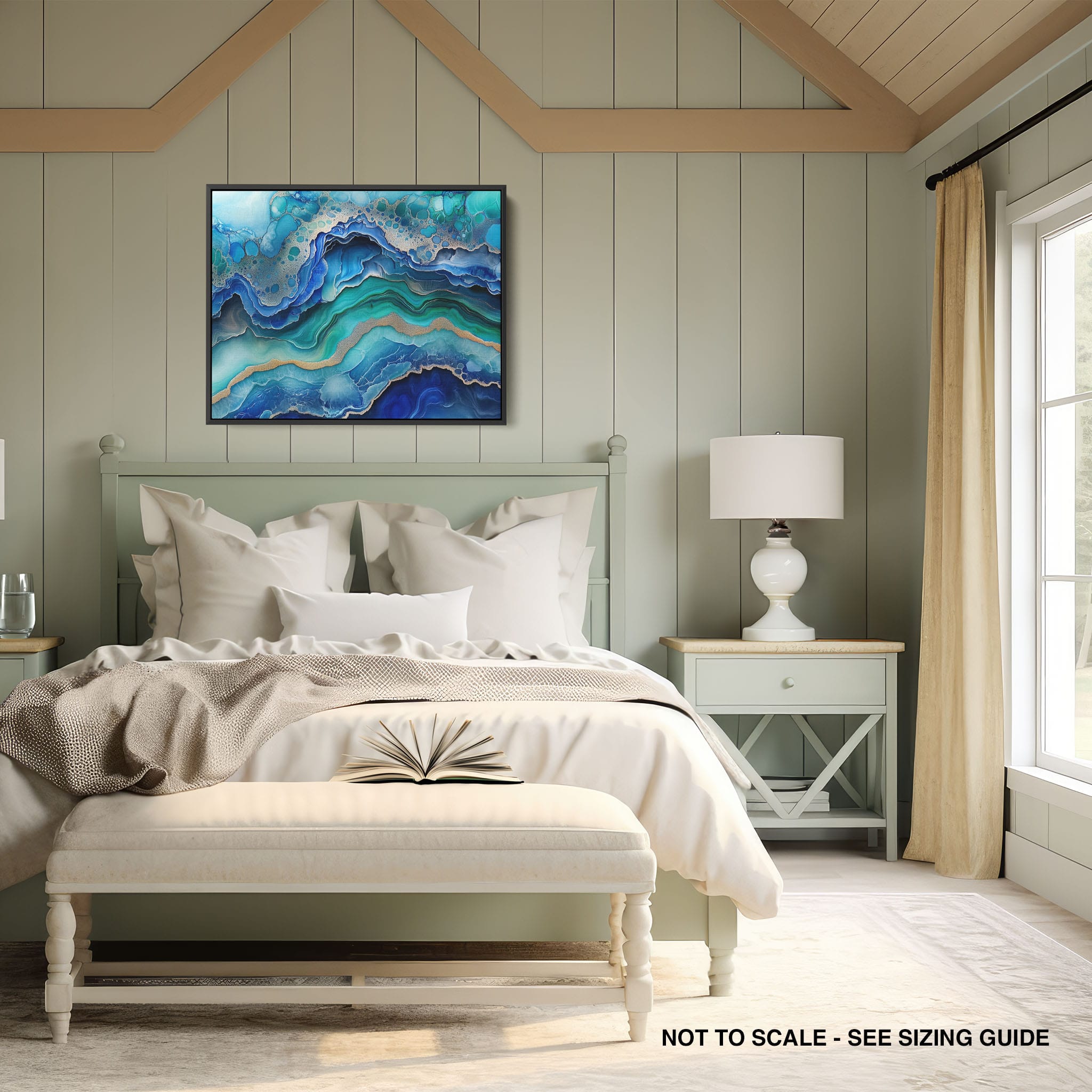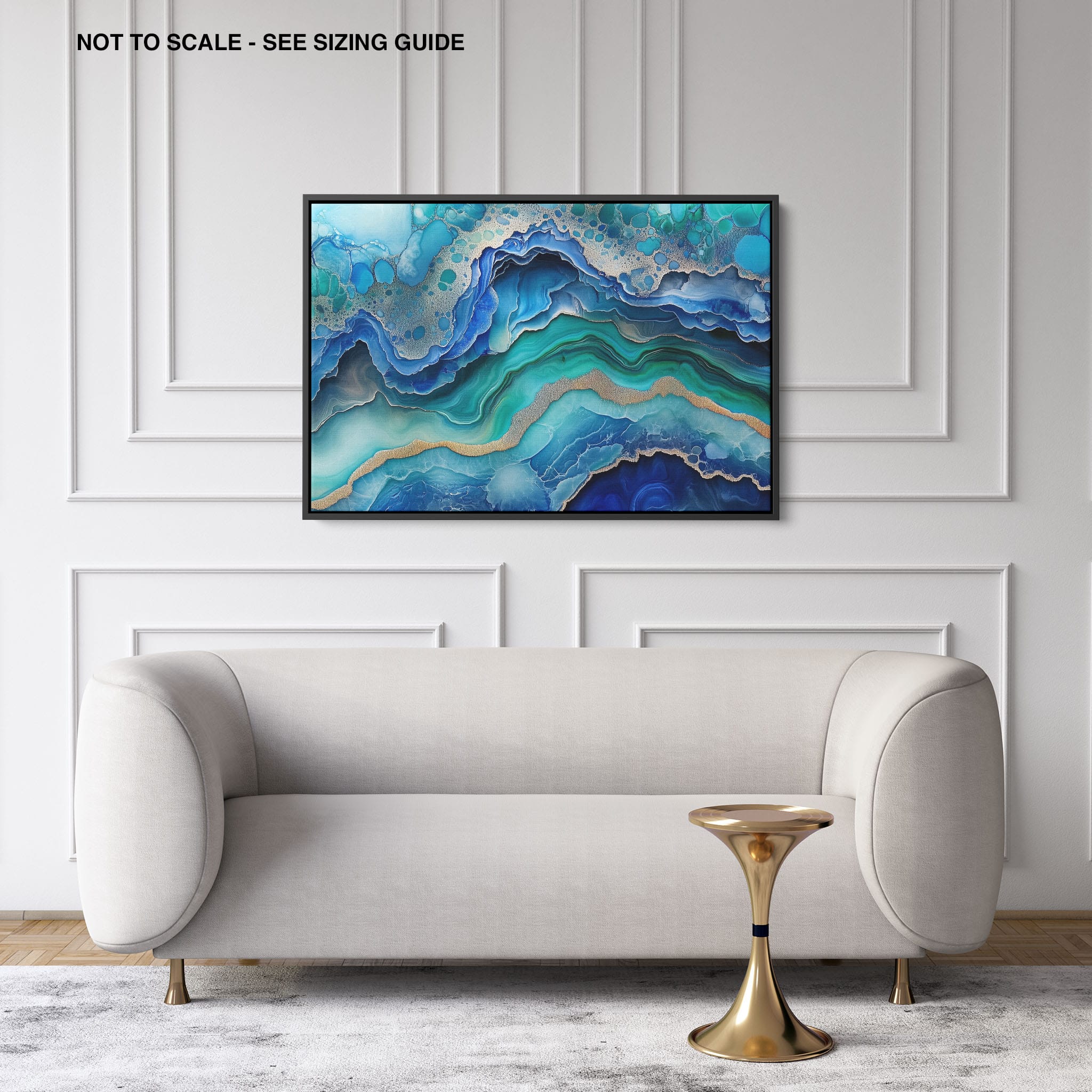 This stunning digital illustration invites the viewer into a deep, mesmerizing exploration of abstract and surreal forms reminiscent of layered ocean waves. Interplaying shades of blue and aquamarine meld with sand-like textures, evoking a serene yet dynamic seascape that captivates and soothes. This piece is perfect for adding a touch of tranquility and artistic flair to any modern decor. Captured through the finesse of digital art, it brings a contemporary edge to any space. Ideal for those looking to enhance their surroundings with a jewel-toned visual feast.