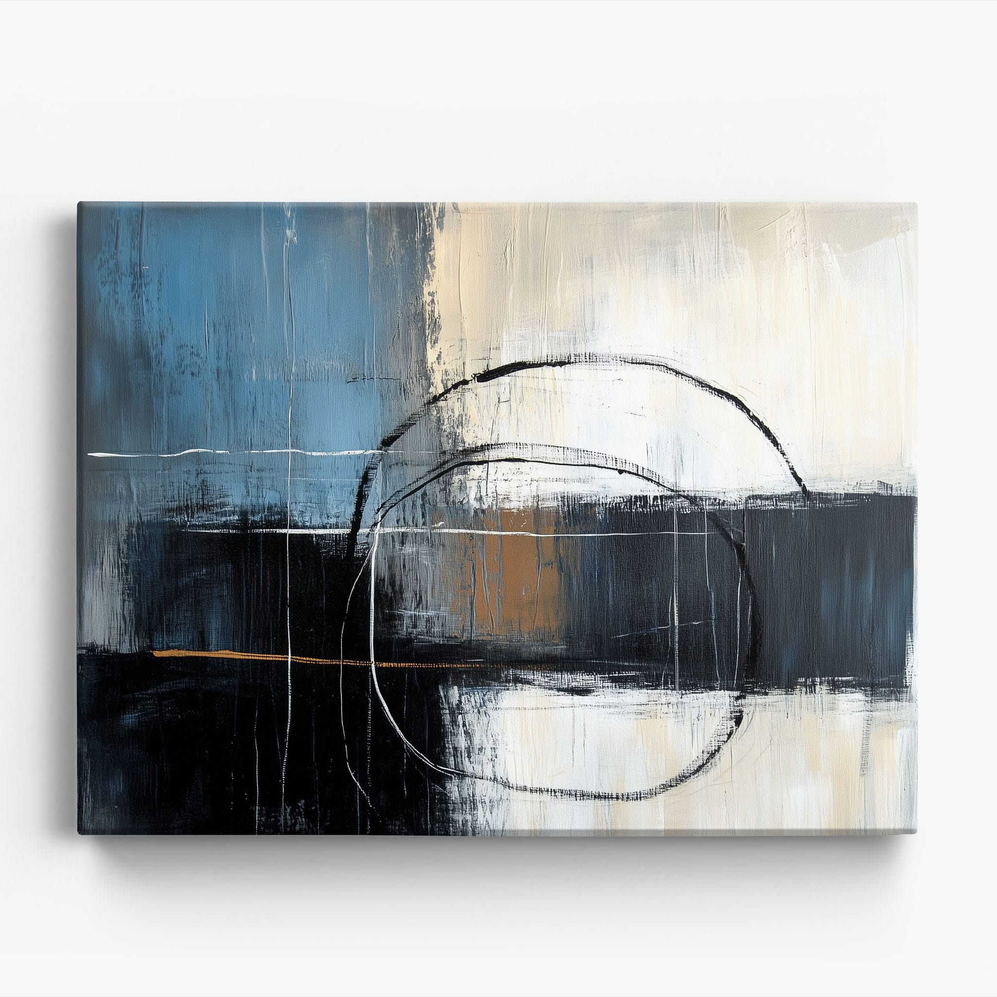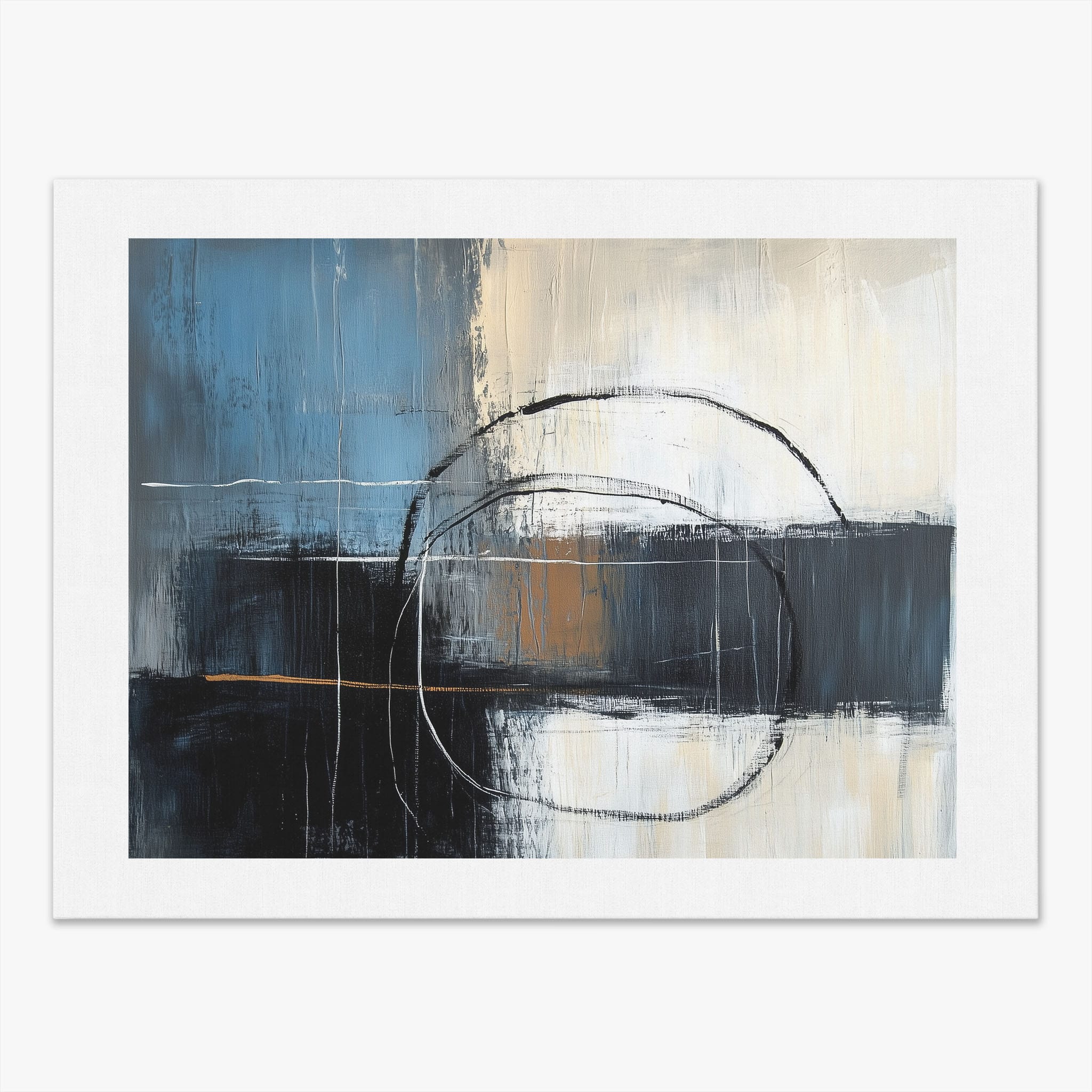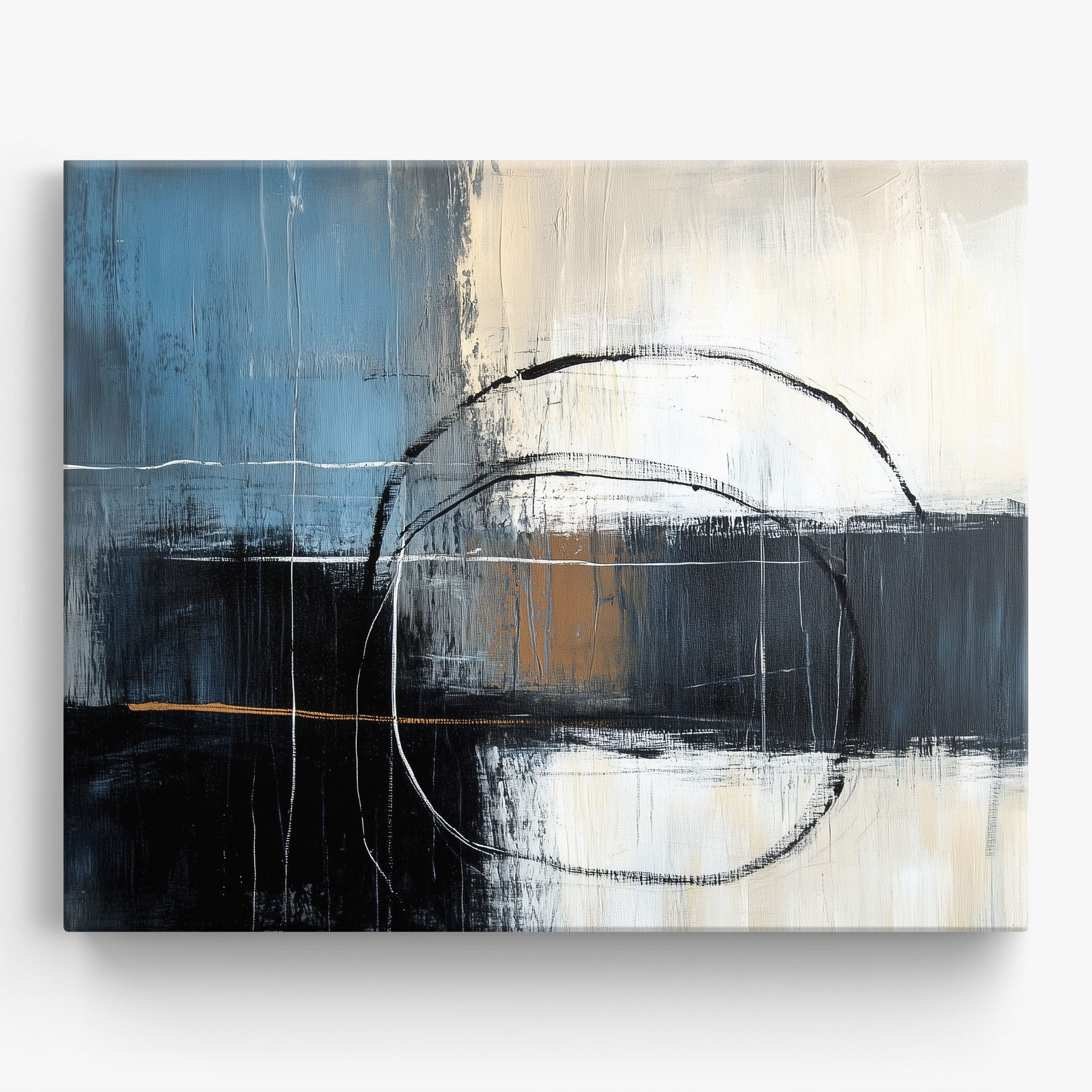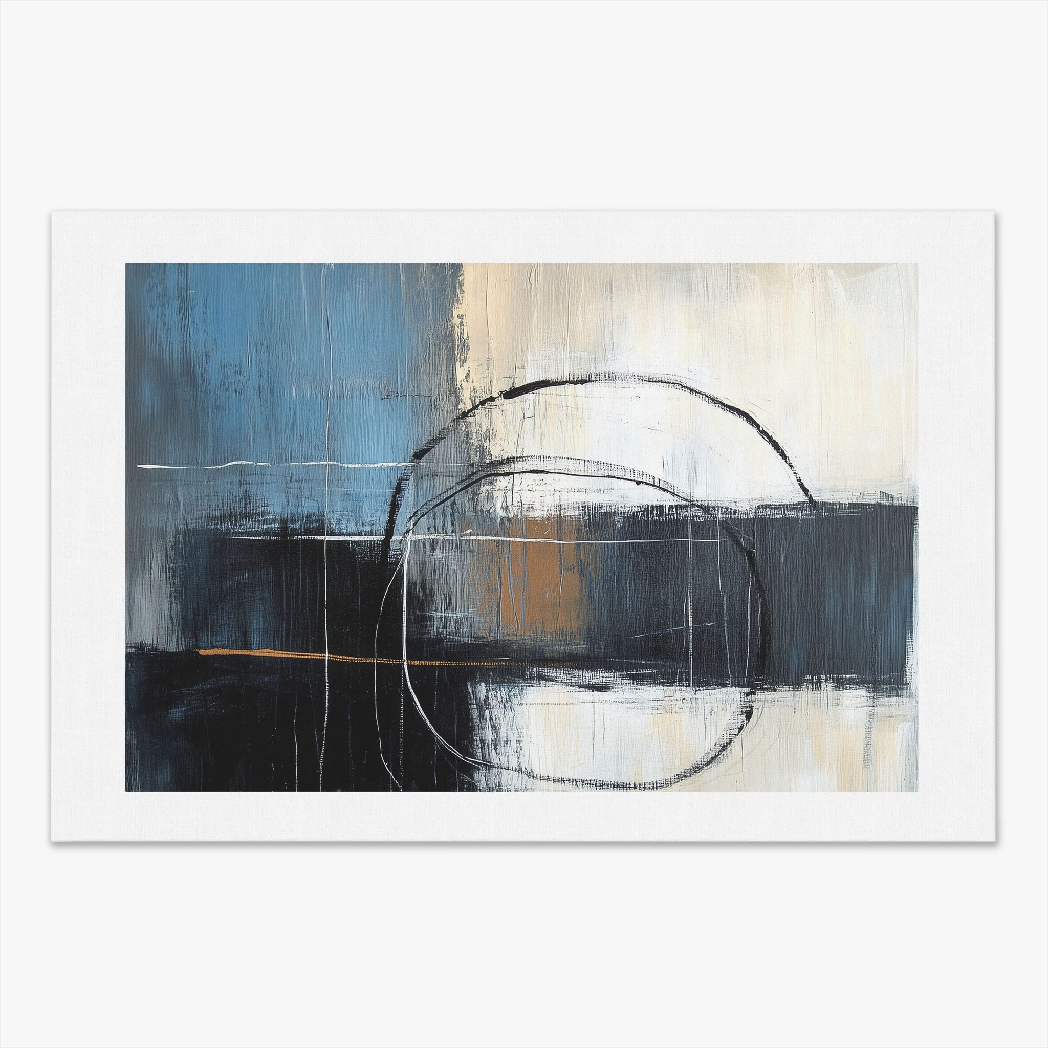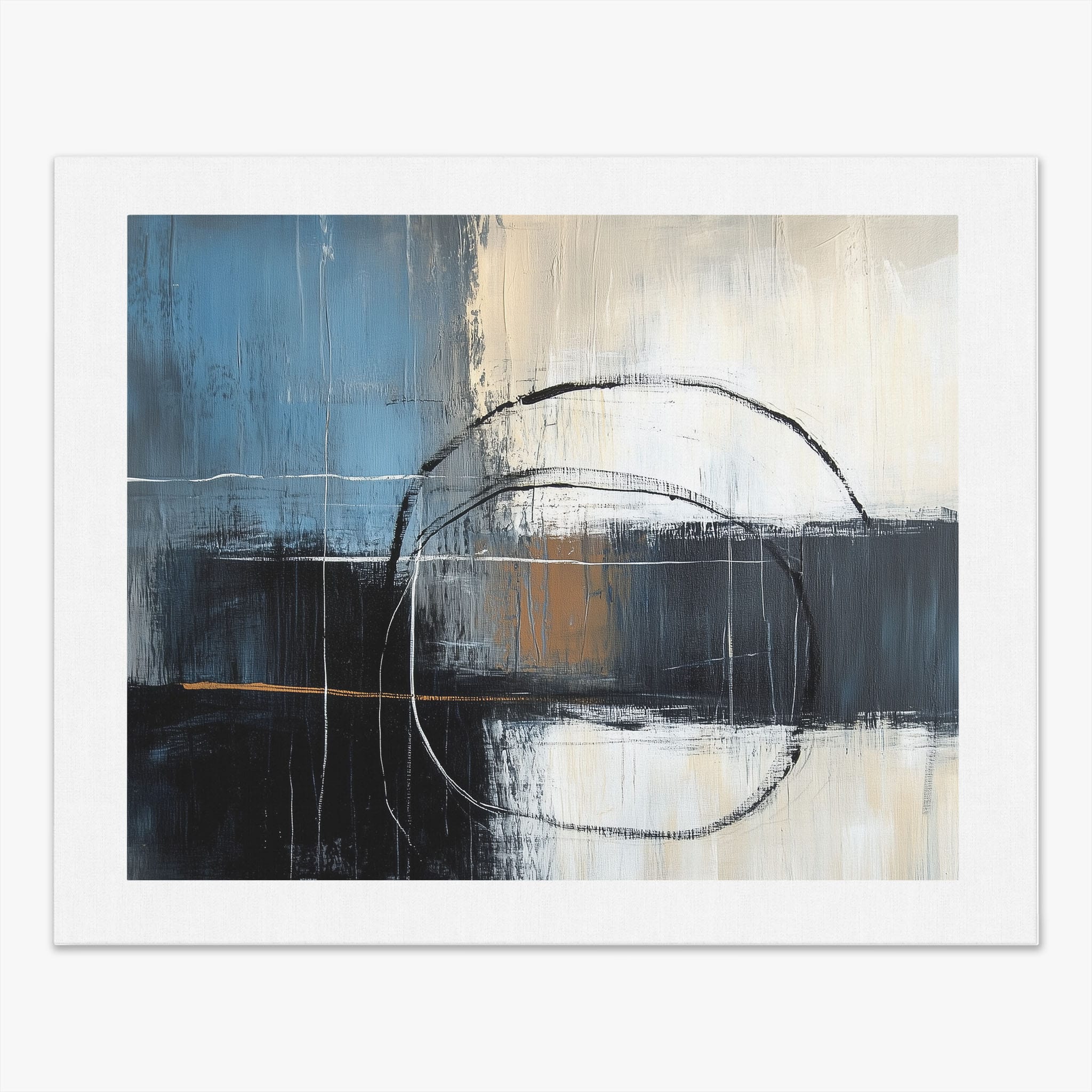 This painting draws you into a world of abstract modernism, where bold circular forms intersect with robust blocks of color. The deep blues and contrasting warm tones merge with pure white strokes, evoking a sense of depth and emotional resonance. This piece uses texture strategically to add dimension and intrigue, making it a standout addition to any space seeking a touch of sophistication and a contemporary flair. Enhance your home or office with this visually striking artwork that invites contemplation and conversation.