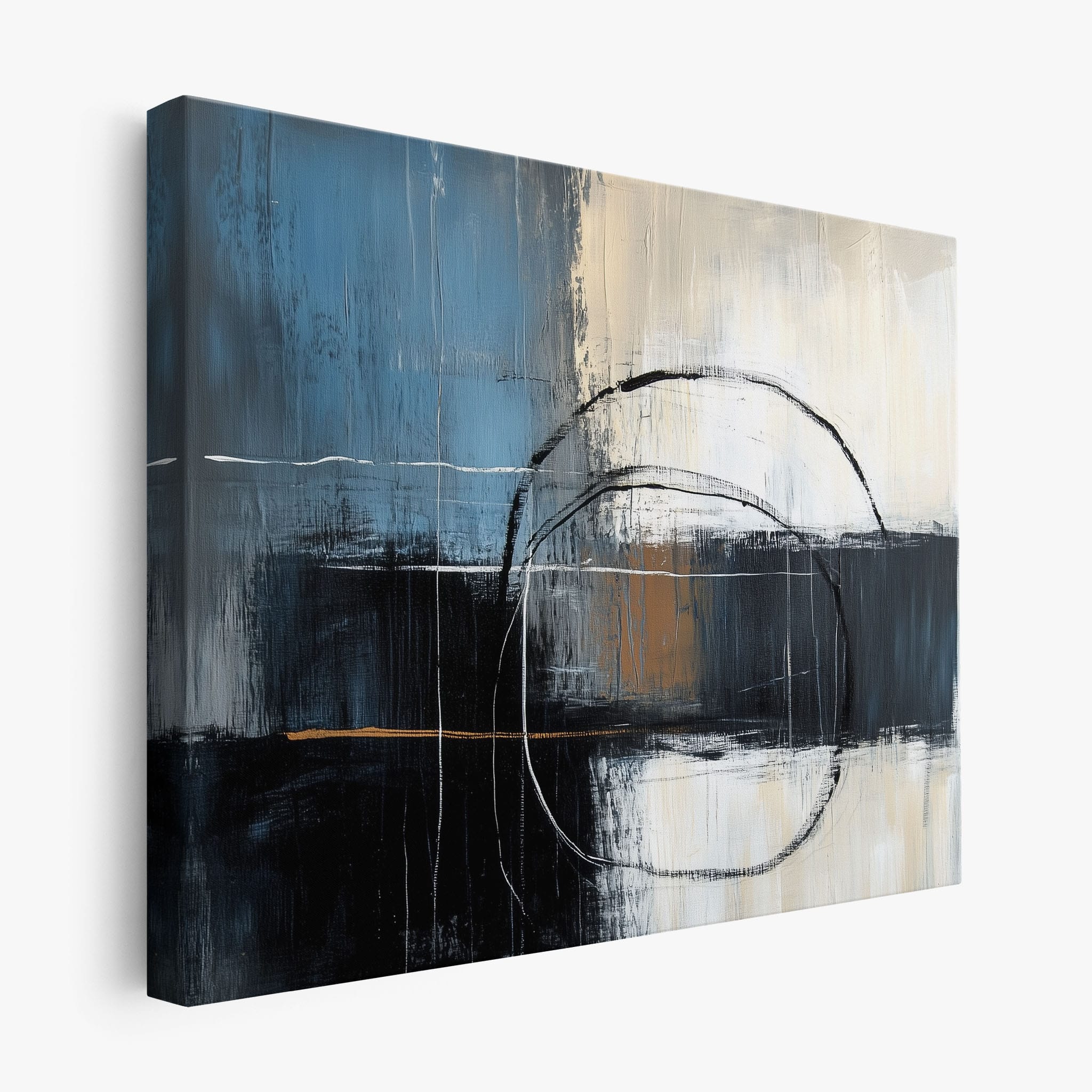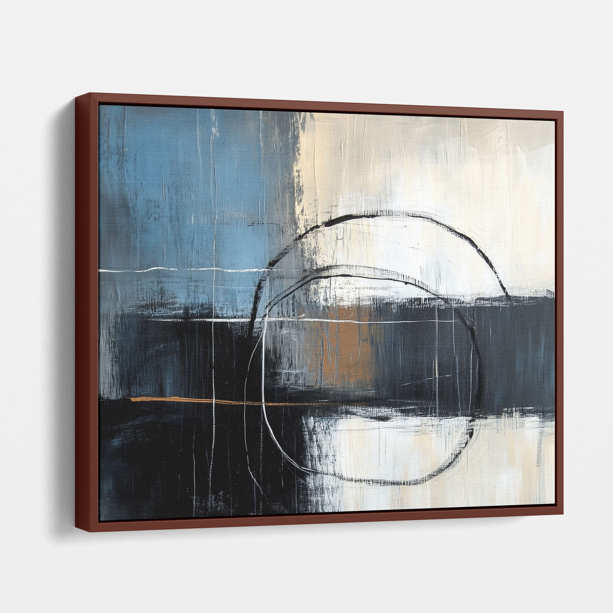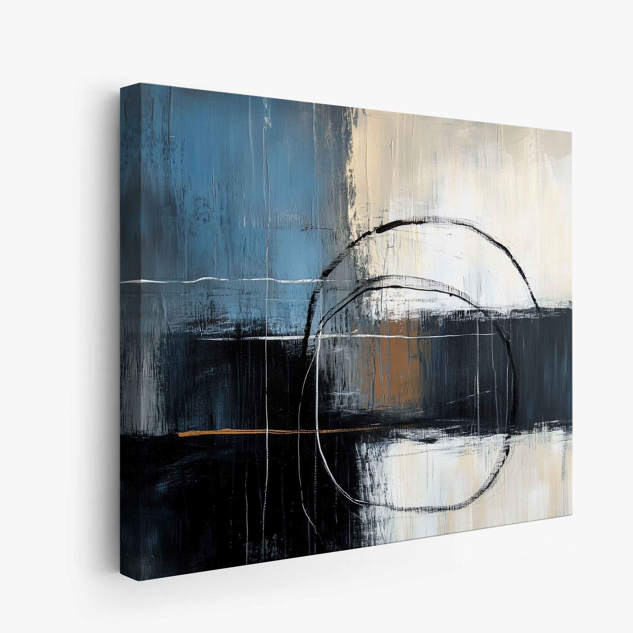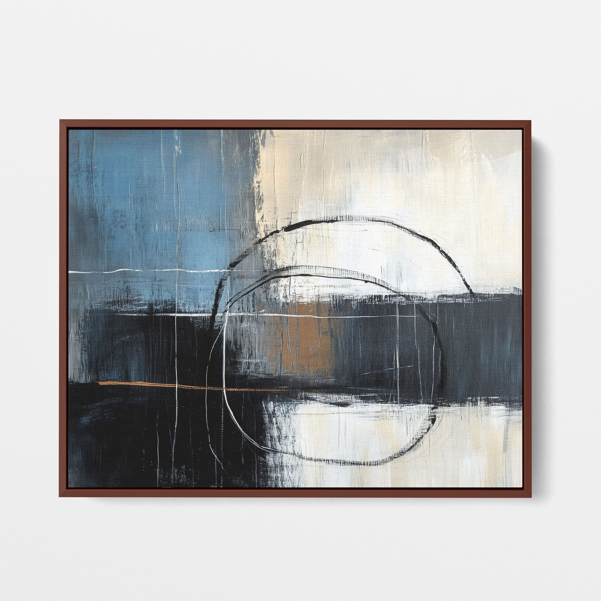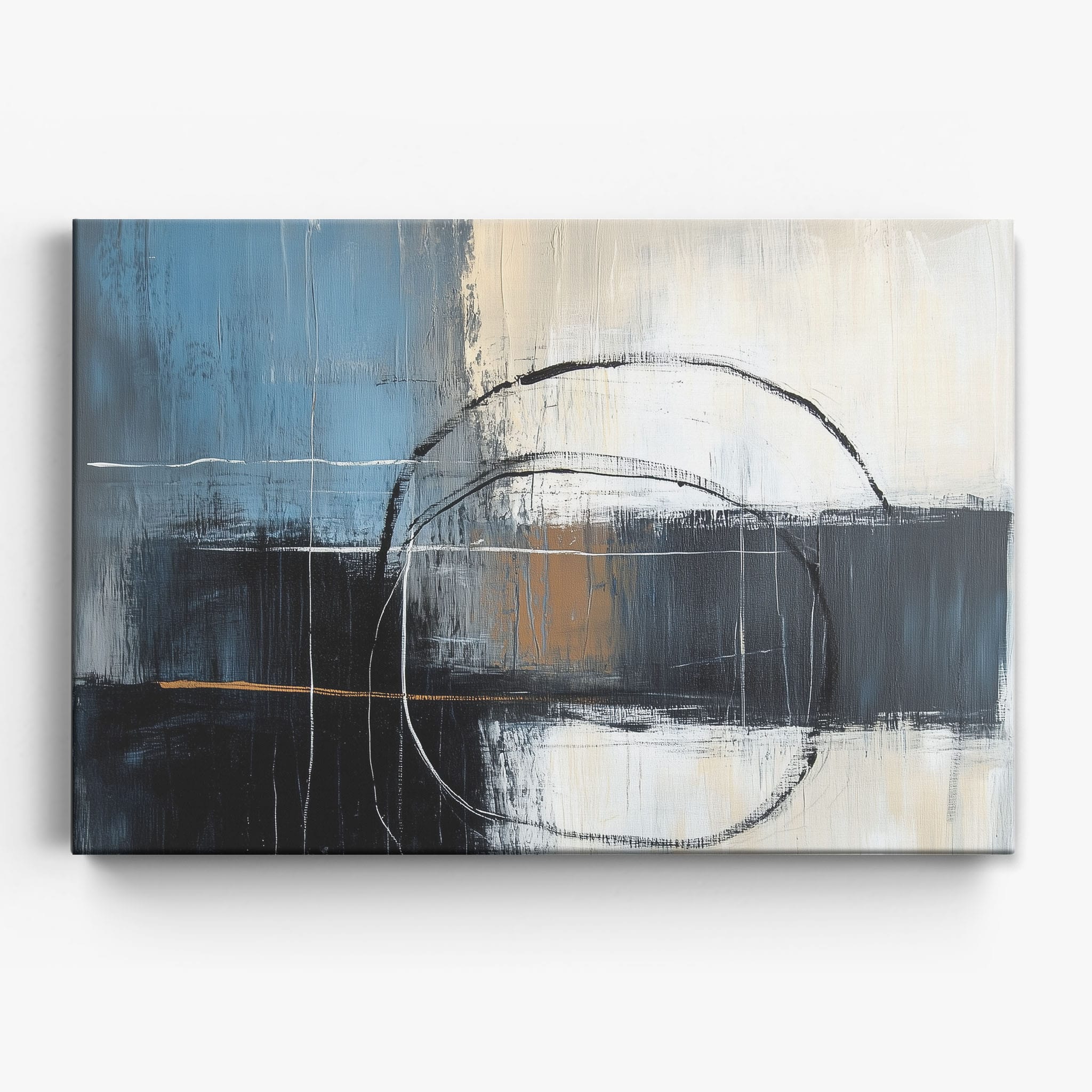 This painting draws you into a world of abstract modernism, where bold circular forms intersect with robust blocks of color. The deep blues and contrasting warm tones merge with pure white strokes, evoking a sense of depth and emotional resonance. This piece uses texture strategically to add dimension and intrigue, making it a standout addition to any space seeking a touch of sophistication and a contemporary flair. Enhance your home or office with this visually striking artwork that invites contemplation and conversation.