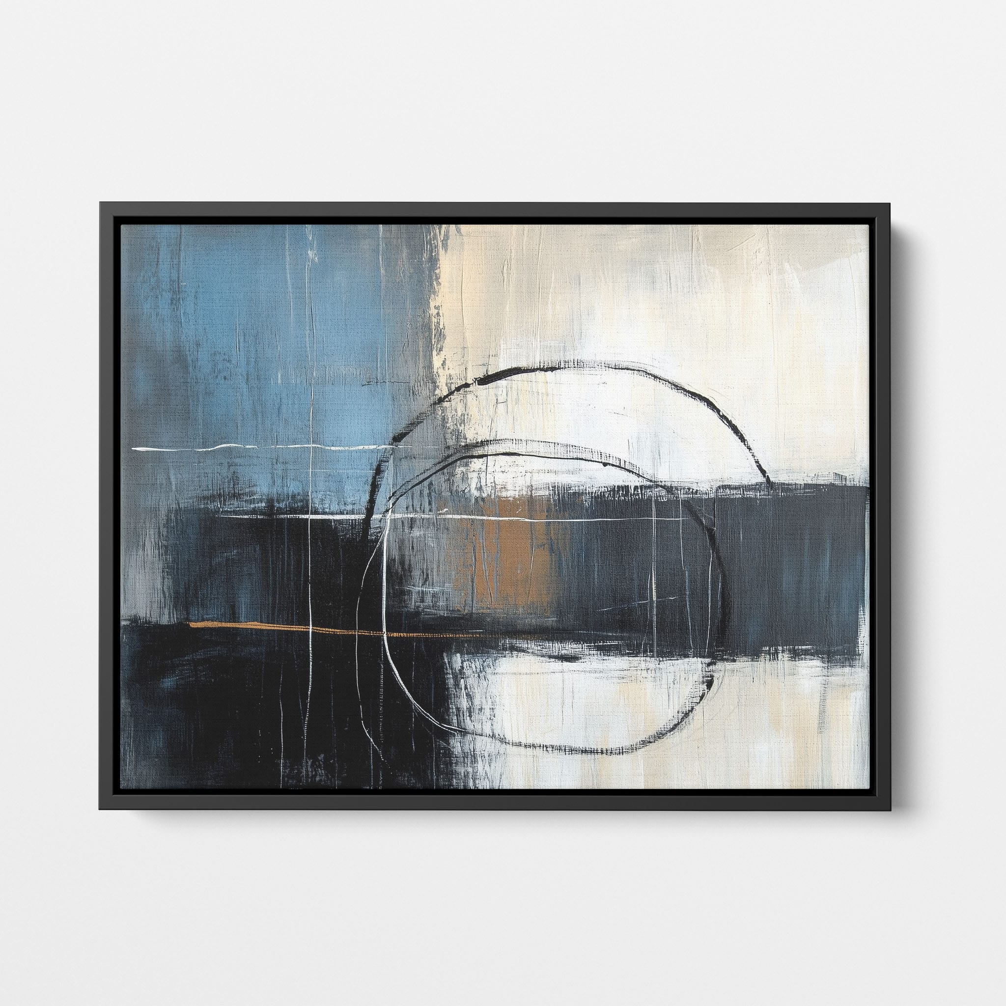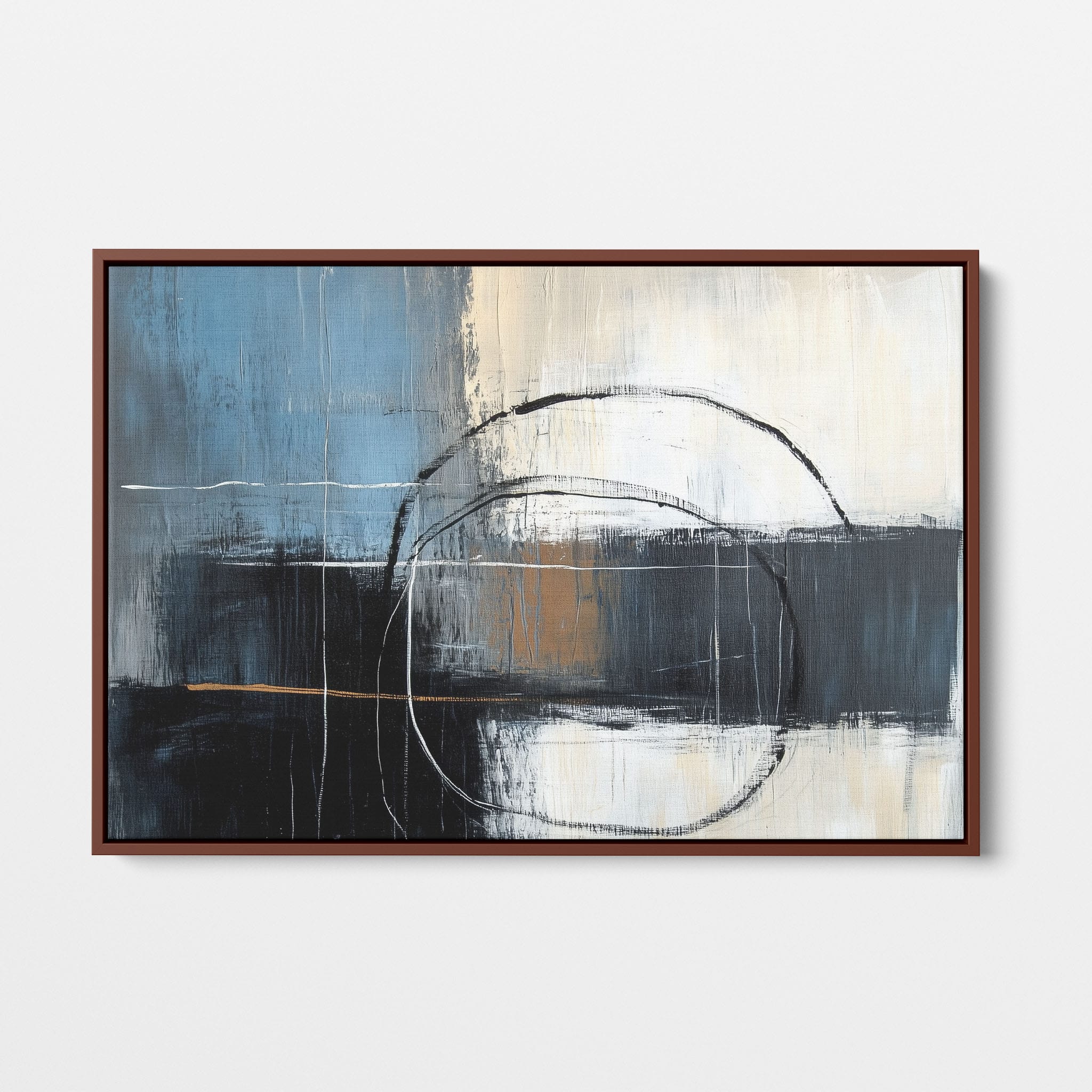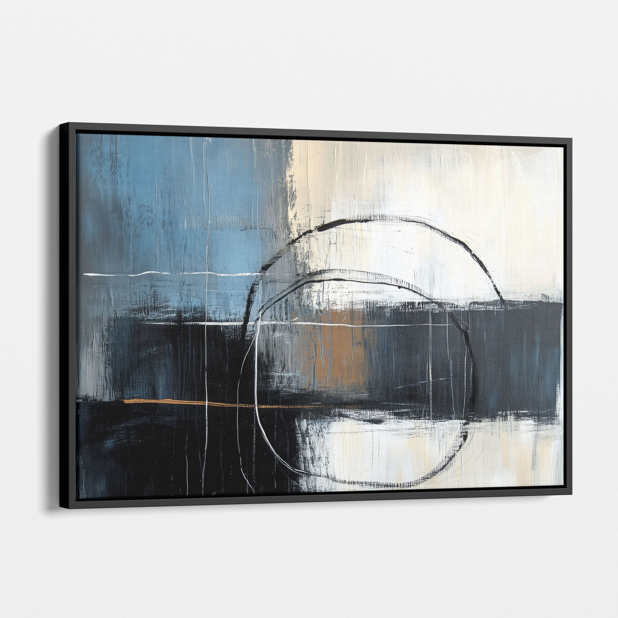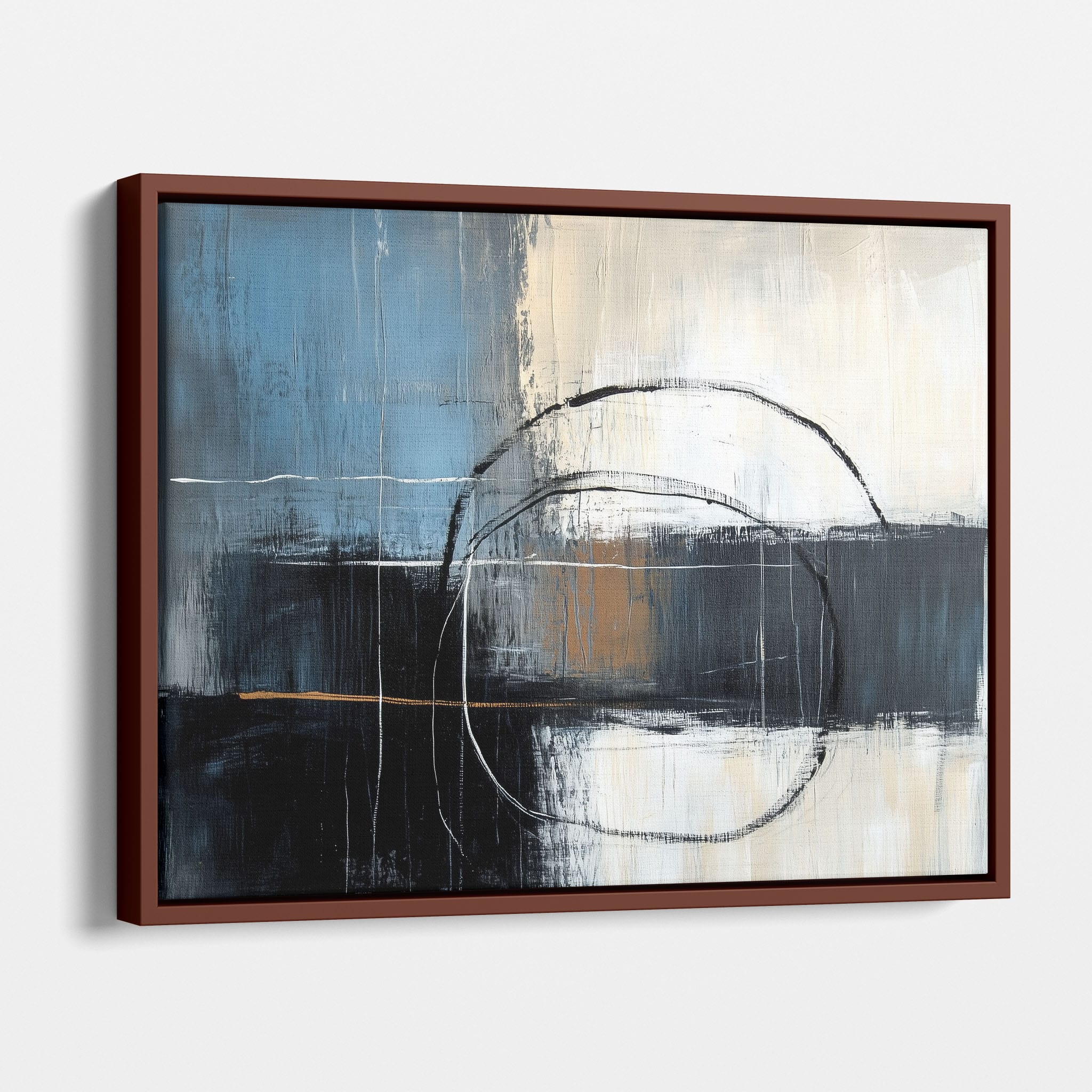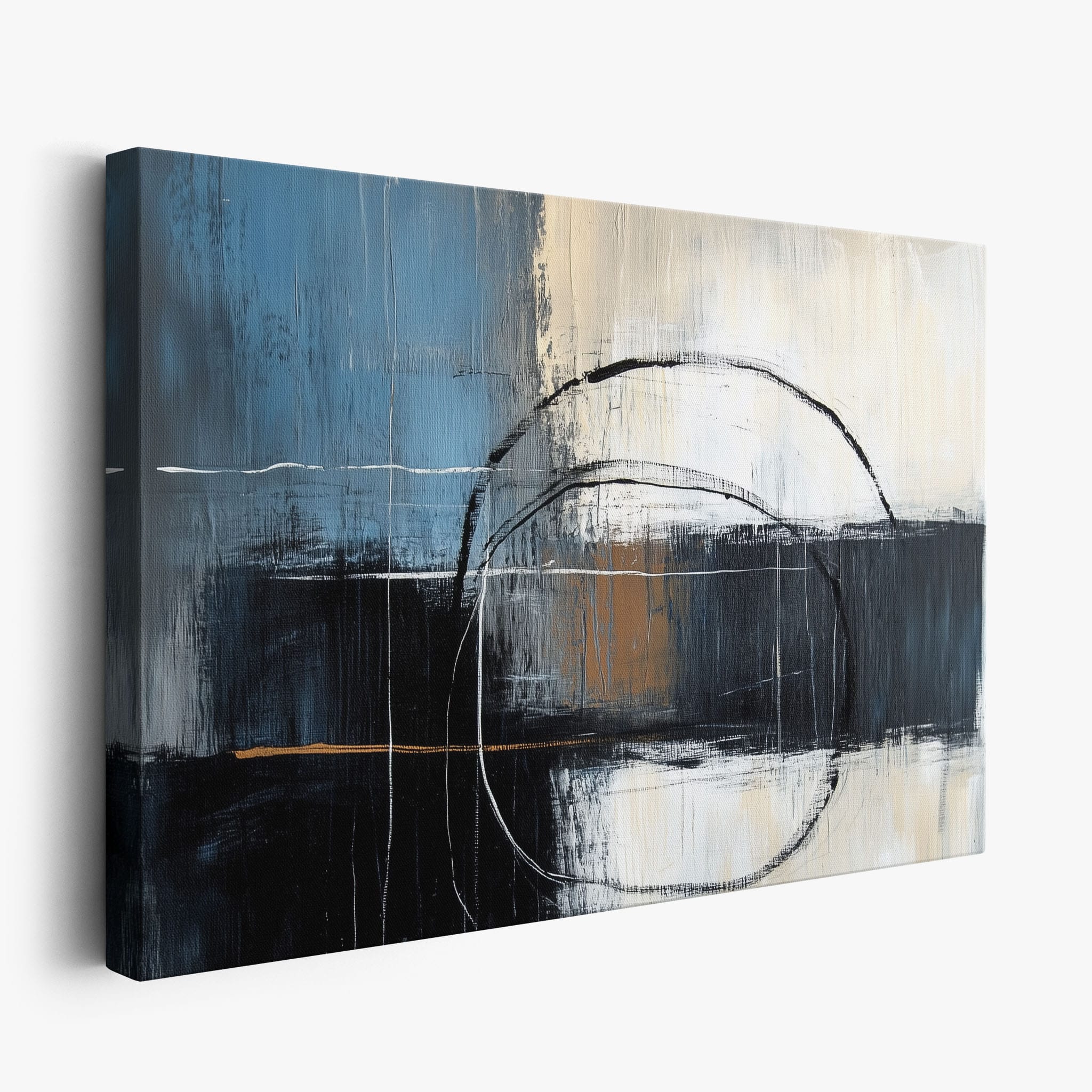 This painting draws you into a world of abstract modernism, where bold circular forms intersect with robust blocks of color. The deep blues and contrasting warm tones merge with pure white strokes, evoking a sense of depth and emotional resonance. This piece uses texture strategically to add dimension and intrigue, making it a standout addition to any space seeking a touch of sophistication and a contemporary flair. Enhance your home or office with this visually striking artwork that invites contemplation and conversation.