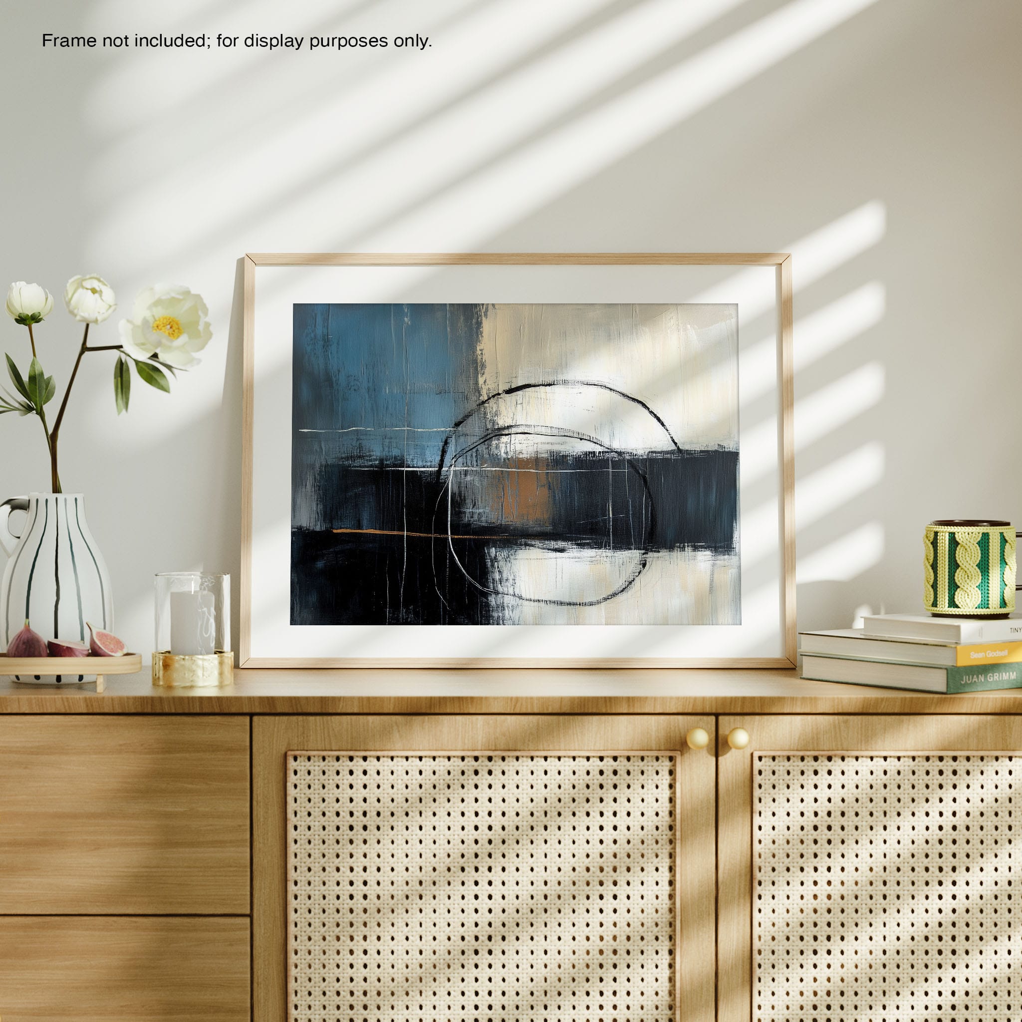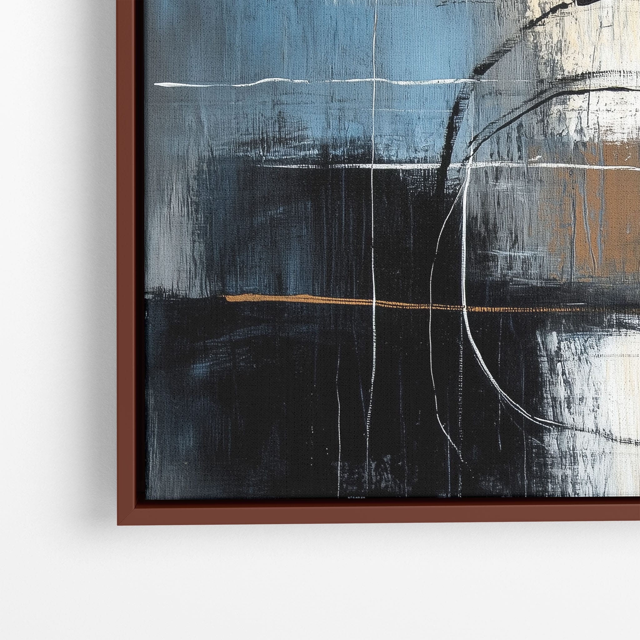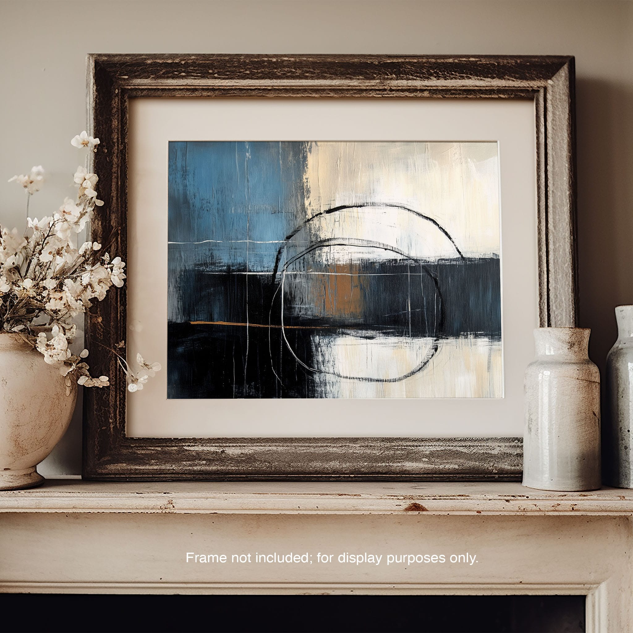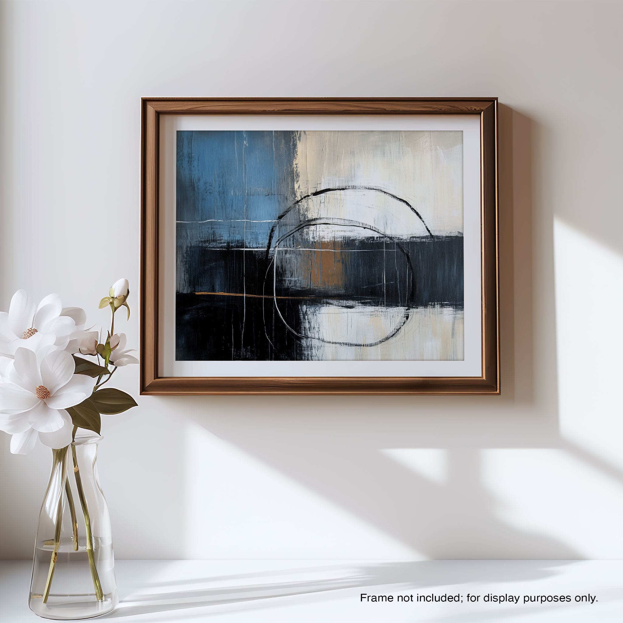 This painting draws you into a world of abstract modernism, where bold circular forms intersect with robust blocks of color. The deep blues and contrasting warm tones merge with pure white strokes, evoking a sense of depth and emotional resonance. This piece uses texture strategically to add dimension and intrigue, making it a standout addition to any space seeking a touch of sophistication and a contemporary flair. Enhance your home or office with this visually striking artwork that invites contemplation and conversation.