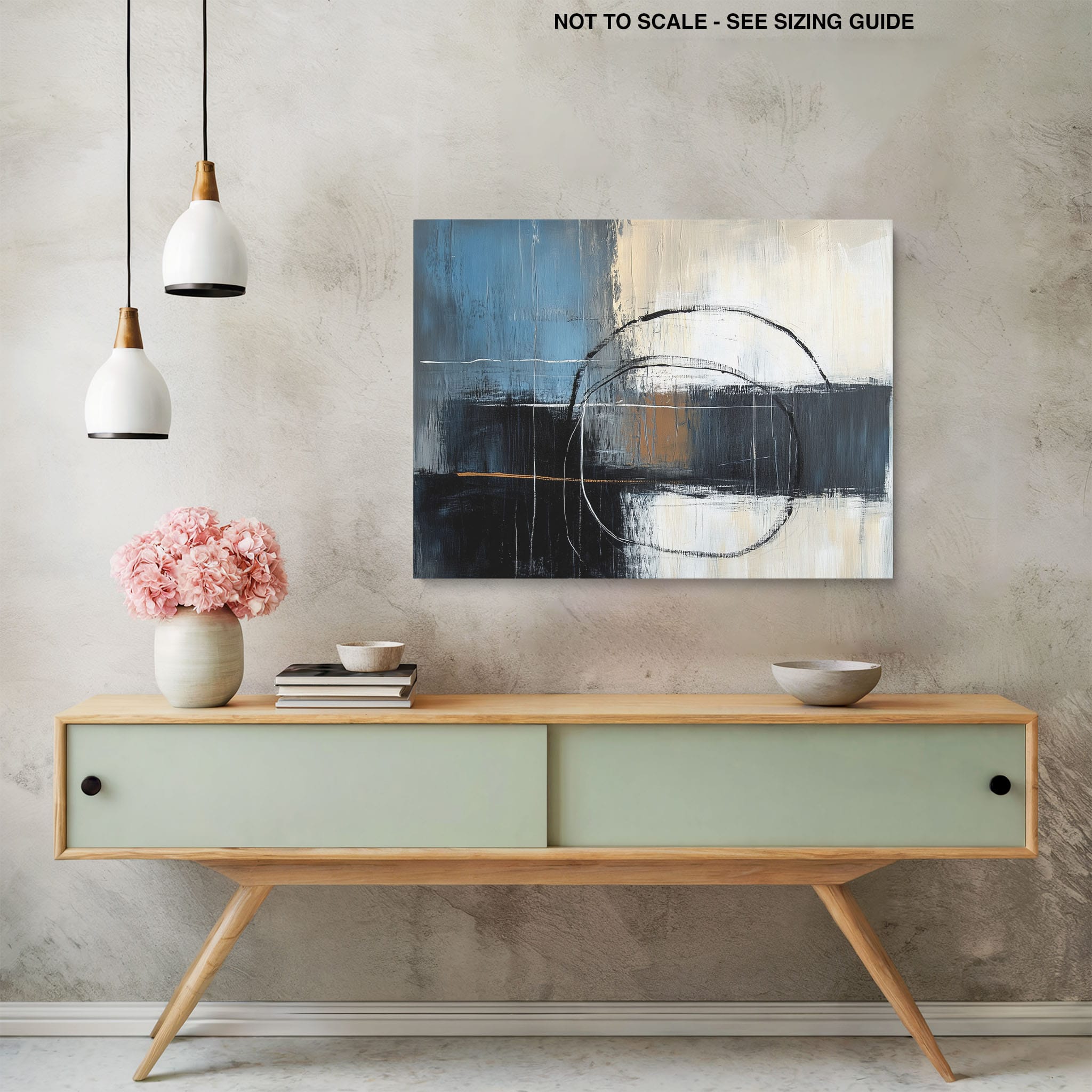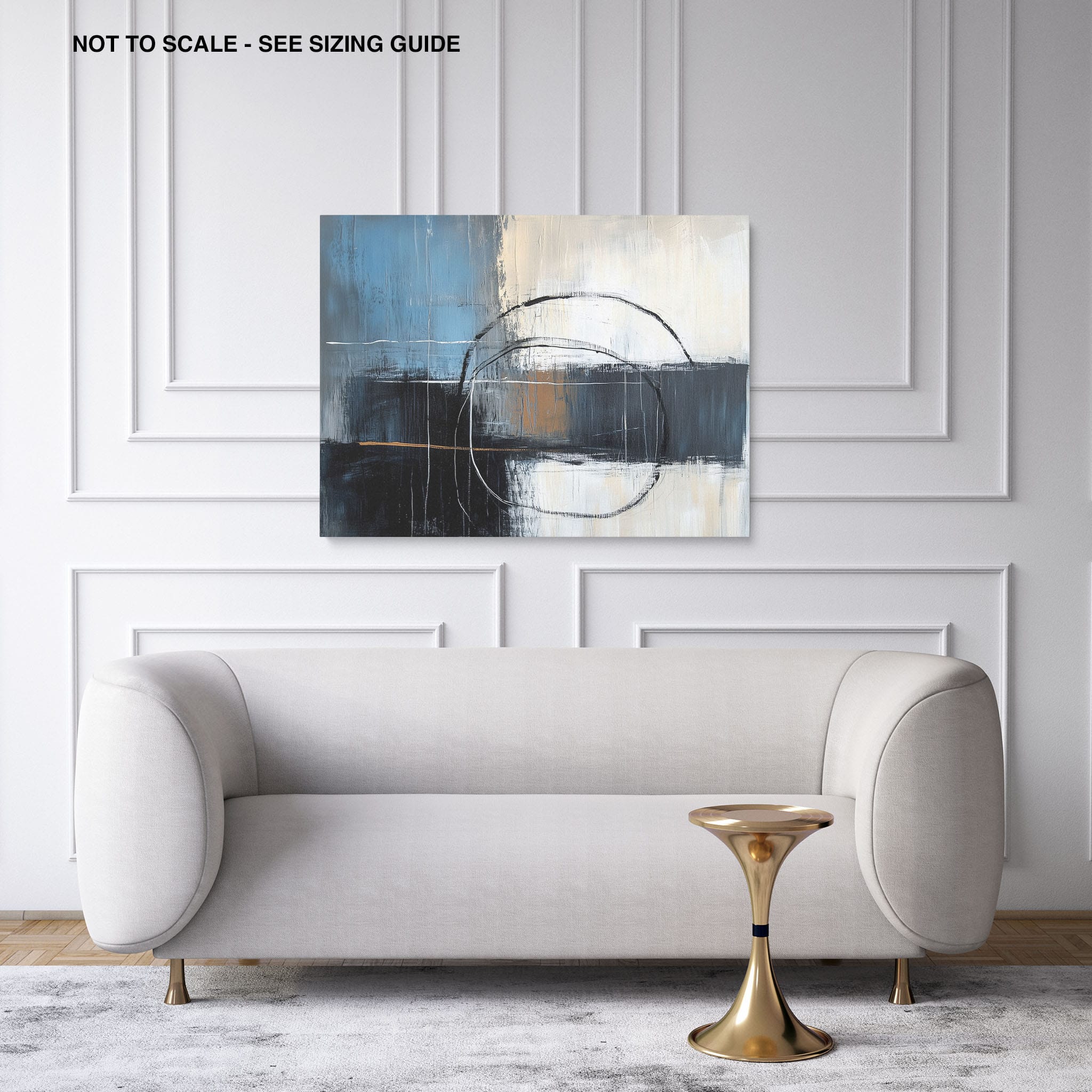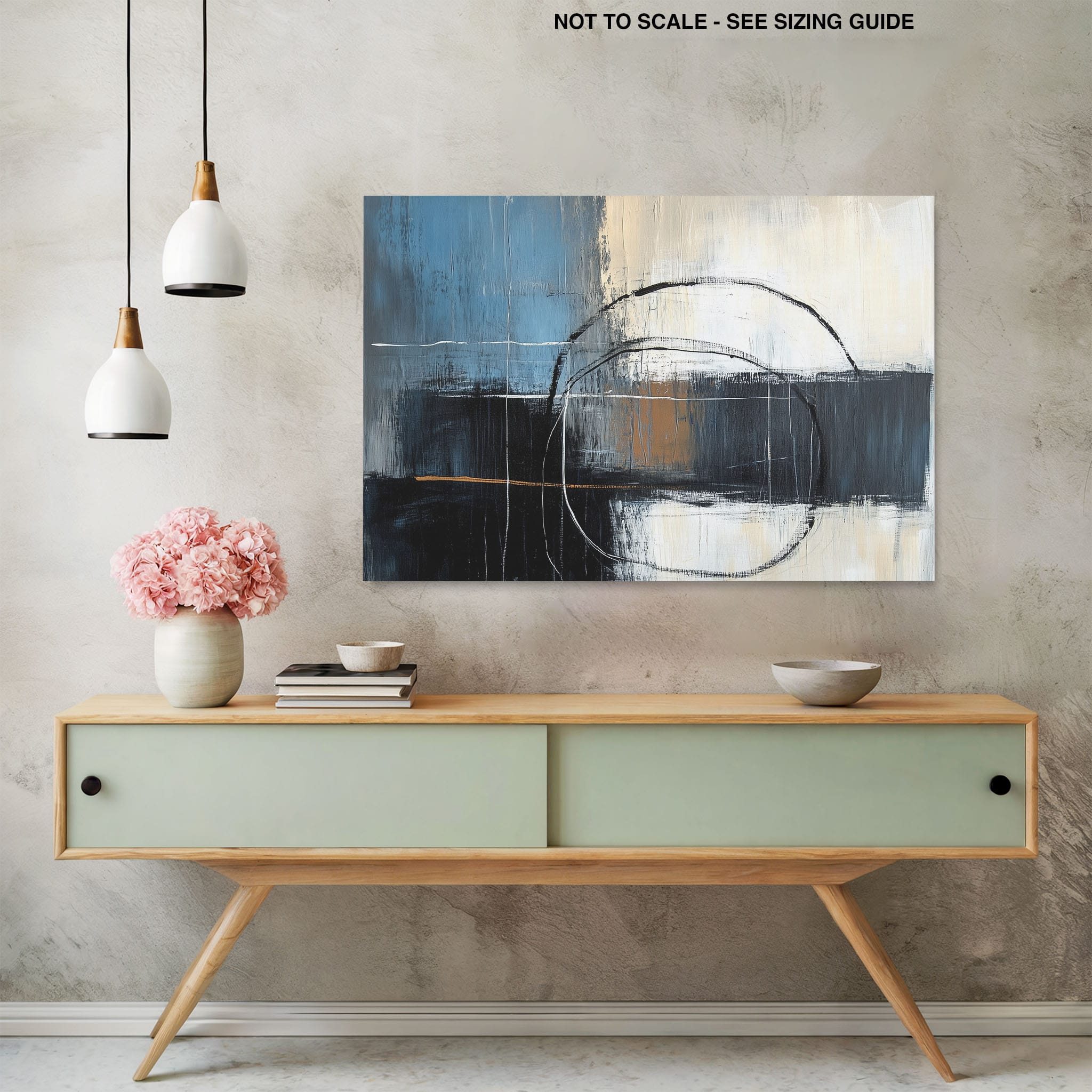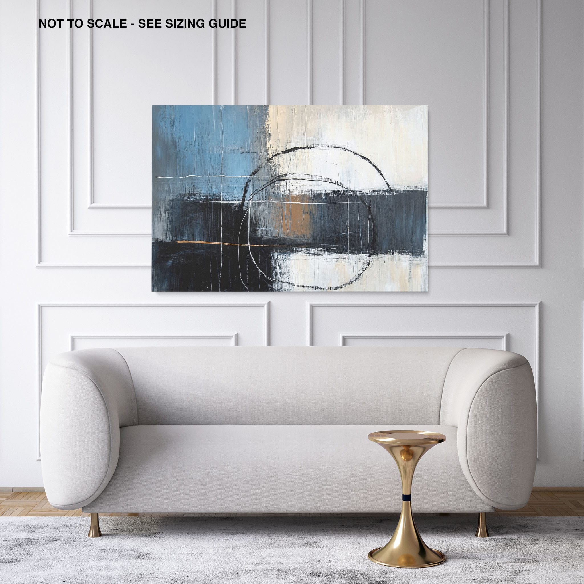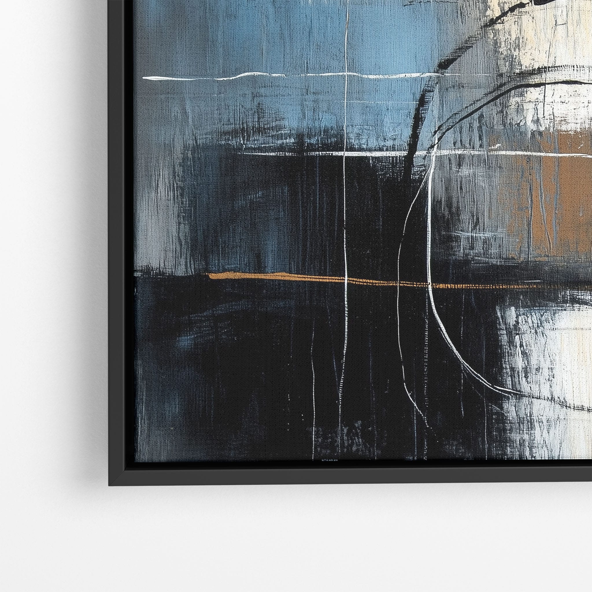 This painting draws you into a world of abstract modernism, where bold circular forms intersect with robust blocks of color. The deep blues and contrasting warm tones merge with pure white strokes, evoking a sense of depth and emotional resonance. This piece uses texture strategically to add dimension and intrigue, making it a standout addition to any space seeking a touch of sophistication and a contemporary flair. Enhance your home or office with this visually striking artwork that invites contemplation and conversation.