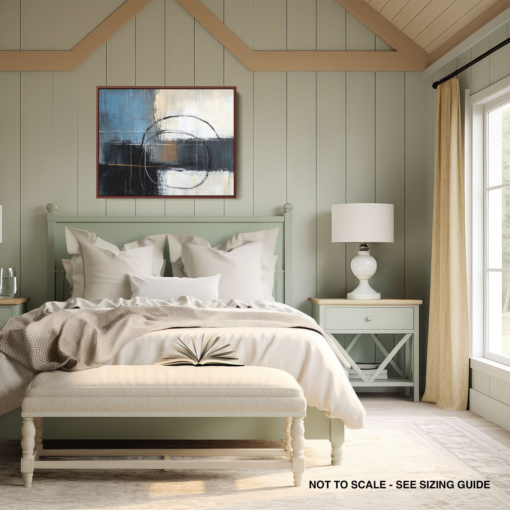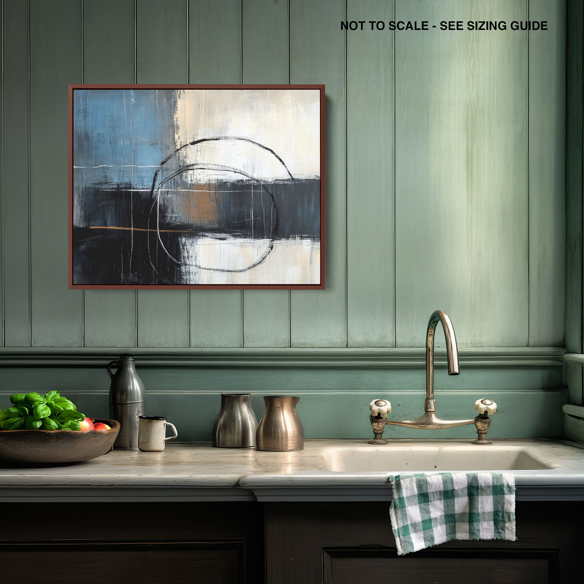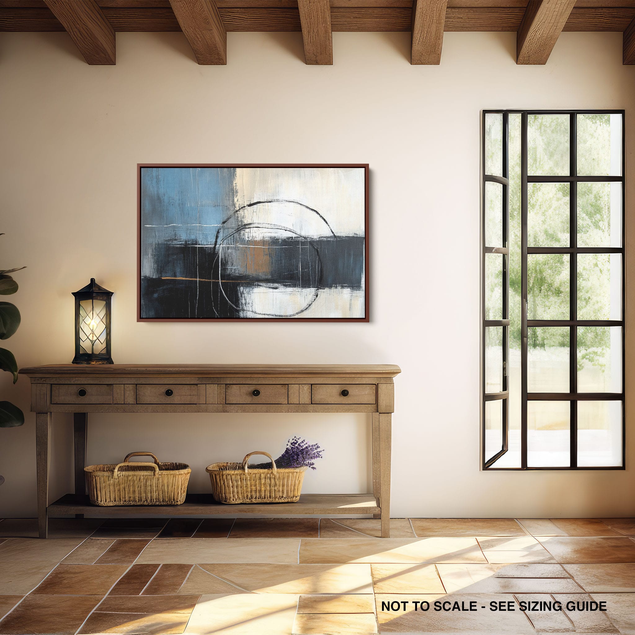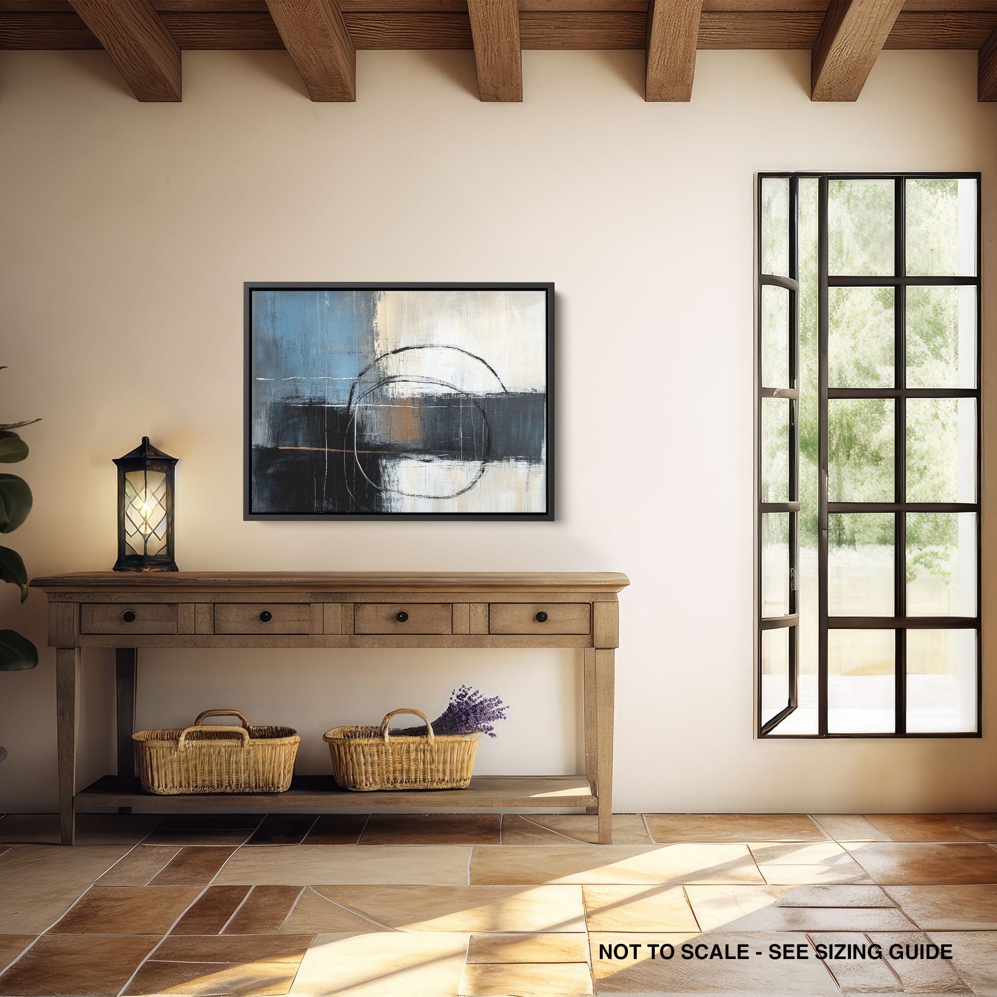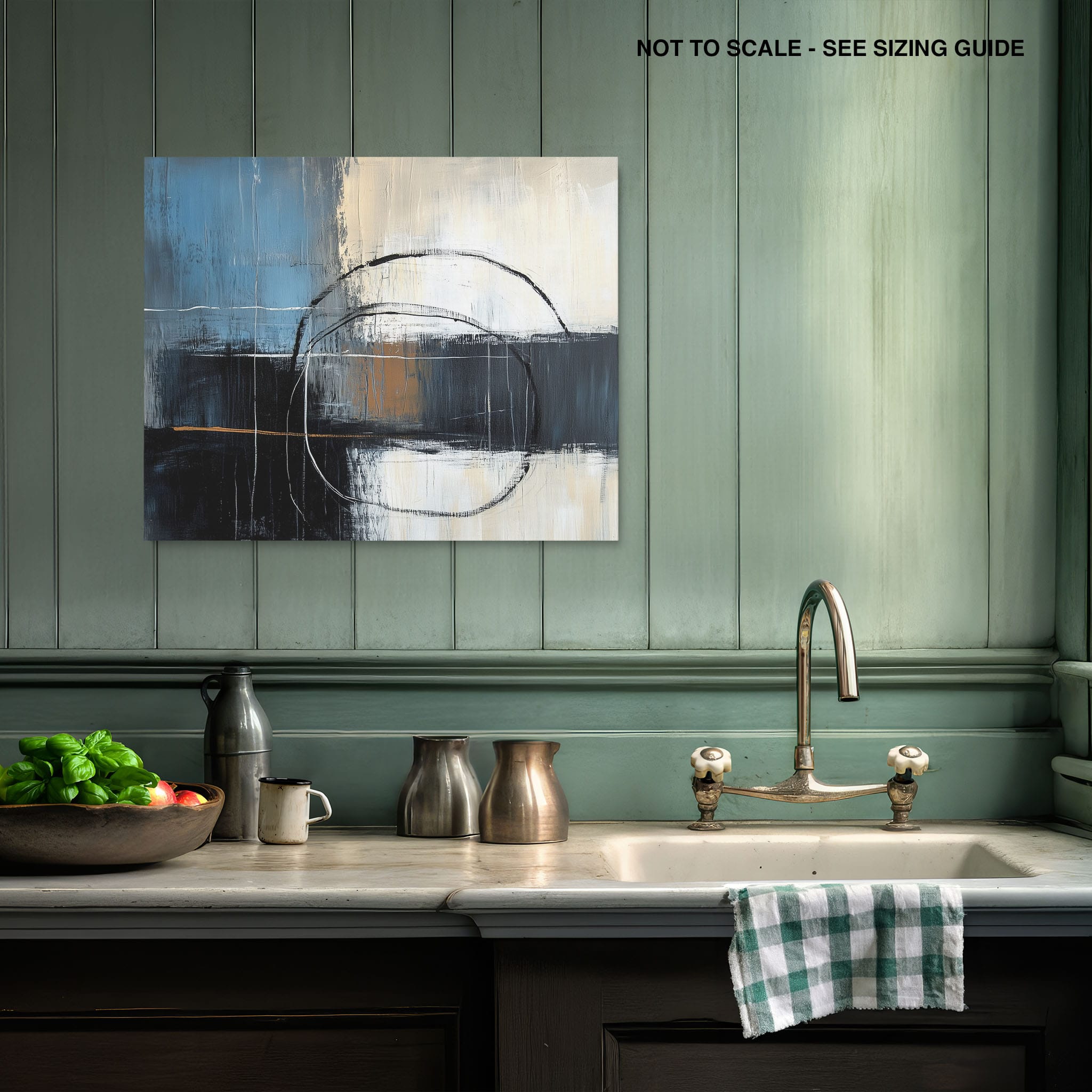 This painting draws you into a world of abstract modernism, where bold circular forms intersect with robust blocks of color. The deep blues and contrasting warm tones merge with pure white strokes, evoking a sense of depth and emotional resonance. This piece uses texture strategically to add dimension and intrigue, making it a standout addition to any space seeking a touch of sophistication and a contemporary flair. Enhance your home or office with this visually striking artwork that invites contemplation and conversation.