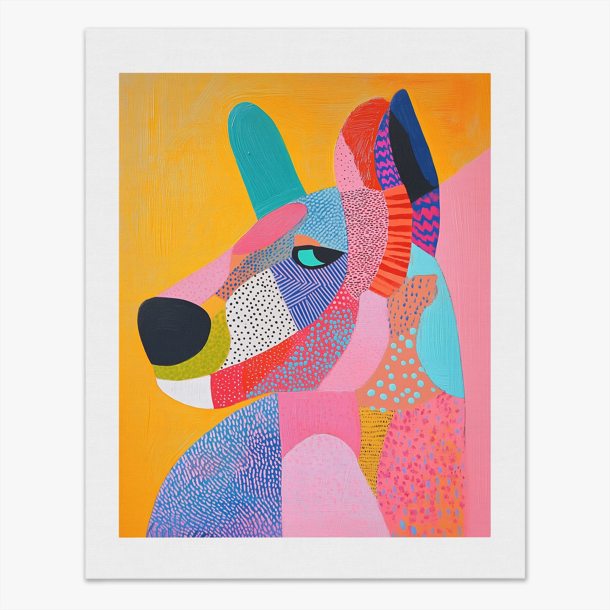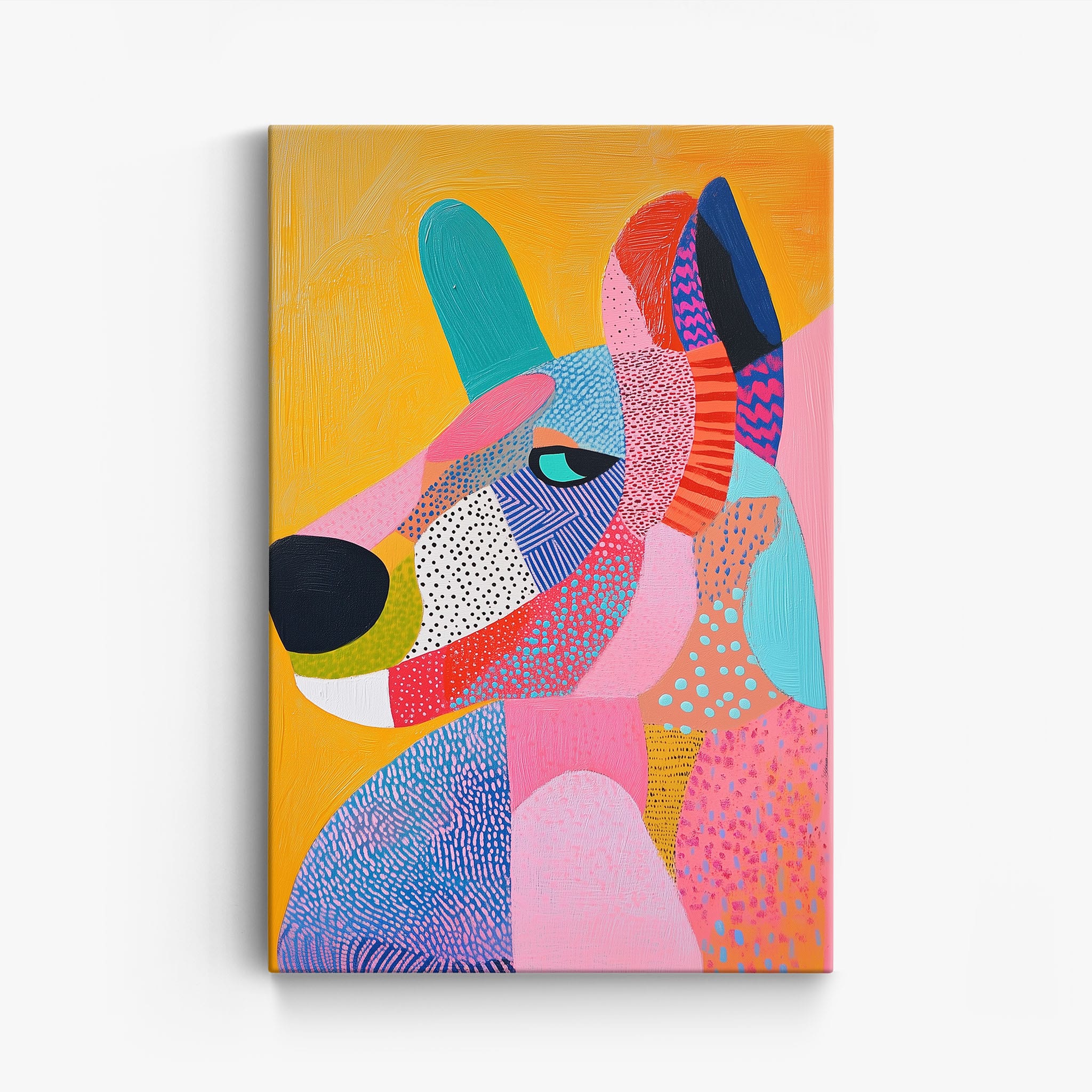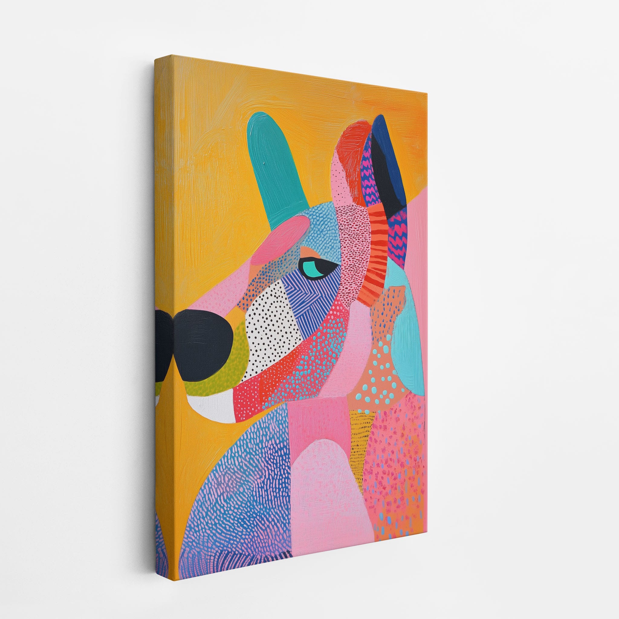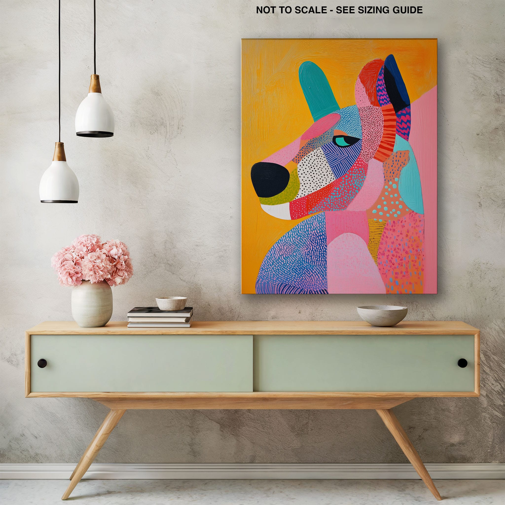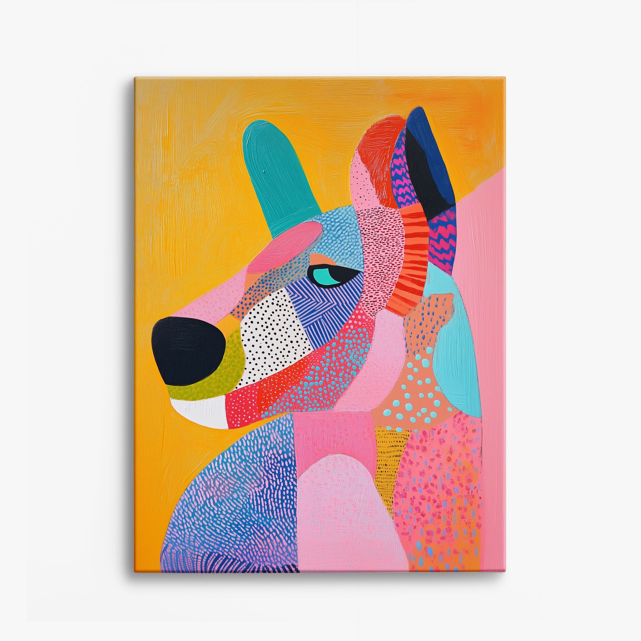This bold and vibrant painting showcases a stylized depiction of a canine composed of a mosaic of geometric shapes and a spectrum of warm tones contrasted against cool hues. The geometric composition, interspersed with patterns and intricate textures, lends a playful and contemporary flavor, fitting for modern interiors. Its large, expressive eye and abstract form make it a conversation starter and a focal piece for any room. Ideal for art lovers who appreciate animal-themed artworks with a twist of modern, geometric style. Refresh your living space with this eye-catching piece, certain to bring a burst of color and character.