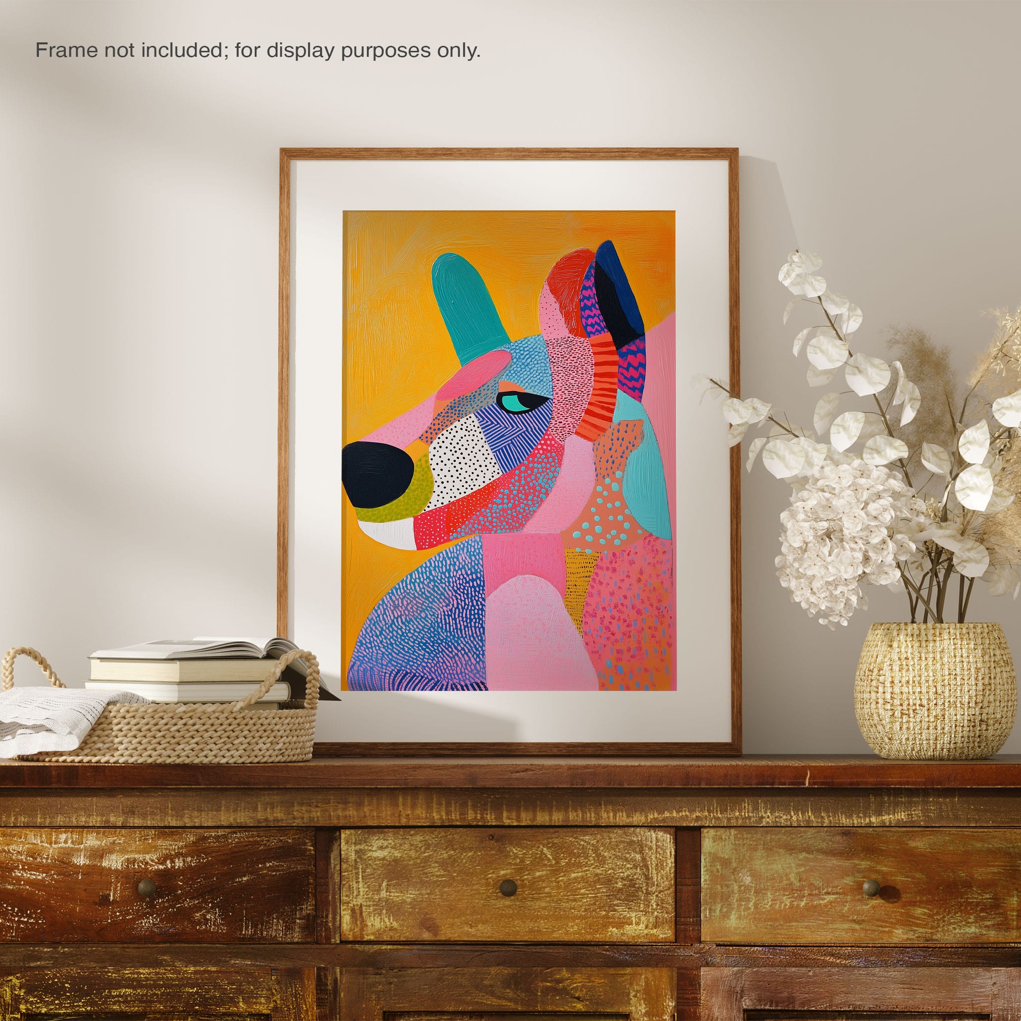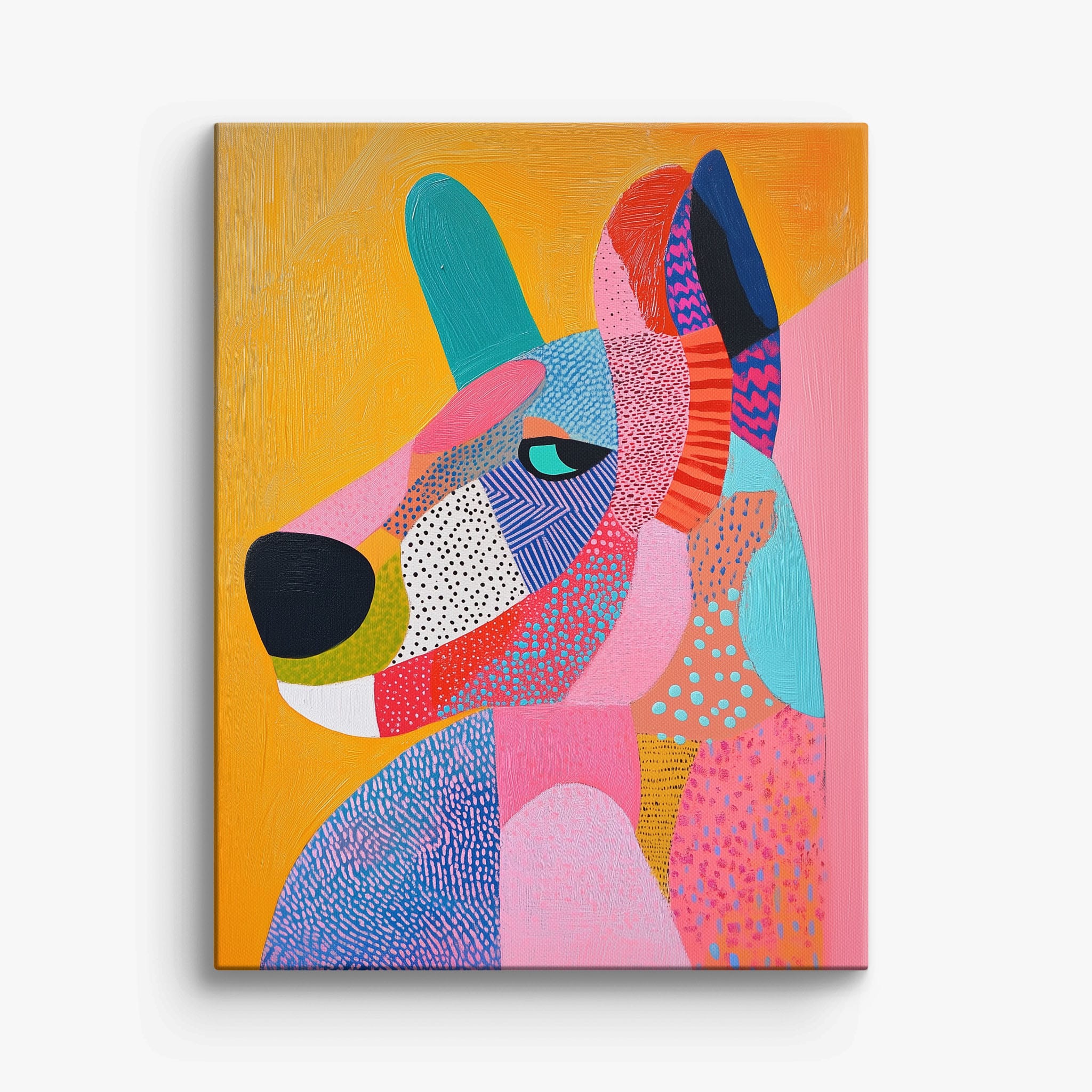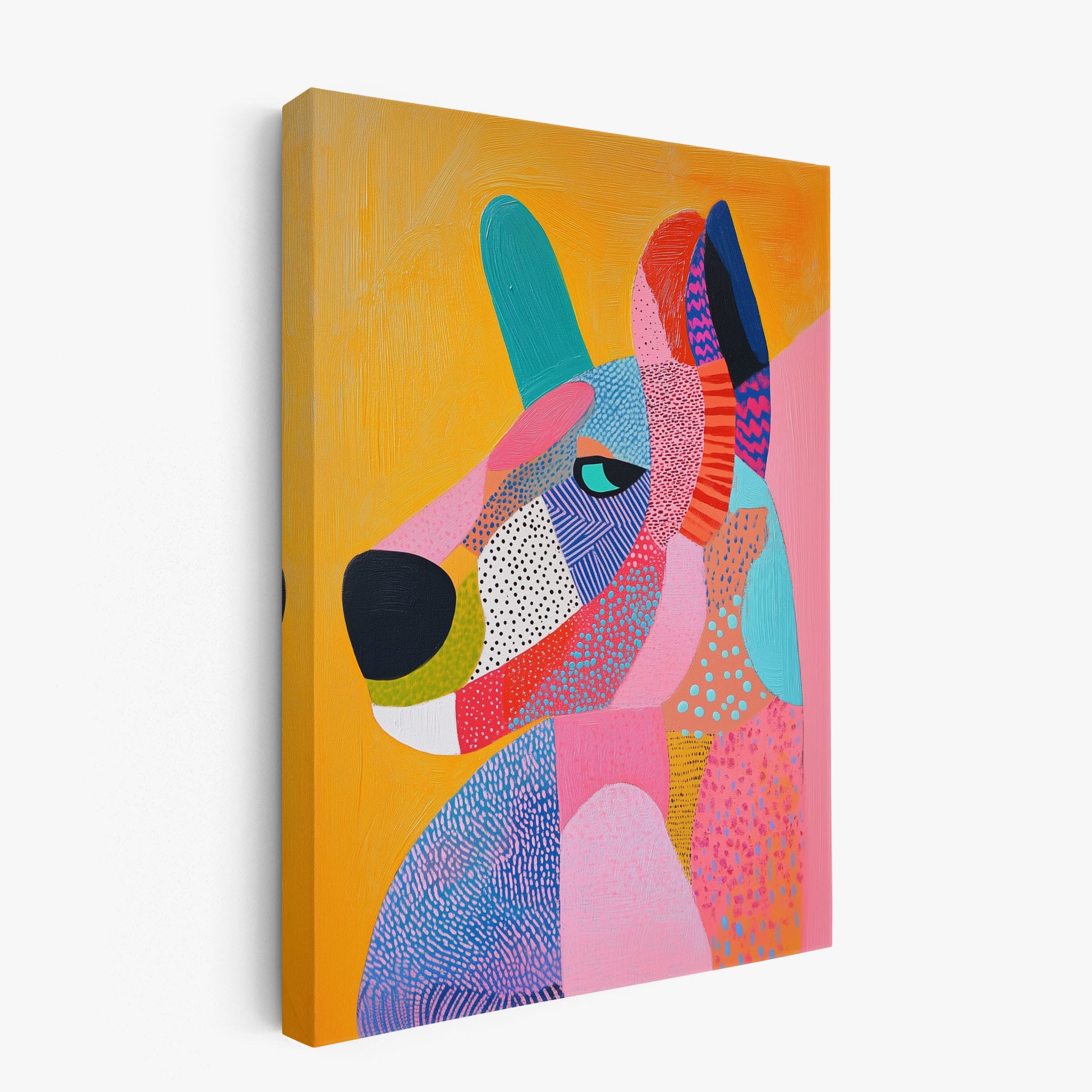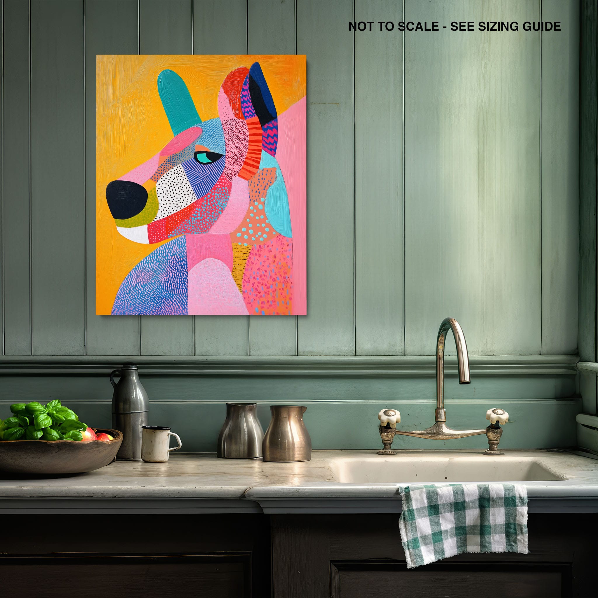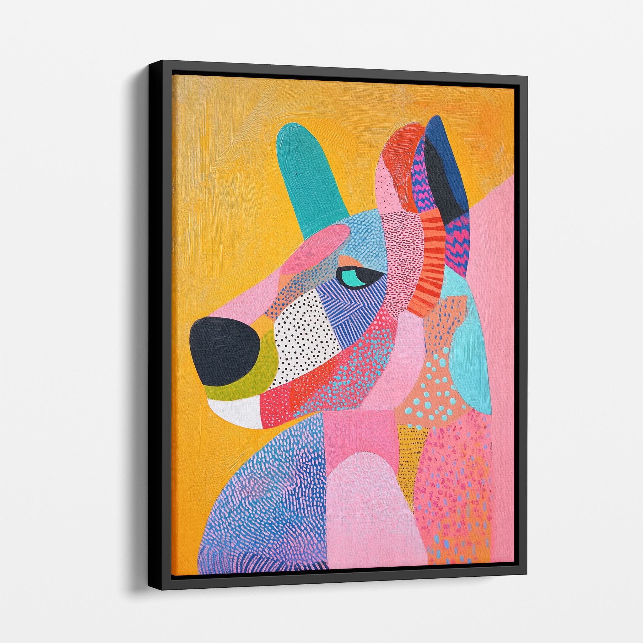 This bold and vibrant painting showcases a stylized depiction of a canine composed of a mosaic of geometric shapes and a spectrum of warm tones contrasted against cool hues. The geometric composition, interspersed with patterns and intricate textures, lends a playful and contemporary flavor, fitting for modern interiors. Its large, expressive eye and abstract form make it a conversation starter and a focal piece for any room. Ideal for art lovers who appreciate animal-themed artworks with a twist of modern, geometric style. Refresh your living space with this eye-catching piece, certain to bring a burst of color and character.