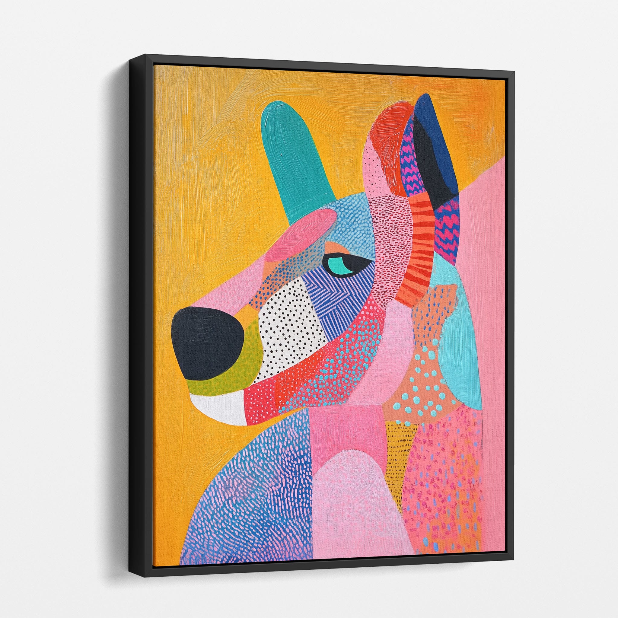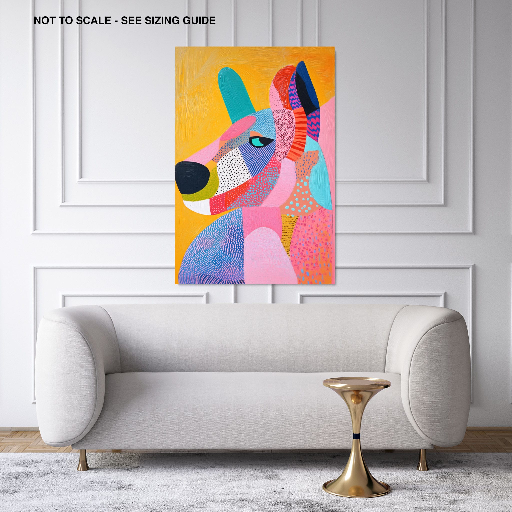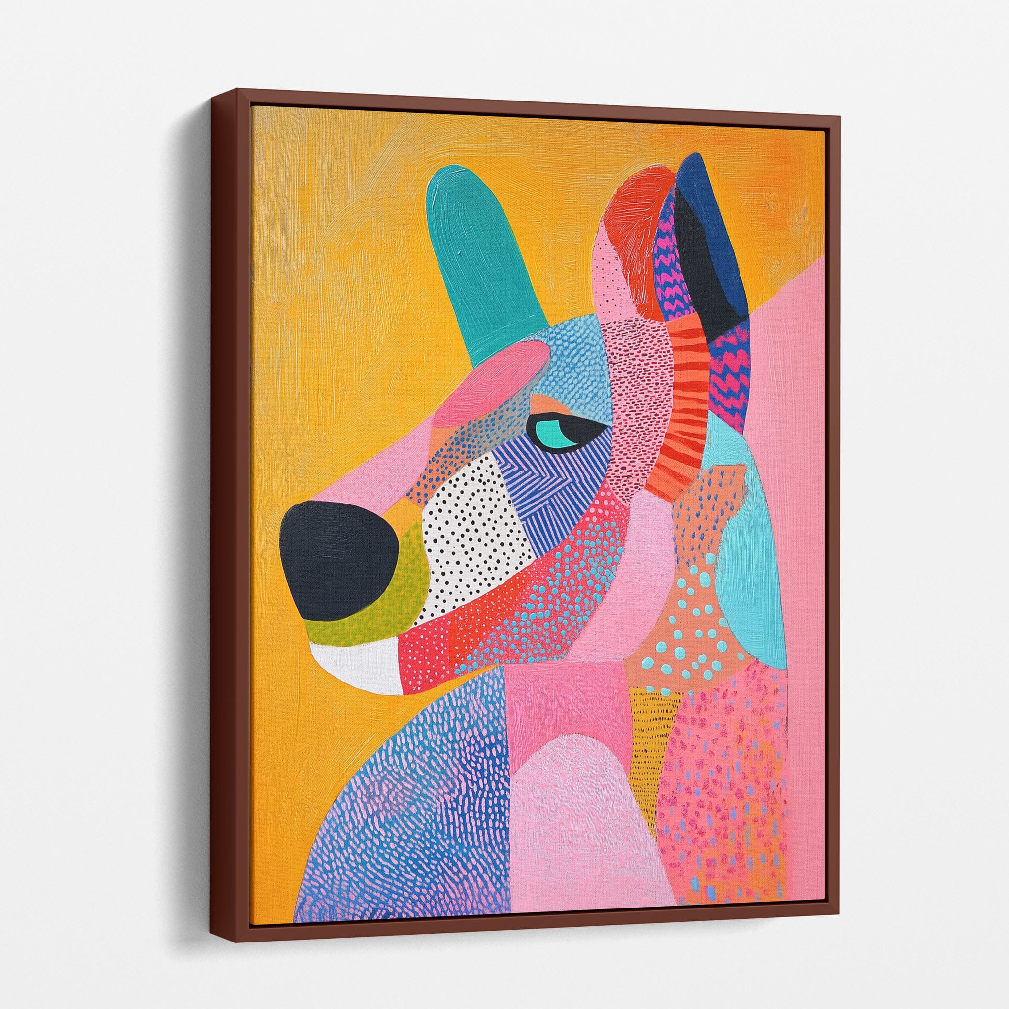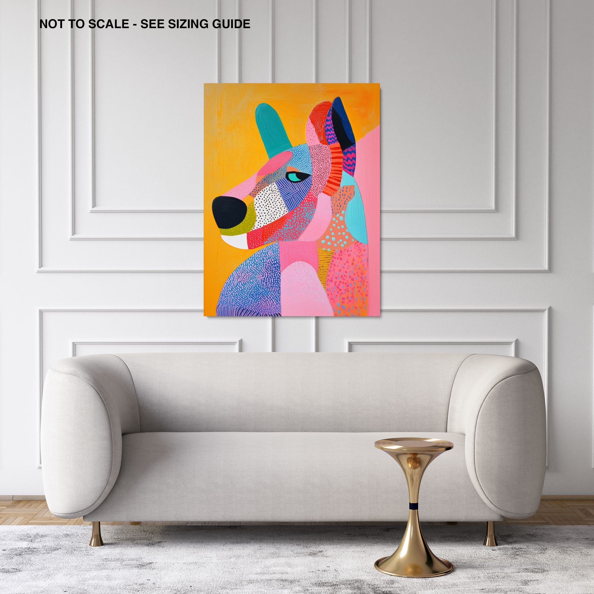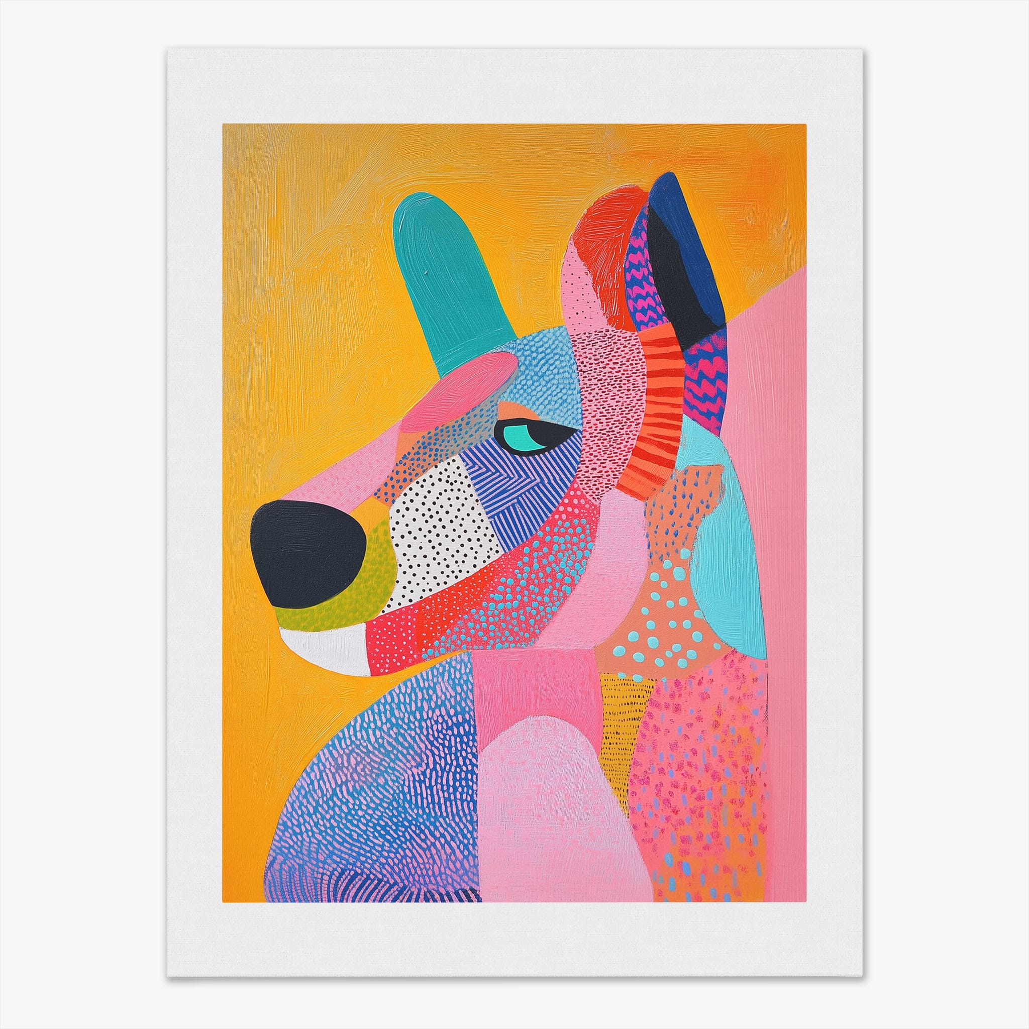 This bold and vibrant painting showcases a stylized depiction of a canine composed of a mosaic of geometric shapes and a spectrum of warm tones contrasted against cool hues. The geometric composition, interspersed with patterns and intricate textures, lends a playful and contemporary flavor, fitting for modern interiors. Its large, expressive eye and abstract form make it a conversation starter and a focal piece for any room. Ideal for art lovers who appreciate animal-themed artworks with a twist of modern, geometric style. Refresh your living space with this eye-catching piece, certain to bring a burst of color and character.
