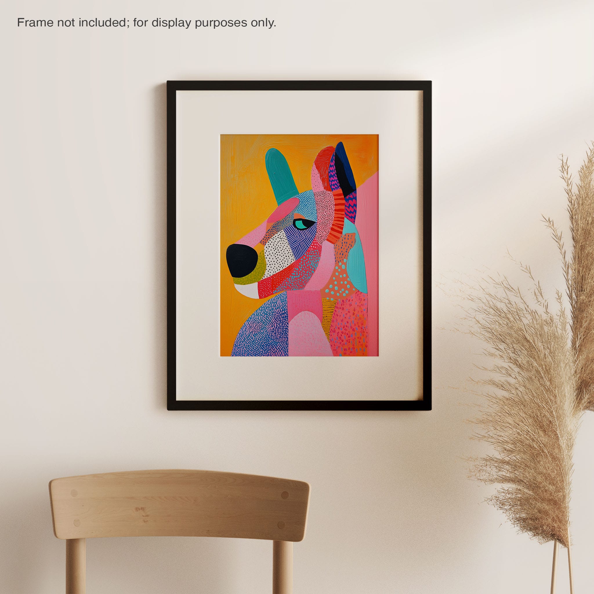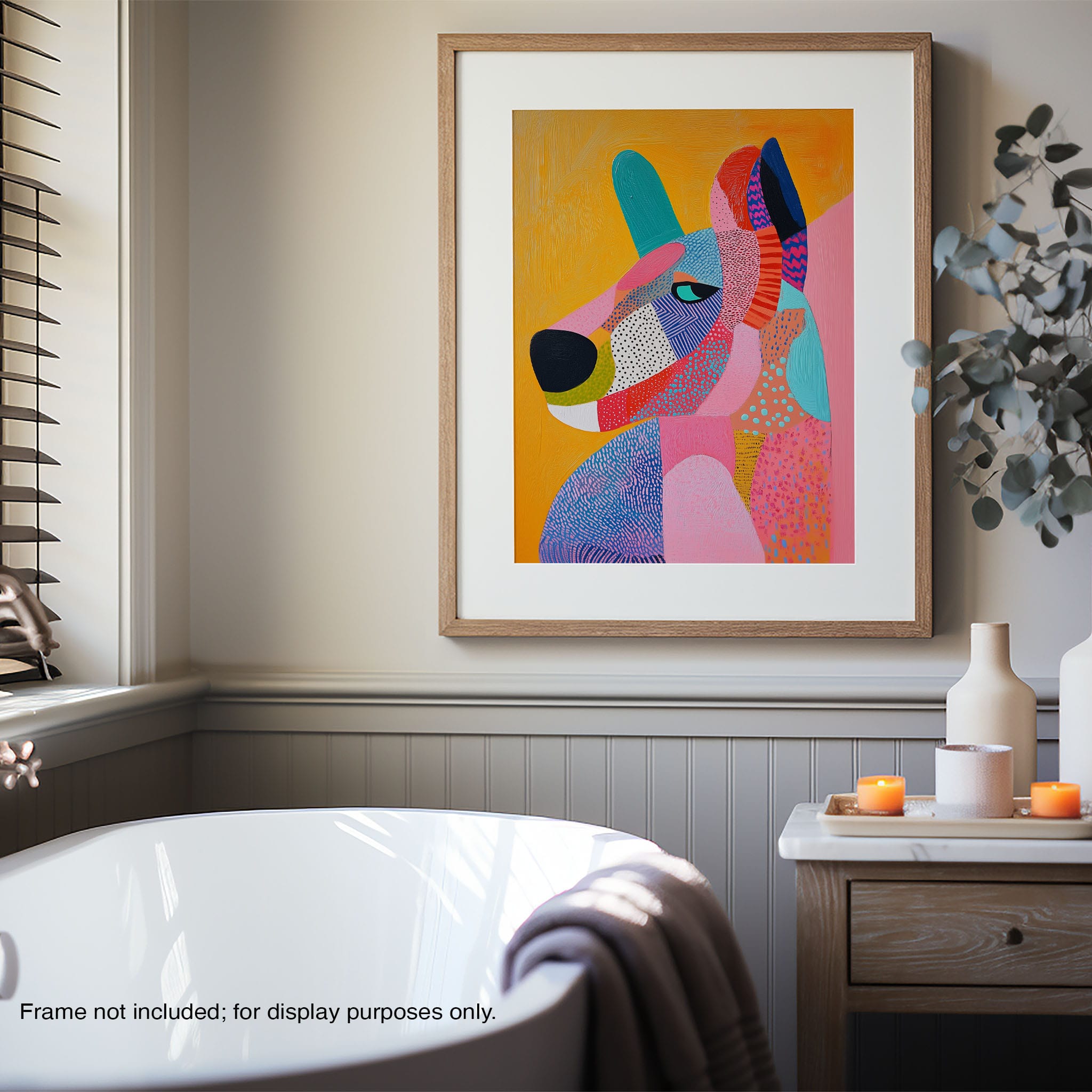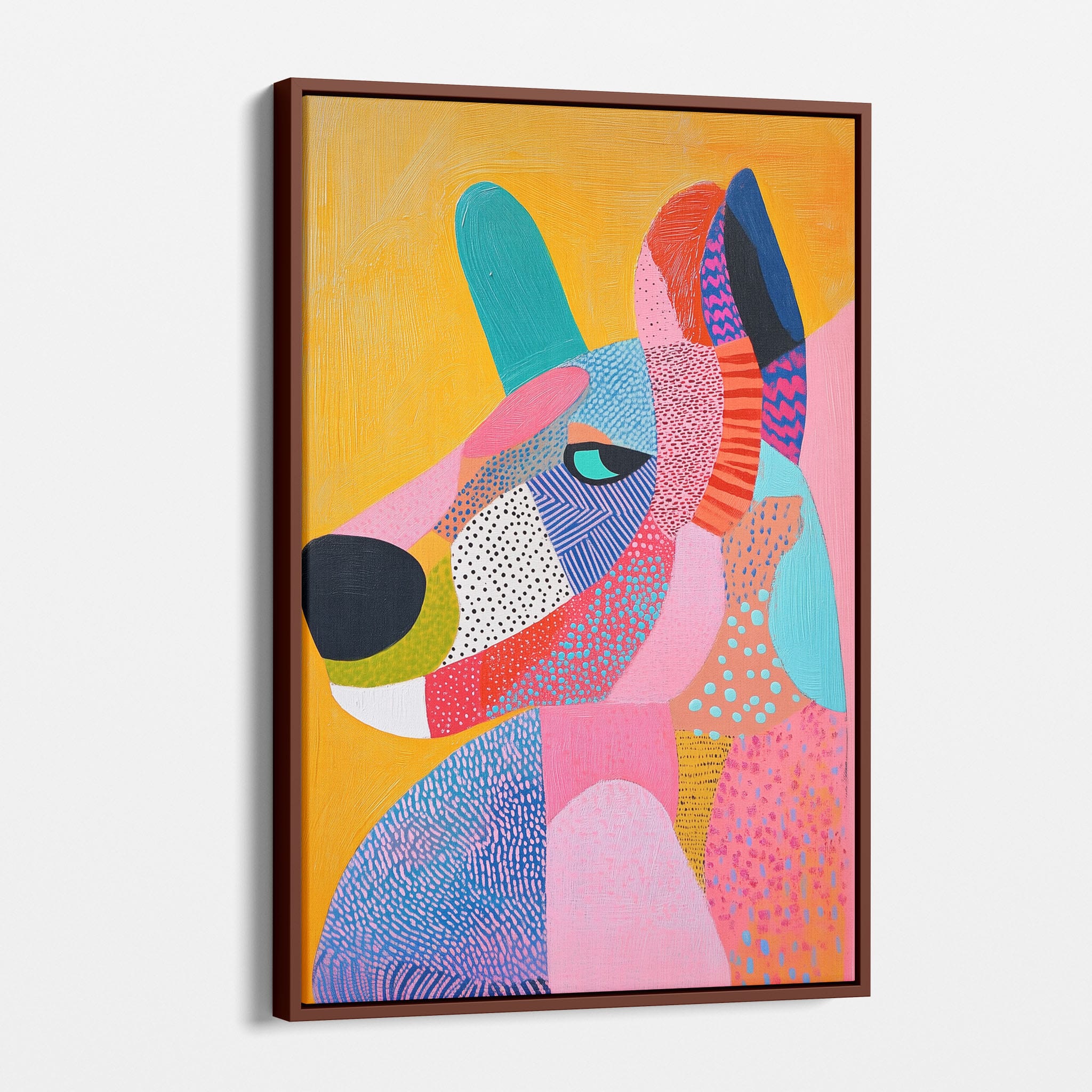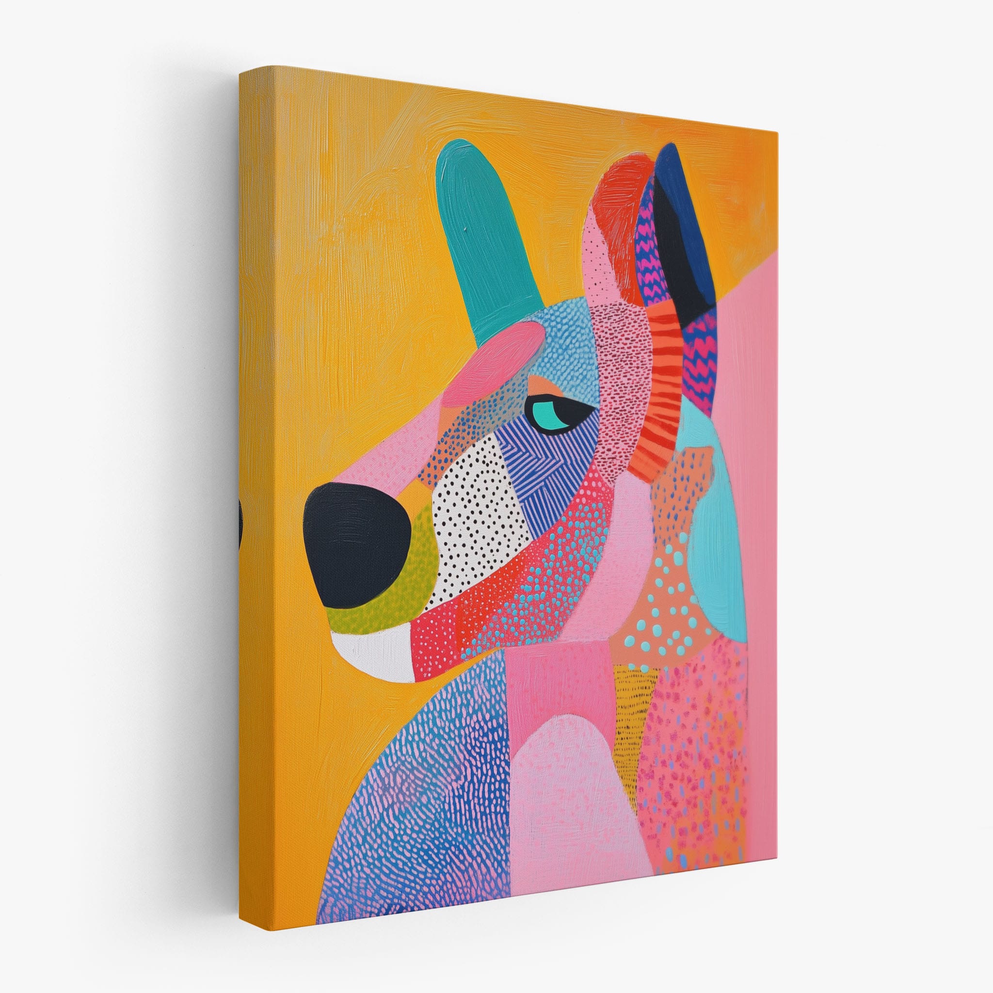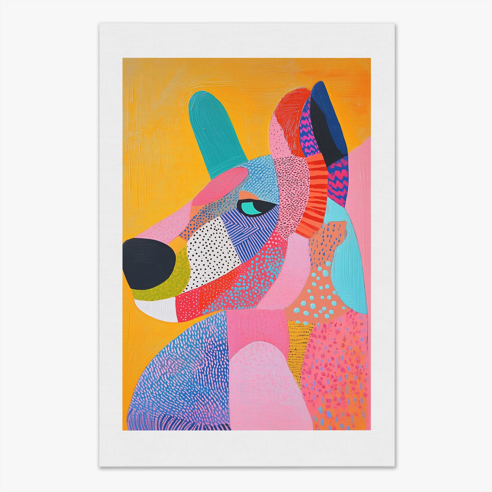 This bold and vibrant painting showcases a stylized depiction of a canine composed of a mosaic of geometric shapes and a spectrum of warm tones contrasted against cool hues. The geometric composition, interspersed with patterns and intricate textures, lends a playful and contemporary flavor, fitting for modern interiors. Its large, expressive eye and abstract form make it a conversation starter and a focal piece for any room. Ideal for art lovers who appreciate animal-themed artworks with a twist of modern, geometric style. Refresh your living space with this eye-catching piece, certain to bring a burst of color and character.