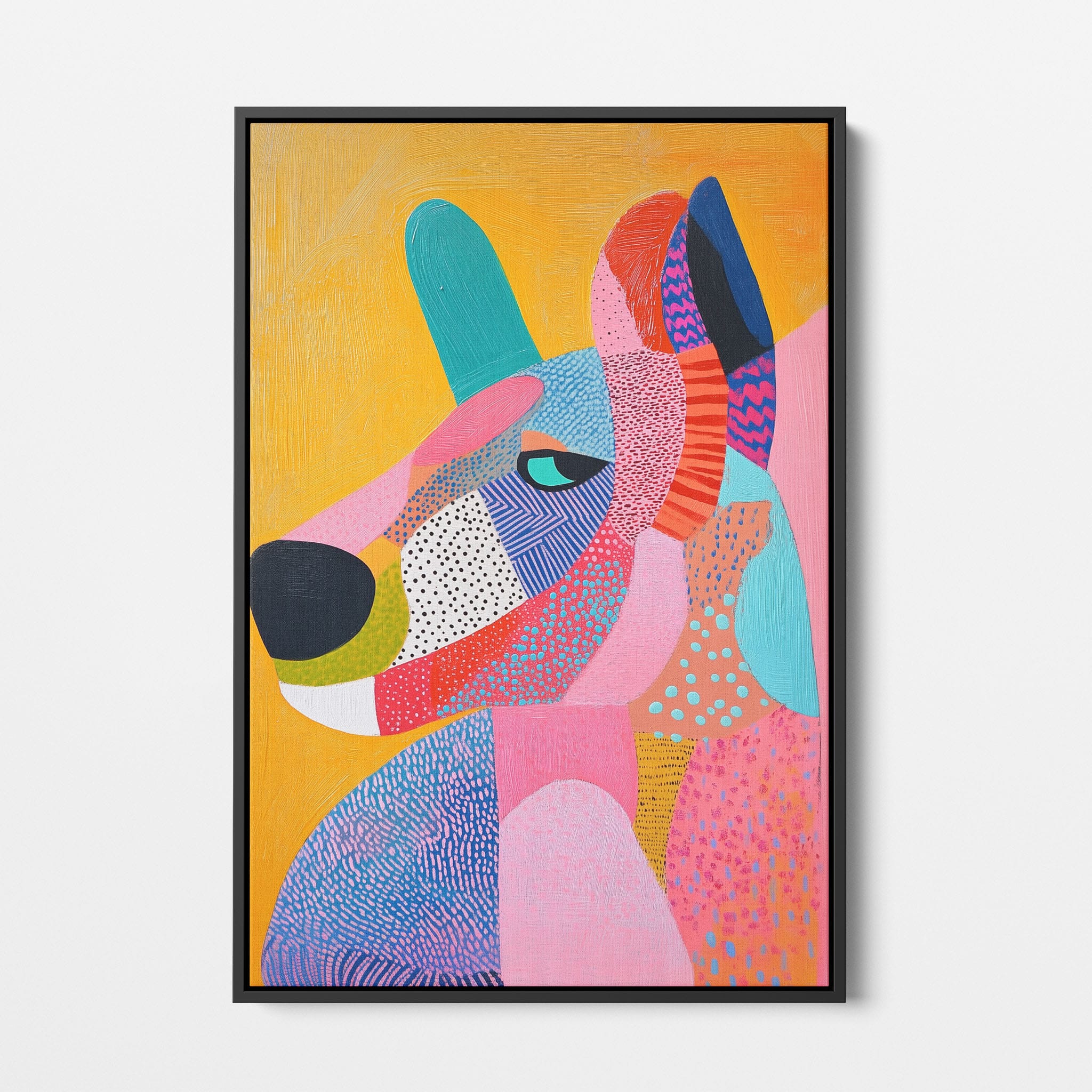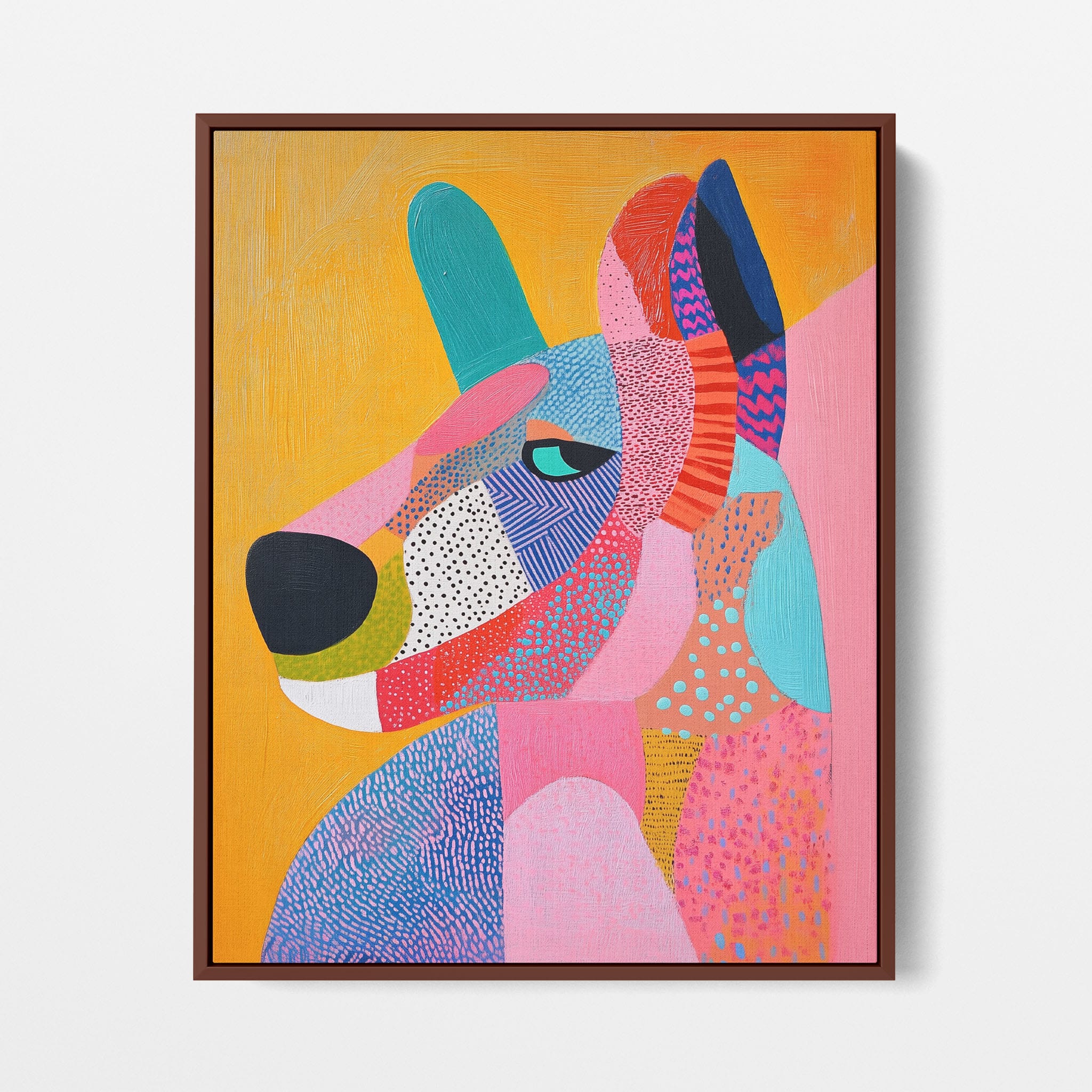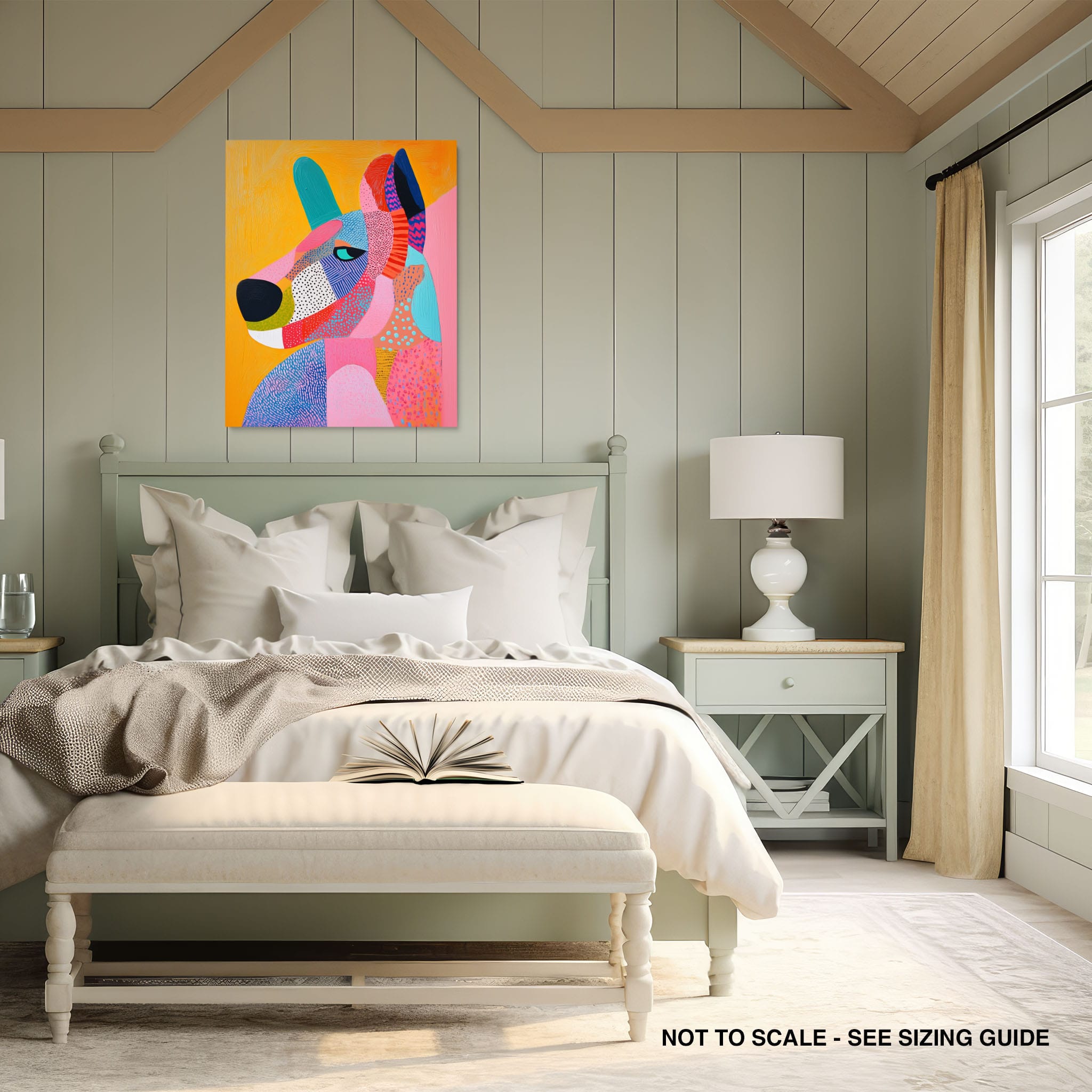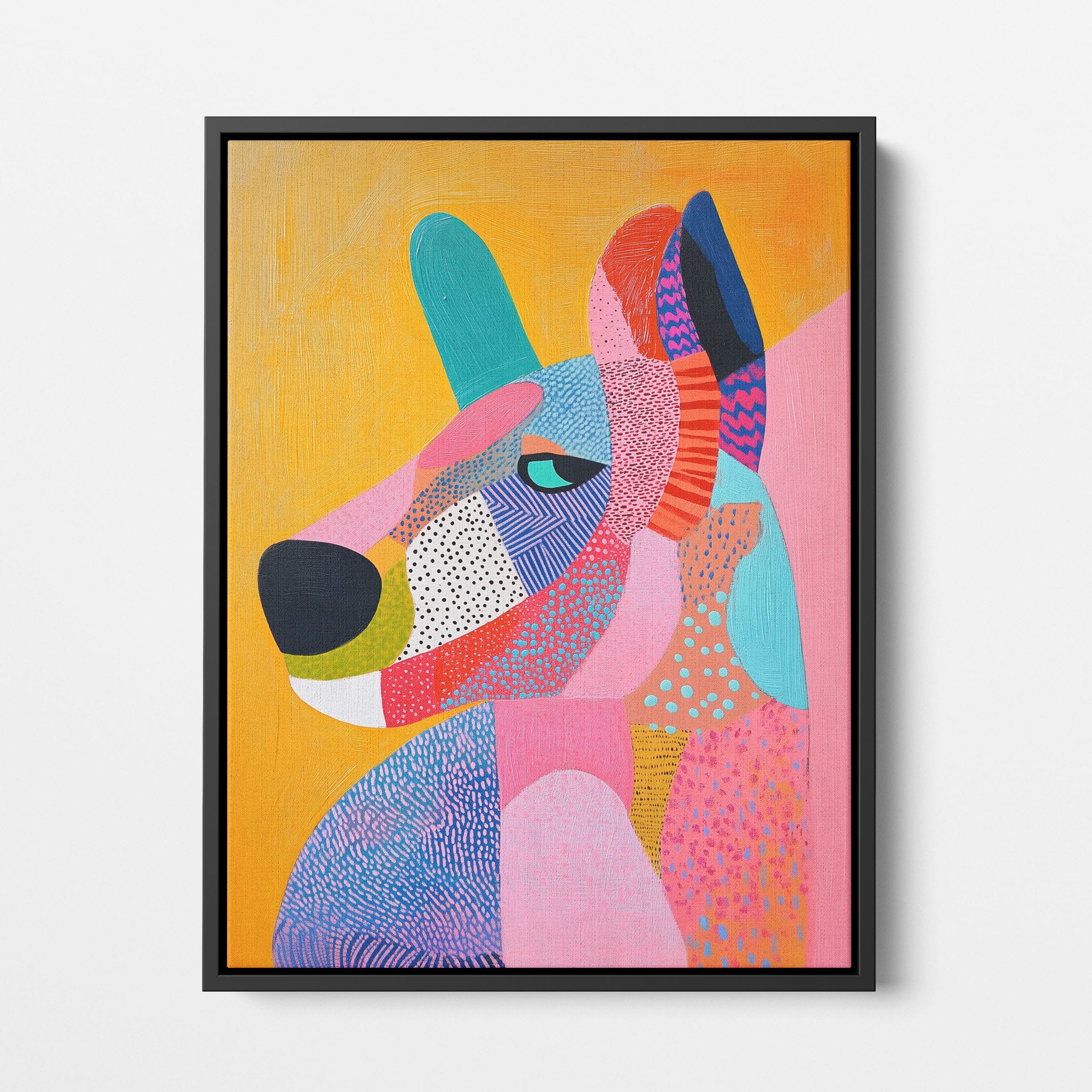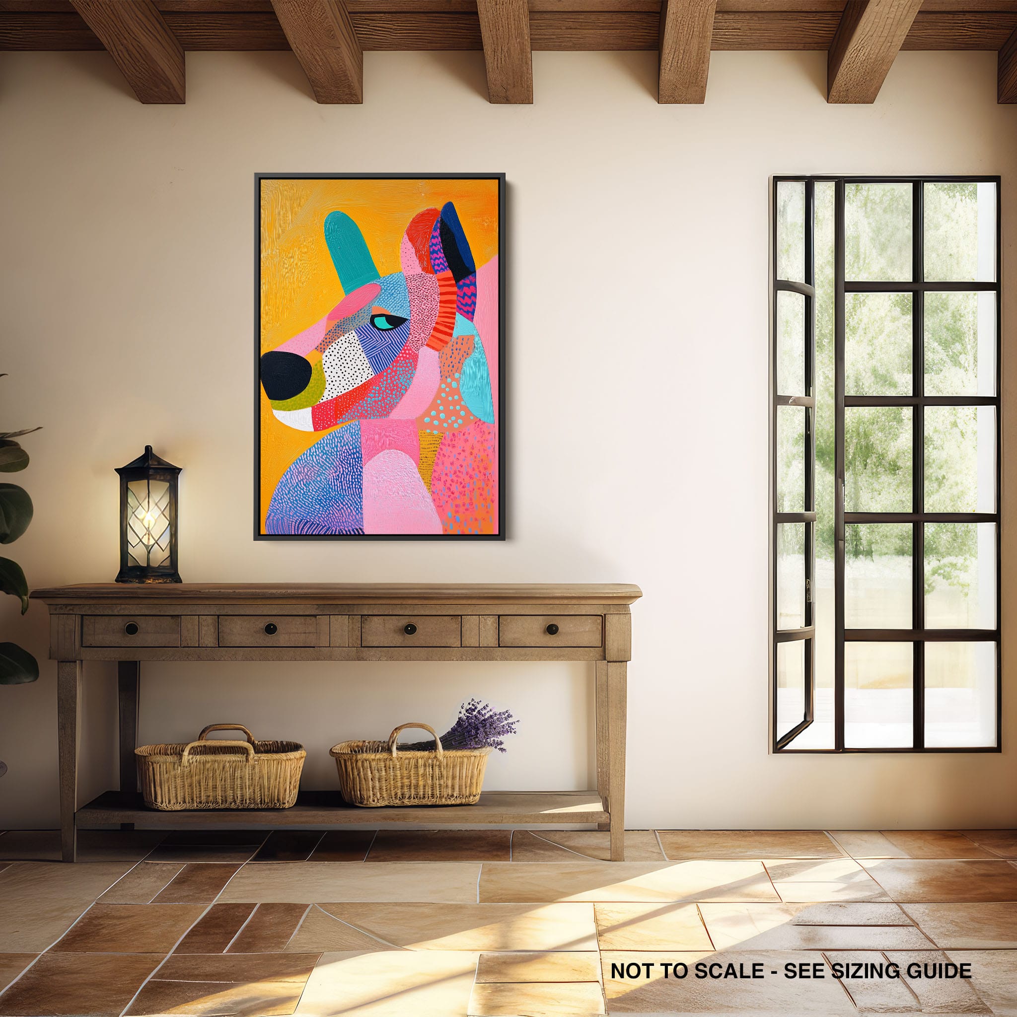 This bold and vibrant painting showcases a stylized depiction of a canine composed of a mosaic of geometric shapes and a spectrum of warm tones contrasted against cool hues. The geometric composition, interspersed with patterns and intricate textures, lends a playful and contemporary flavor, fitting for modern interiors. Its large, expressive eye and abstract form make it a conversation starter and a focal piece for any room. Ideal for art lovers who appreciate animal-themed artworks with a twist of modern, geometric style. Refresh your living space with this eye-catching piece, certain to bring a burst of color and character.
