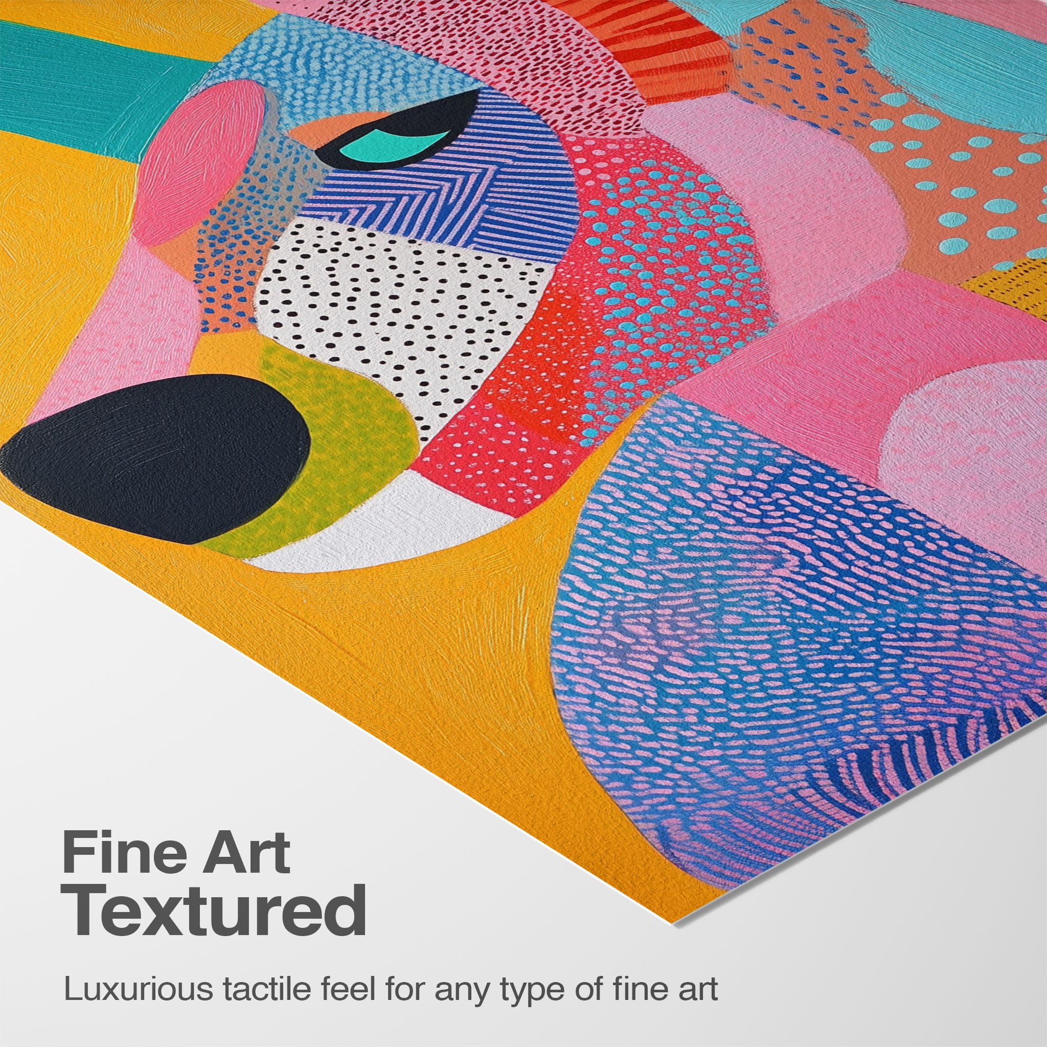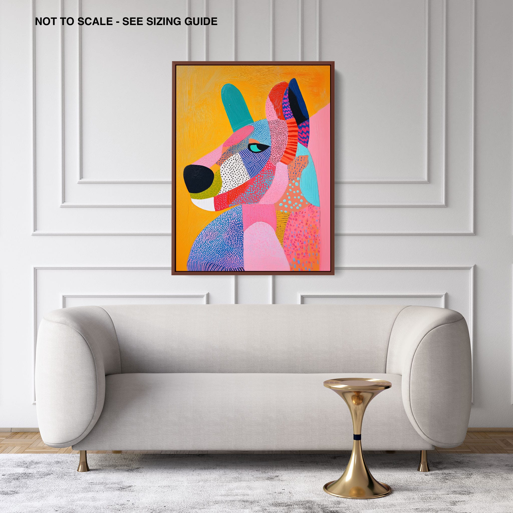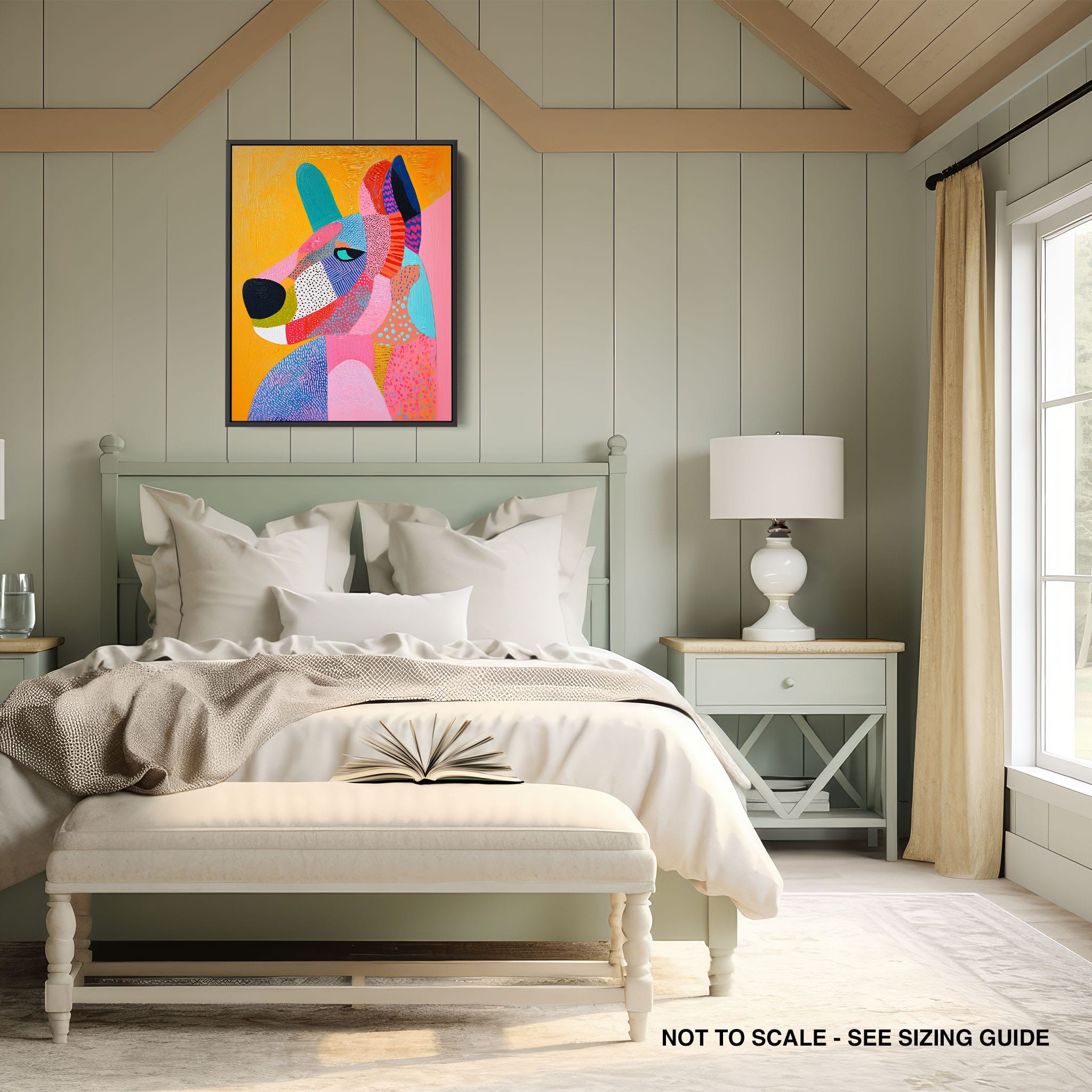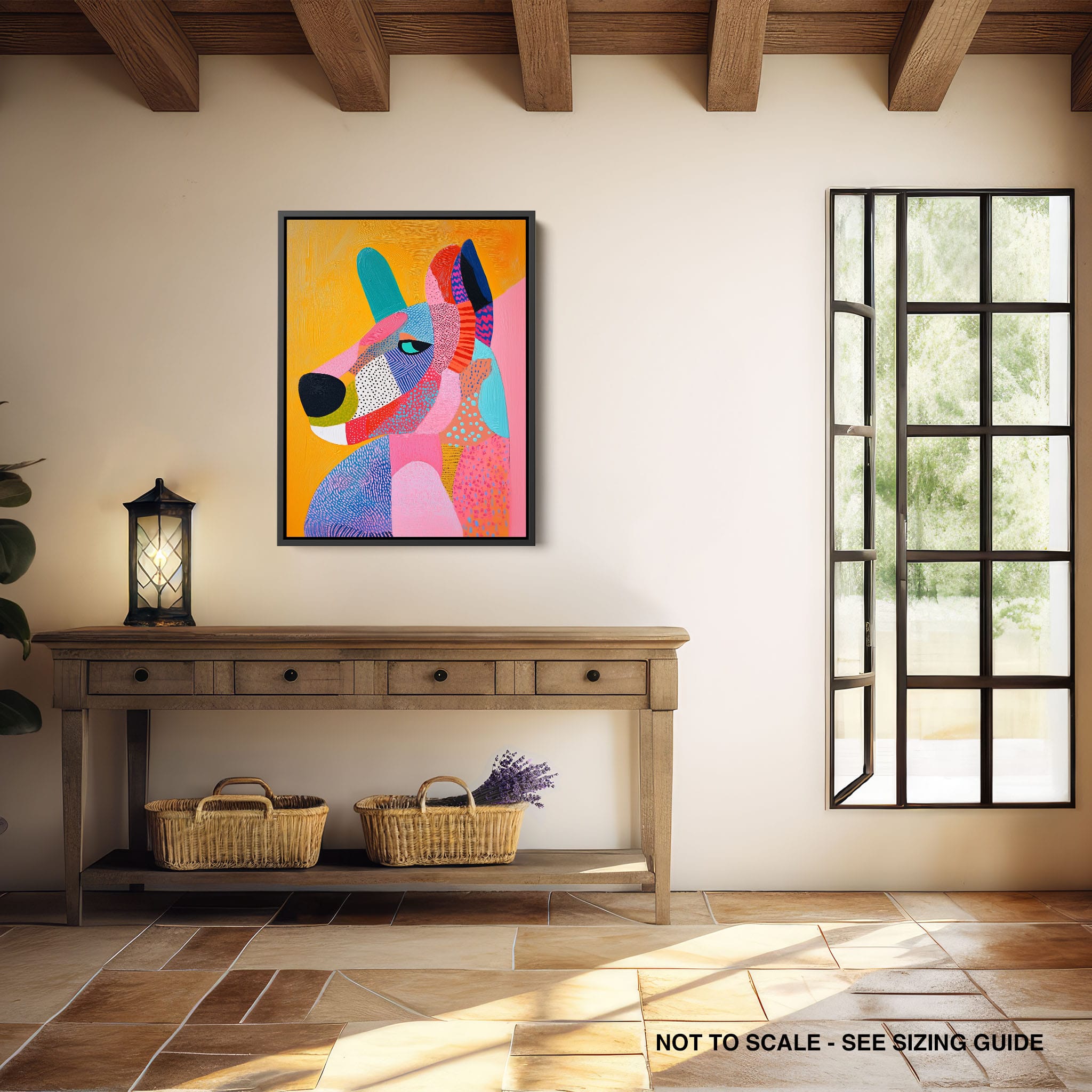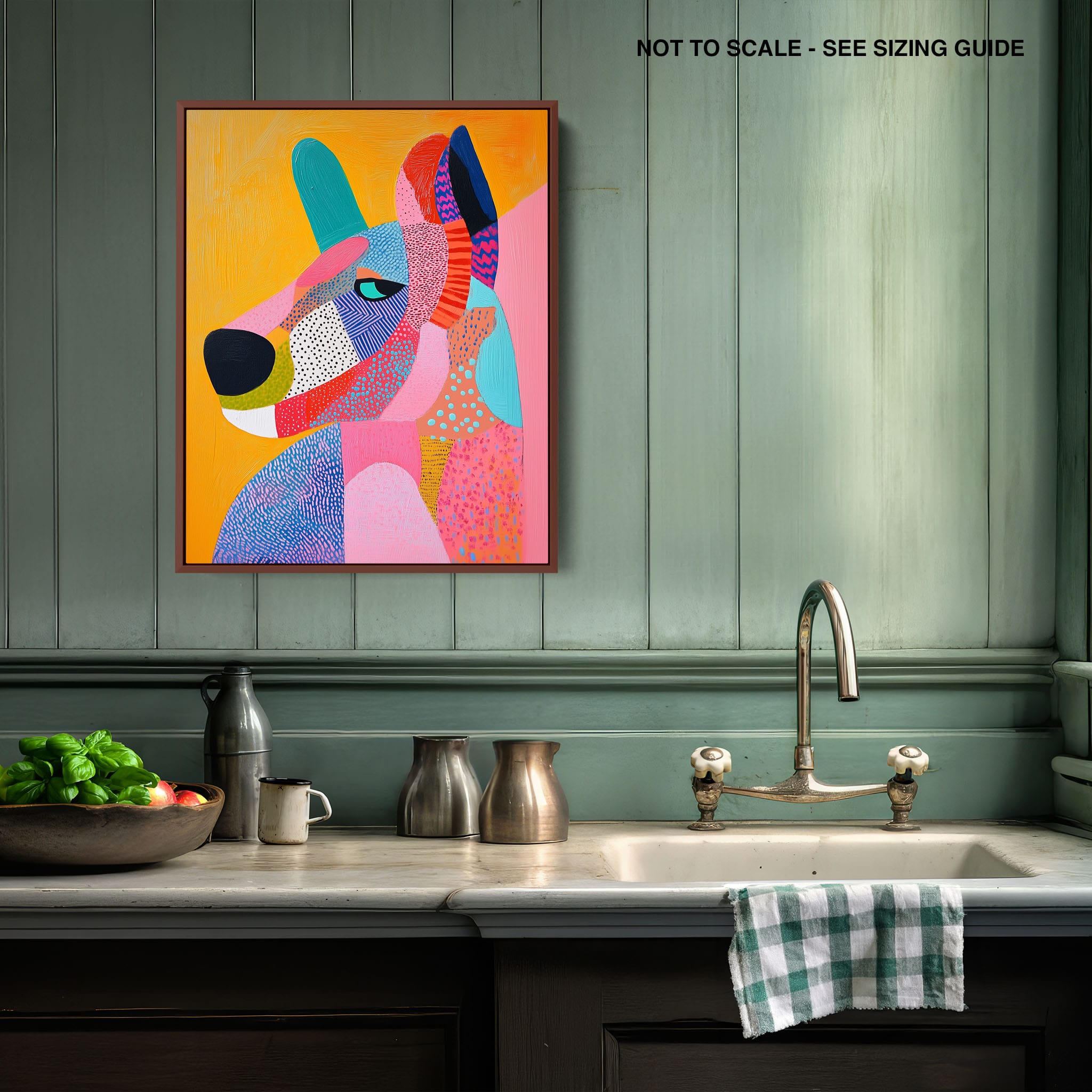 This bold and vibrant painting showcases a stylized depiction of a canine composed of a mosaic of geometric shapes and a spectrum of warm tones contrasted against cool hues. The geometric composition, interspersed with patterns and intricate textures, lends a playful and contemporary flavor, fitting for modern interiors. Its large, expressive eye and abstract form make it a conversation starter and a focal piece for any room. Ideal for art lovers who appreciate animal-themed artworks with a twist of modern, geometric style. Refresh your living space with this eye-catching piece, certain to bring a burst of color and character.