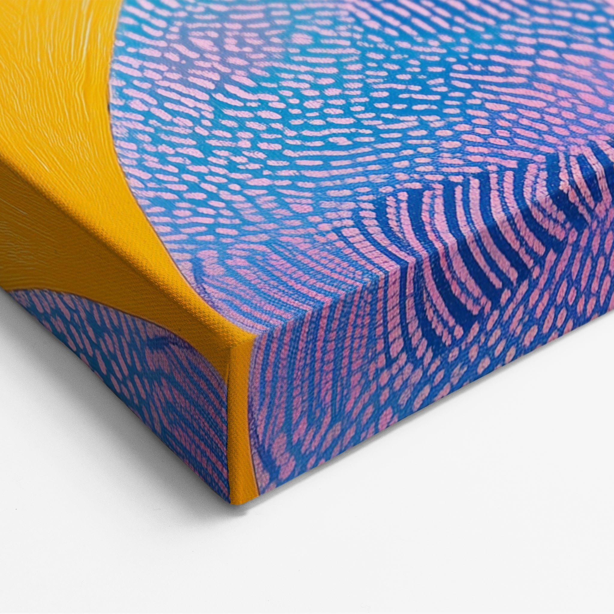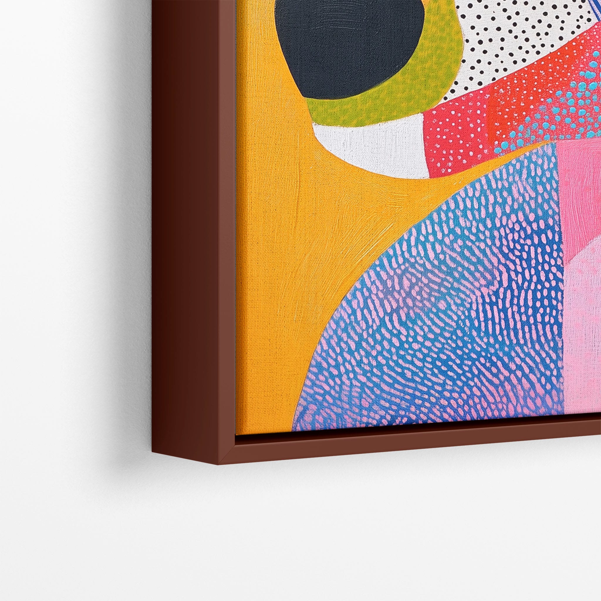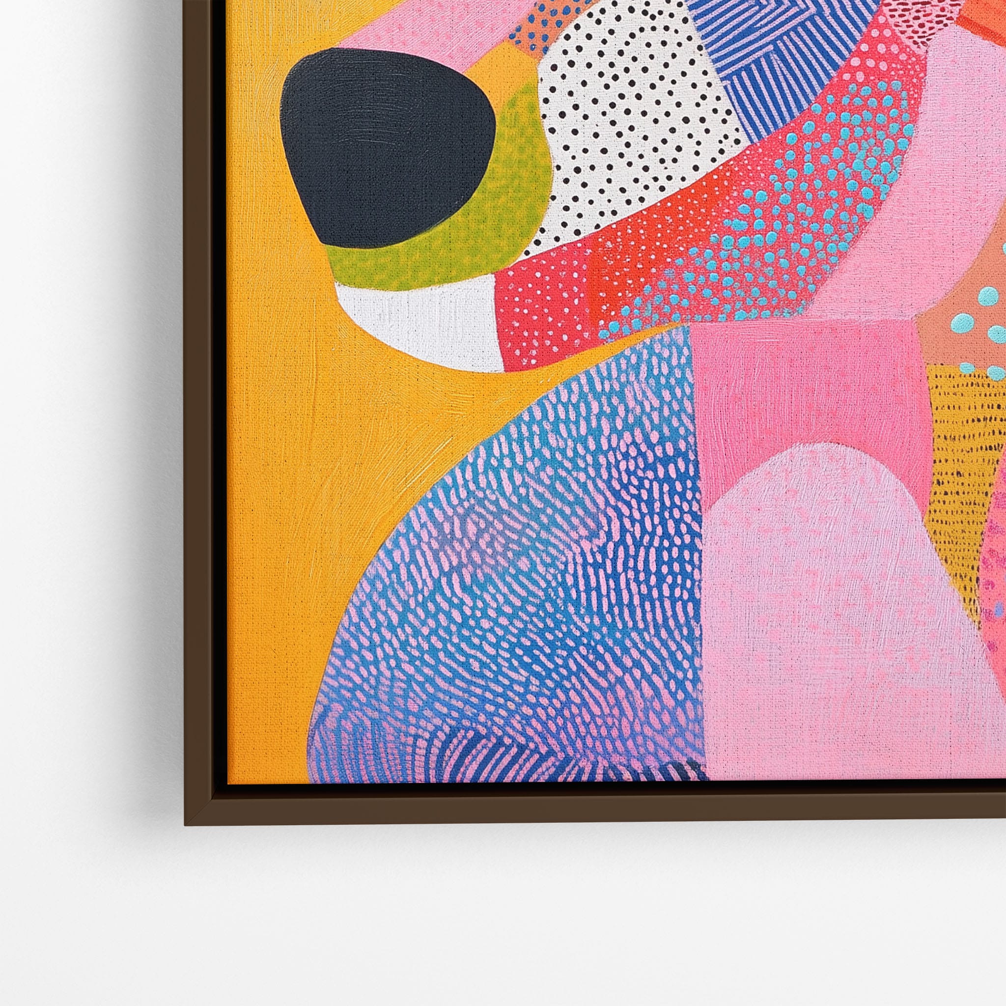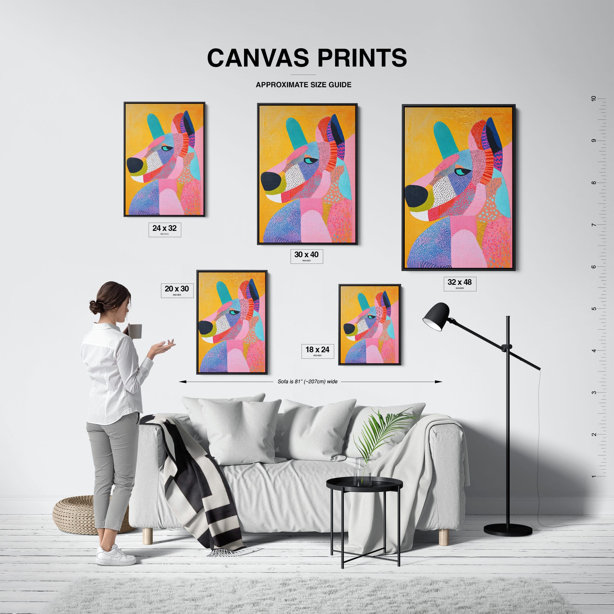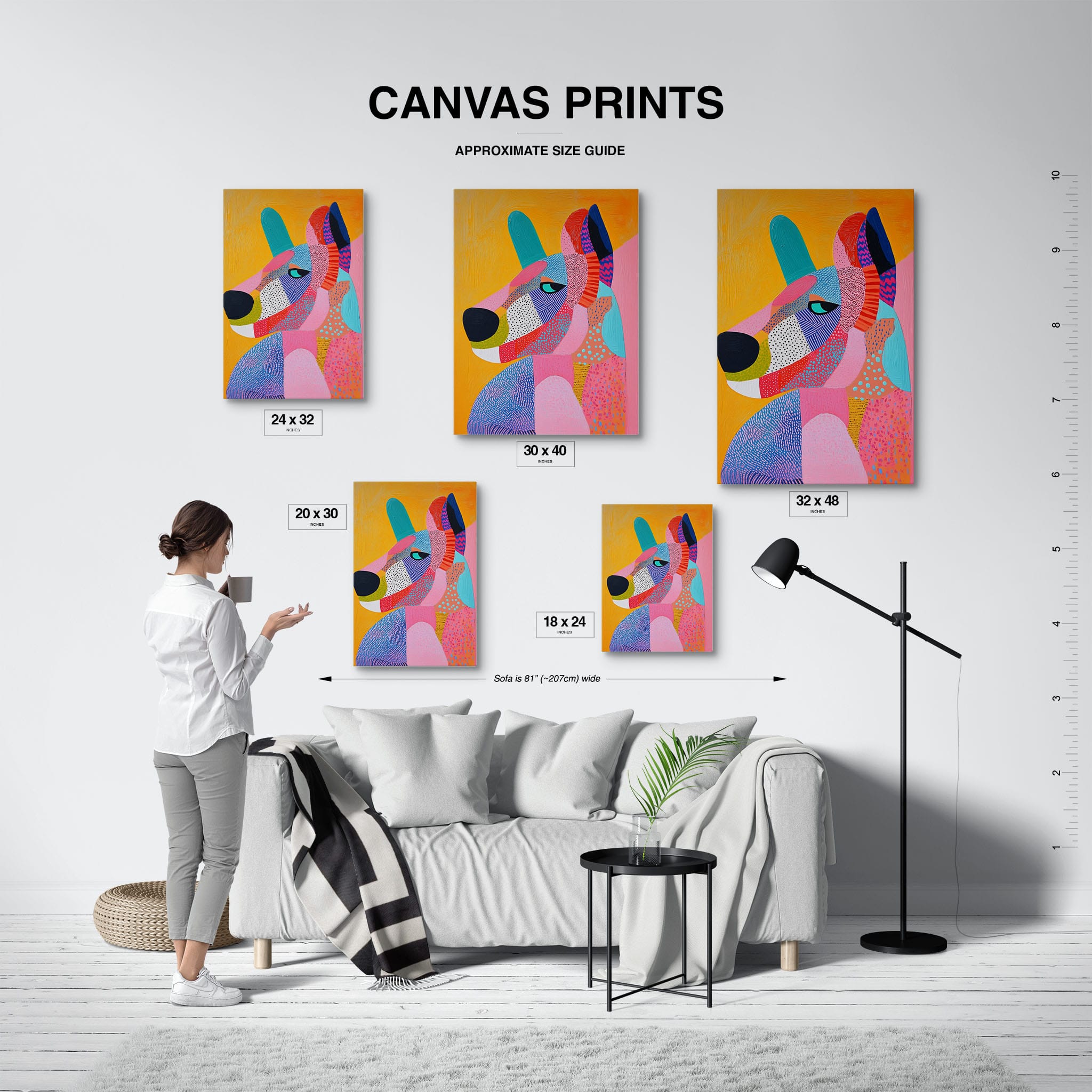 This bold and vibrant painting showcases a stylized depiction of a canine composed of a mosaic of geometric shapes and a spectrum of warm tones contrasted against cool hues. The geometric composition, interspersed with patterns and intricate textures, lends a playful and contemporary flavor, fitting for modern interiors. Its large, expressive eye and abstract form make it a conversation starter and a focal piece for any room. Ideal for art lovers who appreciate animal-themed artworks with a twist of modern, geometric style. Refresh your living space with this eye-catching piece, certain to bring a burst of color and character.