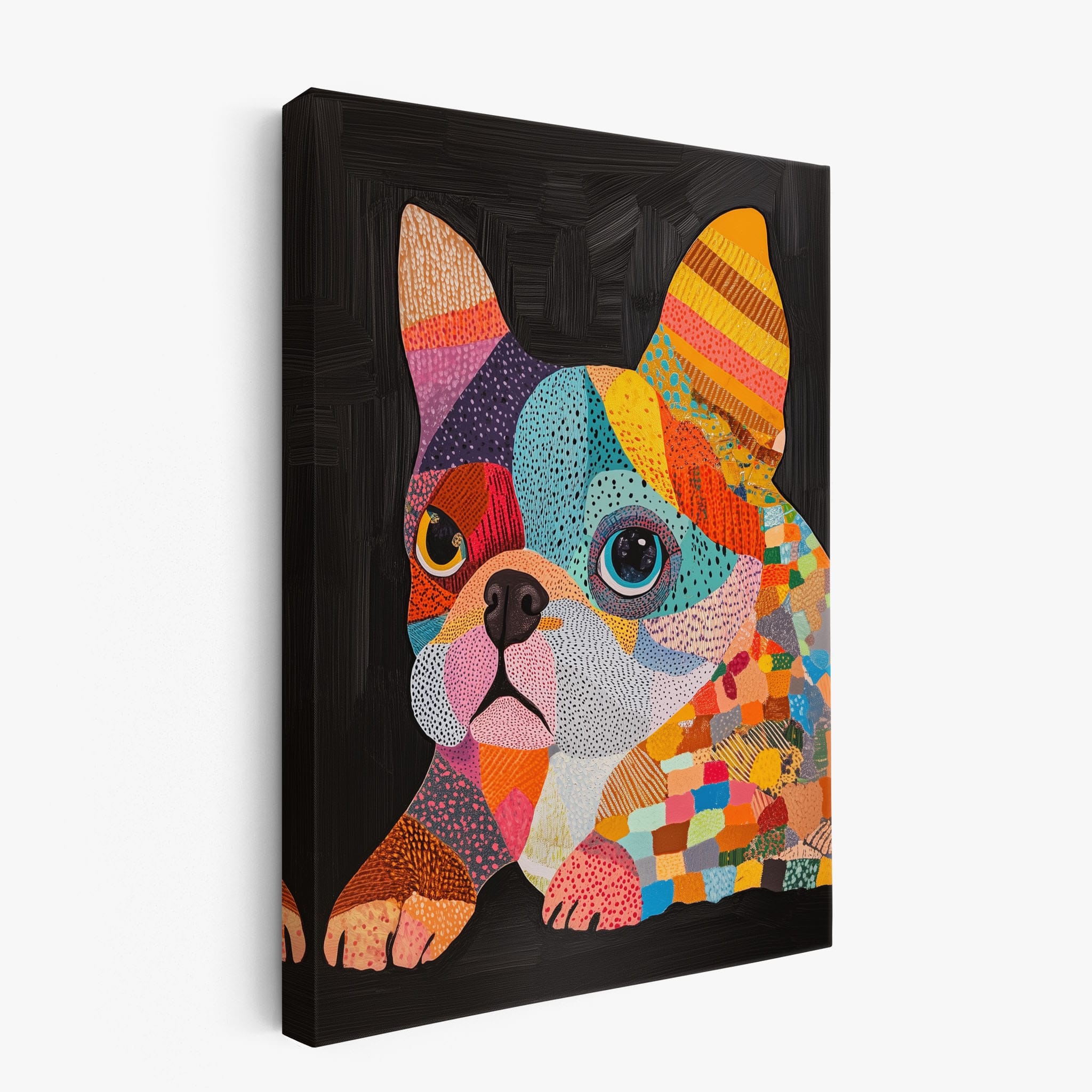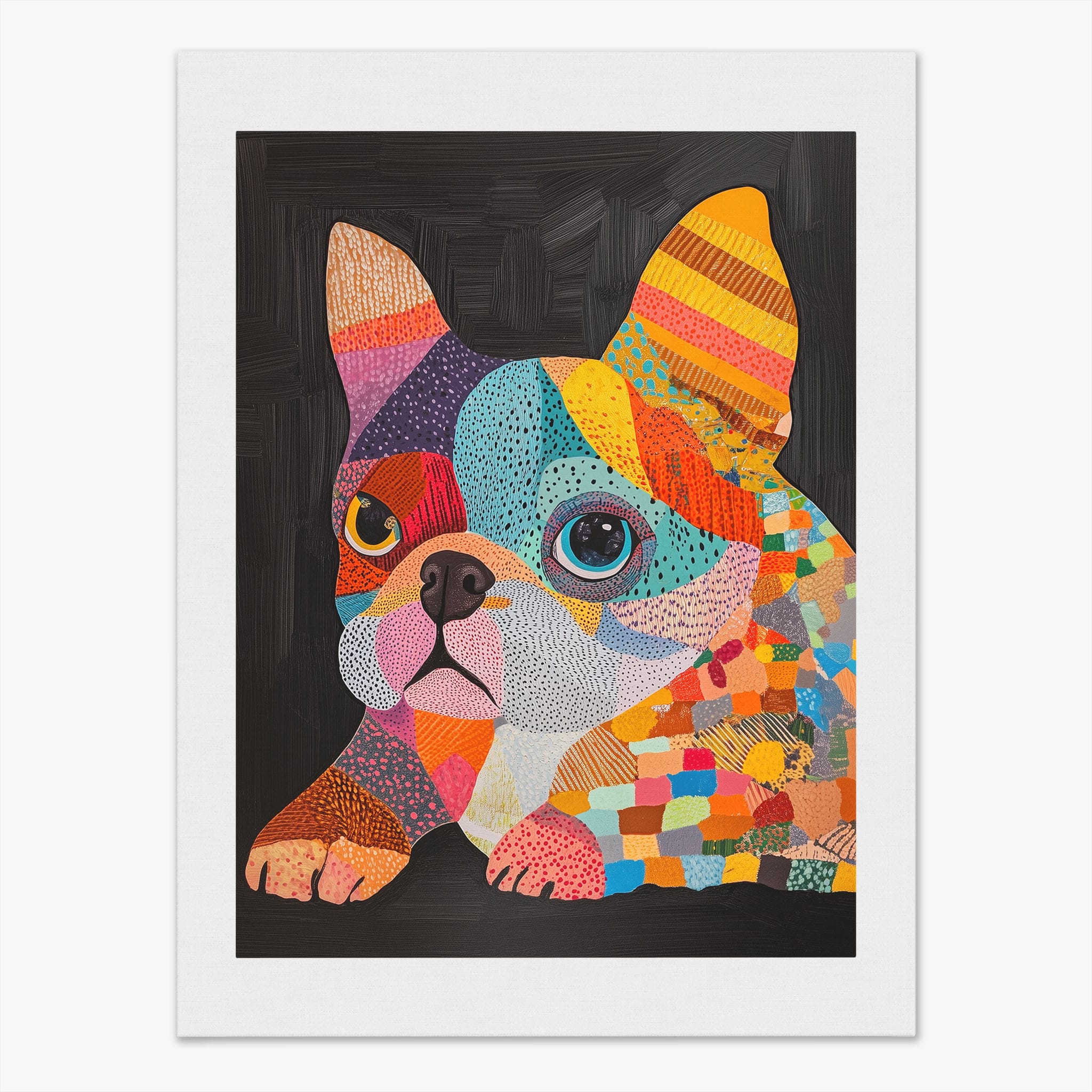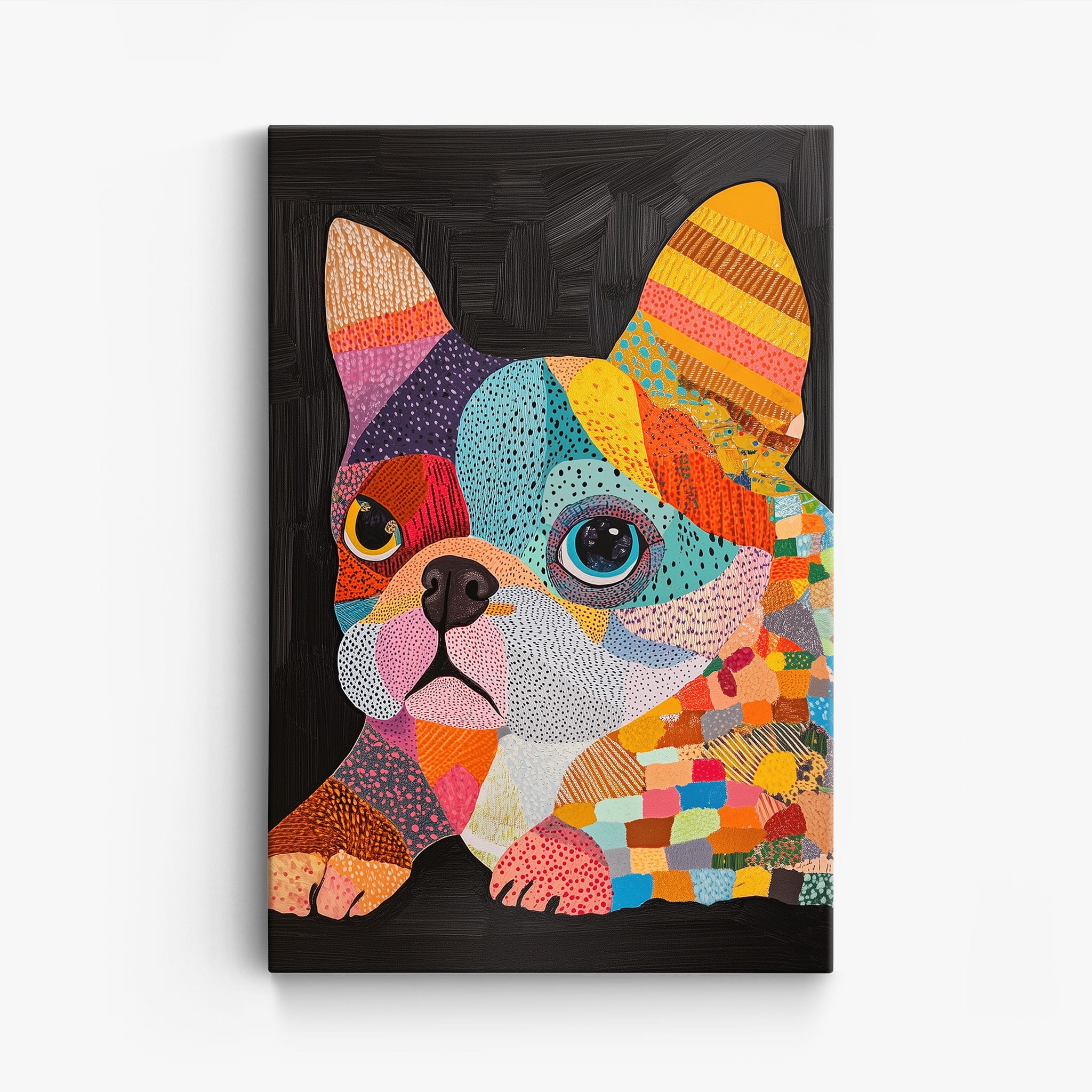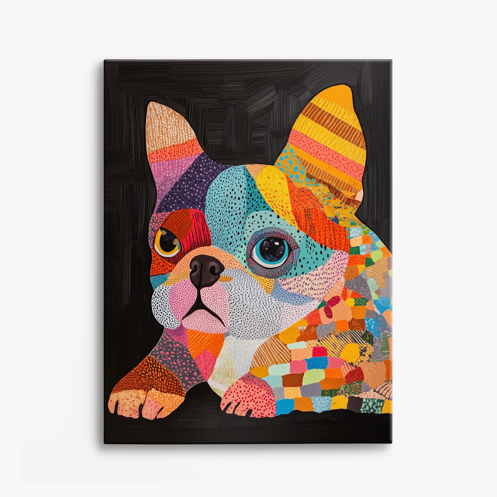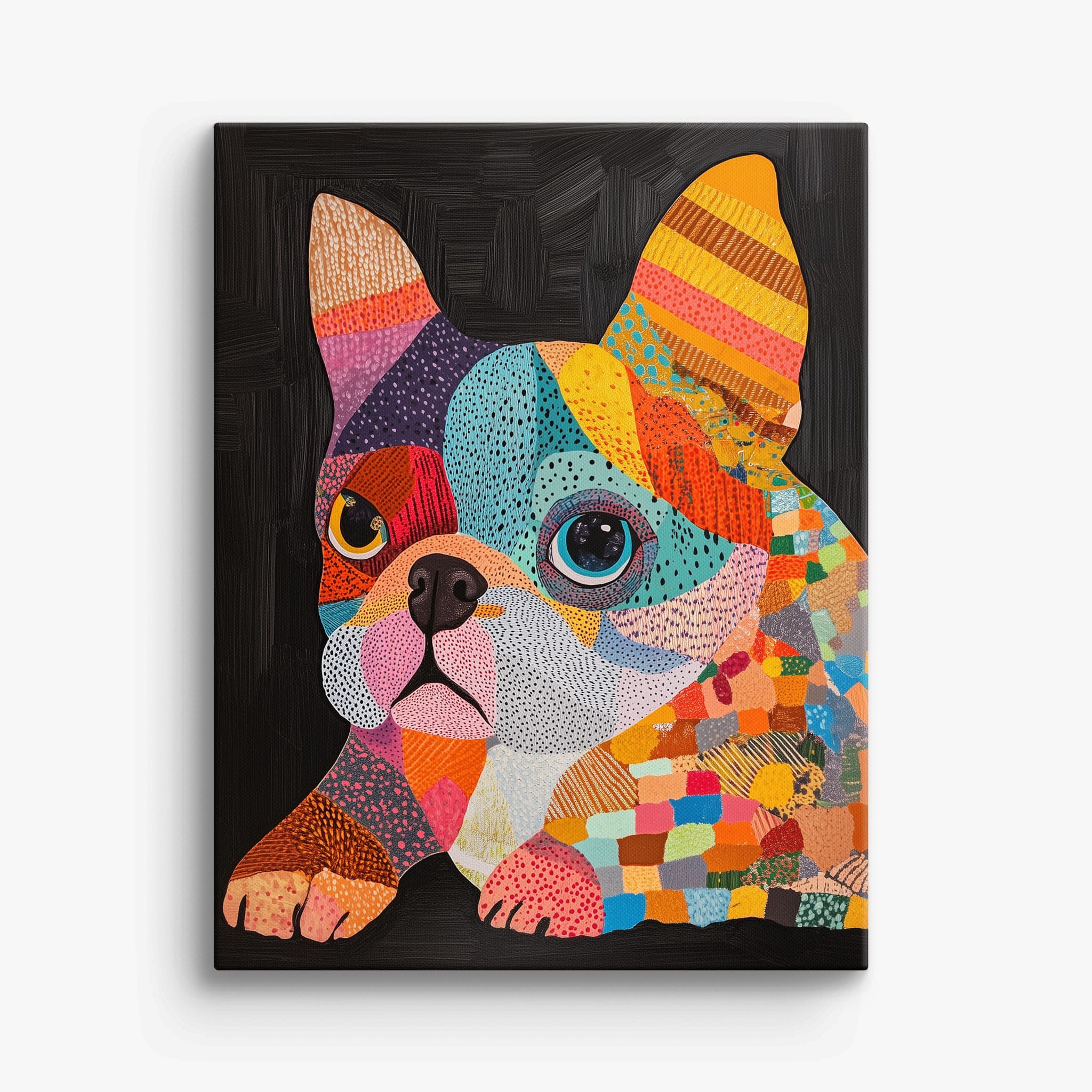 This vibrant painting presents a delightful figurative portrayal of a French Bulldog adorned in a spectrum of lively colors and textured patterns. With a modern and whimsical style, each brushstroke and color choice energizes the piece, creating a playful yet profound expression of canine charm. The meticulous attention to detail and the vivid color palette make it an eye-catching addition to any room. Its joyous and expressive nature makes it a perfect choice for pet lovers and art enthusiasts looking for a piece that captures both the essence and joy of animal companionship.