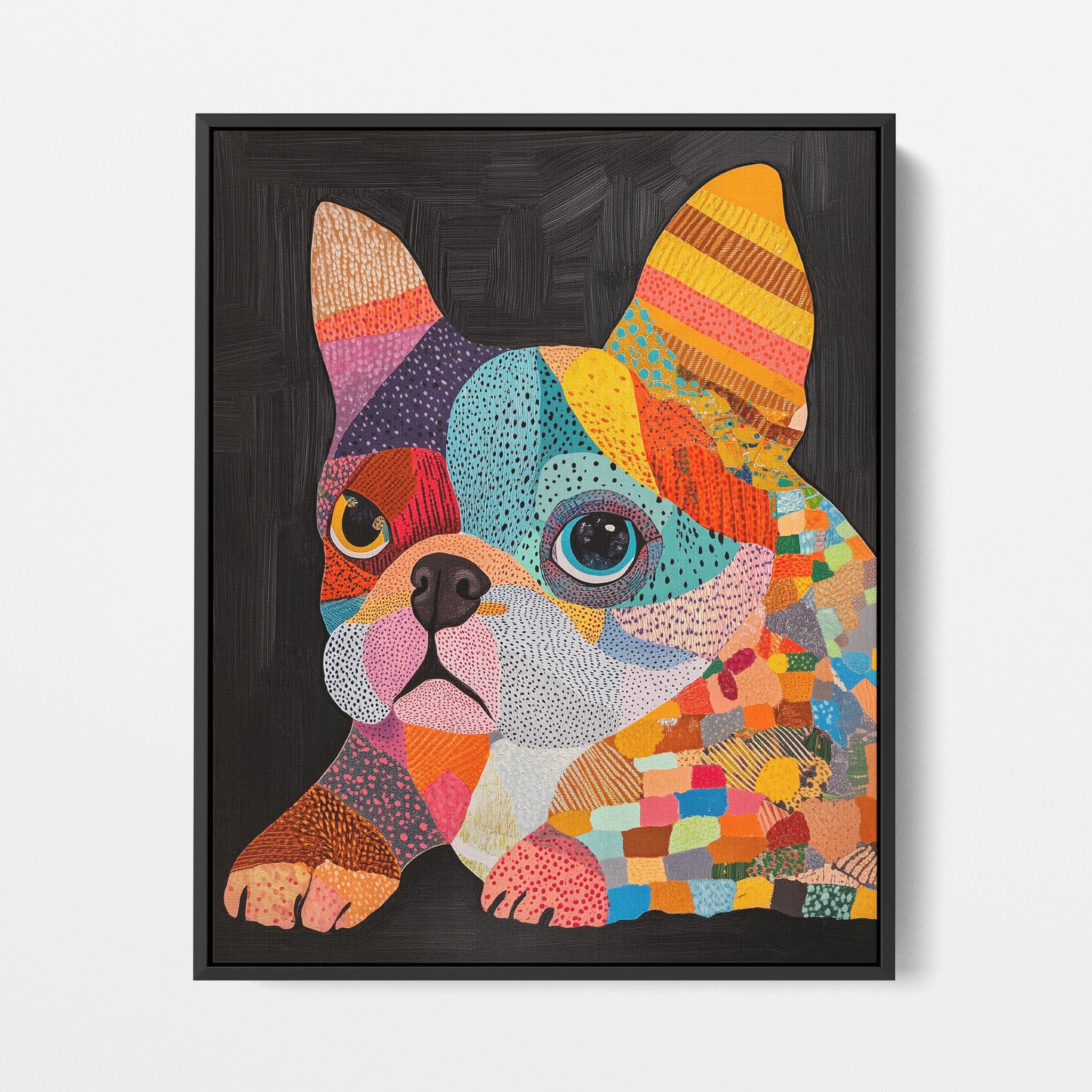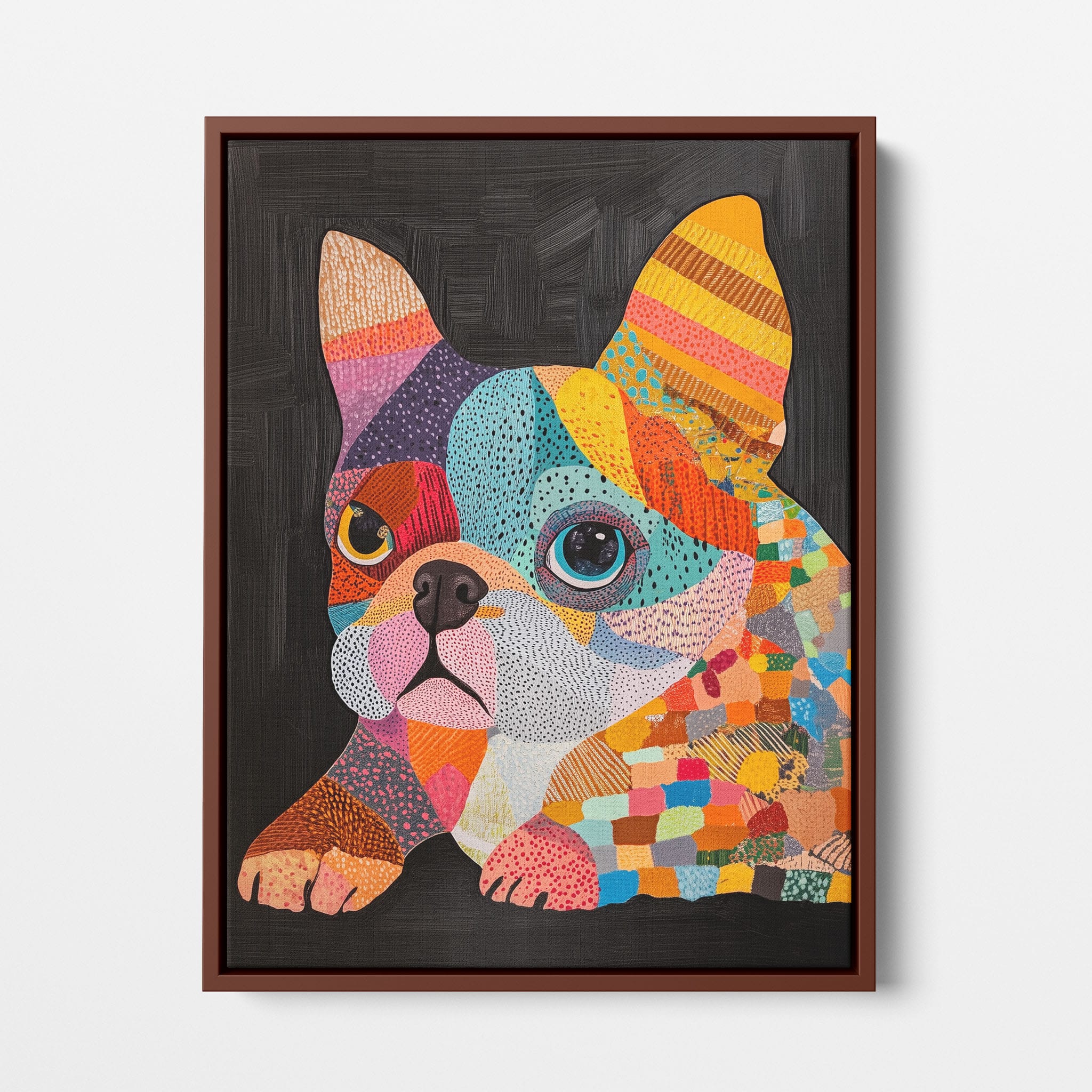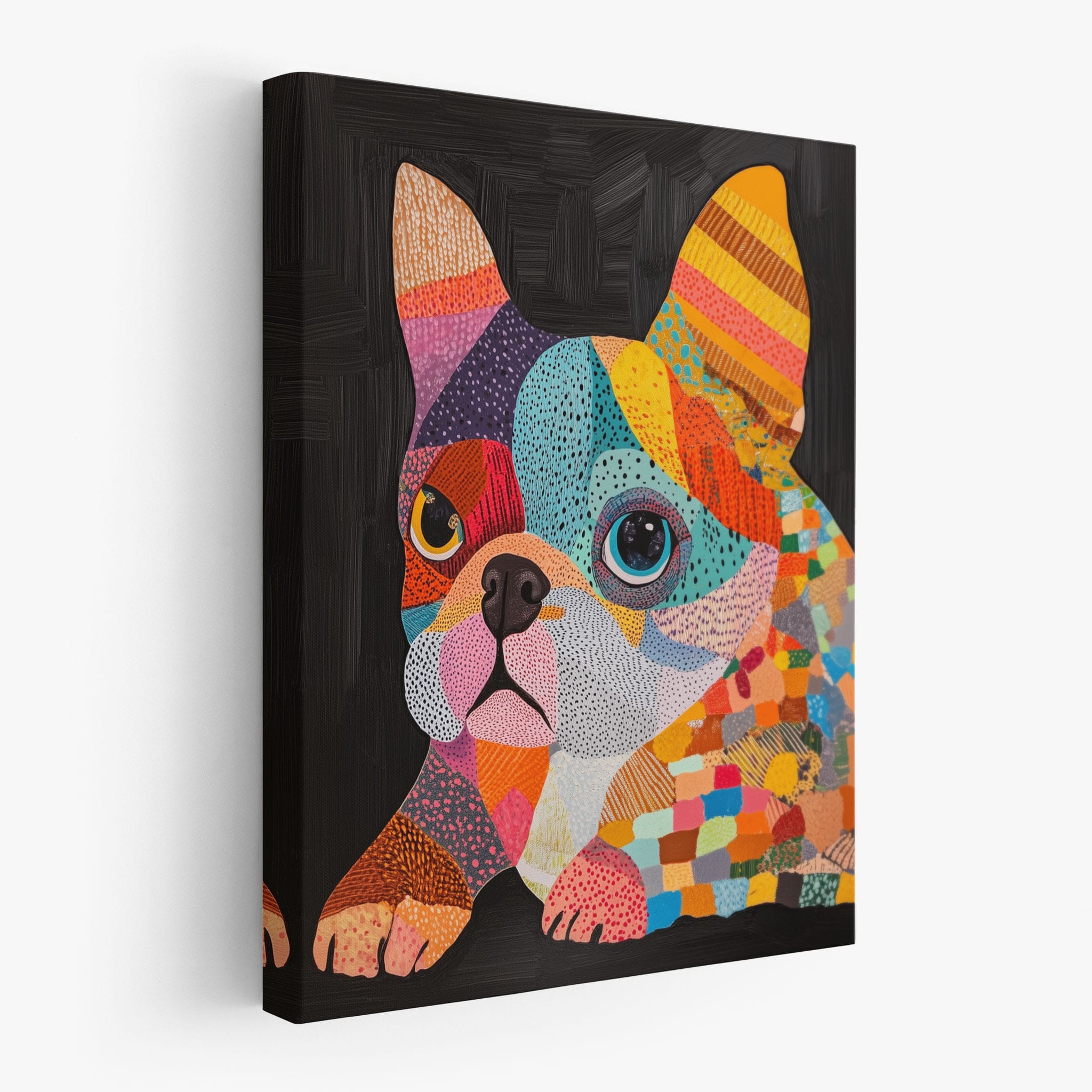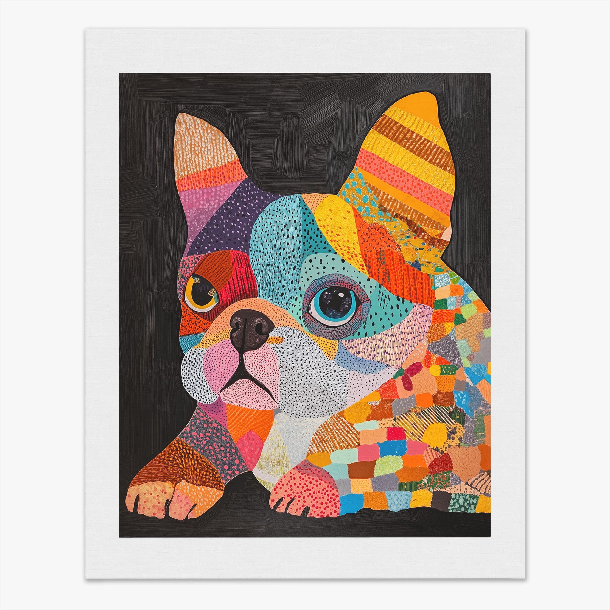 This vibrant painting presents a delightful figurative portrayal of a French Bulldog adorned in a spectrum of lively colors and textured patterns. With a modern and whimsical style, each brushstroke and color choice energizes the piece, creating a playful yet profound expression of canine charm. The meticulous attention to detail and the vivid color palette make it an eye-catching addition to any room. Its joyous and expressive nature makes it a perfect choice for pet lovers and art enthusiasts looking for a piece that captures both the essence and joy of animal companionship.